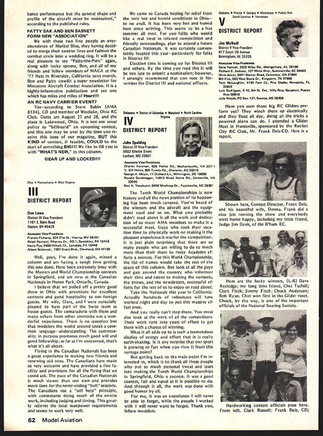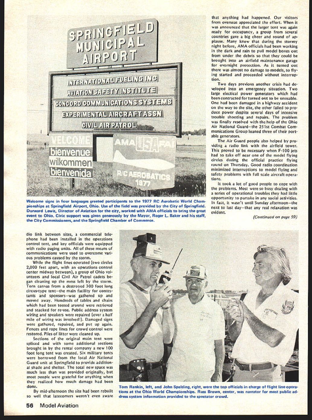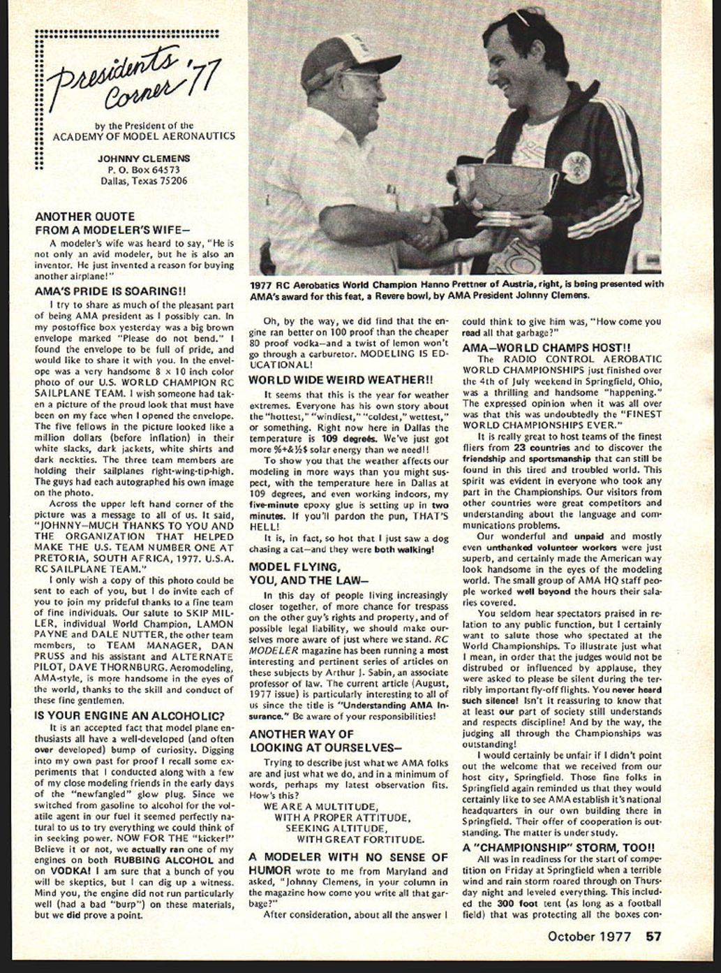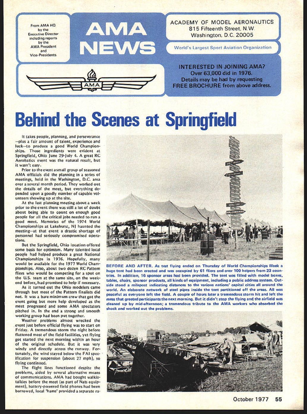 L Behind Scenes Springfield takes people planning perseverance plus fair amount talent experience luckto produce good World Champion ships ingredients evident Springfield Ohio June 29-July 4 great RC Aerobatics event natural result wasnt easy Prior event small group seasoned AMA officials did planning series meetings held Washington DC area over several month period worked out details meet everything de pended upon goodly number capable vol unteers showing up site last planning meeting about week prior event still lot doubt about being able count enough good people critical jabs needed run good meet Memories 1974 World Championships Lakehurst NJ haunted meetingat event drastic shortage personnel seriously compromised opera tions Springfield Ohio location offered some basis optimism talented local people helped produce great National Championships 1976 Hopefully would available 1977 World Cham pionships Also about two dozen RC Pattern fliers would competing spot US team same site week end before promised help necessary As turned out Ohio modelers came through Pattern finalists did bare minimum crew got event going help developed meet progressed some AMA spectators pitched end strong smooth working group put together Weather problems almost wrecked event Just before official flying start Friday tremendous storm night before flattened field facilities yet flying got started next morning within hour original schedule very windy directly across runway tunately wind stayed below FAI spec ification suspension about 27 mph flying continued flight lines functioned despite problems aided several alternative means communications AMA bought walkie talkies before meet part Nats equip ment battery-powered field phones borrowed local hams provided separate ra BEFORE AND AFTER As test flying ended Thursday World Championships Week huge tent erected occupied 61 fliers over 100 helpers 23 coun tries addition 16 sponsor areas provided tent filled model boxes tables chairs sporor products kinds equipment including public address system Out side stood milepost indicating distances various nations capital cities around world An elaborate network steel pipes inside tent partitioned off areas peaceful everyone left field couple hours later tremendous storm hit left mess greeted participants next morning didnt stop flying airfield cleaned up mid-afternoon tremendous tribute AMA workers absorbed shock worked out problems October1977 55 AMA HQ Executive Director including reports AMA President Vice-Presidents r anything happened visitors overseas appreciated effort announced larger tent again ready occupancy group several countries gave big cheer round ap plause knew during stormy night before AMA officials working dark rain pull model boxes out under debris could brought airfield maintenance garage overnight protection As turned out almost no damage models fly ing started proceeded interrup tion Two days previous another crisis de veloped emergency situation Two large electical power generators contracted turned out unusable damaged highway accident way site other failed pro duce power despite several days intensive trouble shooting repairs problem finally resolved help Ohio Air National Guardthe 25 1st Combat Com munications Group loaned three port able generators Air Guard people also helped pro viding radio link airfield tower proved necessary F-100 jets take off near model flying circles during official practice flying round Thursday Good radio coordination minimized interruptions model flying safety problems full scale aircraft opera tions took lot good people cope problems Most busy dealing series operational troubles little opportunity partake social activities fact wasnt until Sunday afternoonthe next last daythat real relaxation evident dio link between sites commercial tele phone installed operations control tent key officials equipped radio paging units means communications used overcome vari ous problems caused storm flight lines operated two circles 2000 feet apart operations control center midway between group Ohio vol unteers local Civil Air Patrol cadets gan cleaning up mess left storm Torn canvas destroyed 300 foot long circus-type tentthe main facility contes tants sponsorswas gathered up moved away Hundreds tables chairs tossed around retrieved stacked re-use Public address system wiring speakers repaired over half mile wiring involved Damaged signs gathered repaired put up again Fences rope lines crowd control restored Piles litter cleaned up Sections original main tent spliced some additional sections brought rental company new 100 foot long tent created Six military tents borrowed local Air National Guard unit Springfield provide addition al shade shelter total new space much less provided originally people grateful anything realized much damage done mid-afternoon site rebuilt well latecomers werent aware 56 Model Aviation Welcome signs four languages greeted participants 1977 RC Aerobatic World Cham pionships Springfield Airport Ohio Use field provided City Springfield Durward Lewis Director Aviation city worked AMA officials bring great event Ohio Civic support given generously Mayor Roger L Baker staff Continued page 59 City Commissioners Springfield Chamber Commerce Tom Rankin left John Spalding right top officials charge flight line opera tions Ohio World Championships Russ Brown center narrator public ad dress system information provided spectator crowd 4*****4*4**44*44*44*4*4444444*44*44 4*444***444*44*44*4***4444444*4****** ** 44TJI *4~IJ gi 44I **IMMi7 ** *4 4* 4* President ACADEMY OF MODEL AERONAUTICS JOHNNY CLEMENS PO Box 64573 Dallas Texas 75206 ANOTHER QUOTE FROM MODELERS WIFE modelers wife heard say avid modeler also inventor just invented reason buying another airplane AMAS PRIDE IS SOAR INGt try share much pleasant part being AMA president possibly can postoffice box yesterday big brown envelope marked Please bend found envelope full pride would like share envel ope very hand