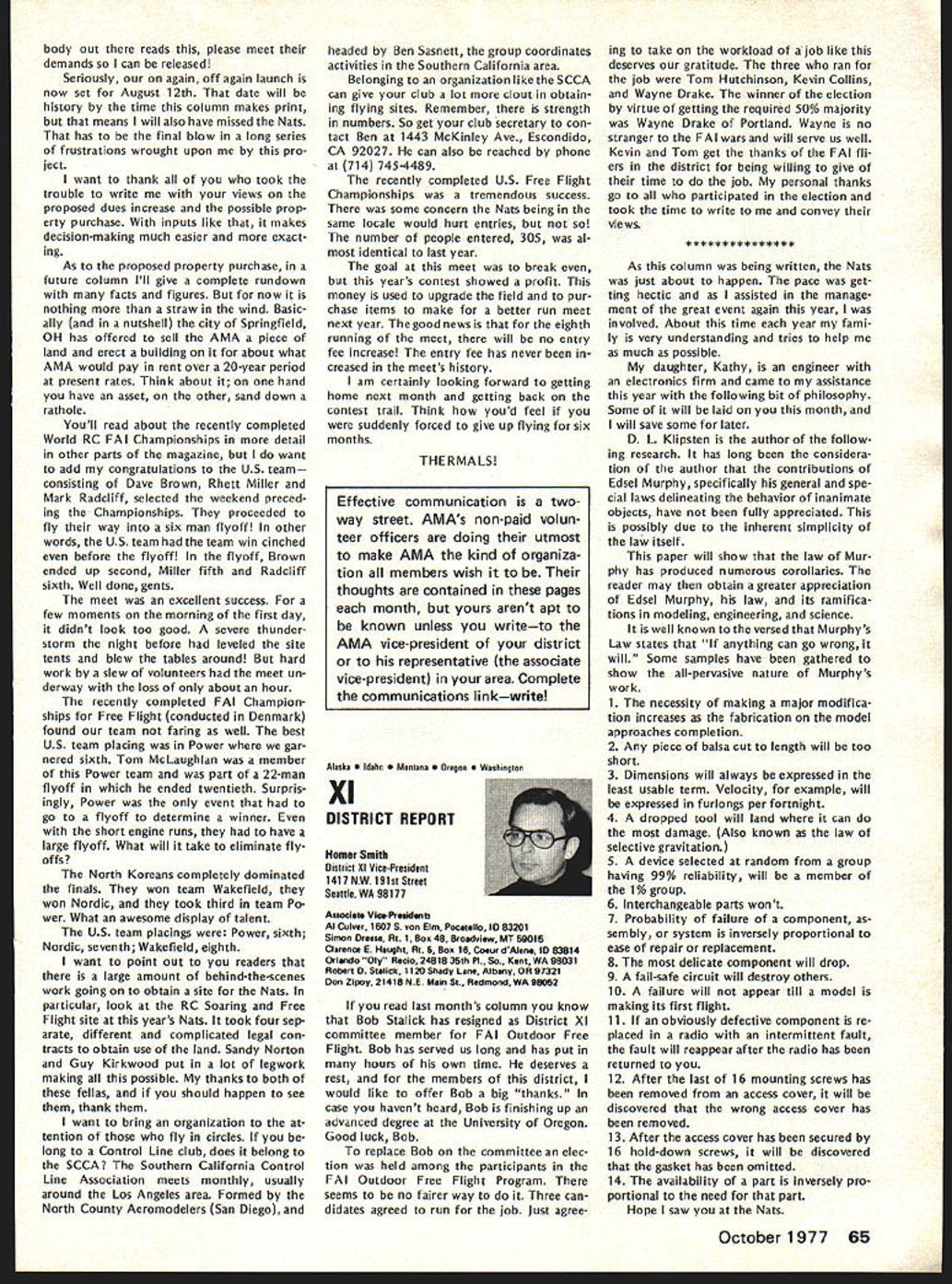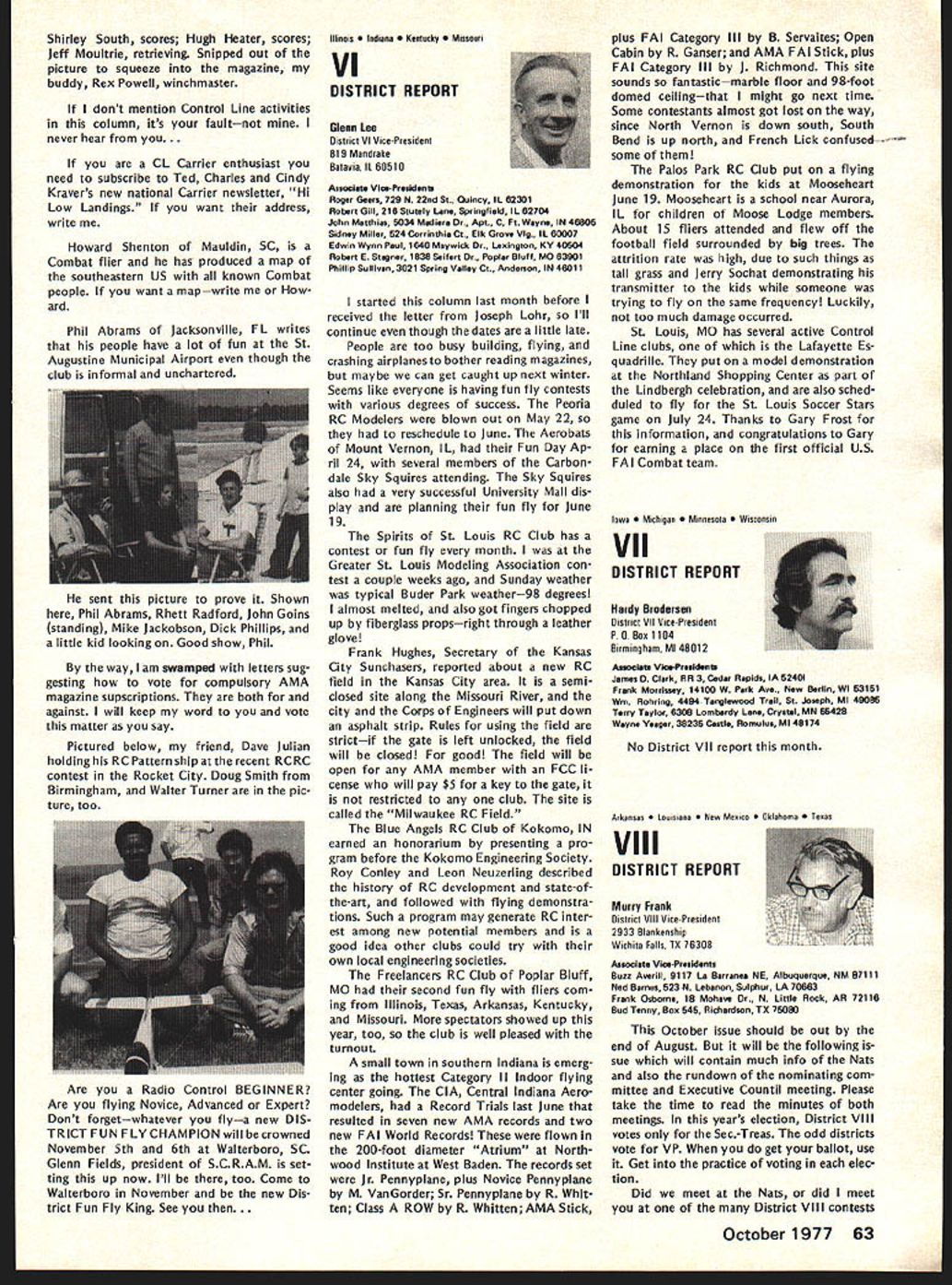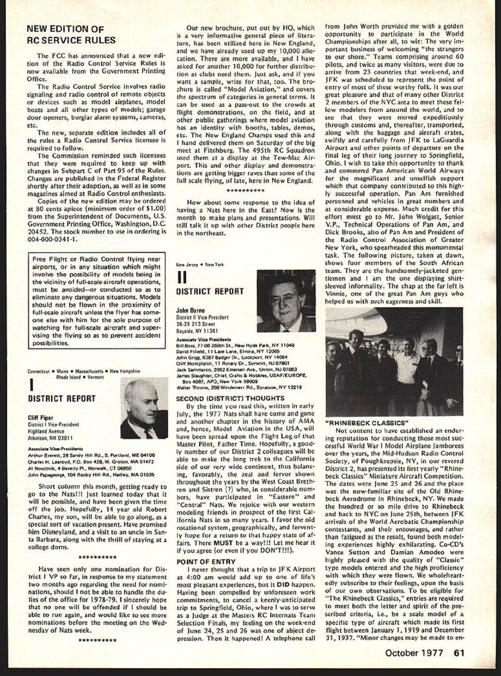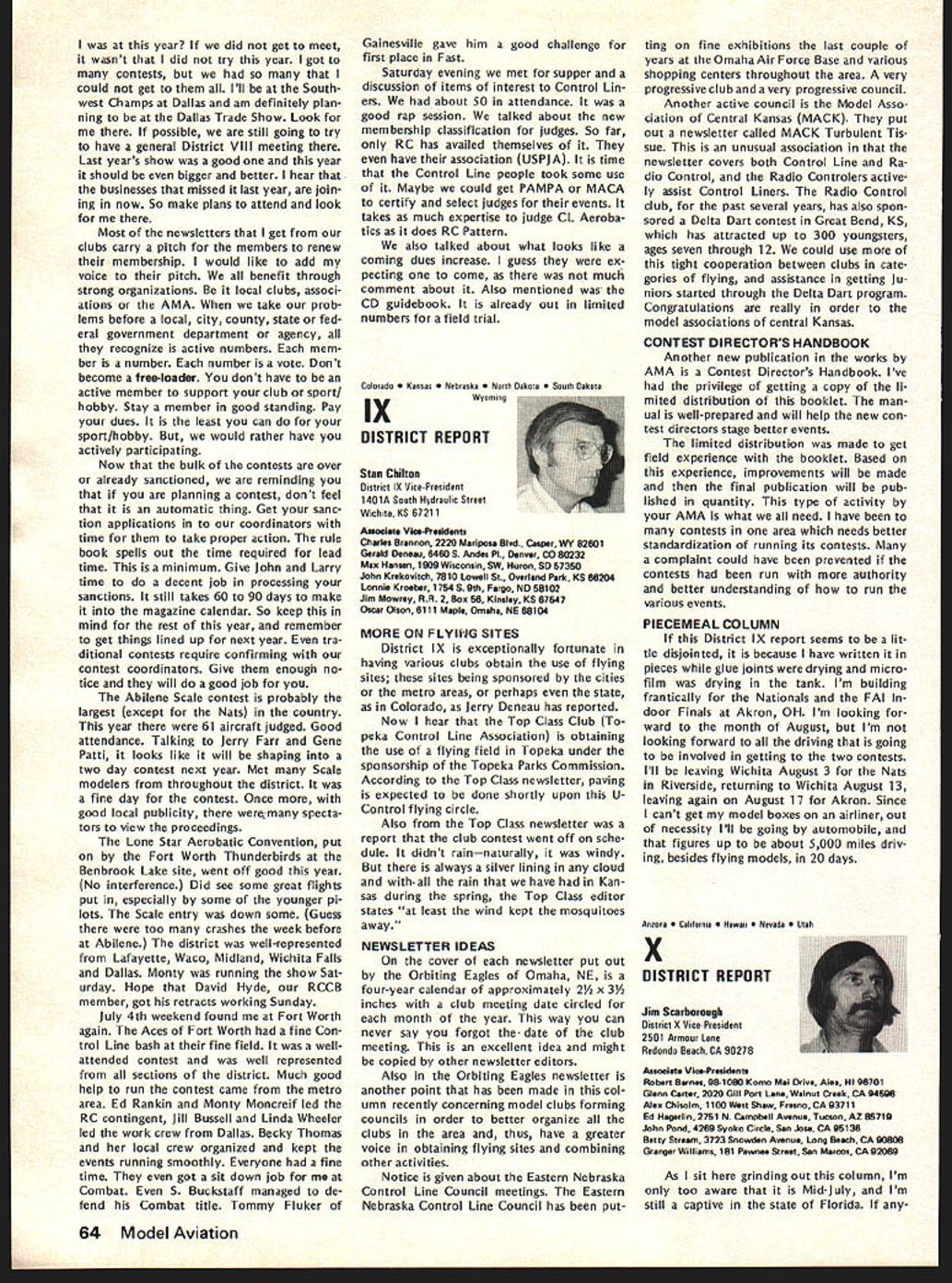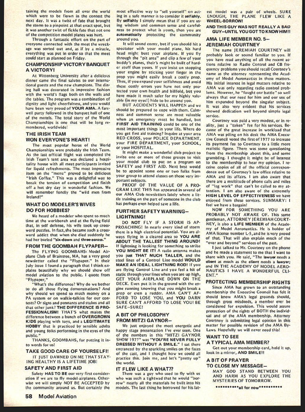 L Behind Scenes Springfield takes people planning perseverance plus fair amount talent experience luckto produce good World Champion ships ingredients evident Springfield Ohio June 29-July 4 great RC Aerobatics event natural result wasnt easy Prior event small group seasoned AMA officials did planning series meetings held Washington DC area over several month period worked out details meet everything de pended upon goodly number capable vol unteers showing up site last planning meeting about week prior event still lot doubt about being able count enough good people critical jabs needed run good meet Memories 1974 World Championships Lakehurst NJ haunted meetingat event drastic shortage personnel seriously compromised opera tions Springfield Ohio location offered some basis optimism talented local people helped produce great National Championships 1976 Hopefully would available 1977 World Cham pionships Also about two dozen RC Pattern fliers would competing spot US team same site week end before promised help necessary As turned out Ohio modelers came through Pattern finalists did bare minimum crew got event going help developed meet progressed some AMA spectators pitched end strong smooth working group put together Weather problems almost wrecked event Just before official flying start Friday tremendous storm night before flattened field facilities yet flying got started next morning within hour original schedule very windy directly across runway tunately wind stayed below FAI spec ification suspension about 27 mph flying continued flight lines functioned despite problems aided several alternative means communications AMA bought walkie talkies before meet part Nats equip ment battery-powered field phones borrowed local hams provided separate ra BEFORE AND AFTER As test flying ended Thursday World Championships Week huge tent erected occupied 61 fliers over 100 helpers 23 coun tries addition 16 sponsor areas provided tent filled model boxes tables chairs sporor products kinds equipment including public address system Out side stood milepost indicating distances various nations capital cities around world An elaborate network steel pipes inside tent partitioned off areas peaceful everyone left field couple hours later tremendous storm hit left mess greeted participants next morning didnt stop flying airfield cleaned up mid-afternoon tremendous tribute AMA workers absorbed shock worked out problems October1977 55 AMA HQ Executive Director including reports AMA President Vice-Presidents r anything happened visitors overseas appreciated effort announced larger tent again ready occupancy group several countries gave big cheer round ap plause knew during stormy night before AMA officials working dark rain pull model boxes out under debris could brought airfield maintenance garage overnight protection As turned out almost no damage models fly ing started proceeded interrup tion Two days previous another crisis de veloped emergency situation Two large electical power generators contracted turned out unusable damaged highway accident way site other failed pro duce power despite several days intensive trouble shooting repairs problem finally resolved help Ohio Air National Guardthe 25 1st Combat Com munications Group loaned three port able generators Air Guard people also helped pro viding radio link airfield tower proved necessary F-100 jets take off near model flying circles during official practice flying round Thursday Good radio coordination minimized interruptions model flying safety problems full scale aircraft opera tions took lot good people cope problems Most busy dealing series operational troubles little opportunity partake social activities fact wasnt until Sunday afternoonthe next last daythat real relaxation evident dio link between sites commercial tele phone installed operations control tent key officials equipped radio paging units means communications used overcome vari ous problems caused storm flight lines operated two circles 2000 feet apart operations control center midway between group Ohio vol unteers local Civil Air Patrol cadets gan cleaning up mess left storm Torn canvas destroyed 300 foot long circus-type tentthe main facility contes tants sponsorswas gathered up moved away Hundreds tables chairs tossed around retrieved stacked re-use Public address system wiring speakers repaired over half mile wiring involved Damaged signs gathered repaired put up again Fences rope lines crowd control restored Piles litter cleaned up Sections original main tent spliced some additional sections brought rental company new 100 foot long tent created Six military tents borrowed local Air National Guard unit Springfield provide addition al shade shelter total new space much less provided originally people grateful anything realized much damage done mid-afternoon site rebuilt well latecomers werent aware 56 Model Aviation Welcome signs four languages greeted participants 1977 RC Aerobatic World Cham pionships Springfield Airport Ohio Use field provided City Springfield Durward Lewis Director Aviation city worked AMA officials bring great event Ohio Civic support given generously Mayor Roger L Baker staff Continued page 59 City Commissioners Springfield Chamber Commerce Tom Rankin left John Spalding right top officials charge flight line opera tions Ohio World Championships Russ Brown center narrator public ad dress system information provided spectator crowd 4*****4*4**44*44*44*4*4444444*44*44 4*444***444*44*44*4***4444444*4****** ** 44TJI *4~IJ gi 44I **IMMi7 ** *4 4* 4* President ACADEMY OF MODEL AERONAUTICS JOHNNY CLEMENS PO Box 64573 Dallas Texas 75206 ANOTHER QUOTE FROM MODELERS WIFE modelers wife heard say avid modeler also inventor just invented reason buying another airplane AMAS PRIDE IS SOAR INGt try share much pleasant part being AMA president possibly can postoffice box yesterday big brown envelope marked Please bend found envelope full pride would like share envel ope very hand