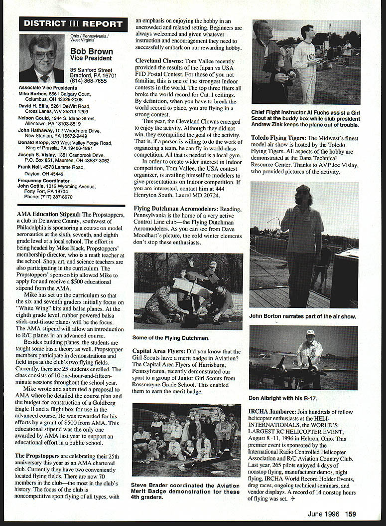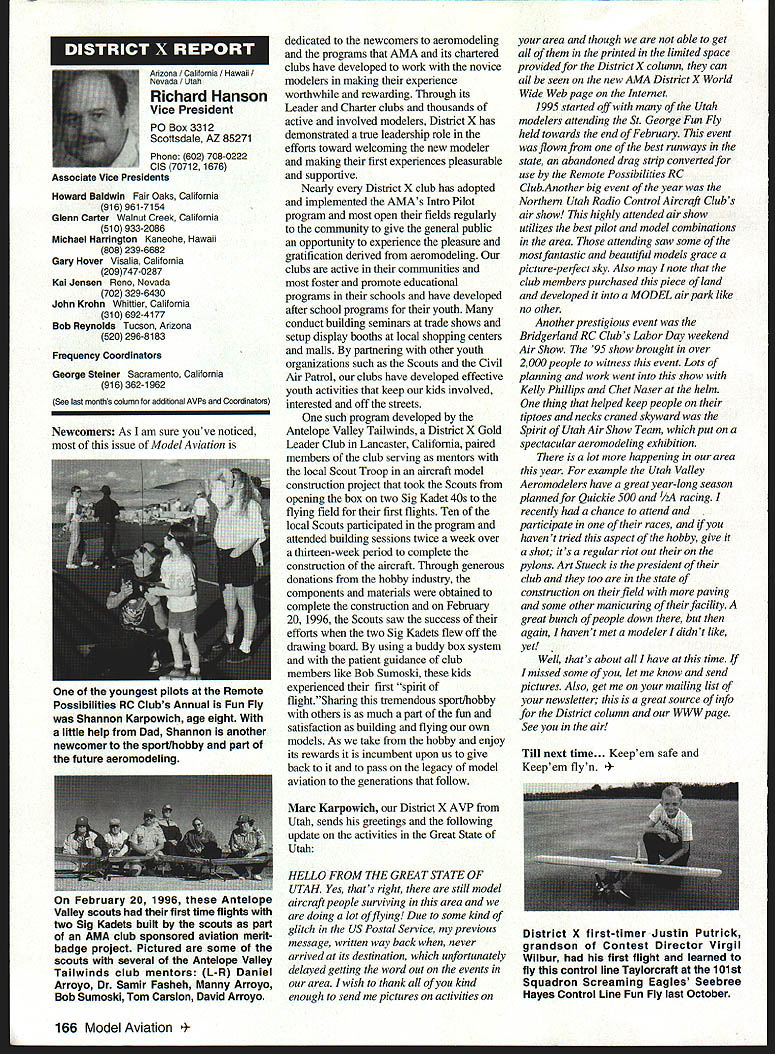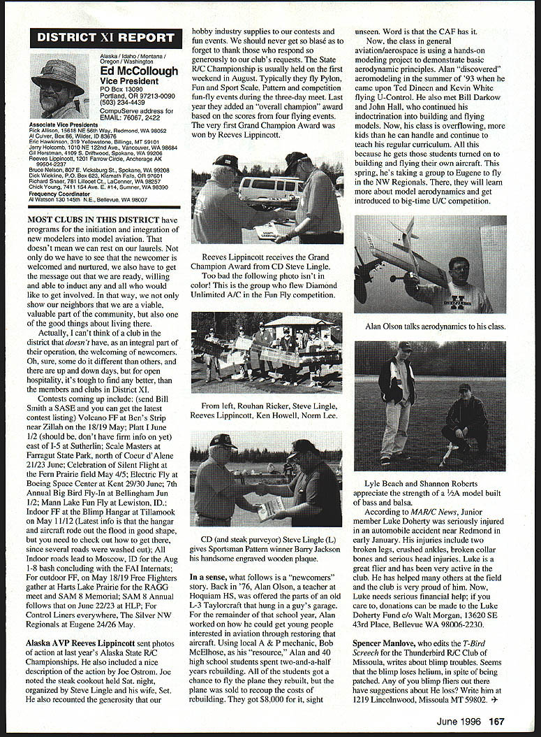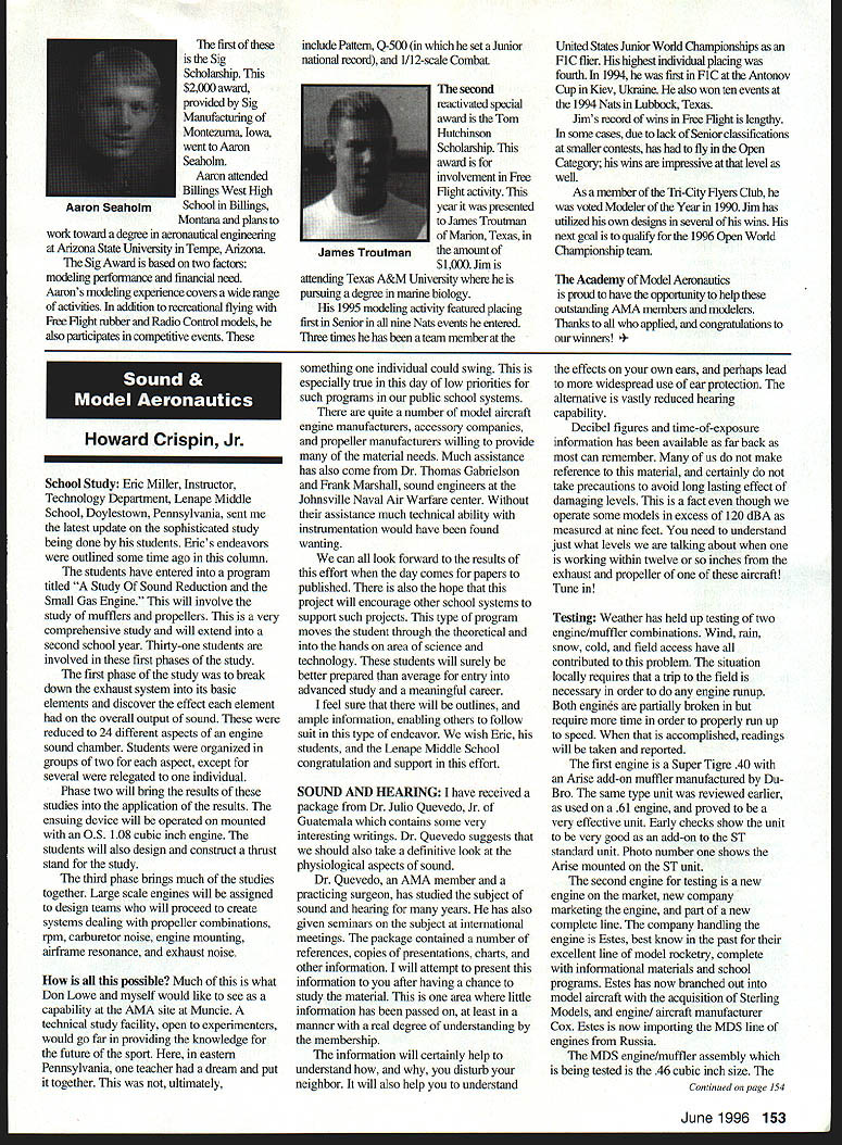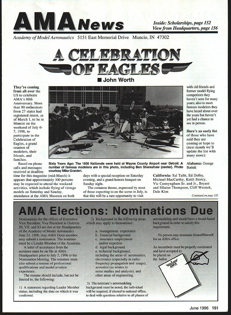 U Academy Model Aeronautics 5151 East Memorial Drive Muncie IN 47302 Inside Scholarships page 152 View Headquarters page 156 V Theyre coming over US celebrate AMAs 60th Anniversary 90 enthusiasts 27 states registered intent March 1 Muncie weekend July 67 1996 participate Celebration Eagles grand reunion modelers friends families Based phone calls messages received deadline time magazine mid-March appears approximately 300 persons may expected attend weekend activities include flying vintage models Saturday Sunday attendance AMA Museum both old friends former model flying competitors havent seen years also meet famous modelers have heard about over years havent yet chance see person Heres early list have said coming hope next month well update list Alabama George Batiuk California Sal Taibi Ed Dolby Michael MacCarthy Keith Storey Vic Cunnyngham Sr Jr Bryant Ellaine Thompson Cliff Weirick Dale Kim days special reception Saturday evening grand honors banquet Sunday night common theme expressed expecting scene July will rare opportunity visit Continued page 155 June 1996 151 LE3L4ON U John Worth Sixty Years Ago 1936 Nationals held Wayne County Airport near Detroit number famous modelers photo including Ben Shereshaw center Photo courtesy Mike Granieri deal questions relative phases AMA SCHOLARSHIPS AWARDER Bob Underwood year Academy Model Aeronautics presents approximately $20000 scholarship awards graduating high-school seniors monetary awards based five criteria including scholastic achievement service modeling activity year 55 individuals applied banner year participation six-member committee reviewed applications recommended winners AMA Executive Council found task very challenging following biographical material provides sketch winner type amount award Charles Hanipson Grant Award Joe Rule Middleton Idaho received top awani $6000 attending Albertson College Idaho pursuing goal becoming Joe D Rulean engineer Joe epitomizes all-around student canying fourpoint average ranking first class participated wide array school community activities sports Joe held positions varsity basketball golf teams president student council state champion academic decathlon enjoyable experiences centered around leadership role Natural Helpers peer-counseling program As Eagle Scout Joe enjoyed working variety projects work experience included summer job aviationmaintenance shop served stimulate interest aircraft becoming pilot Joe Boise State University science competition champion recognized schools outstanding math English student named National Merit Scholar Presidential Scholar delegate National Youth Science Camp Modeling activities Joe began A-powered Control Line models have progressed Combat 40-powered Speed models also participates Radio Control Due lack activity area Joe self-taught both areas proudest moment spring morning flew Control Line Scale S-2 built Model Aviation plans addition monies awarded Joe part Grant Scholarship program additional $3000 awarded him Toledo Ohios Weak Signals club year club presents money winner winners Grant Scholarship money generated activities annual Weak Signals Toledo Expo Michael Hudson attending Yale College Engineering hometown York Pennsylvania received award $5000 will help pursuit degree mechanical Michael Hudson engineering Having graduated salutatorian honors Michael credits parents Karen Louis well Carl Benson Tom Smeltzer making possible him today Michael achieved 4382 grade-point average out possible 4486 Along academic achievement school reports Met demanding objectives high energy level can formulate practical action plans hesitation school community activities cover wide range interests playing brass instruments various bands working science physics history clubs has also donated part time community service working March Dimes American Cancer Society Michaels modeling career currently involves flying RC helicopter began plastic Control Line model has evolved through variety experiences As often case Michaels father forsaken modeling years before Through Michaels interest spark rekindled partnership created After suffering trials teaching themselves fly reached level involved Michael Pattern competition instruction others club activity father construct model aircraft others Since 1989 Michael has found time work various jobs including golf lawn-care businesses Mac Schwager Seal Beach California attending Stanford University pursuing degree mechanical engineering given award $3000 Macs modeling experience has important part education Incorporating model gliders highschool projects performed tests involving such things dihedral angles spiral stability Most modeling experience has centered around Sailplanes Free Flight modelseven pleasure modeling includes experimentation Macs activities center around scientific interests received Bausch Lomb Honorary Service Award accompanied scholarship University Rochester offer Stanford however proved accepted Mac has Tandy Scholarship Nominee National Science Scholar Program Finalist has achieved host honors associated science fairs athletics Mac four-year varsity letterman competing variety swimming events marked record performance school freestyle butteffly medley events also has participated International Karate Championships Mac self-taught guitar playeran activity now teaches others participates variety activities through Key Club include tutoring physics working volunteer American Cancer Society June 1994 performed 120 hours work under mentorship professor University California work involved nonlinear dynamics chaos theory Mark Bibbey Powell Wyoming received $3000 Charles Hampson Grant award attending Arizona State University working toward degree aerospace Mark Bibbeyengineering Mark maintained perfect four-point average studies high school Mark involved variety school activities athletics participated football track led participation athletic letter club Band accounted part time did Art Guild French Club Fell