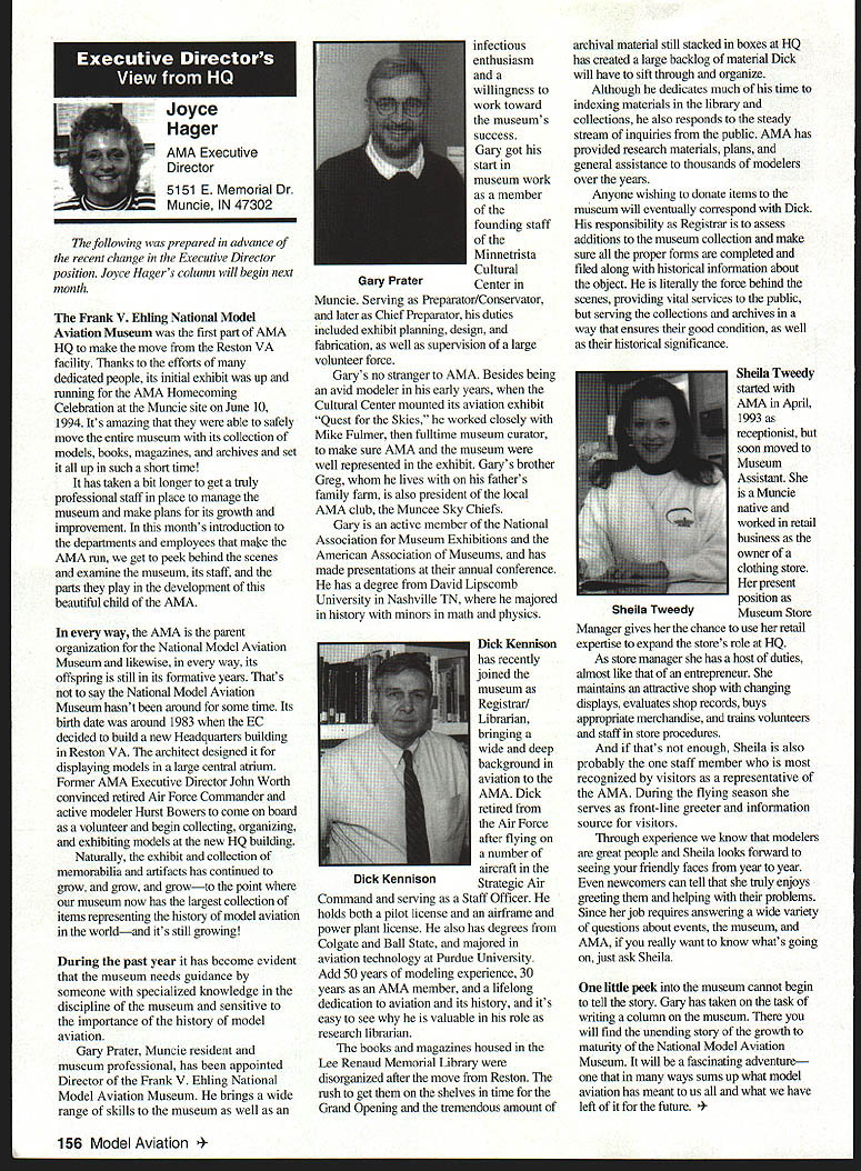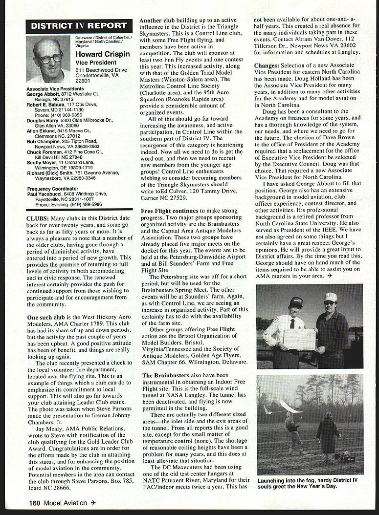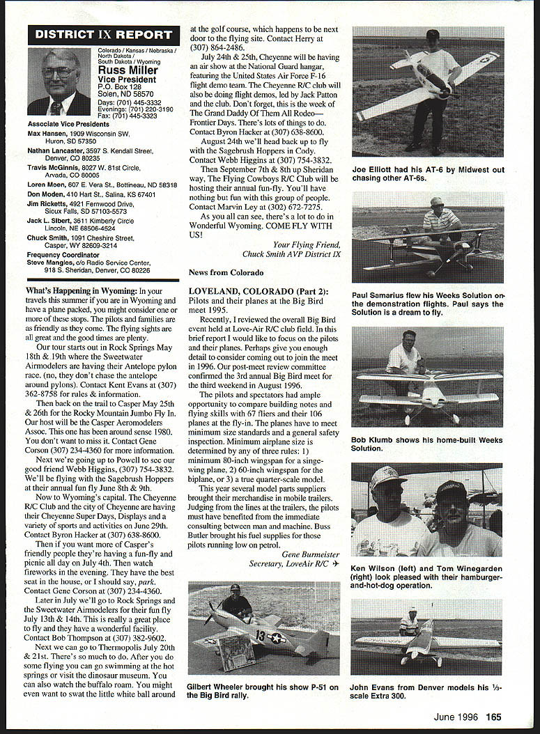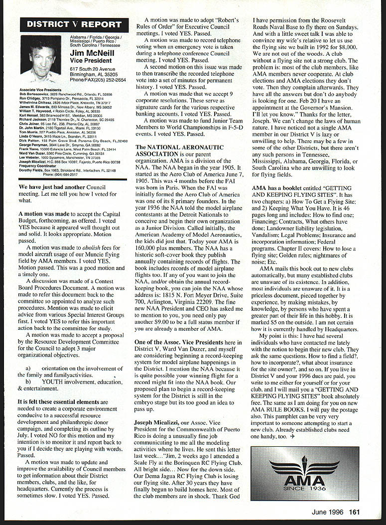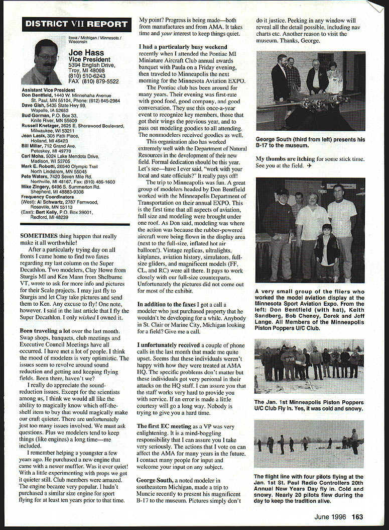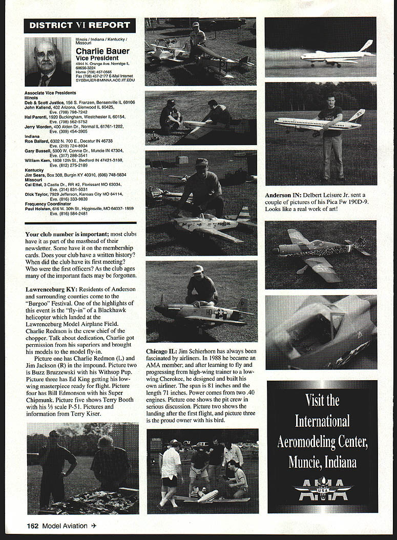 U Academy Model Aeronautics 5151 East Memorial Drive Muncie IN 47302 Inside Scholarships page 152 View Headquarters page 156 V Theyre coming over US celebrate AMAs 60th Anniversary 90 enthusiasts 27 states registered intent March 1 Muncie weekend July 67 1996 participate Celebration Eagles grand reunion modelers friends families Based phone calls messages received deadline time magazine mid-March appears approximately 300 persons may expected attend weekend activities include flying vintage models Saturday Sunday attendance AMA Museum both old friends former model flying competitors havent seen years also meet famous modelers have heard about over years havent yet chance see person Heres early list have said coming hope next month well update list Alabama George Batiuk California Sal Taibi Ed Dolby Michael MacCarthy Keith Storey Vic Cunnyngham Sr Jr Bryant Ellaine Thompson Cliff Weirick Dale Kim days special reception Saturday evening grand honors banquet Sunday night common theme expressed expecting scene July will rare opportunity visit Continued page 155 June 1996 151 LE3L4ON U John Worth Sixty Years Ago 1936 Nationals held Wayne County Airport near Detroit number famous modelers photo including Ben Shereshaw center Photo courtesy Mike Granieri deal questions relative phases AMA SCHOLARSHIPS AWARDER Bob Underwood year Academy Model Aeronautics presents approximately $20000 scholarship awards graduating high-school seniors monetary awards based five criteria including scholastic achievement service modeling activity year 55 individuals applied banner year participation six-member committee reviewed applications recommended winners AMA Executive Council found task very challenging following biographical material provides sketch winner type amount award Charles Hanipson Grant Award Joe Rule Middleton Idaho received top awani $6000 attending Albertson College Idaho pursuing goal becoming Joe D Rulean engineer Joe epitomizes all-around student canying fourpoint average ranking first class participated wide array school community activities sports Joe held positions varsity basketball golf teams president student council state champion academic decathlon enjoyable experiences centered around leadership role Natural Helpers peer-counseling program As Eagle Scout Joe enjoyed working variety projects work experience included summer job aviationmaintenance shop served stimulate interest aircraft becoming pilot Joe Boise State University science competition champion recognized schools outstanding math English student named National Merit Scholar Presidential Scholar delegate National Youth Science Camp Modeling activities Joe began A-powered Control Line models have progressed Combat 40-powered Speed models also participates Radio Control Due lack activity area Joe self-taught both areas proudest moment spring morning flew Control Line Scale S-2 built Model Aviation plans addition monies awarded Joe part Grant Scholarship program additional $3000 awarded him Toledo Ohios Weak Signals club year club presents money winner winners Grant Scholarship money generated activities annual Weak Signals Toledo Expo Michael Hudson attending Yale College Engineering hometown York Pennsylvania received award $5000 will help pursuit degree mechanical Michael Hudson engineering Having graduated salutatorian honors Michael credits parents Karen Louis well Carl Benson Tom Smeltzer making possible him today Michael achieved 4382 grade-point average out possible 4486 Along academic achievement school reports Met demanding objectives high energy level can formulate practical action plans hesitation school community activities cover wide range interests playing brass instruments various bands working science physics history clubs has also donated part time community service working March Dimes American Cancer Society Michaels modeling career currently involves flying RC helicopter began plastic Control Line model has evolved through variety experiences As often case Michaels father forsaken modeling years before Through Michaels interest spark rekindled partnership created After suffering trials teaching themselves fly reached level involved Michael Pattern competition instruction others club activity father construct model aircraft others Since 1989 Michael has found time work various jobs including golf lawn-care businesses Mac Schwager Seal Beach California attending Stanford University pursuing degree mechanical engineering given award $3000 Macs modeling experience has important part education Incorporating model gliders highschool projects performed tests involving such things dihedral angles spiral stability Most modeling experience has centered around Sailplanes Free Flight modelseven pleasure modeling includes experimentation Macs activities center around scientific interests received Bausch Lomb Honorary Service Award accompanied scholarship University Rochester offer Stanford however proved accepted Mac has Tandy Scholarship Nominee National Science Scholar Program Finalist has achieved host honors associated science fairs athletics Mac four-year varsity letterman competing variety swimming events marked record performance school freestyle butteffly medley events also has participated International Karate Championships Mac self-taught guitar playeran activity now teaches others participates variety activities through Key Club include tutoring physics working volunteer American Cancer Society June 1994 performed 120 hours work under mentorship professor University California work involved nonlinear dynamics chaos theory Mark Bibbey Powell Wyoming received $3000 Charles Hampson Grant award attending Arizona State University working toward degree aerospace Mark Bibbeyengineering Mark maintained perfect four-point average studies high school Mark involved variety school activities athletics participated football track led participation athletic letter club Band accounted part time did Art Guild French Club Fell