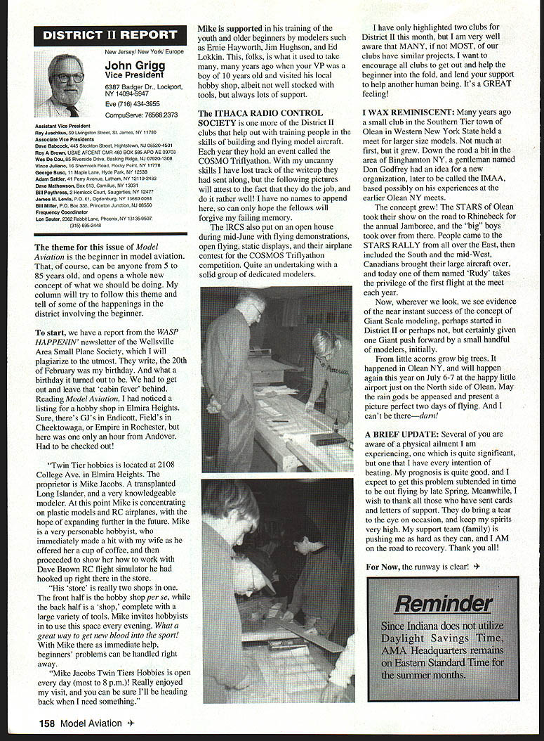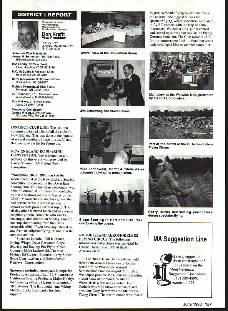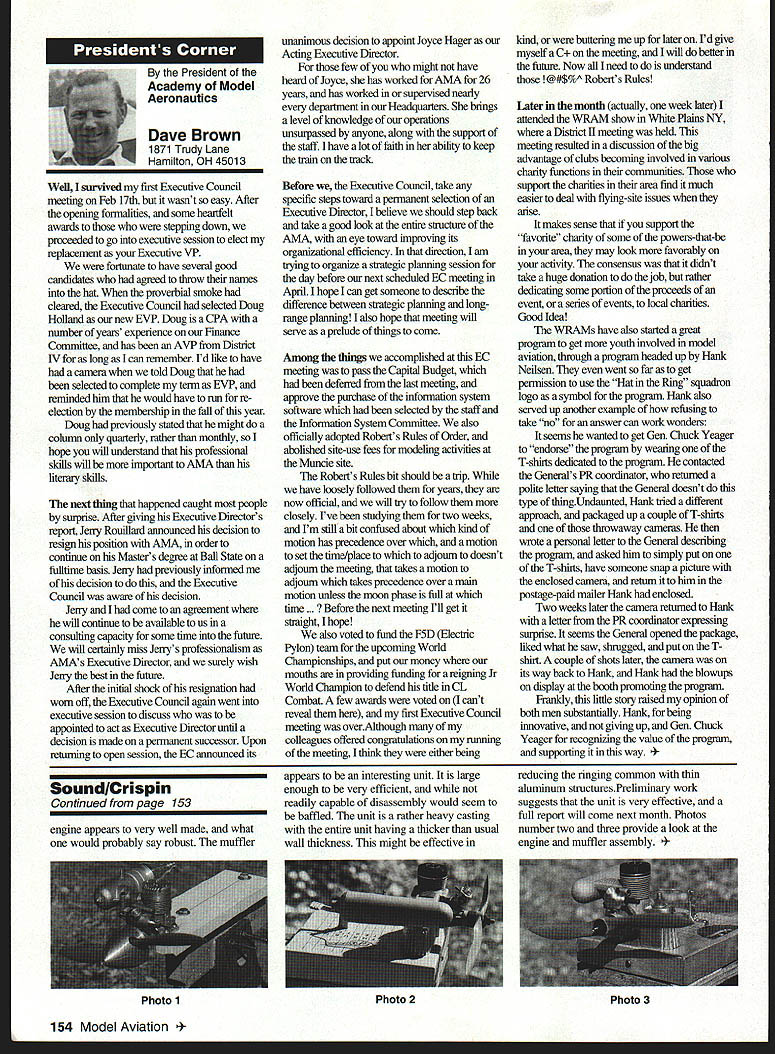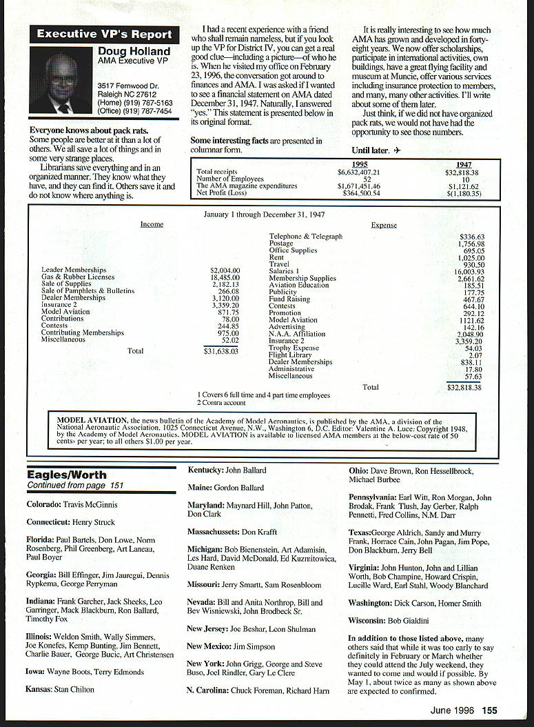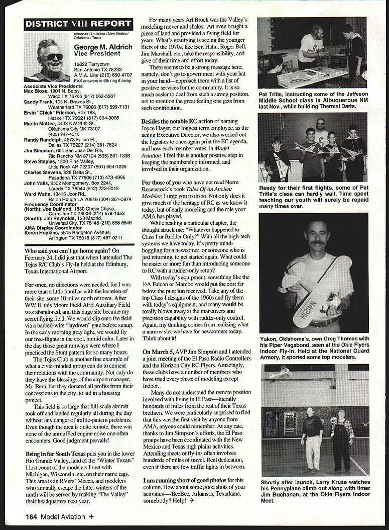 U Academy Model Aeronautics 5151 East Memorial Drive Muncie IN 47302 Inside Scholarships page 152 View Headquarters page 156 V Theyre coming over US celebrate AMAs 60th Anniversary 90 enthusiasts 27 states registered intent March 1 Muncie weekend July 67 1996 participate Celebration Eagles grand reunion modelers friends families Based phone calls messages received deadline time magazine mid-March appears approximately 300 persons may expected attend weekend activities include flying vintage models Saturday Sunday attendance AMA Museum both old friends former model flying competitors havent seen years also meet famous modelers have heard about over years havent yet chance see person Heres early list have said coming hope next month well update list Alabama George Batiuk California Sal Taibi Ed Dolby Michael MacCarthy Keith Storey Vic Cunnyngham Sr Jr Bryant Ellaine Thompson Cliff Weirick Dale Kim days special reception Saturday evening grand honors banquet Sunday night common theme expressed expecting scene July will rare opportunity visit Continued page 155 June 1996 151 LE3L4ON U John Worth Sixty Years Ago 1936 Nationals held Wayne County Airport near Detroit number famous modelers photo including Ben Shereshaw center Photo courtesy Mike Granieri deal questions relative phases AMA SCHOLARSHIPS AWARDER Bob Underwood year Academy Model Aeronautics presents approximately $20000 scholarship awards graduating high-school seniors monetary awards based five criteria including scholastic achievement service modeling activity year 55 individuals applied banner year participation six-member committee reviewed applications recommended winners AMA Executive Council found task very challenging following biographical material provides sketch winner type amount award Charles Hanipson Grant Award Joe Rule Middleton Idaho received top awani $6000 attending Albertson College Idaho pursuing goal becoming Joe D Rulean engineer Joe epitomizes all-around student canying fourpoint average ranking first class participated wide array school community activities sports Joe held positions varsity basketball golf teams president student council state champion academic decathlon enjoyable experiences centered around leadership role Natural Helpers peer-counseling program As Eagle Scout Joe enjoyed working variety projects work experience included summer job aviationmaintenance shop served stimulate interest aircraft becoming pilot Joe Boise State University science competition champion recognized schools outstanding math English student named National Merit Scholar Presidential Scholar delegate National Youth Science Camp Modeling activities Joe began A-powered Control Line models have progressed Combat 40-powered Speed models also participates Radio Control Due lack activity area Joe self-taught both areas proudest moment spring morning flew Control Line Scale S-2 built Model Aviation plans addition monies awarded Joe part Grant Scholarship program additional $3000 awarded him Toledo Ohios Weak Signals club year club presents money winner winners Grant Scholarship money generated activities annual Weak Signals Toledo Expo Michael Hudson attending Yale College Engineering hometown York Pennsylvania received award $5000 will help pursuit degree mechanical Michael Hudson engineering Having graduated salutatorian honors Michael credits parents Karen Louis well Carl Benson Tom Smeltzer making possible him today Michael achieved 4382 grade-point average out possible 4486 Along academic achievement school reports Met demanding objectives high energy level can formulate practical action plans hesitation school community activities cover wide range interests playing brass instruments various bands working science physics history clubs has also donated part time community service working March Dimes American Cancer Society Michaels modeling career currently involves flying RC helicopter began plastic Control Line model has evolved through variety experiences As often case Michaels father forsaken modeling years before Through Michaels interest spark rekindled partnership created After suffering trials teaching themselves fly reached level involved Michael Pattern competition instruction others club activity father construct model aircraft others Since 1989 Michael has found time work various jobs including golf lawn-care businesses Mac Schwager Seal Beach California attending Stanford University pursuing degree mechanical engineering given award $3000 Macs modeling experience has important part education Incorporating model gliders highschool projects performed tests involving such things dihedral angles spiral stability Most modeling experience has centered around Sailplanes Free Flight modelseven pleasure modeling includes experimentation Macs activities center around scientific interests received Bausch Lomb Honorary Service Award accompanied scholarship University Rochester offer Stanford however proved accepted Mac has Tandy Scholarship Nominee National Science Scholar Program Finalist has achieved host honors associated science fairs athletics Mac four-year varsity letterman competing variety swimming events marked record performance school freestyle butteffly medley events also has participated International Karate Championships Mac self-taught guitar playeran activity now teaches others participates variety activities through Key Club include tutoring physics working volunteer American Cancer Society June 1994 performed 120 hours work under mentorship professor University California work involved nonlinear dynamics chaos theory Mark Bibbey Powell Wyoming received $3000 Charles Hampson Grant award attending Arizona State University working toward degree aerospace Mark Bibbeyengineering Mark maintained perfect four-point average studies high school Mark involved variety school activities athletics participated football track led participation athletic letter club Band accounted part time did Art Guild French Club Fell