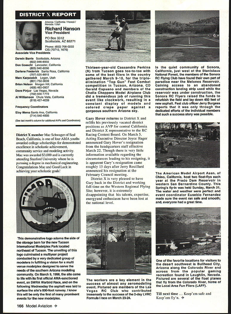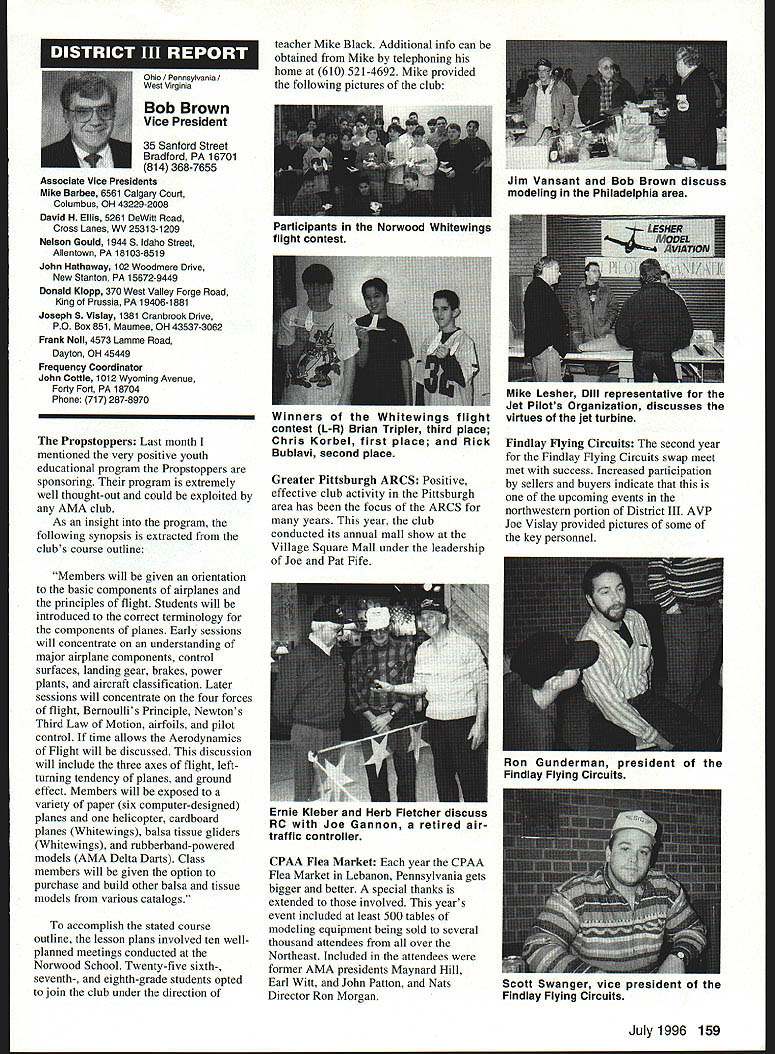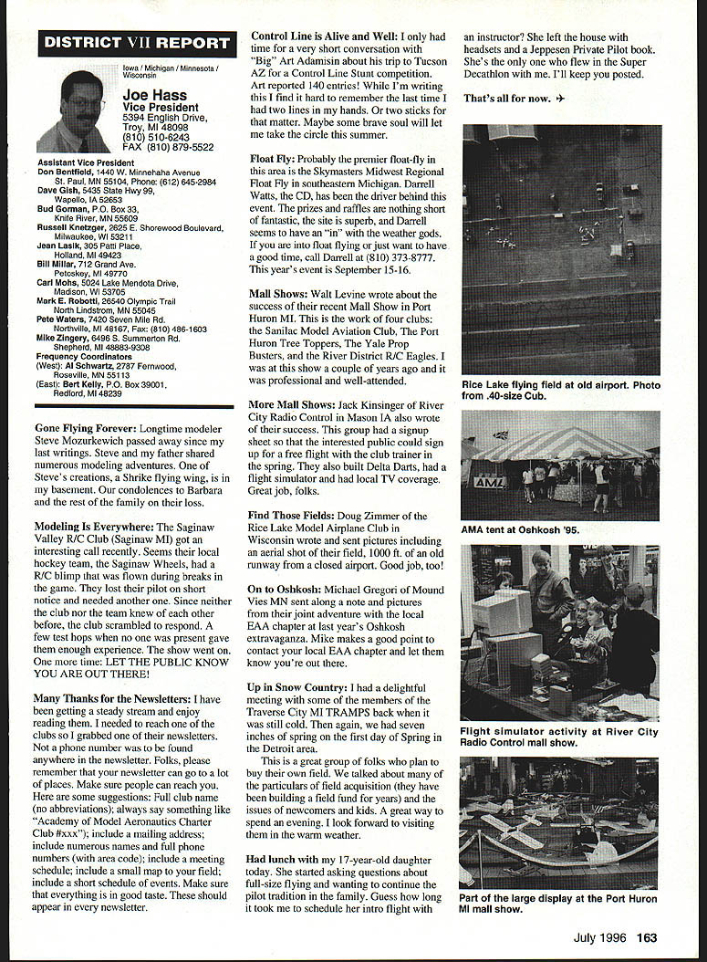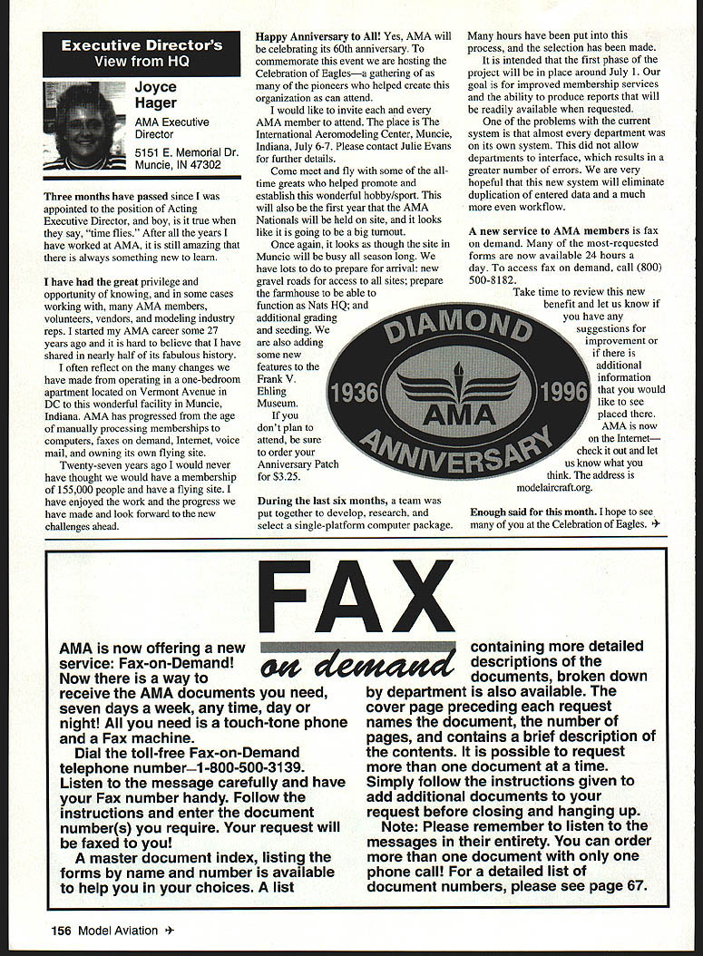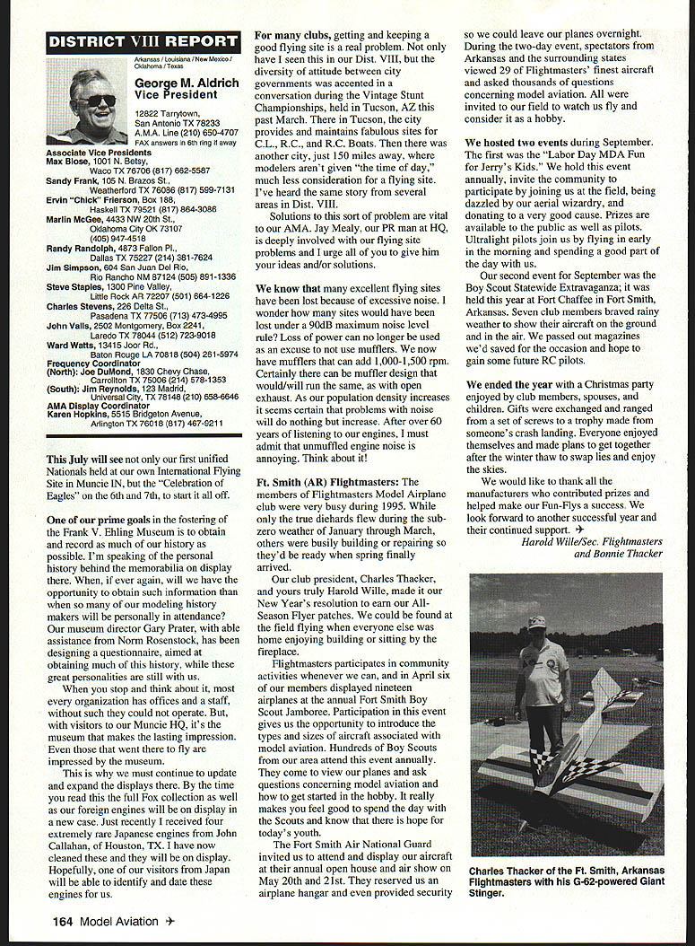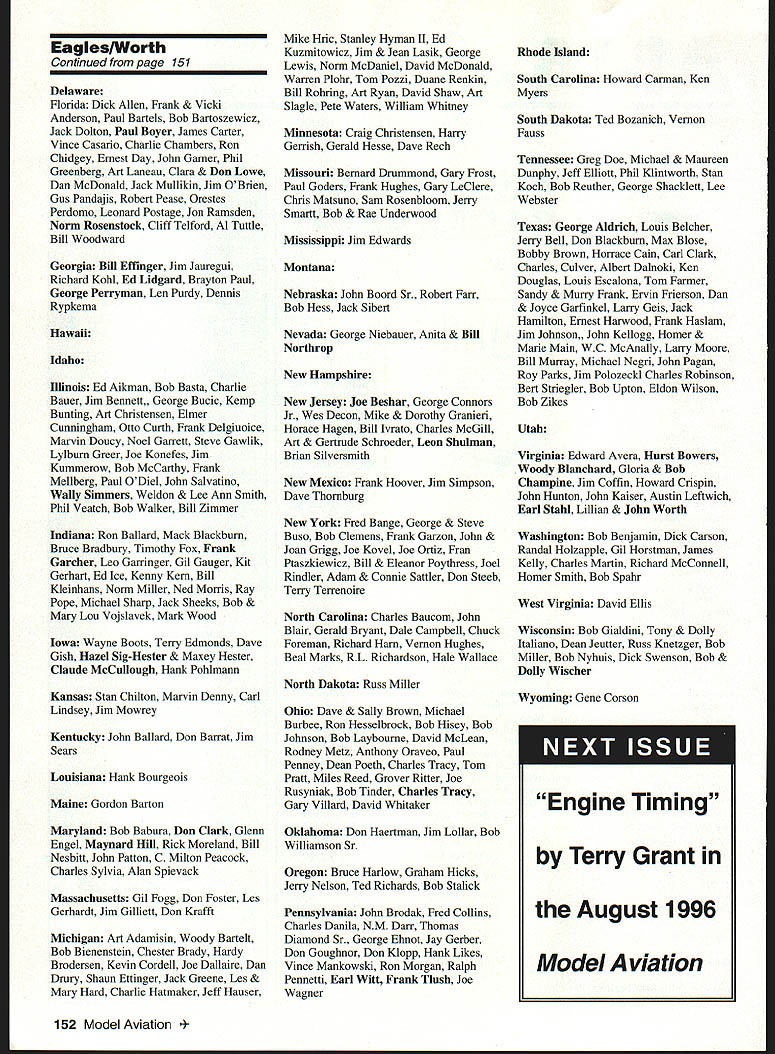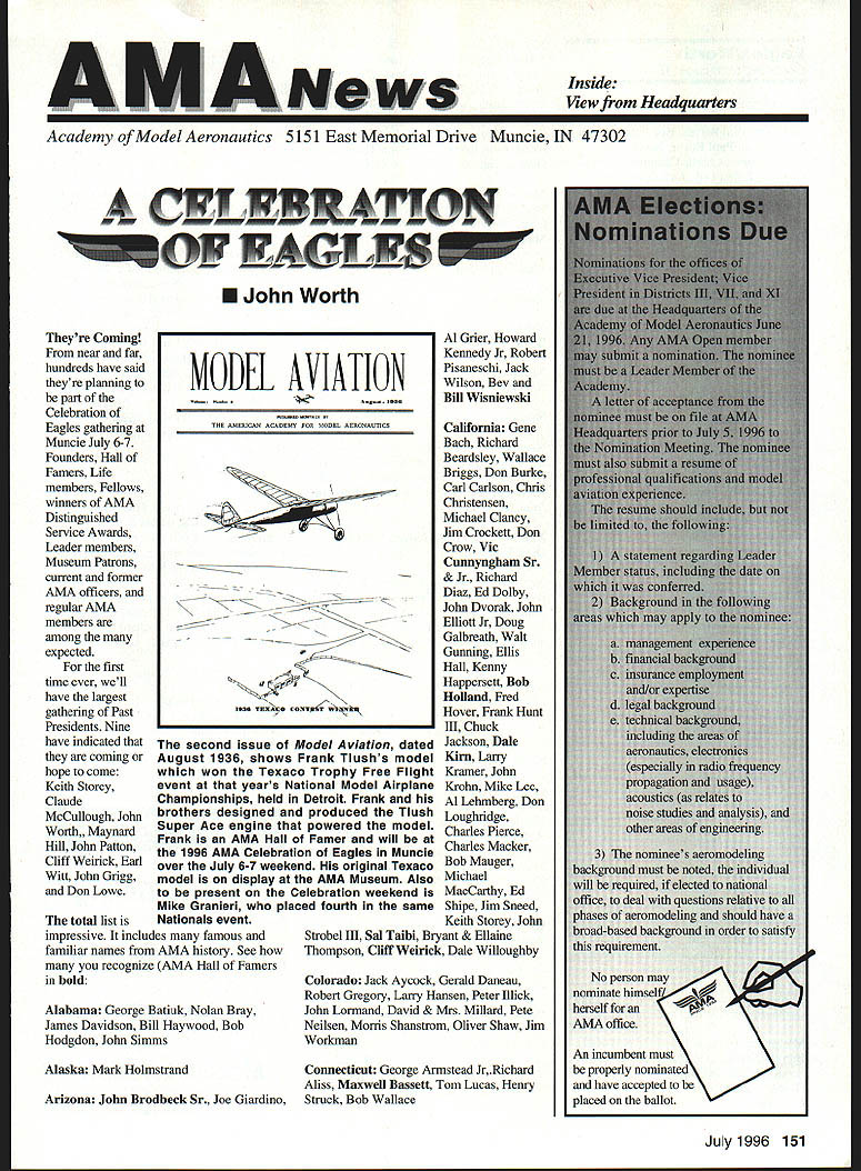 Academy Model Aeronautics 5151 East Memonal Dnve Muncie IN 47302 LE3L4flON OF EAGLES W John Worth Theyre Coming near far hundreds have said theyre planning part Celebration Eagles gathering Muncie July 6-7 Founders Hall Famers Life members Fellows winners AMA Distinguished Service Awards Leader members Museum Patrons current former AMA officers regular AMA members among expected first time ever well have largest gathering Past Presidents Nine have indicated coming hope come Keith Storey Claude McCullough John Worth, Maynard Hill John Patton Cliff Weirick Earl Witt John Grigg Don Lowe total list Al Grier Howard Kennedy Jr Robert Pisaneschi Jack Wilson Bev Bill Wisniewski California Gene Bach Richard Beardsley Wallace Briggs Don Burke Carl Carlson Chris Christensen Michael Clancy Jim Crockett Don Crow Vic Cunnyngham Sr & Jr Richard __ z Ed Dolby John Dvorak John Elliott Jr Doug Galbreath Walt Gunning Ellis Hall Kenny Happersett Bob Holland Fred Hover Frank Hunt III Chuck Jackson Dale Kim Lany Kramer John Krohn Mike Lee Al Lehmberg Don Loughridge Charles Pierce Charles Macker Bob Mauger Michael MacCarthy Ed Shipe Jim Sneed Keith Storey John Strobel III Sal Taibi Bryant & Ellaine Thompson Cliff Weirick Dale Willoughby second issue Model Aviation dated August 1936 shows Frank Tiushs model won Texaco Trophy Free Flight event years National Model Airplane Championships held Detroit Frank brothers designed produced Tiush Super Ace engine powered model Frank AMA Hall Famer will 1996 AMA Celebration Eagles Muncie over July 6-7 weekend original Texaco model display AMA Museum Also present Celebration weekend Mike Granieri placed fourth same Nationals event impressive includes famous familiar names AMA history See recognize AMA Hall Famers bold Alabama George Batiuk Nolan Bray James Davidson Bill Haywood Bob Hodgdon John Simms Alaska Mark Holmstrand Arizona John Brodbeck Sr Joe Giardino Colorado Jack Aycock Gerald Daneau Robert Gregory Larry Hansen Peter Illick John Lormand David & Mrs Millard Pete Neilsen Morris Shanstrom Oliver Shaw Jim Workman Connecticut George Armstead JrRichard Aliss Maxwell Bassett Tom Lucas Henry Struck Bob Wallace July1996 151 Inside Wtw frnm fJeoilauarter MODEL AVIATION An. fleas H MR NMM 0 MOERON ISfl TEXZO CONTpt~WflKN nominate i herself AMA office An incumbent must properiy nominated have accepted placed ballot Eagles/Worth Continued page 151 Delaware Florida Dick Allen Frank & Vicki Anderson Paul Bartels Bob Bartoszewicz Jack Dolton Paul Boyer James Carter Vince Casario Charlie Chambers Ron Chidgey Ernest Day John Garner Phil Greenberg Art Laneau Clara & Don Lowe Dan McDonald Jack Mullikin Jim OBrien Gus Pandajis Robert Pease Orestes Perdomo Leonard Postage Jon Ramsden Norm Rosenstock Cliff Telford Al Tuttle Bill Woodward Georgia Bill Effinger Jim Jauregui Richard Kohl Ed Lidgard Brayton Paul George Perryman Len Purdy Dennis Rypkema Hawaii Idaho Illinois Ed Aikman Bob Basta Charlie Bauer Jim Bennett, George Bucic Kemp Bunting Art Christensen Elmer Cunningham Otto Curth Frank Delgiuoice Marvin Doucy Noel Garrett Steve Gawlik Lylburn Greer Joe Konefes Jim Kummerow Bob McCarthy Frank Mellberg Paul ODiel John Salvatino Wally Simmers Weldon & Lee Ann Smith Phil Veatch Bob Walker Bill Zimmer Indiana Ron Ballard Mack Blackburn Brnce Bradbury Timothy Fox Frank Garcher Leo Garringer Gil Gauger Kit Gerhart Ed Ice Kenny Kern Bill Kleinhans Norm Miller Ned Morris Ray Pope Michael Sharp Jack Sheeks Bob & Mary Lou Vojslavek Mark Wood Iowa Wayne Boots Terry Edmonds Dave Gish Hazel Sig-Hester & Maxey Hester Claude McCullough Hank Pohlmann Kansas Stan Chilton Marvin Denny Carl Lindsey Jim Mowrey Kentucky John Ballard Don Barrat Jim Sears Louisiana Hank Bourgeois Maine Gordon Barton Maryland Bob Babura Don Clark Glenn Engel Maynard Hill Rick Moreland Bill Nesbitt John Patton C Milton Peacock Charles Sylvia Alan Spievack Massachusetts Gil Fogg Don Foster Les Gerhardt Jim Gilliett Don Krafft Michigan Art Adamisin Woody Bartelt Bob Bienenstein Chester Brady Hardy Brodersen Kevin Cordell Joe Dallaire Dan Drnry Shaun Ettinger Jack Greene Les & Mary Hard Charlie Hatmaker Jeff Hauser Mike Hric Stanley Hyman II Ed Kuzmitowicz Jim & Jean Lasik George Lewis Norm McDaniel David McDonald Warren Plohr Tom Pozzi Duane Renkin Bill Rohring Art Ryan David Shaw Art Slagle Pete Waters William Whitney Minnesota Craig Christensen Harry Gerrish Gerald Hesse Dave Rech Missouri Bernard Drummond Gary Frost Paul Goders Frank Hughes Gary LeClere Chris Matsuno Sam Rosenbloom Jerry Smartt Bob & Rae Underwood Mississippi Jim Edwards Montana Nebraska John Boord Sr Robert Farr Bob Hess Jack Sibert Nevada George Niebauer Anita & Bill Northrop New Hampshire New Jersey Joe Beshar George Connors Jr Wes Decon Mike & Dorothy Gransen Horace Hagen Bill Ivrato Charles McGill Art & Gertrnde Schroeder Leon Shulman Brian Silversmith New Mexico Frank Hoover Jim Simpson Dave Thornburg New York Fred Bange George & Steve Buso Bob Clemens Frank Garzon John & Joan Grigg Joe Kovel Joe Ortiz Fran Ptaszkiewicz Bill & Eleanor Poythress Joel Rindler Adam & Connie Sattler Don Steeb Terry Terrenoire North Carolina Charles Baucom John Blair Gerald Bryant Dale Campbell Chuck Foreman Richard Harm Vernon Hughes Beal Marks RL Richardson Hale Wallace North Dakota Russ Miller Ohio Dave & Sally Brown Michael Burbee Ron Hesselbrock Bob Hisey Bob Johnson Bob Laybourne David McLean Rodney Metz Anthony Oraveo Paul Penney Dean Poeth Charles Tracy Tom Pratt Miles Reed Grover Ritter Joe Rusyniak Bob Tinder Charles Tracy Gary Villard David Whitaker Oklahoma Don Haertman Jim Lollar Bob Williamson Sr Oregon Bruce Harlow Graham Hicks Jerry Nelson Ted Richards Bob Stalick Pennsylvania John Brodak Fred Collins Charles Danila NM Darr Thomas Diamond Sr George Ehnot Jay Gerber Don Goughnor Don Klopp Hank Likes Vince Mankowski Ron Morgan Ralph Pennetti Earl Witt Frank Tiush Joe Wagner Rhode Island South Carolina Howard Carman Ken Myers South Dakota Ted Bozanich Verno