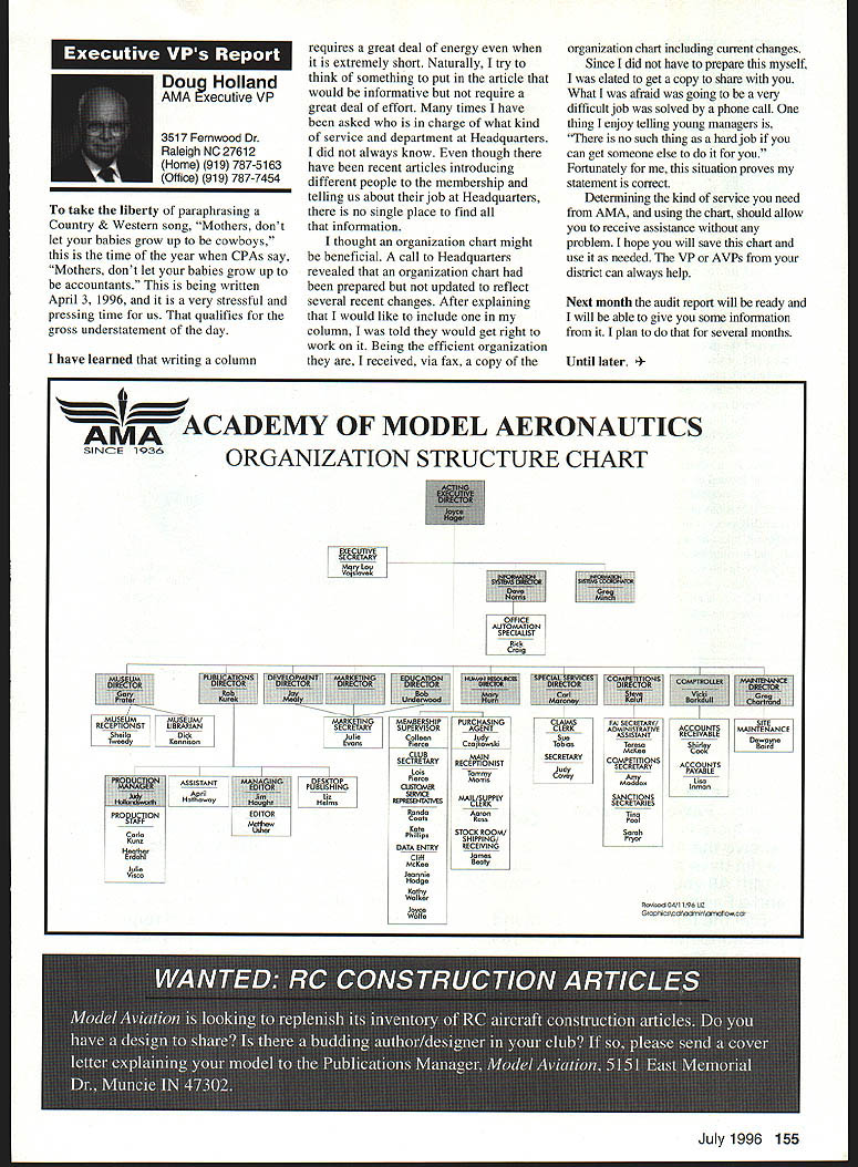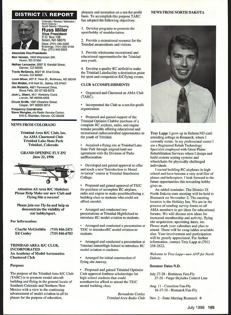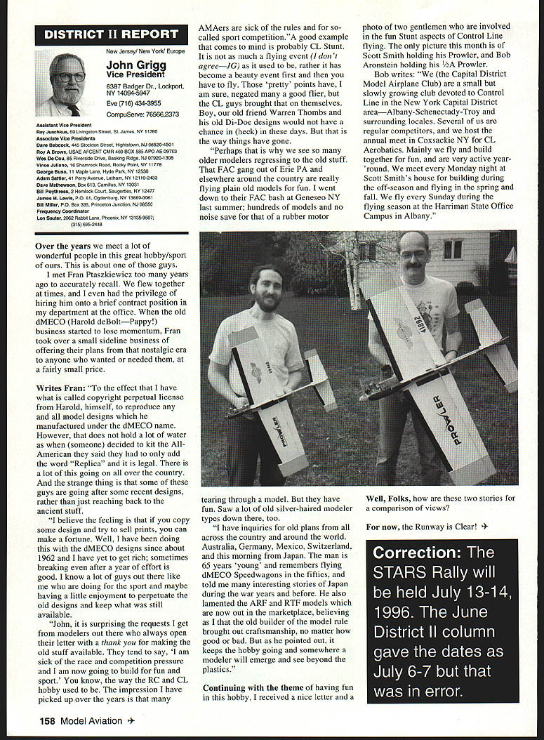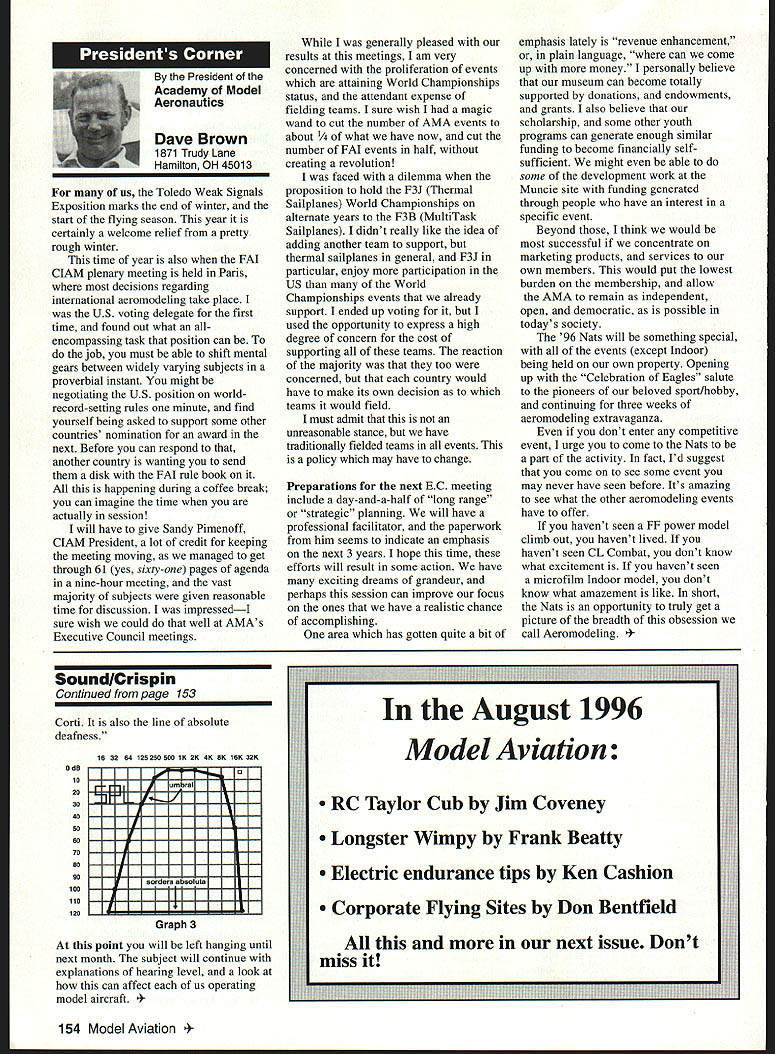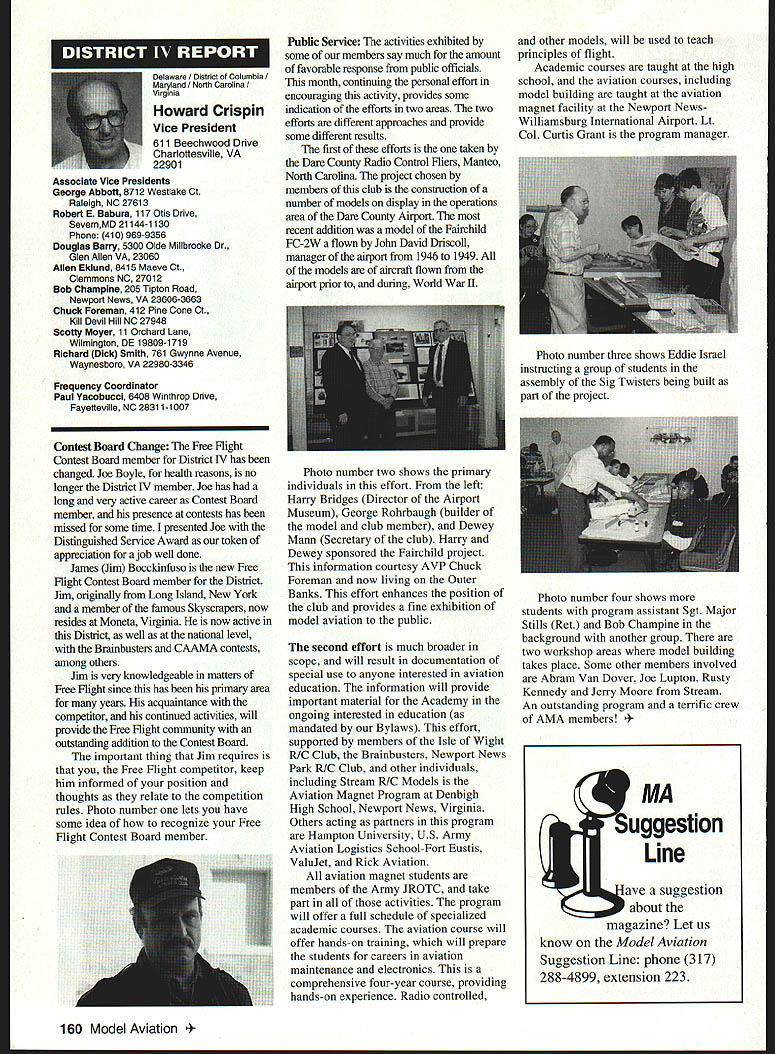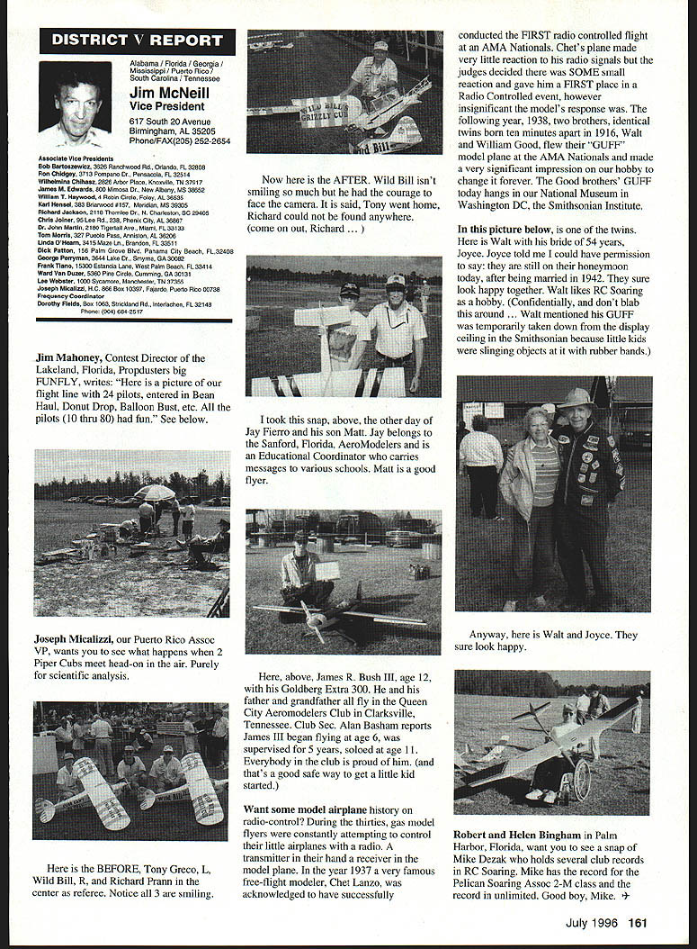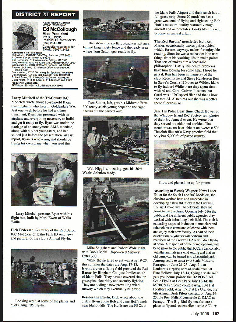 Academy Model Aeronautics 5151 East Memonal Dnve Muncie IN 47302 LE3L4flON OF EAGLES W John Worth Theyre Coming near far hundreds have said theyre planning part Celebration Eagles gathering Muncie July 6-7 Founders Hall Famers Life members Fellows winners AMA Distinguished Service Awards Leader members Museum Patrons current former AMA officers regular AMA members among expected first time ever well have largest gathering Past Presidents Nine have indicated coming hope come Keith Storey Claude McCullough John Worth, Maynard Hill John Patton Cliff Weirick Earl Witt John Grigg Don Lowe total list Al Grier Howard Kennedy Jr Robert Pisaneschi Jack Wilson Bev Bill Wisniewski California Gene Bach Richard Beardsley Wallace Briggs Don Burke Carl Carlson Chris Christensen Michael Clancy Jim Crockett Don Crow Vic Cunnyngham Sr & Jr Richard __ z Ed Dolby John Dvorak John Elliott Jr Doug Galbreath Walt Gunning Ellis Hall Kenny Happersett Bob Holland Fred Hover Frank Hunt III Chuck Jackson Dale Kim Lany Kramer John Krohn Mike Lee Al Lehmberg Don Loughridge Charles Pierce Charles Macker Bob Mauger Michael MacCarthy Ed Shipe Jim Sneed Keith Storey John Strobel III Sal Taibi Bryant & Ellaine Thompson Cliff Weirick Dale Willoughby second issue Model Aviation dated August 1936 shows Frank Tiushs model won Texaco Trophy Free Flight event years National Model Airplane Championships held Detroit Frank brothers designed produced Tiush Super Ace engine powered model Frank AMA Hall Famer will 1996 AMA Celebration Eagles Muncie over July 6-7 weekend original Texaco model display AMA Museum Also present Celebration weekend Mike Granieri placed fourth same Nationals event impressive includes famous familiar names AMA history See recognize AMA Hall Famers bold Alabama George Batiuk Nolan Bray James Davidson Bill Haywood Bob Hodgdon John Simms Alaska Mark Holmstrand Arizona John Brodbeck Sr Joe Giardino Colorado Jack Aycock Gerald Daneau Robert Gregory Larry Hansen Peter Illick John Lormand David & Mrs Millard Pete Neilsen Morris Shanstrom Oliver Shaw Jim Workman Connecticut George Armstead JrRichard Aliss Maxwell Bassett Tom Lucas Henry Struck Bob Wallace July1996 151 Inside Wtw frnm fJeoilauarter MODEL AVIATION An. fleas H MR NMM 0 MOERON ISfl TEXZO CONTpt~WflKN nominate i herself AMA office An incumbent must properiy nominated have accepted placed ballot Eagles/Worth Continued page 151 Delaware Florida Dick Allen Frank & Vicki Anderson Paul Bartels Bob Bartoszewicz Jack Dolton Paul Boyer James Carter Vince Casario Charlie Chambers Ron Chidgey Ernest Day John Garner Phil Greenberg Art Laneau Clara & Don Lowe Dan McDonald Jack Mullikin Jim OBrien Gus Pandajis Robert Pease Orestes Perdomo Leonard Postage Jon Ramsden Norm Rosenstock Cliff Telford Al Tuttle Bill Woodward Georgia Bill Effinger Jim Jauregui Richard Kohl Ed Lidgard Brayton Paul George Perryman Len Purdy Dennis Rypkema Hawaii Idaho Illinois Ed Aikman Bob Basta Charlie Bauer Jim Bennett, George Bucic Kemp Bunting Art Christensen Elmer Cunningham Otto Curth Frank Delgiuoice Marvin Doucy Noel Garrett Steve Gawlik Lylburn Greer Joe Konefes Jim Kummerow Bob McCarthy Frank Mellberg Paul ODiel John Salvatino Wally Simmers Weldon & Lee Ann Smith Phil Veatch Bob Walker Bill Zimmer Indiana Ron Ballard Mack Blackburn Brnce Bradbury Timothy Fox Frank Garcher Leo Garringer Gil Gauger Kit Gerhart Ed Ice Kenny Kern Bill Kleinhans Norm Miller Ned Morris Ray Pope Michael Sharp Jack Sheeks Bob & Mary Lou Vojslavek Mark Wood Iowa Wayne Boots Terry Edmonds Dave Gish Hazel Sig-Hester & Maxey Hester Claude McCullough Hank Pohlmann Kansas Stan Chilton Marvin Denny Carl Lindsey Jim Mowrey Kentucky John Ballard Don Barrat Jim Sears Louisiana Hank Bourgeois Maine Gordon Barton Maryland Bob Babura Don Clark Glenn Engel Maynard Hill Rick Moreland Bill Nesbitt John Patton C Milton Peacock Charles Sylvia Alan Spievack Massachusetts Gil Fogg Don Foster Les Gerhardt Jim Gilliett Don Krafft Michigan Art Adamisin Woody Bartelt Bob Bienenstein Chester Brady Hardy Brodersen Kevin Cordell Joe Dallaire Dan Drnry Shaun Ettinger Jack Greene Les & Mary Hard Charlie Hatmaker Jeff Hauser Mike Hric Stanley Hyman II Ed Kuzmitowicz Jim & Jean Lasik George Lewis Norm McDaniel David McDonald Warren Plohr Tom Pozzi Duane Renkin Bill Rohring Art Ryan David Shaw Art Slagle Pete Waters William Whitney Minnesota Craig Christensen Harry Gerrish Gerald Hesse Dave Rech Missouri Bernard Drummond Gary Frost Paul Goders Frank Hughes Gary LeClere Chris Matsuno Sam Rosenbloom Jerry Smartt Bob & Rae Underwood Mississippi Jim Edwards Montana Nebraska John Boord Sr Robert Farr Bob Hess Jack Sibert Nevada George Niebauer Anita & Bill Northrop New Hampshire New Jersey Joe Beshar George Connors Jr Wes Decon Mike & Dorothy Gransen Horace Hagen Bill Ivrato Charles McGill Art & Gertrnde Schroeder Leon Shulman Brian Silversmith New Mexico Frank Hoover Jim Simpson Dave Thornburg New York Fred Bange George & Steve Buso Bob Clemens Frank Garzon John & Joan Grigg Joe Kovel Joe Ortiz Fran Ptaszkiewicz Bill & Eleanor Poythress Joel Rindler Adam & Connie Sattler Don Steeb Terry Terrenoire North Carolina Charles Baucom John Blair Gerald Bryant Dale Campbell Chuck Foreman Richard Harm Vernon Hughes Beal Marks RL Richardson Hale Wallace North Dakota Russ Miller Ohio Dave & Sally Brown Michael Burbee Ron Hesselbrock Bob Hisey Bob Johnson Bob Laybourne David McLean Rodney Metz Anthony Oraveo Paul Penney Dean Poeth Charles Tracy Tom Pratt Miles Reed Grover Ritter Joe Rusyniak Bob Tinder Charles Tracy Gary Villard David Whitaker Oklahoma Don Haertman Jim Lollar Bob Williamson Sr Oregon Bruce Harlow Graham Hicks Jerry Nelson Ted Richards Bob Stalick Pennsylvania John Brodak Fred Collins Charles Danila NM Darr Thomas Diamond Sr George Ehnot Jay Gerber Don Goughnor Don Klopp Hank Likes Vince Mankowski Ron Morgan Ralph Pennetti Earl Witt Frank Tiush Joe Wagner Rhode Island South Carolina Howard Carman Ken Myers South Dakota Ted Bozanich Verno