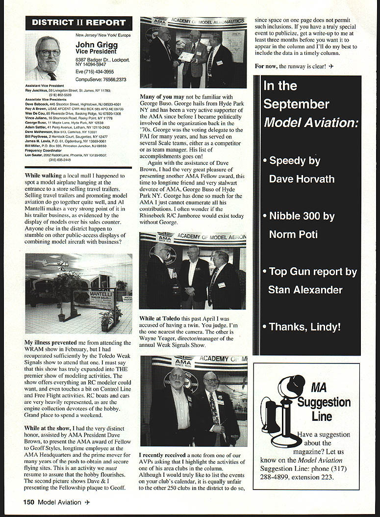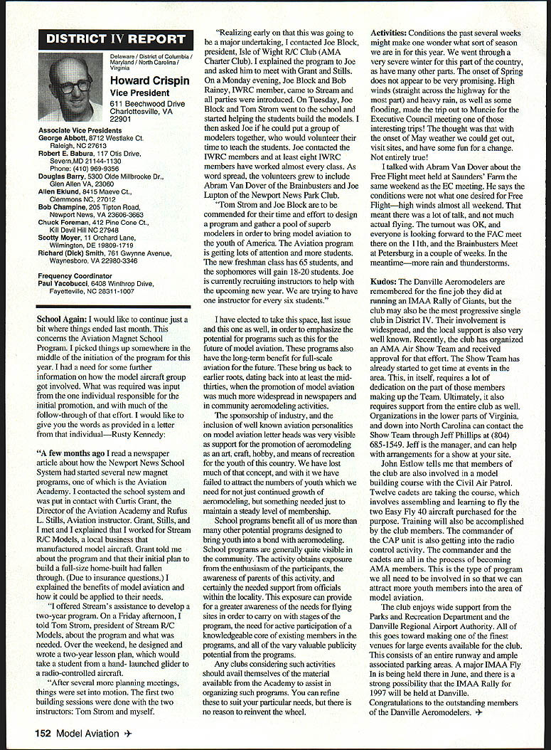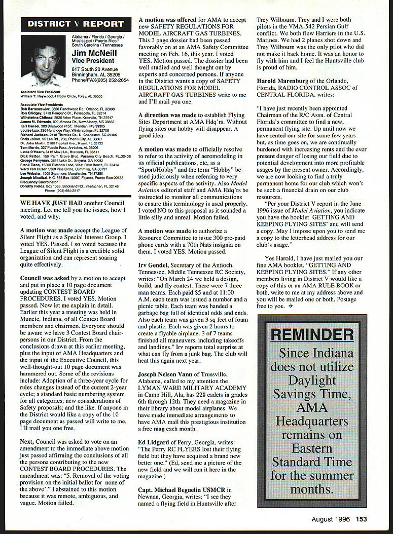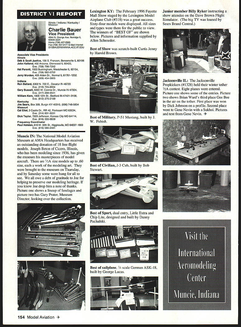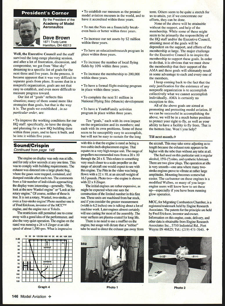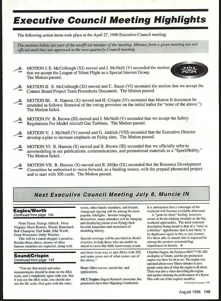 OV EAGLFS W U John Worth Greatest Reunion Time sellout overnight accommodations Muncie area likely press time July 6-7 1996 Celebration Eagles weekend Planning Sunday night banquet based 300-400 attendees almost 250 confirmed end April another 400 indicated maybe hope mid-May theres numbers names expected big story Imagine example following Bert Pond first Nationals 70 years ago 1925 St Louis proxy flew winning Moffett International Contest entiy New Zealand 1936 Nationals Detroit coming along wife Norma Sixty-two years after 1934 Nationals Akron first second places then-new gas engine power free flight event Maxwell Bassett Joe Kovel plan 1996 Eagles event Joe expects fly famous KG2 design 1934 Joe Kovel still flying KG-2 model design first flew 30s modern replica duplicate has AMA Museum Photo shows Joe model right after its first flight 1988 model has flown times since will flown again Muncie year Celebration Eagles Originally Free Flight model now has radio control assure safe landings Photo John Zaic Similarly famous contestants flew 1936 Nats expected big Muncie weekend Frank Tlush Mike Granieri Ed Lidgard Charles Tracy Sr Waily Simmers Bill Effinger possibly Dick Korda Bill Brown made engines Bassett Kovel flew 30s along thousands others since coming fact will Brown Jr Free Flight event Muncie Eagles weekend ran John Delagrange Likewise will Old-Time Rubber Power events run Tom McCoy RC Vintage R/C Society will flying models 30s through 60s will also vintage Control Line flying activities Hall Famers expected besides already mentioned Arizona John Brodbeck Sr Bill Wisniewski California Vic Cunnyngham Sr Bob Holland Dale Kim Sal Taibi Cliff Weirick Connecticut Henry Struck Florida Paul Boyer Don Lowe Norm Rosenstock Georgia George Perryman Indiana Frank Garcher Iowa Hazel Sig-Hester Claude McCullough Maryland Don Clark Maynard Hill Nevada Bill Northrop New Jersey Joe Beshar Leon Shulman Pennsylvania Earl Witt Continued page 145 Hearing month pick up left hanging continuation material Dr Queveda Briefly last time out took look true threshold human hearing related SPL scale Three graphs presented see just what being discussed time out will look graph take further study effects sound human ear Let quote Dr Queveda directly accuracy Although SPL scale might look very interesting physicist would pits otologist trying diagnose hearing loss person subtle changes threshold line extremely important differential diagnosis hearing disorders looking offset curved line would akin looking through telescope comet deducing right going hit Mercury point physicians took over performed transformation SPL scale very valid mathematical exercise pulling up threshold line varying amounts frequency until became straight line new scale called HL scale Hearing Level new threshold line called 0dB line frequencies course threshold line pulled up line absolute deafness pulled up same amount frequency became curved line HL scale shown graph number 4 dynamic range hearing encircled line clinical audiometers built United States since about 1938 world calibrated following HL scale am aware audiometer Peters built England calibrated SPL units particular unit made 1978 hopefully have changed ways 0dB reference line periodic revisions first following ISO standards lately ANSI changes have minor decibel changes apply clinical audiometers dBA scale used sound meters less follows HL scale has remained unchanged number years Continued page 145 144 Model Aviation emy Model Aeronautics 5151 East Memorial Drive Muncie IN 47302 Howard Crispin Jr magnificent construction KG-2 shown displayed Cradle Aviation Museum New York during 1986 Photo Joe Kovel Further evidence Joe Kovels superior craftsmanship shown view KG-2s tail section typical entire model work art Photo Joe Kovel Executive Council Meeting Highlights following action items took place April 27 1996 Executive Council meeting MOTION E McCollough XI moved J McNeill V seconded motion accept League Silent Flight Special Interest Group Motion passed MOTION II E McCollough XI moved C Bauer VI seconded motion accept Contest Board Project Team Procedures Document Motion passed MOTION III R Hanson X moved H Crispin IV seconded Motion II document amended follows Removal voting provision initial ballot above Motion failed MOTION lV B Brown III moved J McNeill V seconded accept Safety Regulations Model Aircraft Gas Turbines Motion passed MOTION V J McNeill V moved G Aldrich VIII seconded Executive Director develop plan increase emphasis flying sites Motion passed MOTION VI R Hanson X moved B Brown LII seconded officially refer aeromodeling publications communications promotional materials Sport/hobby Motion failed MOTION VII R Hanson X moved R Miller IX seconded Resource Development Committee authorized move forward funding source prepaid phonecard project start 300 cards Motion passed #ext ecutive ouiwiI Meeting July 8 Muncie IN EagleslVforthwives other family members friendsIt anticipated videotape Autograph signing will among mostweekend will become available afterward Continued page 144popular sidelights Besides bringing a feeling however themselves attendees will bringingseems developing strongly big Texas George Aldrich Fromand displaying some flying theirweekend approaches common Virginia Hurst Bowers Woody Blanchardfavorite keepsakes mementos ofdescription being heard once Bob Champine Earl Stahl John Worthmodeling historya lifetime opportunity likely Wisconsin Dolly Wiscberbe duplicated again century will name-droppers paradiseSpecial coverage will provided ModelFor able attend expected Besides above dozens otherAviation help unable toamong greatest aeromodeling famous modelers expected along withattend savor 60th Anniversary eventexperiences history * SoundlCrispin Continued page 144 say sound noise measurements should done dBA scale completely agree you use dBA scale should also use HL scale goes other no way mix dBAs SPL make sense out what comes out mixes Next Other