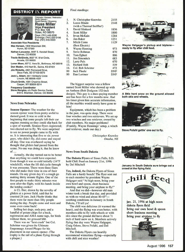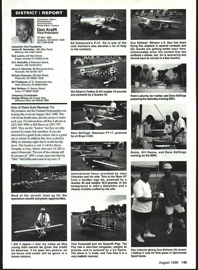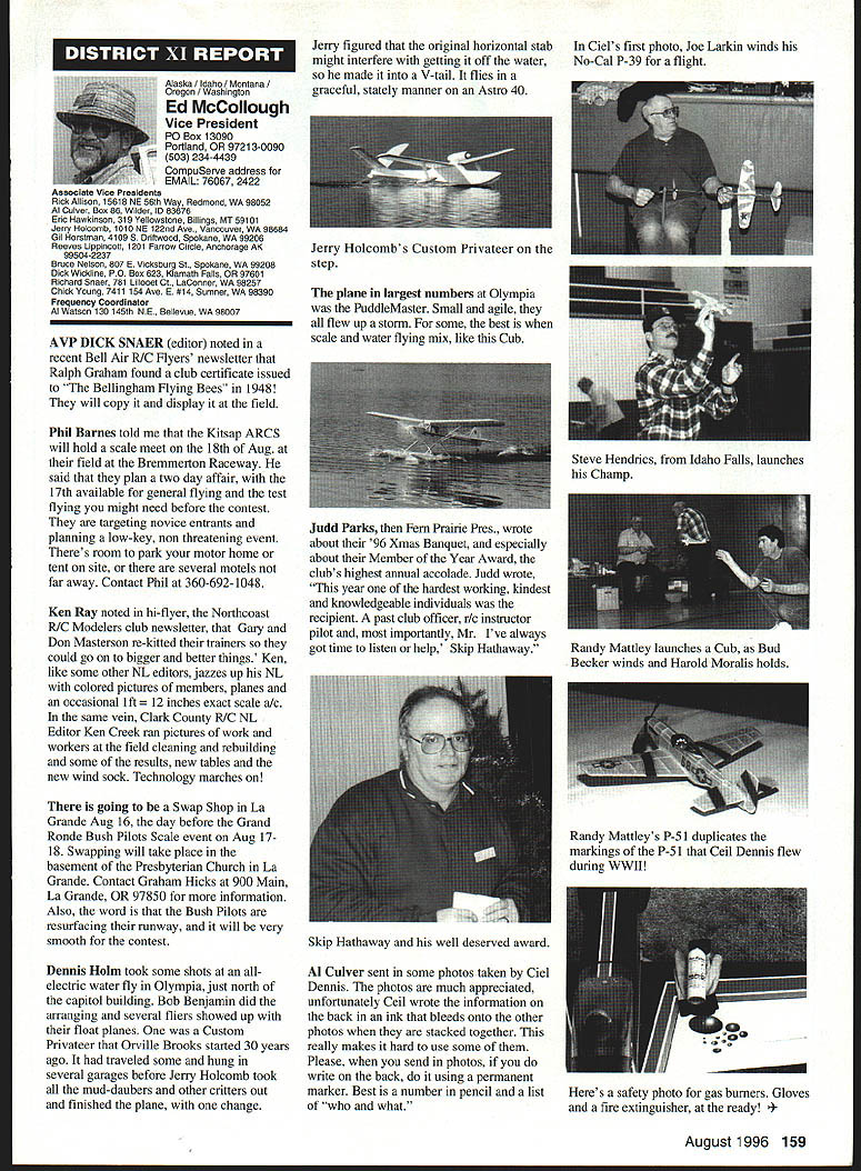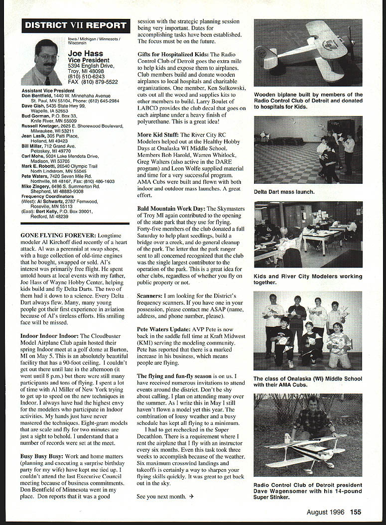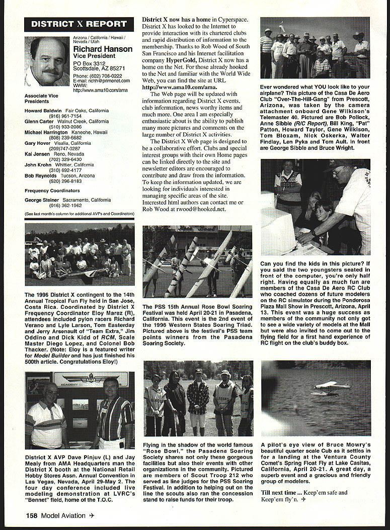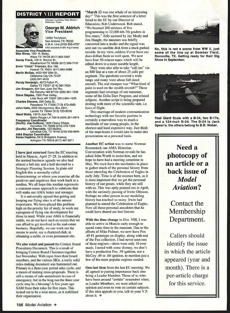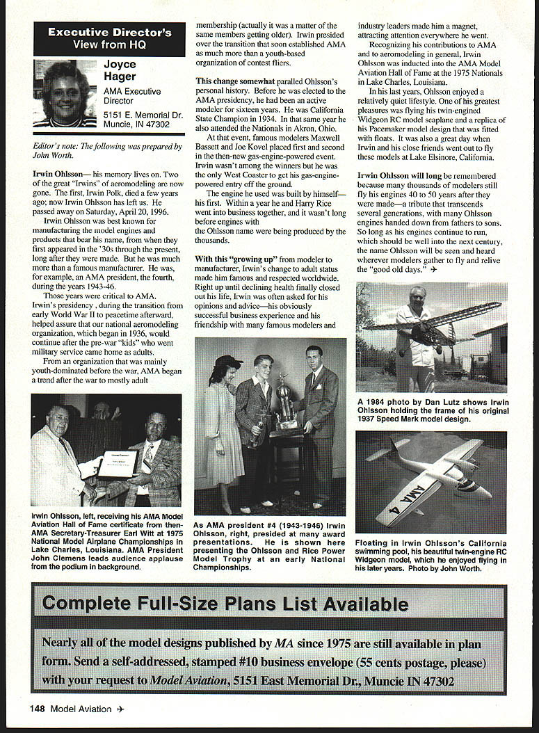 OV EAGLFS W U John Worth Greatest Reunion Time sellout overnight accommodations Muncie area likely press time July 6-7 1996 Celebration Eagles weekend Planning Sunday night banquet based 300-400 attendees almost 250 confirmed end April another 400 indicated maybe hope mid-May theres numbers names expected big story Imagine example following Bert Pond first Nationals 70 years ago 1925 St Louis proxy flew winning Moffett International Contest entiy New Zealand 1936 Nationals Detroit coming along wife Norma Sixty-two years after 1934 Nationals Akron first second places then-new gas engine power free flight event Maxwell Bassett Joe Kovel plan 1996 Eagles event Joe expects fly famous KG2 design 1934 Joe Kovel still flying KG-2 model design first flew 30s modern replica duplicate has AMA Museum Photo shows Joe model right after its first flight 1988 model has flown times since will flown again Muncie year Celebration Eagles Originally Free Flight model now has radio control assure safe landings Photo John Zaic Similarly famous contestants flew 1936 Nats expected big Muncie weekend Frank Tlush Mike Granieri Ed Lidgard Charles Tracy Sr Waily Simmers Bill Effinger possibly Dick Korda Bill Brown made engines Bassett Kovel flew 30s along thousands others since coming fact will Brown Jr Free Flight event Muncie Eagles weekend ran John Delagrange Likewise will Old-Time Rubber Power events run Tom McCoy RC Vintage R/C Society will flying models 30s through 60s will also vintage Control Line flying activities Hall Famers expected besides already mentioned Arizona John Brodbeck Sr Bill Wisniewski California Vic Cunnyngham Sr Bob Holland Dale Kim Sal Taibi Cliff Weirick Connecticut Henry Struck Florida Paul Boyer Don Lowe Norm Rosenstock Georgia George Perryman Indiana Frank Garcher Iowa Hazel Sig-Hester Claude McCullough Maryland Don Clark Maynard Hill Nevada Bill Northrop New Jersey Joe Beshar Leon Shulman Pennsylvania Earl Witt Continued page 145 Hearing month pick up left hanging continuation material Dr Queveda Briefly last time out took look true threshold human hearing related SPL scale Three graphs presented see just what being discussed time out will look graph take further study effects sound human ear Let quote Dr Queveda directly accuracy Although SPL scale might look very interesting physicist would pits otologist trying diagnose hearing loss person subtle changes threshold line extremely important differential diagnosis hearing disorders looking offset curved line would akin looking through telescope comet deducing right going hit Mercury point physicians took over performed transformation SPL scale very valid mathematical exercise pulling up threshold line varying amounts frequency until became straight line new scale called HL scale Hearing Level new threshold line called 0dB line frequencies course threshold line pulled up line absolute deafness pulled up same amount frequency became curved line HL scale shown graph number 4 dynamic range hearing encircled line clinical audiometers built United States since about 1938 world calibrated following HL scale am aware audiometer Peters built England calibrated SPL units particular unit made 1978 hopefully have changed ways 0dB reference line periodic revisions first following ISO standards lately ANSI changes have minor decibel changes apply clinical audiometers dBA scale used sound meters less follows HL scale has remained unchanged number years Continued page 145 144 Model Aviation emy Model Aeronautics 5151 East Memorial Drive Muncie IN 47302 Howard Crispin Jr magnificent construction KG-2 shown displayed Cradle Aviation Museum New York during 1986 Photo Joe Kovel Further evidence Joe Kovels superior craftsmanship shown view KG-2s tail section typical entire model work art Photo Joe Kovel Executive Council Meeting Highlights following action items took place April 27 1996 Executive Council meeting MOTION E McCollough XI moved J McNeill V seconded motion accept League Silent Flight Special Interest Group Motion passed MOTION II E McCollough XI moved C Bauer VI seconded motion accept Contest Board Project Team Procedures Document Motion passed MOTION III R Hanson X moved H Crispin IV seconded Motion II document amended follows Removal voting provision initial ballot above Motion failed MOTION lV B Brown III moved J McNeill V seconded accept Safety Regulations Model Aircraft Gas Turbines Motion passed MOTION V J McNeill V moved G Aldrich VIII seconded Executive Director develop plan increase emphasis flying sites Motion passed MOTION VI R Hanson X moved B Brown LII seconded officially refer aeromodeling publications communications promotional materials Sport/hobby Motion failed MOTION VII R Hanson X moved R Miller IX seconded Resource Development Committee authorized move forward funding source prepaid phonecard project start 300 cards Motion passed #ext ecutive ouiwiI Meeting July 8 Muncie IN EagleslVforthwives other family members friendsIt anticipated videotape Autograph signing will among mostweekend will become available afterward Continued page 144popular sidelights Besides bringing a feeling however themselves attendees will bringingseems developing strongly big Texas George Aldrich Fromand displaying some flying theirweekend approaches common Virginia Hurst Bowers Woody Blanchardfavorite keepsakes mementos ofdescription being heard once Bob Champine Earl Stahl John Worthmodeling historya lifetime opportunity likely Wisconsin Dolly Wiscberbe duplicated again century will name-droppers paradiseSpecial coverage will provided ModelFor able attend expected Besides above dozens otherAviation help unable toamong greatest aeromodeling famous modelers expected along withattend savor 60th Anniversary eventexperiences history * SoundlCrispin Continued page 144 say sound noise measurements should done dBA scale completely agree you use dBA scale should also use HL scale goes other no way mix dBAs SPL make sense out what comes out mixes Next Other