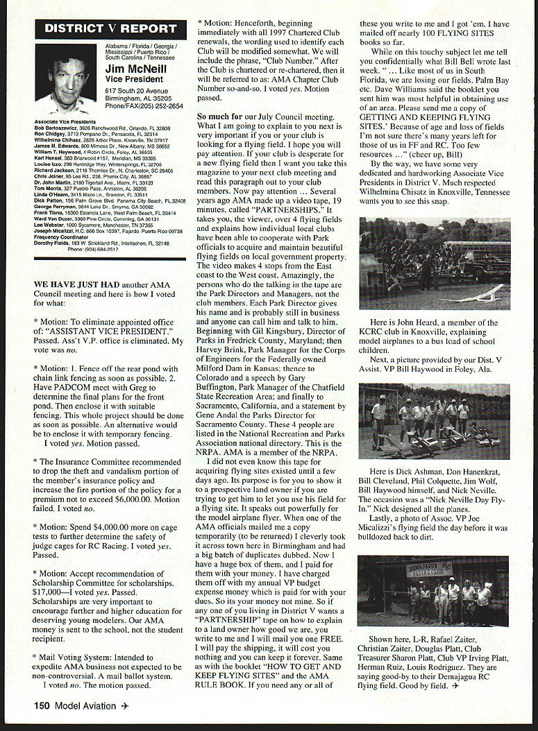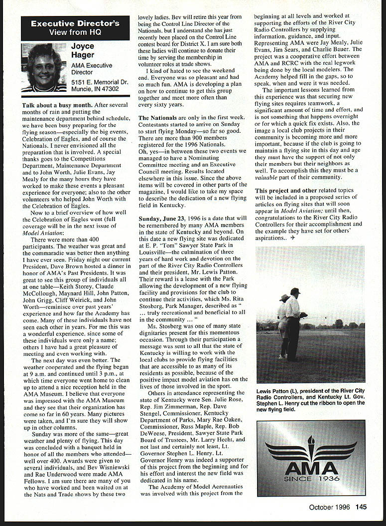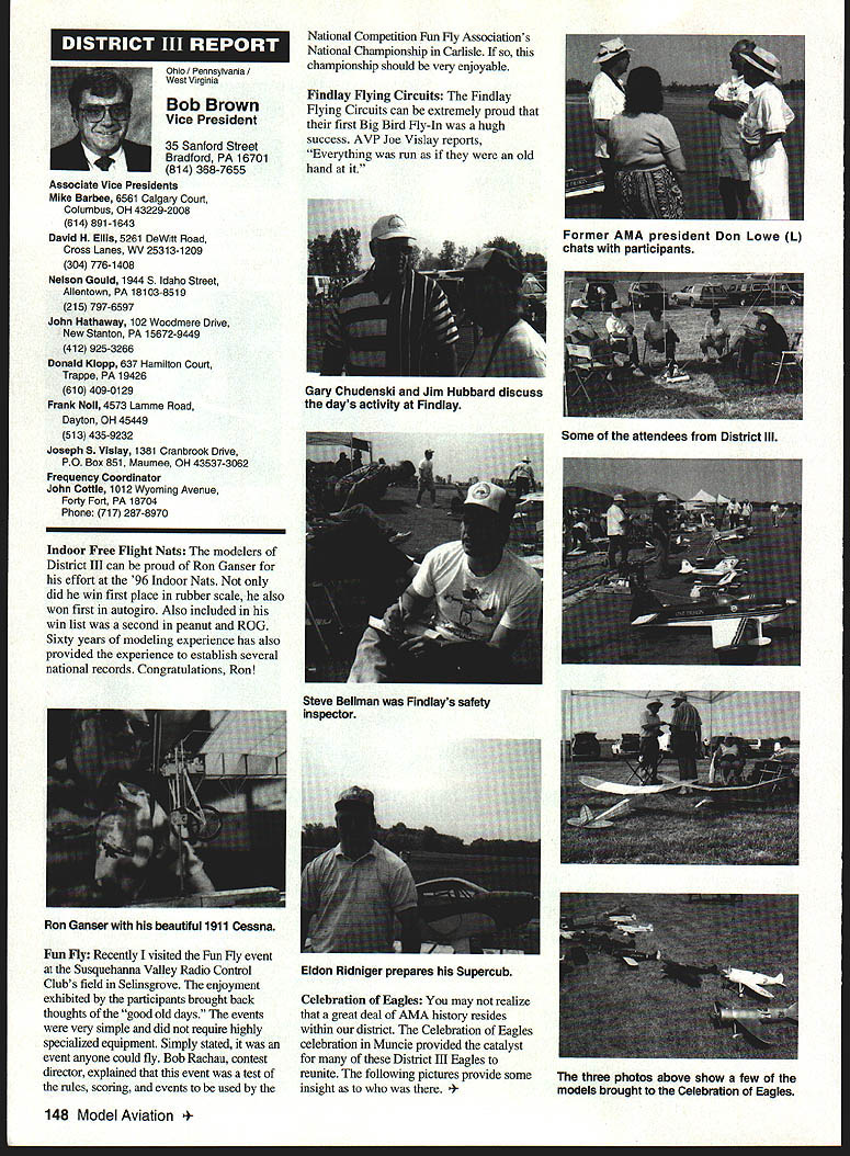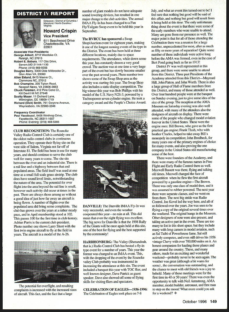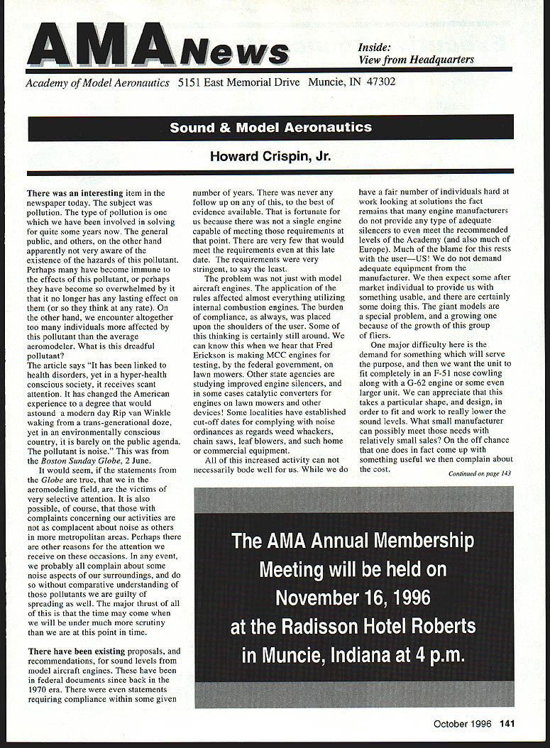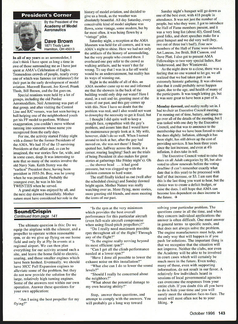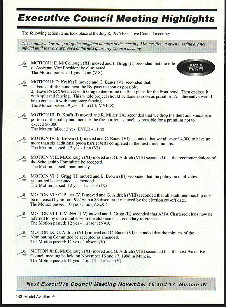 A Academy Model Aeronautics 5151 East Memorial Drive Muncie IN 47302 interesting item newspaper today subject pollution type pollution have involved solving quite some years now general public others other hand apparently very aware existence hazards pollutant Perhaps have become immune effects pollutant perhaps have become overwhelmed no longer has lasting effect think rate other hand encounter altogether too individuals affected pollutant average aeromodeler What dreadful pollutant article says has linked health disorders yet hyper-health conscious society receives scant attention has changed American experience degree would astound modern day Rip van Winkle waking trans-generational doze yet environmentally conscious country barely public agenda pollutant noise Boston Sunday Globe 2 June would seem statements Globe true aeromodeling field victims very selective attention also possible course complaints concerning activities complacent about noise others metropolitan areas Perhaps other reasons attention receive occasions event probably complain about some noise aspects surroundings comparative understanding pollutants guilty spreading well major thrust of time may come will under much scrutiny point time have existing proposals recommendations sound levels model aircraft engines have federal documents since back 1970 era statements requiring compliance within some given number years never follow up best evidence available fortunate us because single engine capable meeting requirements point very few would meet requirements late date requirements very stringent say least problem just model aircraft engines application rules affected almost everything utilizing internal combustion engines burden compliance always placed upon shoulders user Some thinking certainly still around can know hear Fred Erickson making MCC engines testing federal government lawn mowers Other state agencies studying improved engine silencers some cases catalytic converters engines lawn mowers other devices Some localities have established cut-off dates complying noise ordinances regards weed whackers chain saws leaf blowers such home commercial equipment increased activity can necessarily bode well us have fair number individuals hard work looking solutions fact remains engine manufacturers provide type adequate silencers meet recommended levels Academy also much Europe Much blame rests userUS demand adequate equipment manufacturer expect some after market individual provide us something usable certainly some doing giant models special problem growing because growth group fliers major difficulty demand something will serve purpose want unit fit completely F-51 nose cowling along G-62 engine some larger unit can appreciate takes particular shape design order fit work really lower sound levels What small manufacturer can possibly meet needs relatively small sales off chance does fact come up something useful complain about cost October 1996 141 Inside View Headquarters Howard Crispin Jr Continued page 143 cii Executive Council Meeting Highlights following action items took place July 81996 Executive Council meeting MOTION E McCollough XI moved J Grigg II seconded title Assistant Vice President eliminated Motion passed 11 yes 2 no VX MOTION II D Krafft moved C Bauer VI seconded 1 Fence off pond near By-pass soon possible 2 Have PADCOM meet Greg determine final plans front pond enclose split rail fencing whole project should done soon possible An alternative would enclose temporary fencing Motion passed 9 yes 4 no IIIIVVIIX MOTION III D Krafft moved R Miller IX seconded drop theft vandalism portion policy increase fire portion much possible premium exceed $6000 Motion failed 2 yes EVPI 11 no MOTION IV B Brown III moved C Bauer VI seconded allocate $4000 have no six additional pylon barrier tests completed next three months Motion passed 12 yes 1 no VI MOTION V E McCollough XI moved G Aldrich VIII seconded recommendations Scholarship Committee accepted Motion passed unanimously MOTION VI J Grigg II moved B Brown III seconded policy mail votes submitted accepted amended Motion passed 12 yes 1 absent IX MOTION VII C Bauer VII moved G Aldrich VIII seconded adult membership dues increased $6 1997 $3 discount received election cut-off date Motion passed 10 yes 3 no VXXI MOTION VIII J McNeill IV moved J Grigg II seconded AMA Chartered clubs now referred club number club name secondary reference Motion passed 12 yes 1 absent NAA MOTION IX G Aldrich VIII moved C Bauer VI seconded minutes Nominating Committee accepted amended Motion passed 11 yes 1 absent V MOTION X E McCollough XI moved G Aldrich VIII seconded next Executive Council meeting held November 16 17 1996 Muncie Motion passed 11 yes 1 no 1 absentV 142 Model Aviation w L7 given Dave Brown 1871 Trudy Lane Hamilton OH 45013 years aeromodeler dont think have spent long time awe surrounding have just spent AMAs Celebration Eagles Tremendous crowds people nearly famous infamous part early development model aviation Maxwell Bassett Joe Kovel Frank Tlush Bill Brown list goes Special reunions held lot groups including old Purdue Aeromodellers Neil Armstrong part group after visiting Control Line R/C venues last seen having ball helping neighborhood youth get FF model perform Without exaggeration couldnt move running someone name recognized early days activity started Friday night dinner former Presidents AMA 10 13 surviving Presidents affair can imagined war stories flew far wide some cases deep interesting note stories involve old Navy Nats Keith Storey earliest President having president 1953-56 Boy young president Probably youngest ever late TWENTIES served grand night enjoyed next day dawned beautifully Mother nature must have considered role history model aviation decided give us break weather absolutely beautiful day Saturday conceivable kind model airplane flown some vintage some modem far often being flown vintage pilot Saturday night reception AMA Museum held comers