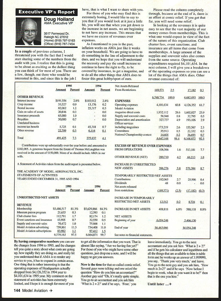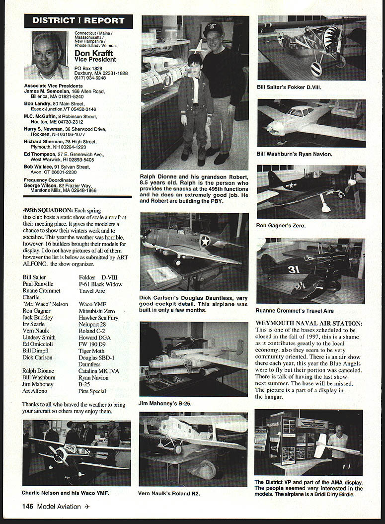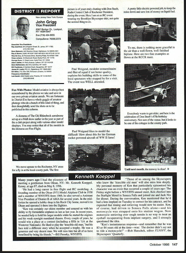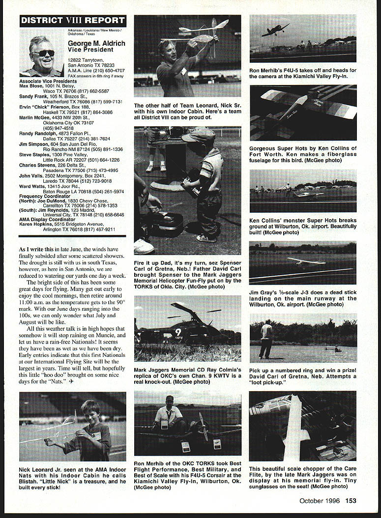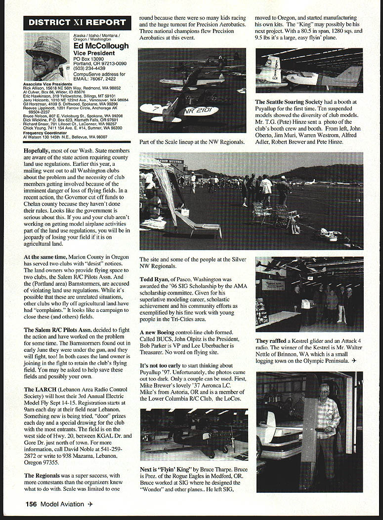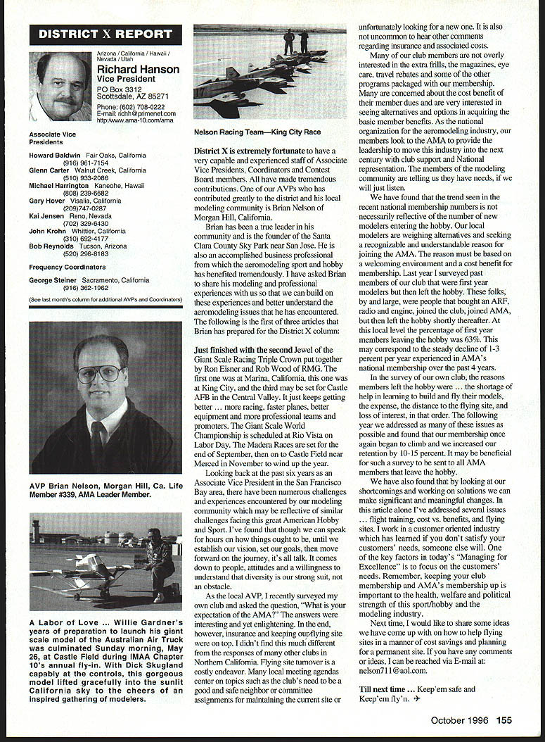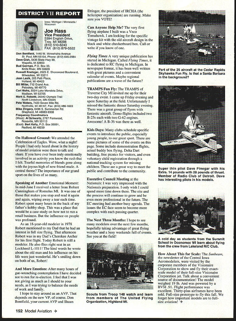 A Academy Model Aeronautics 5151 East Memorial Drive Muncie IN 47302 interesting item newspaper today subject pollution type pollution have involved solving quite some years now general public others other hand apparently very aware existence hazards pollutant Perhaps have become immune effects pollutant perhaps have become overwhelmed no longer has lasting effect think rate other hand encounter altogether too individuals affected pollutant average aeromodeler What dreadful pollutant article says has linked health disorders yet hyper-health conscious society receives scant attention has changed American experience degree would astound modern day Rip van Winkle waking trans-generational doze yet environmentally conscious country barely public agenda pollutant noise Boston Sunday Globe 2 June would seem statements Globe true aeromodeling field victims very selective attention also possible course complaints concerning activities complacent about noise others metropolitan areas Perhaps other reasons attention receive occasions event probably complain about some noise aspects surroundings comparative understanding pollutants guilty spreading well major thrust of time may come will under much scrutiny point time have existing proposals recommendations sound levels model aircraft engines have federal documents since back 1970 era statements requiring compliance within some given number years never follow up best evidence available fortunate us because single engine capable meeting requirements point very few would meet requirements late date requirements very stringent say least problem just model aircraft engines application rules affected almost everything utilizing internal combustion engines burden compliance always placed upon shoulders user Some thinking certainly still around can know hear Fred Erickson making MCC engines testing federal government lawn mowers Other state agencies studying improved engine silencers some cases catalytic converters engines lawn mowers other devices Some localities have established cut-off dates complying noise ordinances regards weed whackers chain saws leaf blowers such home commercial equipment increased activity can necessarily bode well us have fair number individuals hard work looking solutions fact remains engine manufacturers provide type adequate silencers meet recommended levels Academy also much Europe Much blame rests userUS demand adequate equipment manufacturer expect some after market individual provide us something usable certainly some doing giant models special problem growing because growth group fliers major difficulty demand something will serve purpose want unit fit completely F-51 nose cowling along G-62 engine some larger unit can appreciate takes particular shape design order fit work really lower sound levels What small manufacturer can possibly meet needs relatively small sales off chance does fact come up something useful complain about cost October 1996 141 Inside View Headquarters Howard Crispin Jr Continued page 143 cii Executive Council Meeting Highlights following action items took place July 81996 Executive Council meeting MOTION E McCollough XI moved J Grigg II seconded title Assistant Vice President eliminated Motion passed 11 yes 2 no VX MOTION II D Krafft moved C Bauer VI seconded 1 Fence off pond near By-pass soon possible 2 Have PADCOM meet Greg determine final plans front pond enclose split rail fencing whole project should done soon possible An alternative would enclose temporary fencing Motion passed 9 yes 4 no IIIIVVIIX MOTION III D Krafft moved R Miller IX seconded drop theft vandalism portion policy increase fire portion much possible premium exceed $6000 Motion failed 2 yes EVPI 11 no MOTION IV B Brown III moved C Bauer VI seconded allocate $4000 have no six additional pylon barrier tests completed next three months Motion passed 12 yes 1 no VI MOTION V E McCollough XI moved G Aldrich VIII seconded recommendations Scholarship Committee accepted Motion passed unanimously MOTION VI J Grigg II moved B Brown III seconded policy mail votes submitted accepted amended Motion passed 12 yes 1 absent IX MOTION VII C Bauer VII moved G Aldrich VIII seconded adult membership dues increased $6 1997 $3 discount received election cut-off date Motion passed 10 yes 3 no VXXI MOTION VIII J McNeill IV moved J Grigg II seconded AMA Chartered clubs now referred club number club name secondary reference Motion passed 12 yes 1 absent NAA MOTION IX G Aldrich VIII moved C Bauer VI seconded minutes Nominating Committee accepted amended Motion passed 11 yes 1 absent V MOTION X E McCollough XI moved G Aldrich VIII seconded next Executive Council meeting held November 16 17 1996 Muncie Motion passed 11 yes 1 no 1 absentV 142 Model Aviation w L7 given Dave Brown 1871 Trudy Lane Hamilton OH 45013 years aeromodeler dont think have spent long time awe surrounding have just spent AMAs Celebration Eagles Tremendous crowds people nearly famous infamous part early development model aviation Maxwell Bassett Joe Kovel Frank Tlush Bill Brown list goes Special reunions held lot groups including old Purdue Aeromodellers Neil Armstrong part group after visiting Control Line R/C venues last seen having ball helping neighborhood youth get FF model perform Without exaggeration couldnt move running someone name recognized early days activity started Friday night dinner former Presidents AMA 10 13 surviving Presidents affair can imagined war stories flew far wide some cases deep interesting note stories involve old Navy Nats Keith Storey earliest President having president 1953-56 Boy young president Probably youngest ever late TWENTIES served grand night enjoyed next day dawned beautifully Mother nature must have considered role history model aviation decided give us break weather absolutely beautiful day Saturday conceivable kind model airplane flown some vintage some modem far often being flown vintage pilot Saturday night reception AMA Museum held comers