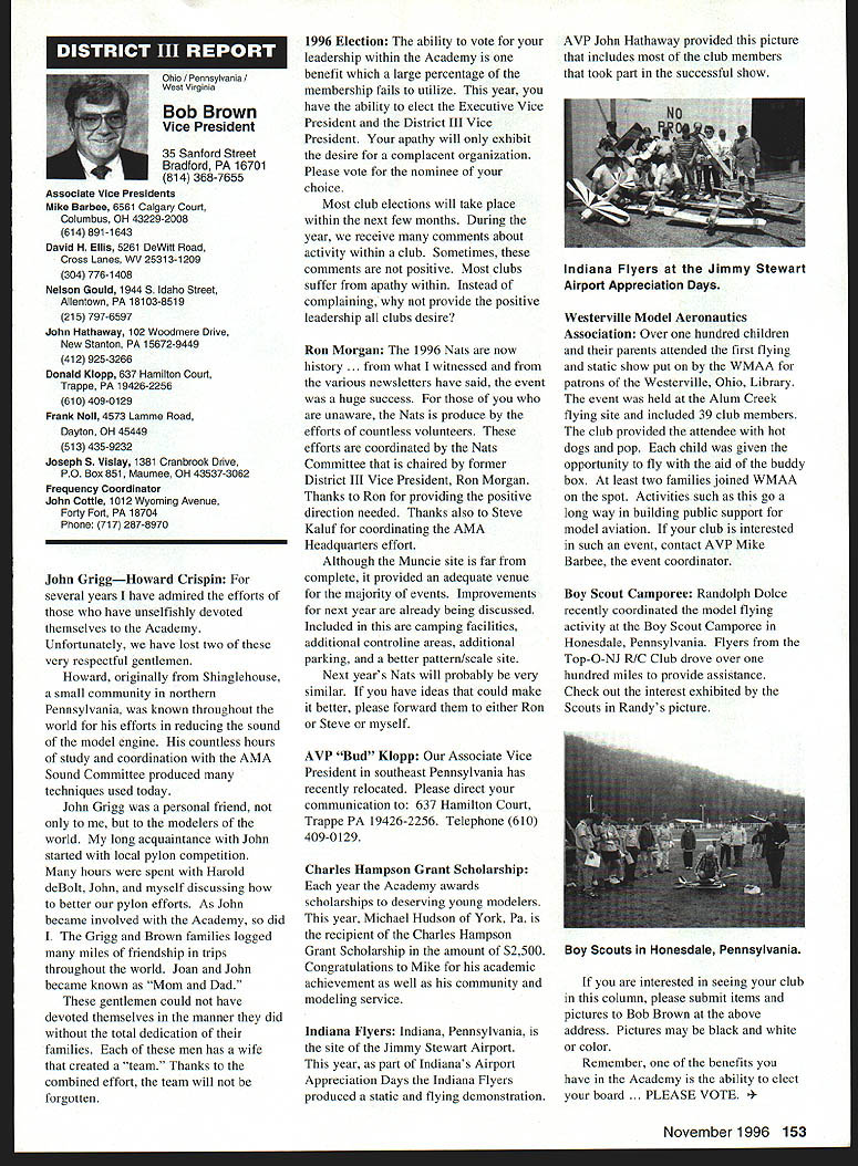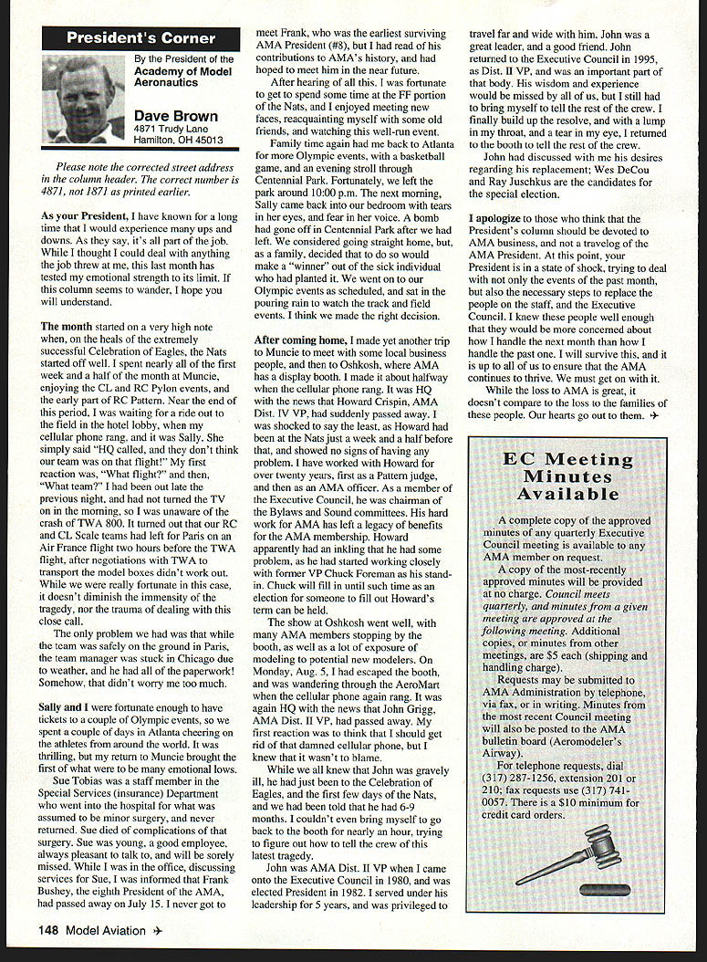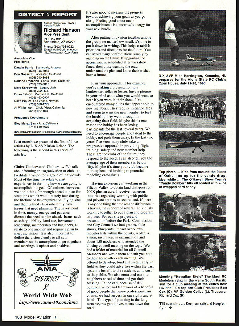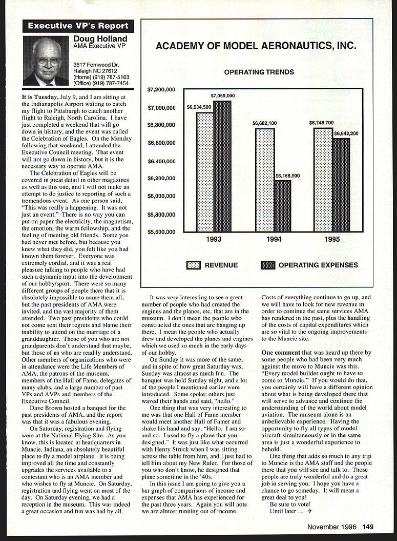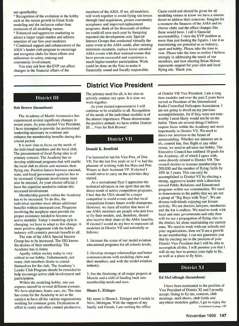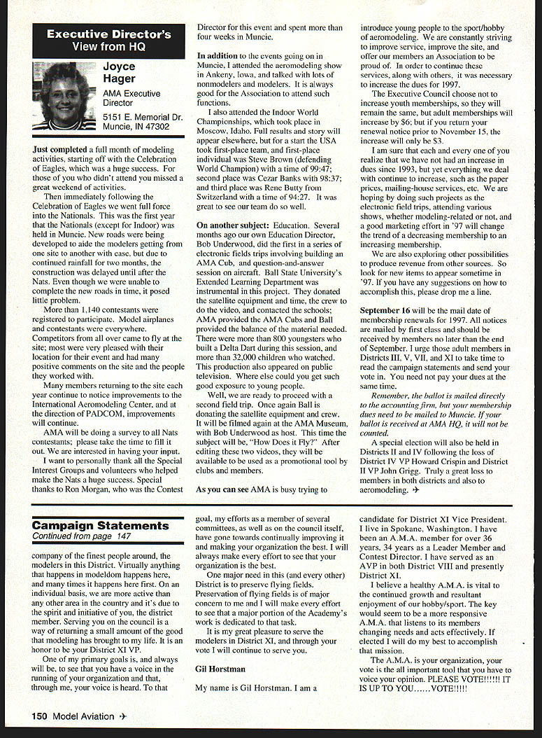 \deflang1033\pard\plain\f0\fs17 Inside View Headquarters am incumbent Executive Vice President AMA candidate re election full term beginning January 1 1997 appointed Executive Council February 1996 complete term Dave Brown elected President AMA graduated Duke University degree accounting am certified public accountant have practicing 46 years During WW III served US Navy primarily Phillippines present time am Senior Partner President CD Holland Company PA certified public accounting firm Executive Vice President AMA responsible financial operations includes matters finance budgeting daily accounting operations structuring debt acquire fixed assets involvement federal tax law due amount revenue generated because AMA has Unrelated Business Income sales advertising Model Aviation have great deal academic training well vast practical experience items previously mentioned plus great deal involvement management responsibilities consulting addition have served finance committee three years factors stand good stead perform work required position manner both knowledgeable professional involvement model aviation goes back 1935 began building model airplanes YMCA camp have involved indoor free flight Ucontrol radio control categories have active participant free flight Ucontrol radio control having both contestant events including various nationals well CD over 30 years am presently active electric flying Due love modeling extensive business experience field accounting finance management feel am qualified serve Executive Vice President AMA will appreciate support nominee running office AMA given opportunity present two campaign statements Model Aviation magazine other statement accompanies election ballot annual membership renewal Rather repeating same remarks have chosen address separate issues statement Since slated magazine read would like ask favor fellow modeler Please vote Though approximately 160000 members AMA frequently have less 15000 members participate election process strongly believe member has right express concerns constructively criticize efforts have chosen lead result having met individual member obligation participate election process Im running office Executive Vice President can further improve efforts proceeding As EVP focus will financial health AMA chartered clubs statement chartered clubs no mistake meant taken lightly campaign statements have expressed need to support chartered clubs local flying sites As AVP past six years have received countless calls regarding lost flying sites problems encountered getting new ones Some say we should can believe can build International Flying site Muncie can yet again much acquire maintain local flying sites work directly chartered clubs recognizably issues everyones agenda important both individually collectively concerns needs have shared long range outlook sport hobby *\tab Technical support flying site acquisition *\tab Financial support flying site purchases * Cooperative consolidation AMA Special Interest Group competition * Cost containment Nats better utilization event promotion 146 Model Aviation emy Model Aeronautics 5151 East Memorial Drive Muncie IN 47302 Executive Vice President Doug Holland IncumbentBrian D Nelson Howard Crispin Jr 1925-1996 John C Grigg 1932-1996 deeply saddened two Executive Council members Additional report loss information contained AMA News officers District Report Persons wish remember gentlemen asked make contribution name AMA Scholarship Fund AMA Annual Membership Meeting will held November 16 1996 at4 pm Radisson Hotel Roberts Muncie Indiana sport/hobby *\tab Recognition evolution hobby such recent growth Giant Scale modeling inclusion rather exclusion modeling venues *\tab Enhanced aggressive marketing attract larger target market address retention first-year modelers *\tab Continued support enhancement AMAs leader club program encourage recognize clubs efforts milestones safety training community involvement may ask EVP can affect changes financial affairs members AMA modelers will work together avoid flying site losses through land acquisition greater community acceptance improved replacement programs think thousands dollars could save year foregoing repeated site development cost Special Interest Groups conducted virtually same event AMA could after meeting minimum standards replace lower attended AIVIA events national events have proven successful experience much higher member participation Work could done Nats make financially sound fiscally responsible Cause could should given modeling venues know have sincere desire address concerns Imagine moment finances AMA its charter clubs effect changes like would have call financial accountability view EVP position just footing figures see maximizing potential industry sport hobby Please take time vote Please take time realize believe strongly addressing needs members electing Brian Nelson represents support club local flying site Thank District Vice President Academy Model Aeronautics has experienced several significant changes recent years As elected Vice President have attempted provide professional leadership necessary continue enhance membership benefits during crncial period now time focus needs individual members local club procurement local flying sites primary concern Academy has develop additional programs will enable local club obtain maintain flying site Positive liaison between national state local government agencies has increased Corporate involvement must also stressed As elected official have expertise needed initiate increased involvement Membership growth within Academy has increased individual member must obtain additional benefits increased cost Programs involving neophyte must provide proper assistance needed become active modeler Todays modeling style changing have adapt change positive alignment hobby industry will certainly provide benefit role AMA Special Interest Group has increased SIG knows desires membership Academy ha