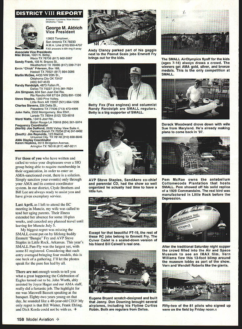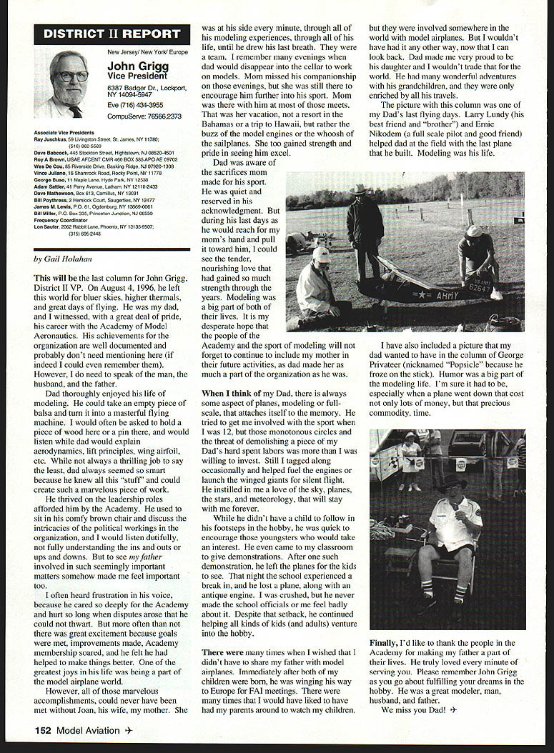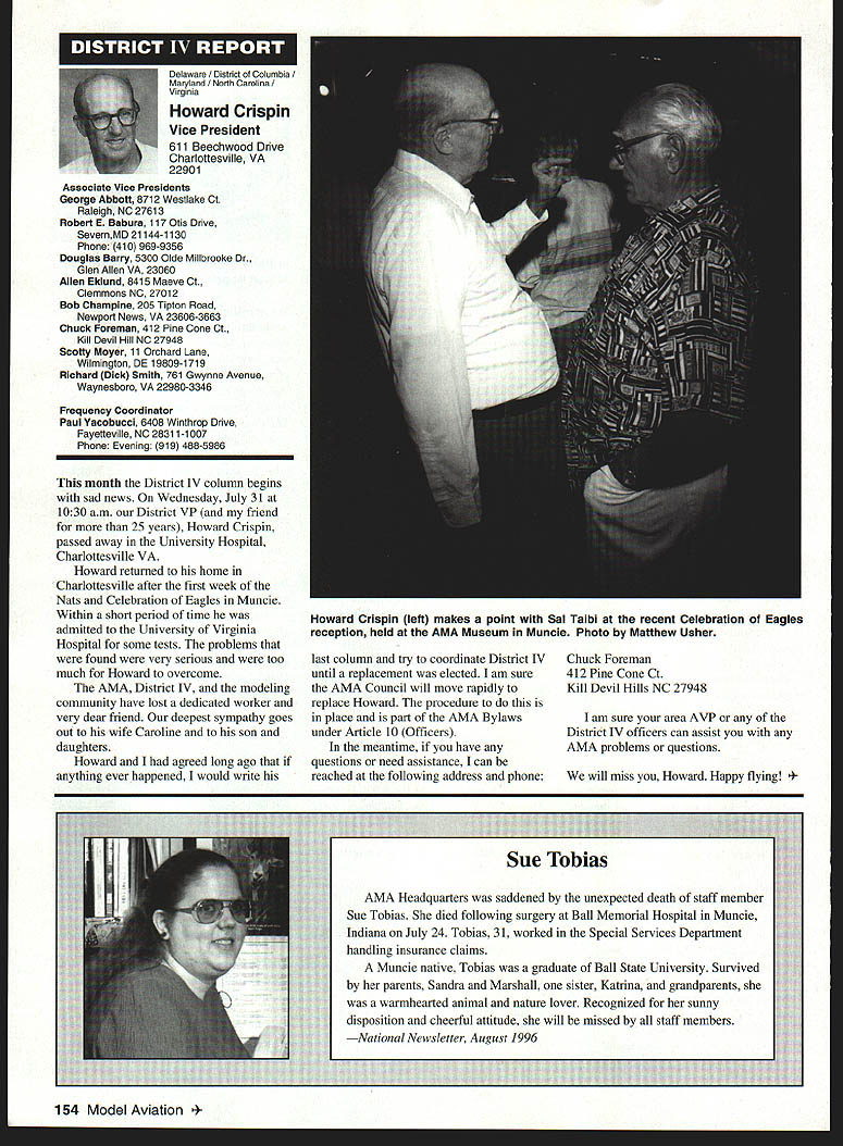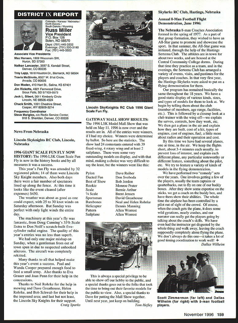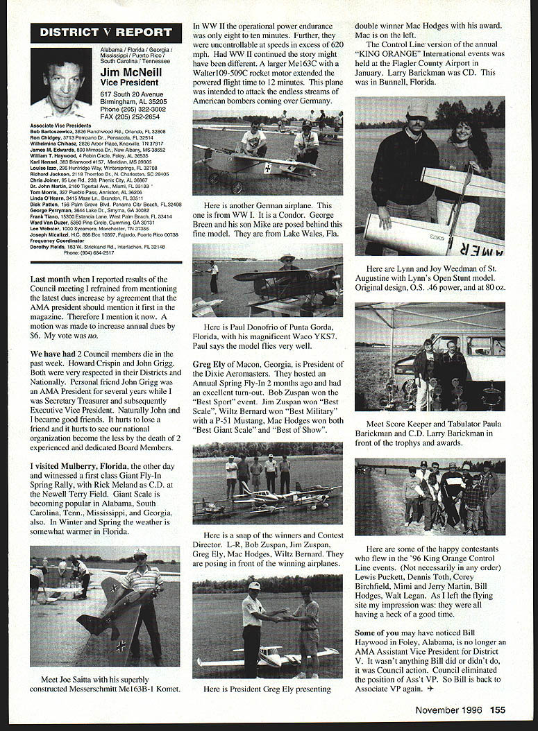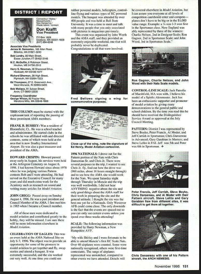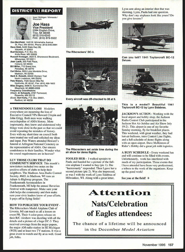 \deflang1033\pard\plain\f0\fs17 Inside View Headquarters am incumbent Executive Vice President AMA candidate re election full term beginning January 1 1997 appointed Executive Council February 1996 complete term Dave Brown elected President AMA graduated Duke University degree accounting am certified public accountant have practicing 46 years During WW III served US Navy primarily Phillippines present time am Senior Partner President CD Holland Company PA certified public accounting firm Executive Vice President AMA responsible financial operations includes matters finance budgeting daily accounting operations structuring debt acquire fixed assets involvement federal tax law due amount revenue generated because AMA has Unrelated Business Income sales advertising Model Aviation have great deal academic training well vast practical experience items previously mentioned plus great deal involvement management responsibilities consulting addition have served finance committee three years factors stand good stead perform work required position manner both knowledgeable professional involvement model aviation goes back 1935 began building model airplanes YMCA camp have involved indoor free flight Ucontrol radio control categories have active participant free flight Ucontrol radio control having both contestant events including various nationals well CD over 30 years am presently active electric flying Due love modeling extensive business experience field accounting finance management feel am qualified serve Executive Vice President AMA will appreciate support nominee running office AMA given opportunity present two campaign statements Model Aviation magazine other statement accompanies election ballot annual membership renewal Rather repeating same remarks have chosen address separate issues statement Since slated magazine read would like ask favor fellow modeler Please vote Though approximately 160000 members AMA frequently have less 15000 members participate election process strongly believe member has right express concerns constructively criticize efforts have chosen lead result having met individual member obligation participate election process Im running office Executive Vice President can further improve efforts proceeding As EVP focus will financial health AMA chartered clubs statement chartered clubs no mistake meant taken lightly campaign statements have expressed need to support chartered clubs local flying sites As AVP past six years have received countless calls regarding lost flying sites problems encountered getting new ones Some say we should can believe can build International Flying site Muncie can yet again much acquire maintain local flying sites work directly chartered clubs recognizably issues everyones agenda important both individually collectively concerns needs have shared long range outlook sport hobby *\tab Technical support flying site acquisition *\tab Financial support flying site purchases * Cooperative consolidation AMA Special Interest Group competition * Cost containment Nats better utilization event promotion 146 Model Aviation emy Model Aeronautics 5151 East Memorial Drive Muncie IN 47302 Executive Vice President Doug Holland IncumbentBrian D Nelson Howard Crispin Jr 1925-1996 John C Grigg 1932-1996 deeply saddened two Executive Council members Additional report loss information contained AMA News officers District Report Persons wish remember gentlemen asked make contribution name AMA Scholarship Fund AMA Annual Membership Meeting will held November 16 1996 at4 pm Radisson Hotel Roberts Muncie Indiana sport/hobby *\tab Recognition evolution hobby such recent growth Giant Scale modeling inclusion rather exclusion modeling venues *\tab Enhanced aggressive marketing attract larger target market address retention first-year modelers *\tab Continued support enhancement AMAs leader club program encourage recognize clubs efforts milestones safety training community involvement may ask EVP can affect changes financial affairs members AMA modelers will work together avoid flying site losses through land acquisition greater community acceptance improved replacement programs think thousands dollars could save year foregoing repeated site development cost Special Interest Groups conducted virtually same event AMA could after meeting minimum standards replace lower attended AIVIA events national events have proven successful experience much higher member participation Work could done Nats make financially sound fiscally responsible Cause could should given modeling venues know have sincere desire address concerns Imagine moment finances AMA its charter clubs effect changes like would have call financial accountability view EVP position just footing figures see maximizing potential industry sport hobby Please take time vote Please take time realize believe strongly addressing needs members electing Brian Nelson represents support club local flying site Thank District Vice President Academy Model Aeronautics has experienced several significant changes recent years As elected Vice President have attempted provide professional leadership necessary continue enhance membership benefits during crncial period now time focus needs individual members local club procurement local flying sites primary concern Academy has develop additional programs will enable local club obtain maintain flying site Positive liaison between national state local government agencies has increased Corporate involvement must also stressed As elected official have expertise needed initiate increased involvement Membership growth within Academy has increased individual member must obtain additional benefits increased cost Programs involving neophyte must provide proper assistance needed become active modeler Todays modeling style changing have adapt change positive alignment hobby industry will certainly provide benefit role AMA Special Interest Group has increased SIG knows desires membership Academy ha