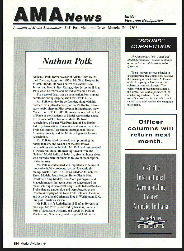 Inside View Headquarters very serious mistake paragraph completely destroys meaning what said end first paragraph second column page two says velocity part mechanical systems almost constant impedance conducting medium ear . use word ear instead air should have said renders paragraph misleading 184 Model Aviation emy Model Aeronautics 5151 East Memorial Drive Muncie IN 47302 September 1996 Sound Model Aeronautics column contained error detected Julio Q uevedo Officer columns will return next month