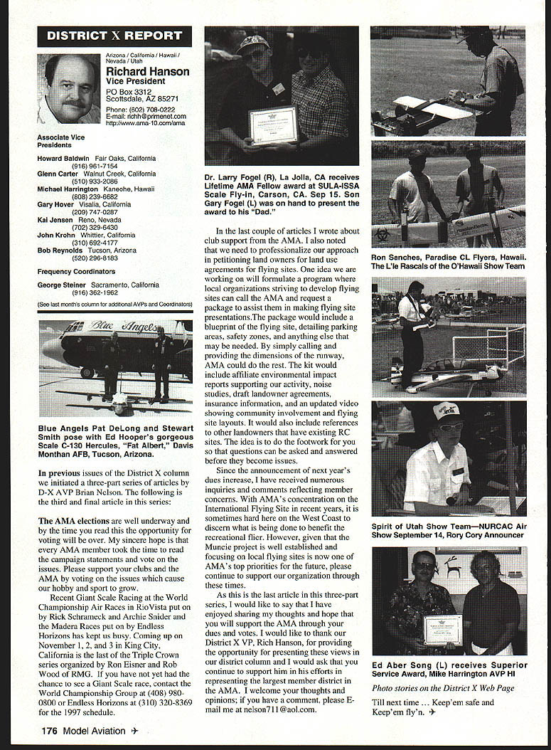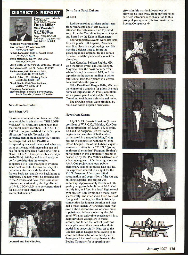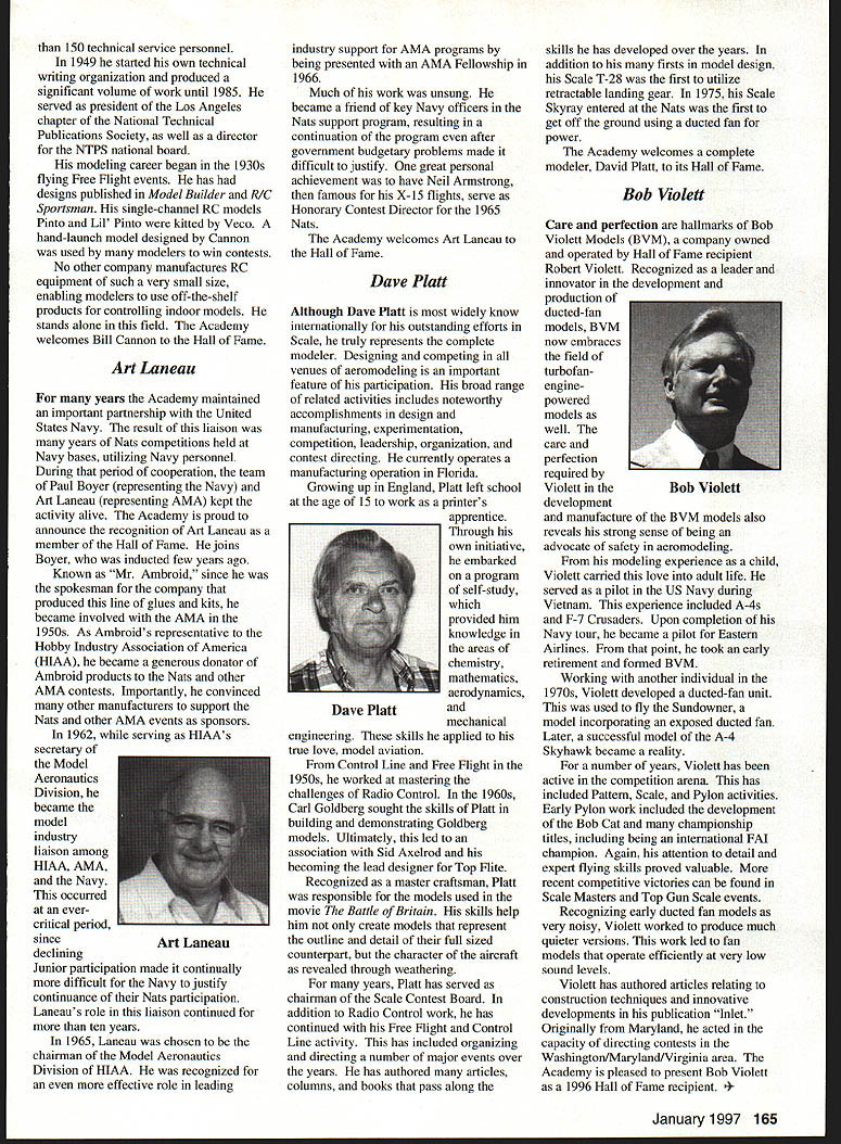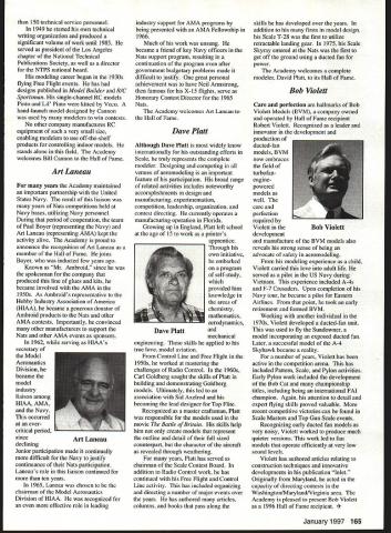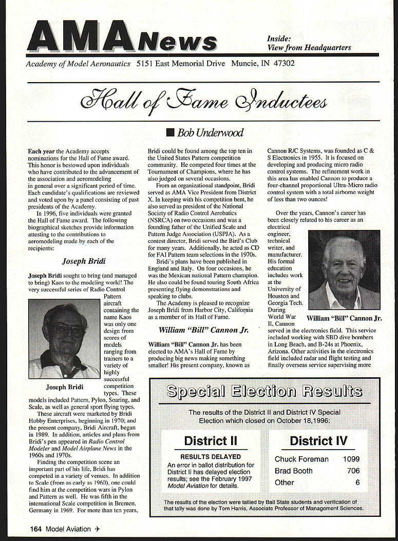 Anws U Academy Model Aeronautics 5151 East Memorial Drive Muncie IN 47302 @a4Qame @39nx/iwteej U Bob Undeiwood year Academy accepts nominations Hall Fame award honor bestowed upon individuals have contributed advancement association aeromodeling general over significant period time candidates qualifications reviewed voted upon panel consisting past presidents Academy 1996 five individuals granted Hall Fame award following biographical sketches provide information attesting contributions aeromodeling made recipients Joseph Bridi Joseph Bridi sought bring managed bring Kaos modeling world very successful series Radio Control Pattern aircraft containing name Kaos design scores models ranging trainers variety highly successful Joseph Bridicompetition types models included Pattern Pylon Soaring Scale well general sport flying types aircraft marketed Bridi Hobby Enterprises beginning 1970 present company Bridi Aircraft began 1989 addition articles plans Bridis pen appeared Radio Control Modeler Model Airplane News 1960s 1970s Finding competition scene important part life Bridi has competed variety venues addition Scale early 1960 could find him competition wars Pylon Pattern well fifth international Scale competition Bremen Germany 1969 ten years Bridi could found among top ten United States Pattern competition community competed four times Tournament Champions has also judged several occasions organizational standpoint Bridi served AMA Vice President District X keeping competition bent also served president National Society Radio Control Aerobatics NSRCA two occasions founding father Unified Scale Pattern Judge Association USPJA As contest director Bridi served Birds Club years Additionally acted CD FAI Pattern team selections 1970s Bridis plans have published England Italy four occasions Mexican national Pattern champion also could found touring South Africa presenting flying demonstrations speaking clubs Academy pleased recognize Joseph Bridi Harbor City California member its Hall Fame William Bill Cannon Jr William Bill Cannon Jr has elected s Hall Fame producing big news making something smaller present company known Cannon RIC Systems founded C & S Electronics 1955 focused developing producing micro radio control systems refinement work area has enabled Cannon produce four-channel proportional Ultra-Micro radio control system total alrborne weight less two ounces Over years Cannons career has closely related career electrical engineer technical writer manufacturer formal education includes work University Houston Georgia Tech During World War II Cannon served electronics field service included working SBD dive bombers Long Beach B-24s Phoenix Arizona Other activities electronics field included radar flight testing finally overseas service supervising results District II District IV Special Election closed October 181996 District II RESULTS DELAYED An error ballot distribution District II has delayed election results see February 1997 Model Aviation details District IV Chuck Foreman Brad Booth Other 1099 706 6 results election tallied Ball State students verification tally done Tom Harris Associate Professor Management Sciences 164 Model Aviation de View Headquarters William Bill Cannen Jr 150 technical service personnel 1949 started own technical writing organization produced significant volume work until 1985 served president Los Angeles chapter National Technical Publications Society well director NTPS national board modeling career began 1930s flying Free Flight events has designs published Model Builder RIC Sportsman single-channel RC models Pinto Lil Pinto kitted Veco hand-launch model designed Cannon used modelers win contests No other company manufactures RC equipment such very small size enabling modelers use off-the-shelf products controlling indoor models stands alone field Academy welcomes Bill Cannon Hall Fame Art Laneau years Academy maintained important partnership United States Navy result liaison years Nats competitions held Navy bases utilizing Navy personnel During period cooperation team Paul Boyer representing Navy Art Laneau representing AMA kept activity alive Academy proud announce recognition Art Laneau member Hall Fame joins Boyer inducted few years ago Known Mr Ambroid since spokesman company produced line glues kits became involved AMA 1950s As Ambroids representative Hobby Industry Association America HIAA became generous donator Ambroid products Nats other AMA contests Importantly convinced other manufacturers support Nats other AMA events sponsors 1962 serving HIAAs secretary Model Aeronautics Division became model industry liaison among HIAA AMA Navy occurred evercritical period since declining Junior participation made continually difficult Navy justify continuance Nats participation Laneaus role liaison continued ten years 1965 Laneau chosen chairman Model Aeronautics Division HIAA recognized effective role leading industry support AMA programs being presented AMA Fellowship 1966 Much work unsung became friend key Navy officers Nats support program resulting continuation program after government budgetary problems made difficult justify great personal achievement have Neil Armstrong famous X- 15 flights serve Honorary Contest Director 1965 Nats Academy welcomes Art Laneau Hall Fame Dave Plait Although Dave Platt widely know internationally outstanding efforts Scale truly represents complete modeler Designing competing venues aeromodeling important feature participation broad range related activities includes noteworthy accomplishments design manufacturing experimentation competition leadership organization contest directing currently operates manufacturing operation Florida Growing up England Platt left school age 15 work printers ________________________ apprentice Through own initiative embarked program self-study provided him knowledge areas chemistry mathematics aerodynamics Dave Plattand mechanical engineering skills applied true love model aviation 