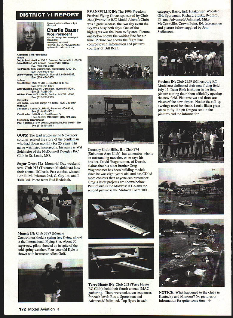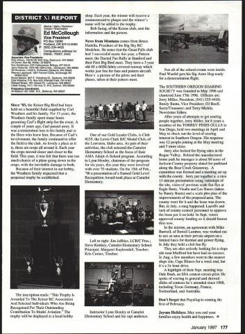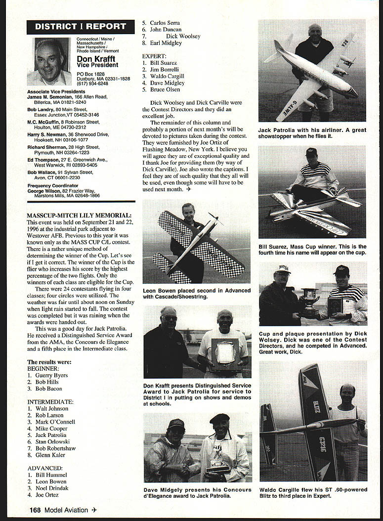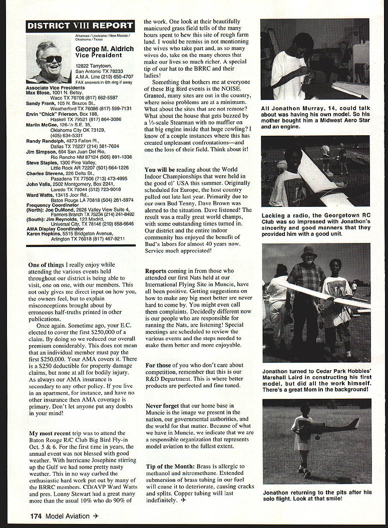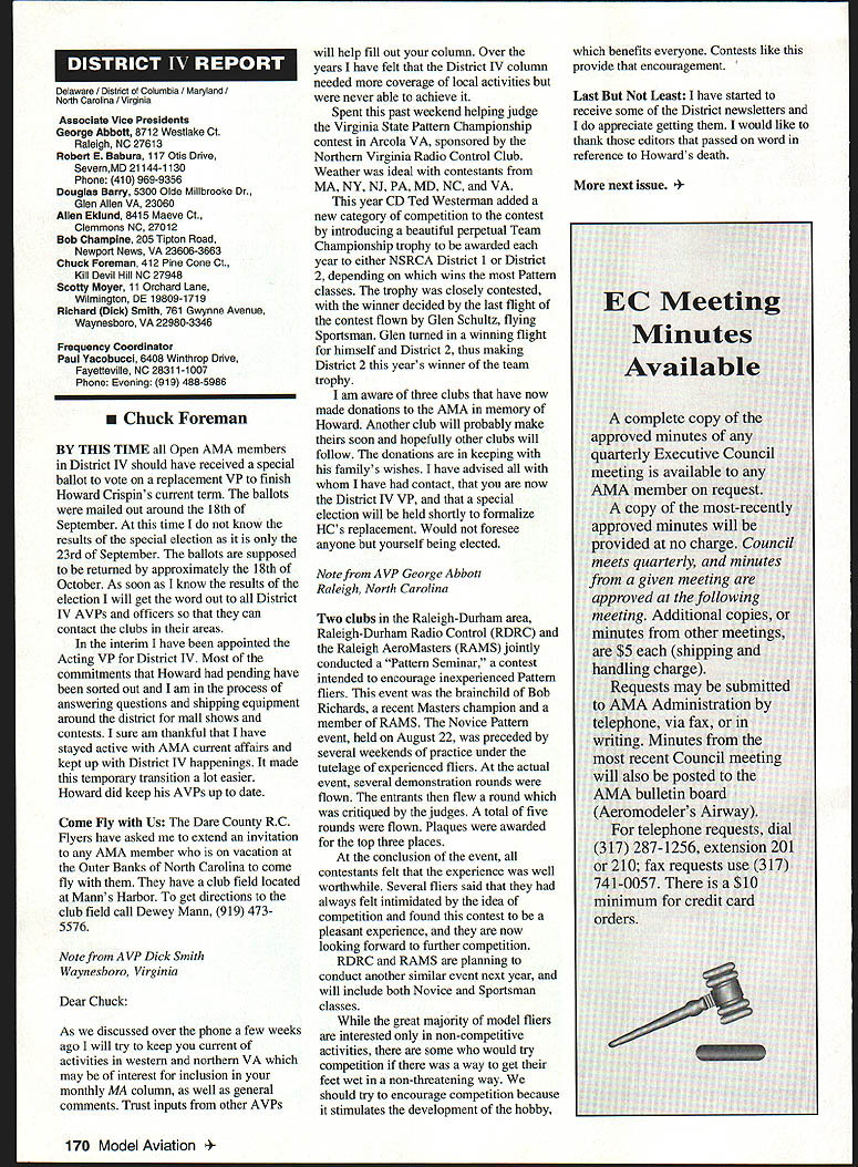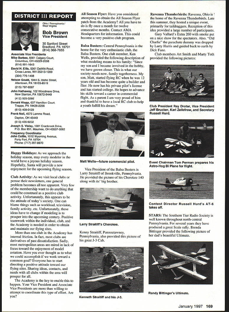 Anws U Academy Model Aeronautics 5151 East Memorial Drive Muncie IN 47302 @a4Qame @39nx/iwteej U Bob Undeiwood year Academy accepts nominations Hall Fame award honor bestowed upon individuals have contributed advancement association aeromodeling general over significant period time candidates qualifications reviewed voted upon panel consisting past presidents Academy 1996 five individuals granted Hall Fame award following biographical sketches provide information attesting contributions aeromodeling made recipients Joseph Bridi Joseph Bridi sought bring managed bring Kaos modeling world very successful series Radio Control Pattern aircraft containing name Kaos design scores models ranging trainers variety highly successful Joseph Bridicompetition types models included Pattern Pylon Soaring Scale well general sport flying types aircraft marketed Bridi Hobby Enterprises beginning 1970 present company Bridi Aircraft began 1989 addition articles plans Bridis pen appeared Radio Control Modeler Model Airplane News 1960s 1970s Finding competition scene important part life Bridi has competed variety venues addition Scale early 1960 could find him competition wars Pylon Pattern well fifth international Scale competition Bremen Germany 1969 ten years Bridi could found among top ten United States Pattern competition community competed four times Tournament Champions has also judged several occasions organizational standpoint Bridi served AMA Vice President District X keeping competition bent also served president National Society Radio Control Aerobatics NSRCA two occasions founding father Unified Scale Pattern Judge Association USPJA As contest director Bridi served Birds Club years Additionally acted CD FAI Pattern team selections 1970s Bridis plans have published England Italy four occasions Mexican national Pattern champion also could found touring South Africa presenting flying demonstrations speaking clubs Academy pleased recognize Joseph Bridi Harbor City California member its Hall Fame William Bill Cannon Jr William Bill Cannon Jr has elected s Hall Fame producing big news making something smaller present company known Cannon RIC Systems founded C & S Electronics 1955 focused developing producing micro radio control systems refinement work area has enabled Cannon produce four-channel proportional Ultra-Micro radio control system total alrborne weight less two ounces Over years Cannons career has closely related career electrical engineer technical writer manufacturer formal education includes work University Houston Georgia Tech During World War II Cannon served electronics field service included working SBD dive bombers Long Beach B-24s Phoenix Arizona Other activities electronics field included radar flight testing finally overseas service supervising results District II District IV Special Election closed October 181996 District II RESULTS DELAYED An error ballot distribution District II has delayed election results see February 1997 Model Aviation details District IV Chuck Foreman Brad Booth Other 1099 706 6 results election tallied Ball State students verification tally done Tom Harris Associate Professor Management Sciences 164 Model Aviation de View Headquarters William Bill Cannen Jr 150 technical service personnel 1949 started own technical writing organization produced significant volume work until 1985 served president Los Angeles chapter National Technical Publications Society well director NTPS national board modeling career began 1930s flying Free Flight events has designs published Model Builder RIC Sportsman single-channel RC models Pinto Lil Pinto kitted Veco hand-launch model designed Cannon used modelers win contests No other company manufactures RC equipment such very small size enabling modelers use off-the-shelf products controlling indoor models stands alone field Academy welcomes Bill Cannon Hall Fame Art Laneau years Academy maintained important partnership United States Navy result liaison years Nats competitions held Navy bases utilizing Navy personnel During period cooperation team Paul Boyer representing Navy Art Laneau representing AMA kept activity alive Academy proud announce recognition Art Laneau member Hall Fame joins Boyer inducted few years ago Known Mr Ambroid since spokesman company produced line glues kits became involved AMA 1950s As Ambroids representative Hobby Industry Association America HIAA became generous donator Ambroid products Nats other AMA contests Importantly convinced other manufacturers support Nats other AMA events sponsors 1962 serving HIAAs secretary Model Aeronautics Division became model industry liaison among HIAA AMA Navy occurred evercritical period since declining Junior participation made continually difficult Navy justify continuance Nats participation Laneaus role liaison continued ten years 1965 Laneau chosen chairman Model Aeronautics Division HIAA recognized effective role leading industry support AMA programs being presented AMA Fellowship 1966 Much work unsung became friend key Navy officers Nats support program resulting continuation program after government budgetary problems made difficult justify great personal achievement have Neil Armstrong famous X- 15 flights serve Honorary Contest Director 1965 Nats Academy welcomes Art Laneau Hall Fame Dave Plait Although Dave Platt widely know internationally outstanding efforts Scale truly represents complete modeler Designing competing venues aeromodeling important feature participation broad range related activities includes noteworthy accomplishments design manufacturing experimentation competition leadership organization contest directing currently operates manufacturing operation Florida Growing up England Platt left school age 15 work printers ________________________ apprentice Through own initiative embarked program self-study provided him knowledge areas chemistry mathematics aerodynamics Dave Plattand mechanical engineering skills applied true love model aviation 