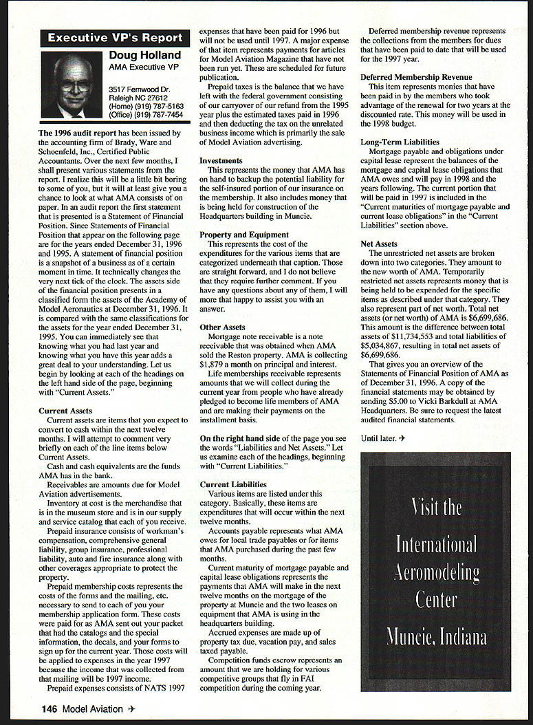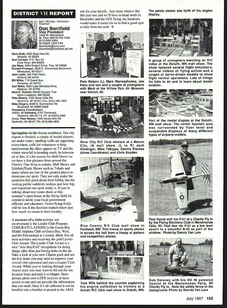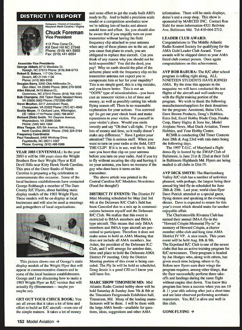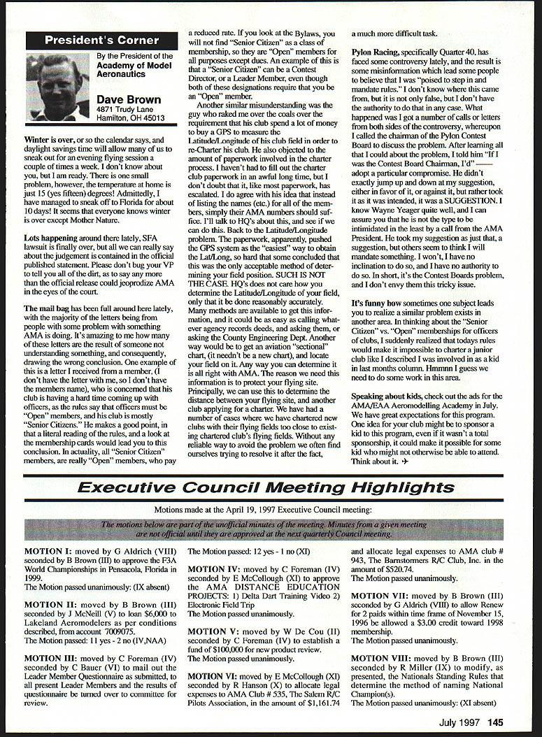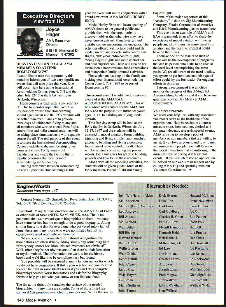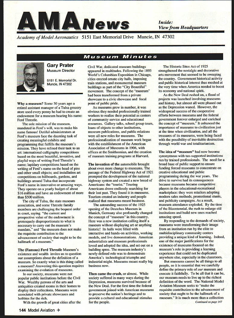 Inside View Headquarters Academy Model Aeronautics 5151 East Memorial Drive Muncie IN 47302 Gary Prater Museum Director 5151 E Memoijal Dr Muncie IN 47302 museum Some 50 years ago retired assistant manager Tulsa grocery store used penny create endowment museum bearing name Ferd Threstle sole mission museum mandated Ferds will make name famous Dutiful administrators Ferds museum face daunting task creating meaningful exhibits programming fulfills museums mission have refined task art international calligraphy competitions based beautiful inventive playful ways writing Ferd Threstles name lapidary competitions based writing Ferds name head pins other small objects installation art competitions billboards gardens buildings around Tulsa incorporate Ferds name innovative amusing ways operate yearly budget about $16 million have endowment $500 million city Tulsa state museum association some Threstle family members challenging bequest order court saying current prospective value endowment grotesquely disproportionate what necessary carry out museums mandate museum docs make requisite contribution advancement society ought hallmark museum Famous Ferd Threstle Museums existence wealth invites us question assumptions about definition museum So exactly what thing called museum Answering question requires examining evolution museums society museums popular public institutions before Civil War Wealthy patrons arts antiquities created rooms homes display collections Museums associated private showcases hobbies rich growth great cities after Civil War dedicated museum buildings appeared multitudes Following 1893 Worlds Columbian Exposition Chicago cities erected ornate city halls imposing train stations monumental museum buildings part City Beautiful movement concept museum transformed private showcase civic showcase focal point public pride As museums grew number obvious needed professionally trained workers realize potential centers community service educational resources Gallery talks school group tours loans objects other institutions museum publications public relations new roles museums professionalization museum work began establishment American Association Museums 1906 offices Smithsonian creation museum training programs Harvard invention automobile brought about change museums passage Federal Highway Act 1921 prompted development national highway system created new breed Americans tourist Touring Americans drove endlessly searching lost past found museums Tourism created industry people realized museums meant business astounding success 1925 opening Deutches Museum Munich Germany also profoundly changed concept museum country new institution calling itself museum displaying art anything historic Its halls filled interactive hands-on activities working models live demonstrations American industrialists museum professionals loved adopted idea set out building spree museum industrys newly defined role demonstrate Americas technological triumphs industrial might Museums meant really big business now came crash almost society suffered ways during Depression museums survived because New Deal first time federal government joined American museums preserve nations heritage provide cultural educational stimulus people Historic Sites Act 1925 strengthened nostalgic decorative arts movement seemed sweeping country Government historical activity public historical interest thus meshed very time America needed boost its economy national spirit As New Deal rushed flood projects launched involving museums history almost phased out Depression waned However widespread success cooperative efforts between museums federal government forever ealarged enriched concept museum enhanced importance museums civilization just time civilization treasures its museums being faced possibility inevitable destruction through world war totalitarianism idea museum now become synonymous tax-supported institutions run trained professionals need broad base public support ensure funding forced museums concentrate creative educational public programming during war years drive survive its consequences because museums became competitive players educational-recreational marketplace retailers adopting modern sales methods promotional stunts publicity campaigns As result museum attendance exploded time Bicentennial rush enlarge old institutions build new ones reached amazing speed responding demands society museums transforming image institution run elite multidisciplinary community centers providing unique kind learning Indeed major justifications existence museums focused museums role providing leaming experience could duplicated anywhere else especially classroom museums cannot things people essential carefully define primary role museum execute faithfully can museum needs live up richest definition word National Model Aviation Museum seeks make requisite contribution advancement society ought hallmark museum much collection Conunued page 147 144 Model Aviation 4 Winter over calendar says daylight savings time will allow us sneak out evening flying session couple times week dont know about am ready small problem however temperature home just 15 yes fifteen degrees Admittedly have managed sneak off Florida about 10 days seems everyone knows winter over except Mother Nature Lots happening around lately SFA lawsuit finally over can really say about judgement contained official published statement Please dont bug VP tell dirt say official release could jeoprodize AMA eyes court mail bag has full around lately majority letters being people some problem something AMA doing Its amazing letters result someone understanding something consequently drawing wrong conclusion example letter received member dont have letter dont have members name concemed club having hard time coming up officers rules say officers must Open members club mostly Senior Citizens makes good point literal reading rules look membership cards would lead conclusion actuality