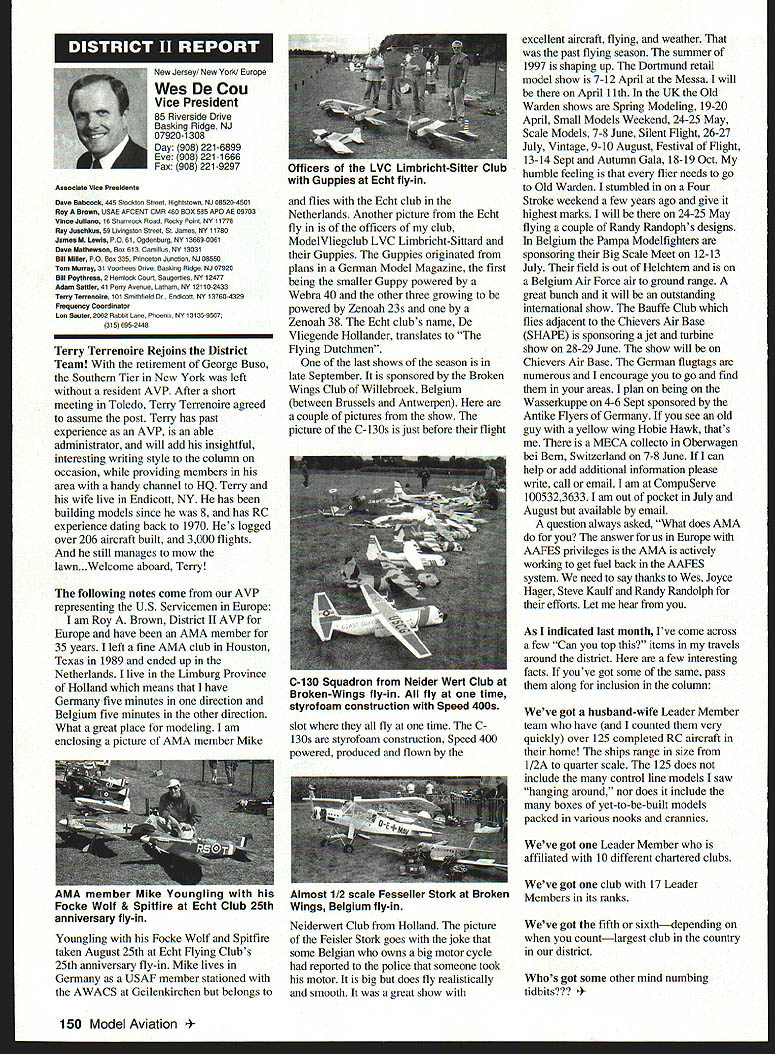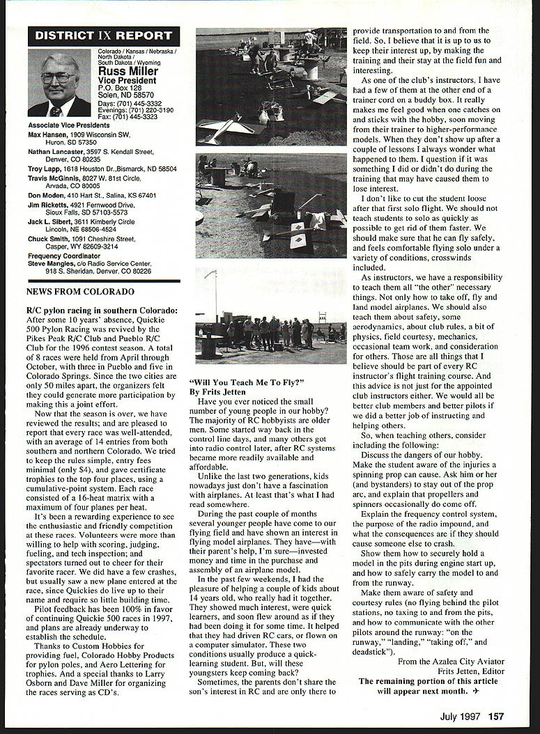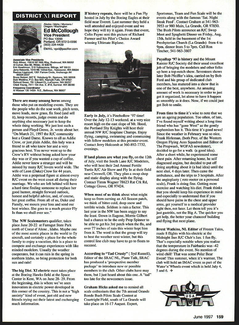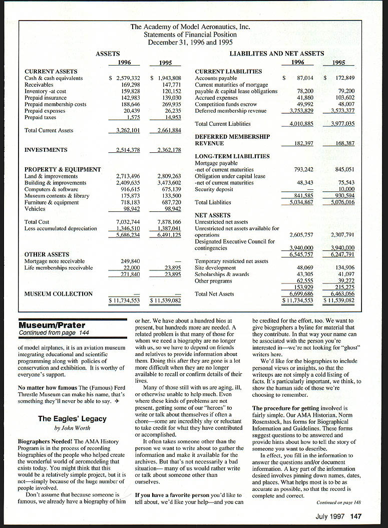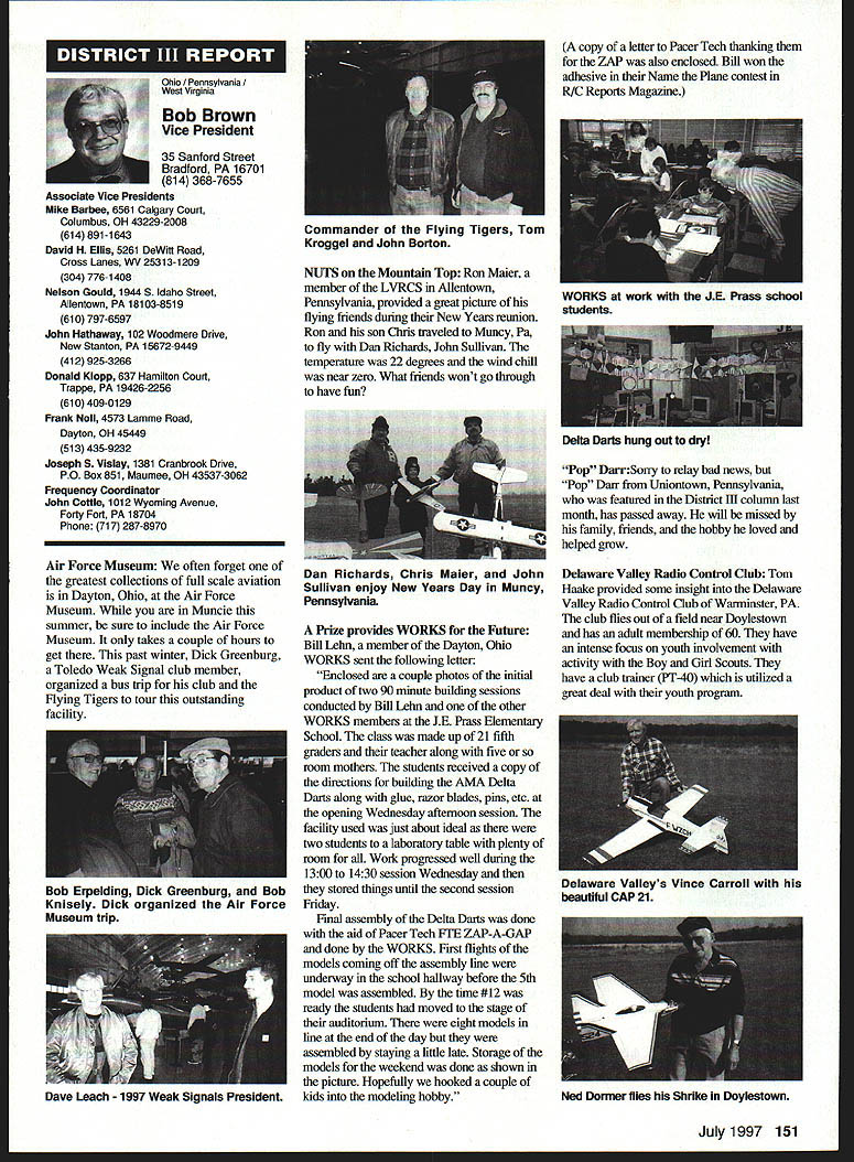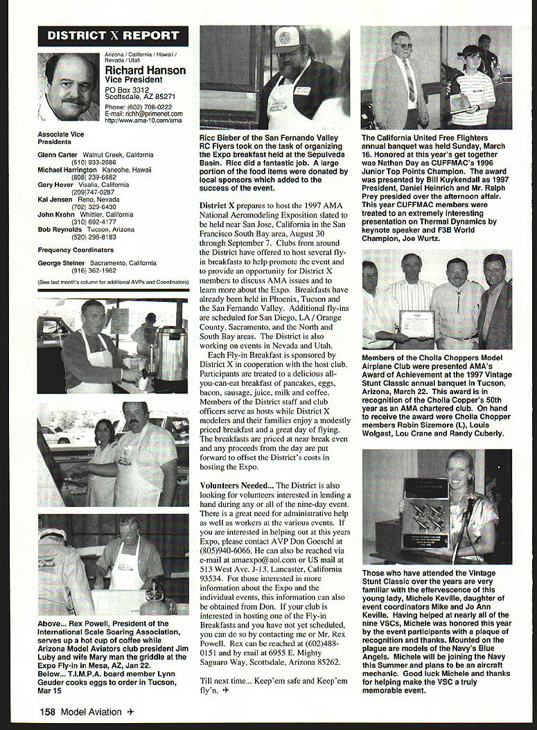 Inside View Headquarters Academy Model Aeronautics 5151 East Memorial Drive Muncie IN 47302 Gary Prater Museum Director 5151 E Memoijal Dr Muncie IN 47302 museum Some 50 years ago retired assistant manager Tulsa grocery store used penny create endowment museum bearing name Ferd Threstle sole mission museum mandated Ferds will make name famous Dutiful administrators Ferds museum face daunting task creating meaningful exhibits programming fulfills museums mission have refined task art international calligraphy competitions based beautiful inventive playful ways writing Ferd Threstles name lapidary competitions based writing Ferds name head pins other small objects installation art competitions billboards gardens buildings around Tulsa incorporate Ferds name innovative amusing ways operate yearly budget about $16 million have endowment $500 million city Tulsa state museum association some Threstle family members challenging bequest order court saying current prospective value endowment grotesquely disproportionate what necessary carry out museums mandate museum docs make requisite contribution advancement society ought hallmark museum Famous Ferd Threstle Museums existence wealth invites us question assumptions about definition museum So exactly what thing called museum Answering question requires examining evolution museums society museums popular public institutions before Civil War Wealthy patrons arts antiquities created rooms homes display collections Museums associated private showcases hobbies rich growth great cities after Civil War dedicated museum buildings appeared multitudes Following 1893 Worlds Columbian Exposition Chicago cities erected ornate city halls imposing train stations monumental museum buildings part City Beautiful movement concept museum transformed private showcase civic showcase focal point public pride As museums grew number obvious needed professionally trained workers realize potential centers community service educational resources Gallery talks school group tours loans objects other institutions museum publications public relations new roles museums professionalization museum work began establishment American Association Museums 1906 offices Smithsonian creation museum training programs Harvard invention automobile brought about change museums passage Federal Highway Act 1921 prompted development national highway system created new breed Americans tourist Touring Americans drove endlessly searching lost past found museums Tourism created industry people realized museums meant business astounding success 1925 opening Deutches Museum Munich Germany also profoundly changed concept museum country new institution calling itself museum displaying art anything historic Its halls filled interactive hands-on activities working models live demonstrations American industrialists museum professionals loved adopted idea set out building spree museum industrys newly defined role demonstrate Americas technological triumphs industrial might Museums meant really big business now came crash almost society suffered ways during Depression museums survived because New Deal first time federal government joined American museums preserve nations heritage provide cultural educational stimulus people Historic Sites Act 1925 strengthened nostalgic decorative arts movement seemed sweeping country Government historical activity public historical interest thus meshed very time America needed boost its economy national spirit As New Deal rushed flood projects launched involving museums history almost phased out Depression waned However widespread success cooperative efforts between museums federal government forever ealarged enriched concept museum enhanced importance museums civilization just time civilization treasures its museums being faced possibility inevitable destruction through world war totalitarianism idea museum now become synonymous tax-supported institutions run trained professionals need broad base public support ensure funding forced museums concentrate creative educational public programming during war years drive survive its consequences because museums became competitive players educational-recreational marketplace retailers adopting modern sales methods promotional stunts publicity campaigns As result museum attendance exploded time Bicentennial rush enlarge old institutions build new ones reached amazing speed responding demands society museums transforming image institution run elite multidisciplinary community centers providing unique kind learning Indeed major justifications existence museums focused museums role providing leaming experience could duplicated anywhere else especially classroom museums cannot things people essential carefully define primary role museum execute faithfully can museum needs live up richest definition word National Model Aviation Museum seeks make requisite contribution advancement society ought hallmark museum much collection Conunued page 147 144 Model Aviation 4 Winter over calendar says daylight savings time will allow us sneak out evening flying session couple times week dont know about am ready small problem however temperature home just 15 yes fifteen degrees Admittedly have managed sneak off Florida about 10 days seems everyone knows winter over except Mother Nature Lots happening around lately SFA lawsuit finally over can really say about judgement contained official published statement Please dont bug VP tell dirt say official release could jeoprodize AMA eyes court mail bag has full around lately majority letters being people some problem something AMA doing Its amazing letters result someone understanding something consequently drawing wrong conclusion example letter received member dont have letter dont have members name concemed club having hard time coming up officers rules say officers must Open members club mostly Senior Citizens makes good point literal reading rules look membership cards would lead conclusion actuality