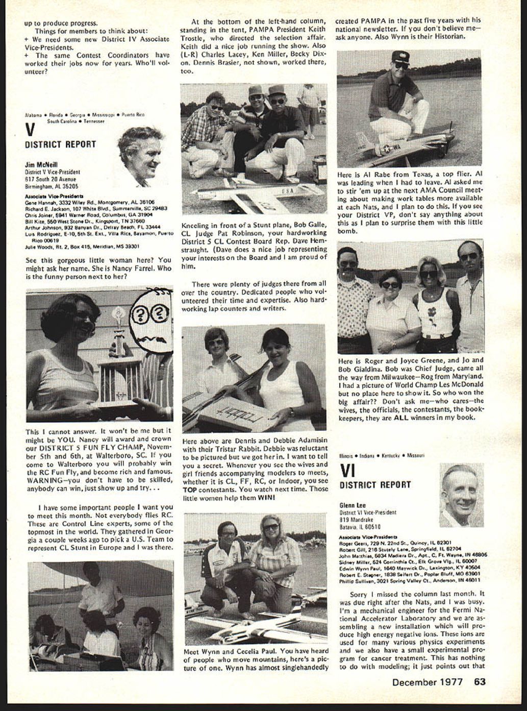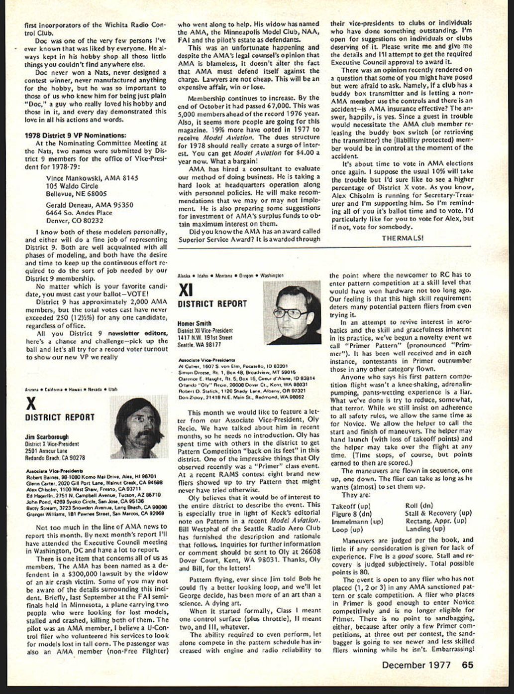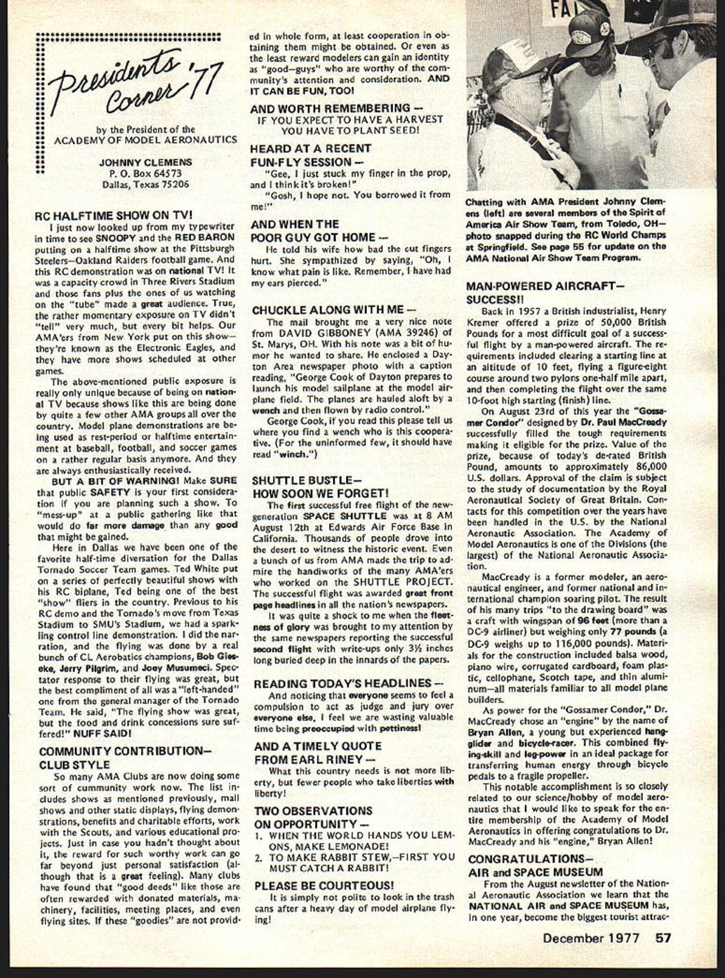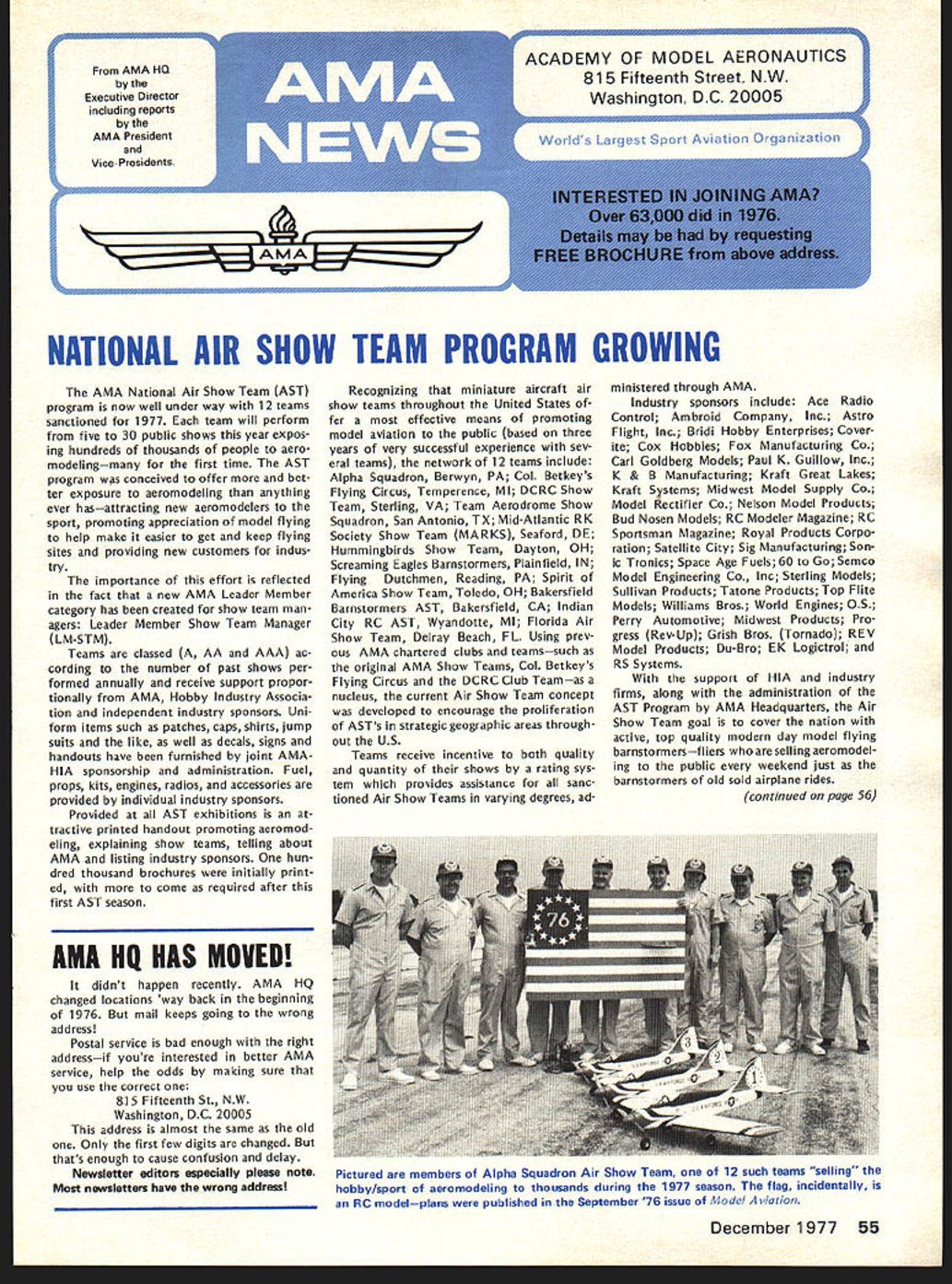The AMA National Air Show Team AST program now well under way 1 2 teams sanctioned 1977 team will perform five 30 public shows year expos ing hundreds thousands people aero modelingmany first time AST program conceived offer bet ter exposure aeromodeling anything ever hasattracting new aeromodelers sport promoting appreciation model flying help make easier get keep flying sites providing new customers indus try importance effort reflected fact new AMA Leader Member category has created show team man agers Leader Member Show Team Manager LM-sTM Teams classed AA AAA ac cording number past shows per formed annually receive support propor tionally AMA Hobby Industry Associa tion independent industry sponsors Uni form items such patches caps shirts jump suits like well decals signs handouts have furnished joint AMA HIA sponsorship administration Fuel props kits engines radios accessories provided individual industry sponsors Provided AST exhibitions tractive printed handout promoting aeromod eling explaining show teams telling about AMA listing industry sponsors hun dred thousand brochures initially print ed come required after first AST season AMA HQ RAS MOVED didnt happen recently AMA HQ changed locations way back beginning 1976 mail keeps going wrong address Postal service bad enough right addressif youre interested better AMA service help odds making sure use correct 815 Fifteenth Sr NW Washington DC 20005 address almost same old Only first few digits changed thats enough cause confusion delay Newsletter editors especially please note Most newsletters have wrong addressl Recognizing miniature aircraft air show teams throughout United States fer effective means promoting model aviation public based three years very successful experience sev eral teams network 12 teams include Alpha Squadron Berwyn PA Col Betkeys Flying Circus Temperence MI DCRC Show Team Sterling VA Team Aerodrome Show Squadron San Antonio TX Mid-Atlantic RK Society Show Team MARKS Seaford DE Hummingbirds Show Team Dayton OH Screaming Eagles Barnstormers Plainfield IN Flying Dutchmen Reading PA Spirit America Show Team Toledo OH Bakersfield Barnstormers AST Bakersfield CA Indian City RC AST Wyandotte MI Florida Air Show Team Deiray Beach FL Using prey ous AMA chartered clubs teamssuch original AMA Show Teams Col Betkeys Flying Circus DCRC Club Teamas nucleus current Air Show Team concept developed encourage proliferation ASTs strategic geographic areas through out US Teams receive incentive both quality quantity shows rating sys tem provides assistance sanc tioned Air Show Teams varying degrees administered through AMA Industry sponsors include Ace Radio Control Ambroid Company Inc Astro Flight Inc Bridi Hobby Enterprises Cover ite Cox Hobbies Fox Manufacturing Co Carl Goldberg Models Paul K Guillow Inc K & B Manufacturing Kraft Great Lakes Kraft Systems Midwest Model Supply Co Model Rectifier Co Nelson Model Products Bud Nosen Models RC Modeler Magazine RC Sportsman Magazine Royal Products Corpo ration Satellite City Sig Manufacturing Son ic Tronics Space Age Fuels 60 Go Semco Model Engineering Co lnc Sterling Models Sullivan Products Tatone Products Top Flite Models Williams Bros World Engines 05 Perry Automotive Midwest Products Pro gress Rev-Up Grish Bros Tornado REV Model Products Du-Bro EK Logictrol RS Systems support HIA industry firms along administration AST Program AMA Headquarters Air Show Team goal cover nation active top quality modern day model flying barnstormersfliers selling aeromodel ing public weekend just barnstormers old sold airplane rides continued page 56 December 1977 55 AMA HQ Executive Director including reports AMA President Vice-Presidents ACADEMY OF MODEL AERONAUTICS 815 Fifteenth Street NW Washington DC 20005 q t NATIONAL AIR SHOW TEAM PROGRAM GROWING Pictured members Alpha Squadron Air Show Team 12 such teams selling hobby/sport aeromodeling thousands during 1977 season flag incidentally RC modelplans published September 76 issue Model Atiation AMA Air Show Teams Cont CANDIDATES FOR 1918-19 SEC-TREAS STILL ROOM FOR MORE TEAMS Teams still needed areas copy AMA booklet forming local ASTs available request HQ have booklet still waiting get team off ground following may offer some help AST booklet explains team ratings offers suggestions organization along some acts have successful existing teams statewide association AMA chartered clubs considered team made up local stars throughout large state discouraged since un dertaking must crawl before can walk suggest basic show put gether using AST booklet guidelines Start some smaller performances soon possible No amount prior planning practiceas important arecan take place baptism actual show engines never failed start wont glider banner tow al ways worked gets fouled up Learn mistakes small shows em barrassing enough rather before governor commander Atlantic Pacific Fleet 50000 spectators first taste aeromodeling should see ing teams star pilot fly public address amplifier logistics statewide team could real problem fliers end state getting show other sidees pecially two three weekends row regional statewide organization may workable sharing ideas person nel regional groups able function team small shows Since industry support team based both quality quantity shows top quality performances AST can give higher teams rating sup port large club has its team broken down two three squads because called perform almost Saturday Sunday during summer months squad team members other squads can fill show case ill ness member being out-of-town performance scheduled Begin acts suggested AST booklet use collective imaginations skills different elaborate routines such flying lawnmowers blow ing up outhouse flight through flaming rings like AMA-HIA AST program can offer realistic means introducing hundreds thousands people sport aeromo deling bringing new members making easier get keep flying sitesand its fun AIR SHOW TEAM IN THE CONGRESSIONAL RECORD Congressional 