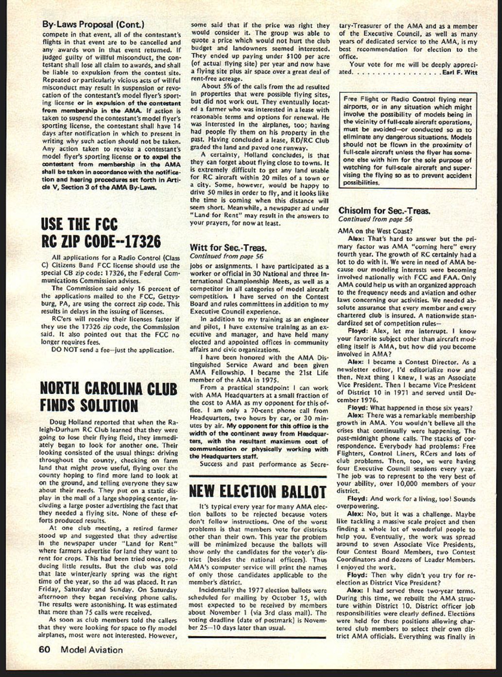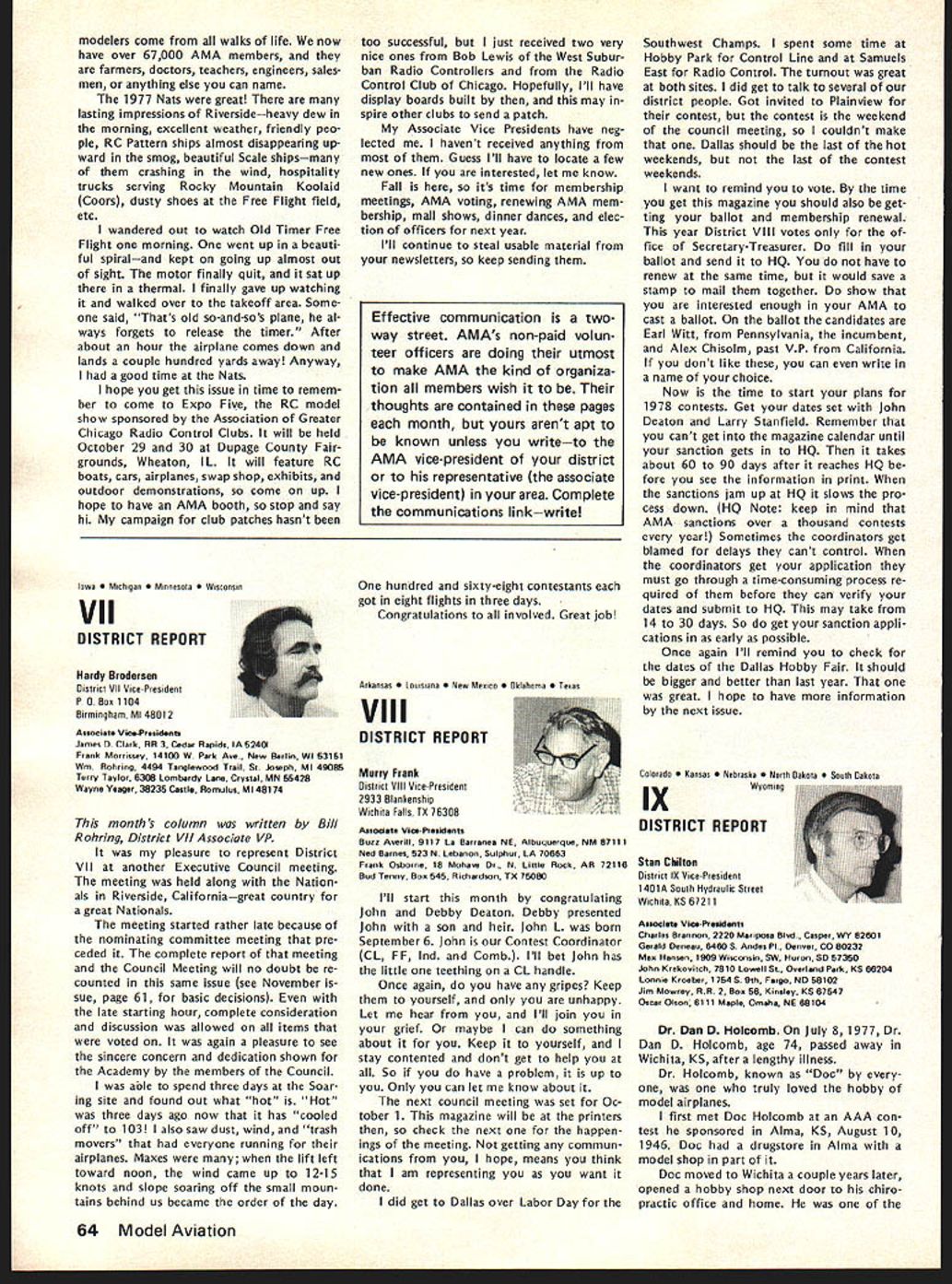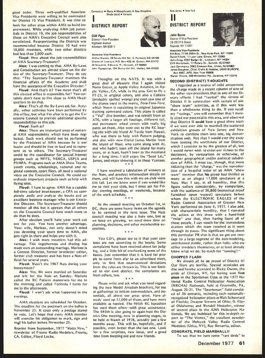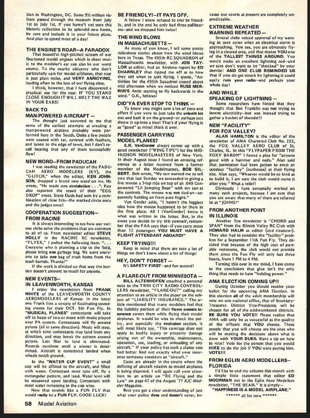 The AMA National Air Show Team AST program now well under way 1 2 teams sanctioned 1977 team will perform five 30 public shows year expos ing hundreds thousands people aero modelingmany first time AST program conceived offer bet ter exposure aeromodeling anything ever hasattracting new aeromodelers sport promoting appreciation model flying help make easier get keep flying sites providing new customers indus try importance effort reflected fact new AMA Leader Member category has created show team man agers Leader Member Show Team Manager LM-sTM Teams classed AA AAA ac cording number past shows per formed annually receive support propor tionally AMA Hobby Industry Associa tion independent industry sponsors Uni form items such patches caps shirts jump suits like well decals signs handouts have furnished joint AMA HIA sponsorship administration Fuel props kits engines radios accessories provided individual industry sponsors Provided AST exhibitions tractive printed handout promoting aeromod eling explaining show teams telling about AMA listing industry sponsors hun dred thousand brochures initially print ed come required after first AST season AMA HQ RAS MOVED didnt happen recently AMA HQ changed locations way back beginning 1976 mail keeps going wrong address Postal service bad enough right addressif youre interested better AMA service help odds making sure use correct 815 Fifteenth Sr NW Washington DC 20005 address almost same old Only first few digits changed thats enough cause confusion delay Newsletter editors especially please note Most newsletters have wrong addressl Recognizing miniature aircraft air show teams throughout United States fer effective means promoting model aviation public based three years very successful experience sev eral teams network 12 teams include Alpha Squadron Berwyn PA Col Betkeys Flying Circus Temperence MI DCRC Show Team Sterling VA Team Aerodrome Show Squadron San Antonio TX Mid-Atlantic RK Society Show Team MARKS Seaford DE Hummingbirds Show Team Dayton OH Screaming Eagles Barnstormers Plainfield IN Flying Dutchmen Reading PA Spirit America Show Team Toledo OH Bakersfield Barnstormers AST Bakersfield CA Indian City RC AST Wyandotte MI Florida Air Show Team Deiray Beach FL Using prey ous AMA chartered clubs teamssuch original AMA Show Teams Col Betkeys Flying Circus DCRC Club Teamas nucleus current Air Show Team concept developed encourage proliferation ASTs strategic geographic areas through out US Teams receive incentive both quality quantity shows rating sys tem provides assistance sanc tioned Air Show Teams varying degrees administered through AMA Industry sponsors include Ace Radio Control Ambroid Company Inc Astro Flight Inc Bridi Hobby Enterprises Cover ite Cox Hobbies Fox Manufacturing Co Carl Goldberg Models Paul K Guillow Inc K & B Manufacturing Kraft Great Lakes Kraft Systems Midwest Model Supply Co Model Rectifier Co Nelson Model Products Bud Nosen Models RC Modeler Magazine RC Sportsman Magazine Royal Products Corpo ration Satellite City Sig Manufacturing Son ic Tronics Space Age Fuels 60 Go Semco Model Engineering Co lnc Sterling Models Sullivan Products Tatone Products Top Flite Models Williams Bros World Engines 05 Perry Automotive Midwest Products Pro gress Rev-Up Grish Bros Tornado REV Model Products Du-Bro EK Logictrol RS Systems support HIA industry firms along administration AST Program AMA Headquarters Air Show Team goal cover nation active top quality modern day model flying barnstormersfliers selling aeromodel ing public weekend just barnstormers old sold airplane rides continued page 56 December 1977 55 AMA HQ Executive Director including reports AMA President Vice-Presidents ACADEMY OF MODEL AERONAUTICS 815 Fifteenth Street NW Washington DC 20005 q t NATIONAL AIR SHOW TEAM PROGRAM GROWING Pictured members Alpha Squadron Air Show Team 12 such teams selling hobby/sport aeromodeling thousands during 1977 season flag incidentally RC modelplans published September 76 issue Model Atiation AMA Air Show Teams Cont CANDIDATES FOR 1918-19 SEC-TREAS STILL ROOM FOR MORE TEAMS Teams still needed areas copy AMA booklet forming local ASTs available request HQ have booklet still waiting get team off ground following may offer some help AST booklet explains team ratings offers suggestions organization along some acts have successful existing teams statewide association AMA chartered clubs considered team made up local stars throughout large state discouraged since un dertaking must crawl before can walk suggest basic show put gether using AST booklet guidelines Start some smaller performances soon possible No amount prior planning practiceas important arecan take place baptism actual show engines never failed start wont glider banner tow al ways worked gets fouled up Learn mistakes small shows em barrassing enough rather before governor commander Atlantic Pacific Fleet 50000 spectators first taste aeromodeling should see ing teams star pilot fly public address amplifier logistics statewide team could real problem fliers end state getting show other sidees pecially two three weekends row regional statewide organization may workable sharing ideas person nel regional groups able function team small shows Since industry support team based both quality quantity shows top quality performances AST can give higher teams rating sup port large club has its team broken down two three squads because called perform almost Saturday Sunday during summer months squad team members other squads can fill show case ill ness member being out-of-town performance scheduled Begin acts suggested AST booklet use collective imaginations skills different elaborate routines such flying lawnmowers blow ing up outhouse flight through flaming rings like AMA-HIA AST program can offer realistic means introducing hundreds thousands people sport aeromo deling bringing new members making easier get keep flying sitesand its fun AIR SHOW TEAM IN THE CONGRESSIONAL RECORD Congressional 