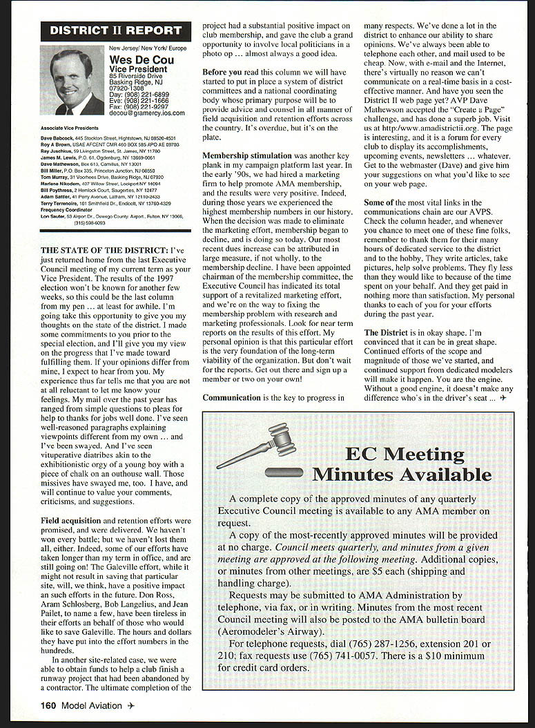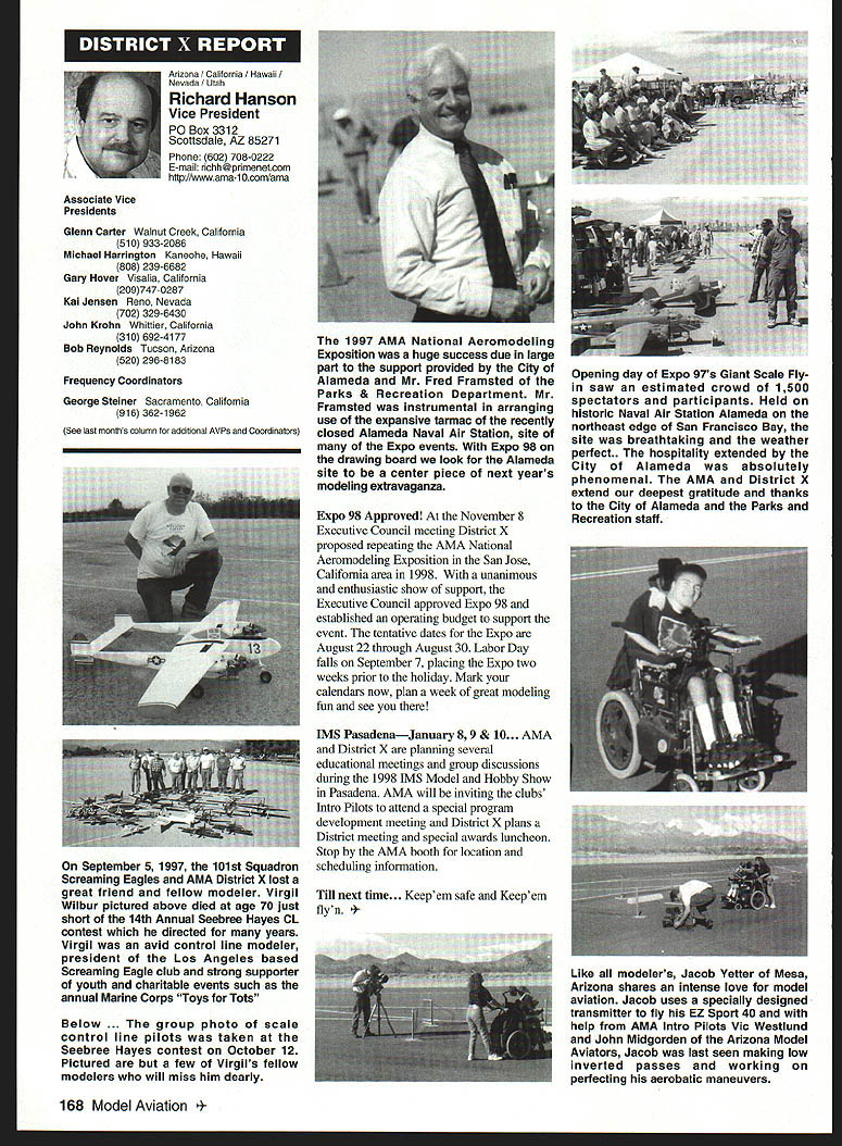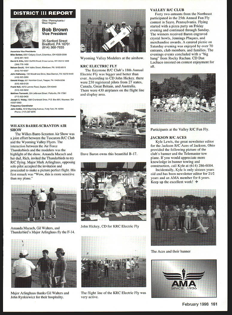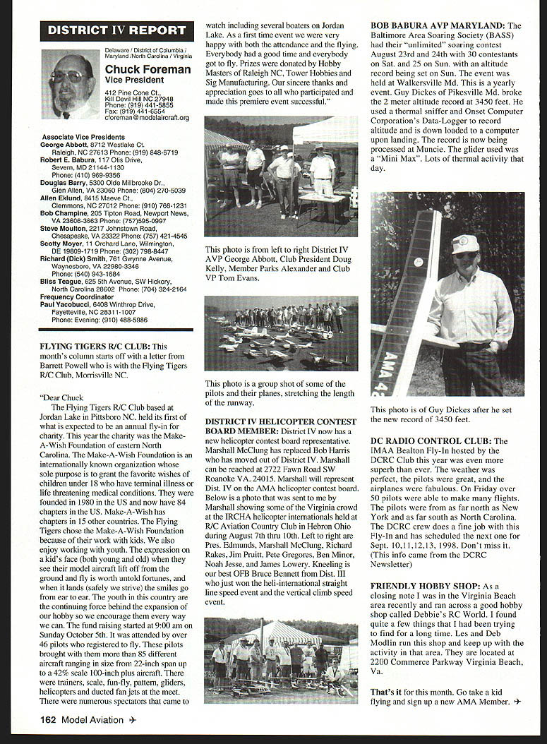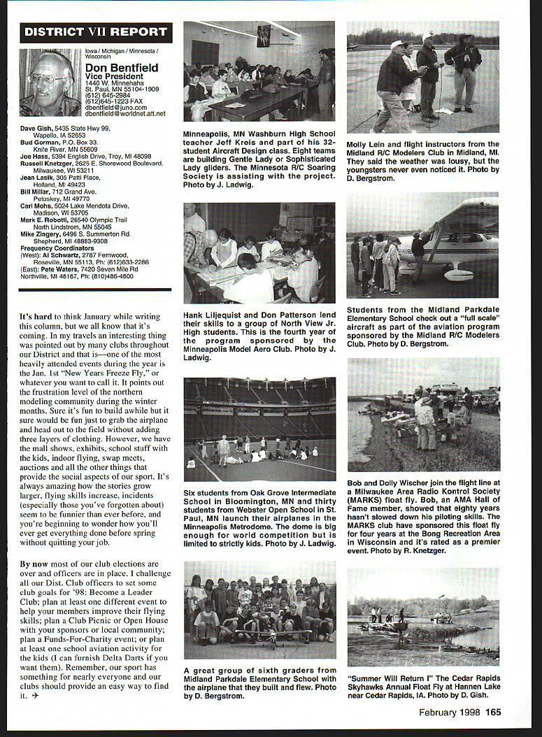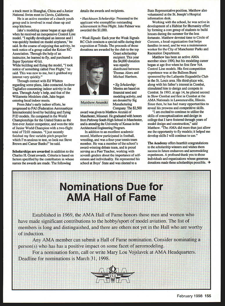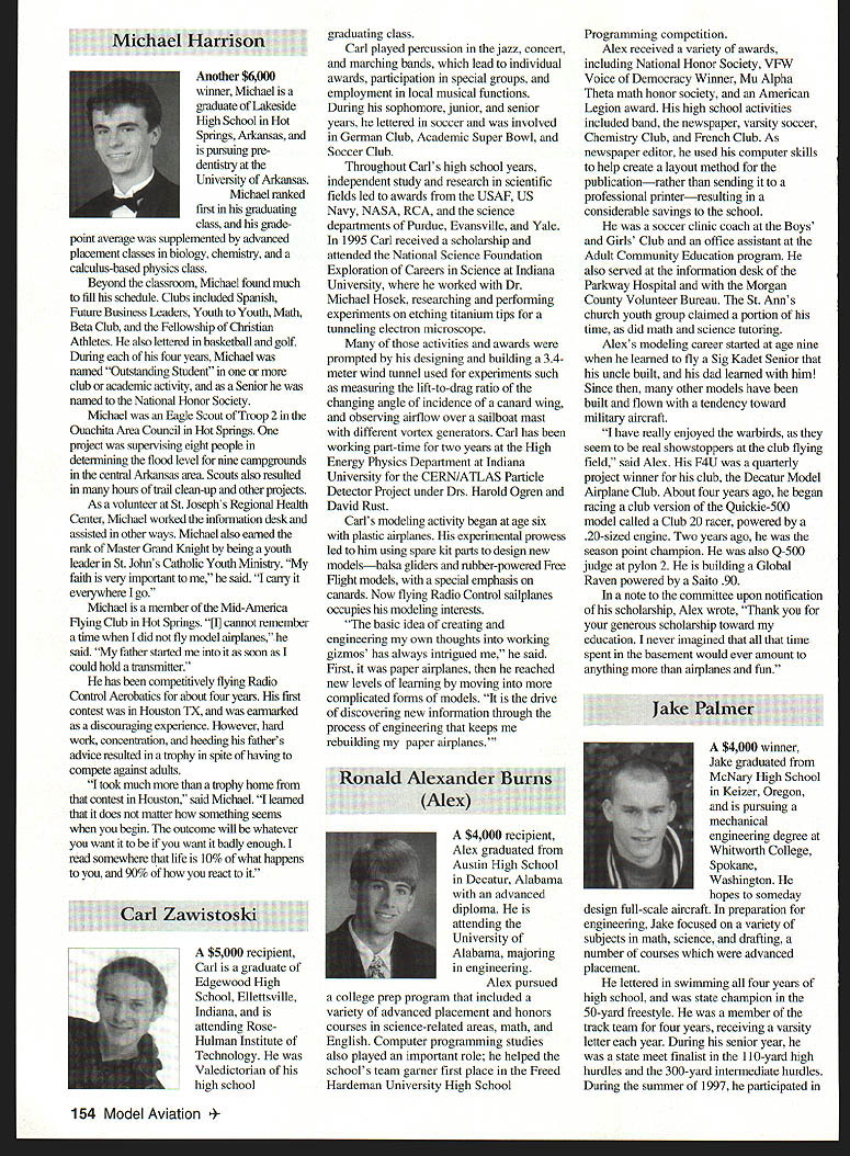 A Academy Model Aeronautics Auo 5151 East Memorial Drive Muncie IN 47302 year Academy awards scholarships deserving high school seniors intend pursue higher education local state colleges universities awards provided budgeted amount general funds monies individual organization donations Basic awards Charles H Grant Scholarships Applicants screened ranked national test scores class ranking school community activities modeling activities other criteria Recipients must AMA members minimum three years prior applying enrolled accredited institution following school year Screening final selections committee Betty Stream Cliff Telford Ed McCollough Russ Miller Charlie Bauer Bob Underwood its recommendations presented AMA Executive Council approval Out 35 applicants five Charles H Grant scholarships totaling $25000 awarded Following brief biographical sketches winner Thomas Akers $6000 winner Thomas graduated Thousand Oaks High School Thousand Oaks California attending Cal Poly State University San Luis Obispo _____planning major aeronautical engineering high school studies included advance placement courses such areas physics economicslAmerican political systems English calculus schedule included program manufacturing technologies Thomas president Science Club Construction Club member International Club Academic Decathlon Team principal first chair French Horn player Conejo Youth Symphony addition high school band played alto sax Jazz Band also sang church choir active member local Boy Scout Explorer Post Thomas got apprenticeship through AMA club member lead opportunity specialize composite structure fabrication full-scale aircraft As result Thomas employed local design fabrication shop tasks included building display models flying prototypes new military commercial aircraft Thomass modeling began age 11 parents bought him Gentle Lady Sailplane taught fly joined Thousand Oaks Soaring Society TOSS constructing model club members used models instruct him flying Gentle Lady completed Thomas began entering local club contests won national local soaring awards ensuing years Recent modeling activities have led him design scratch-built sailplanes including creating molds fuselage cutting foam core wings Thomas said people Southern California find skills level feel comfortable having him build repair airplanes high point 1997 modeling experience accompanying United States F3B team Ankara Turkey serve two ground crew members World Championships Thomas said challenge modeling has helped him allowing relate physics mumbo jumbo real life applications could over again thing would change modeling career would start sooner Tabulated Certified Public Accounting firm Brady Ware Schoenfeld Inc results announced Wednesday November 26 1997 Copies complete tabulation can obtained contacting Mary Lou Vojslavek AMA Headquarters District II Vice President *WesDeCou1517 Joe Beshar875 Ray Juschkus361 Others69 District IV Vice President * Chuck Foreman751 Others12 District VI Vice President * Charlie Bauer1867 Jim Sears1400 Others77 District VIII Vice President Sandy Frank1305 Others85 District X Vice President * Rich Hanson1891 Others122 * incumbent February 1998 153 View HQ See Page 184 Michael Harrison Another $6000 winner Michael graduate Lakeside High School Hot Springs Arkansas pursuing pre dentistiy University Arkansas Michael ranked first graduating class gradepoint average supplemented advanced placement classes biology chemistry calculus-based physics class Beyond classroom Michael found much fill schedule Clubs included Spanish Future Business Leaders Youth Youth Math Beta Club Fellowship Christian Athletes also lettered basketball golf During four years Michael named Outstanding Student club academic activity Senior named National Honor Society Michael Eagle Scout Troop 2 Ounchita Area Council Hot Springs project supervising eight people determining flood level nine campgrounds central Arkansas area Scouts also resulted hours trail clean-up other projects As volunteer St Josephs Regional Health Center Michael worked infonnation desk assisted other ways Michael also earned rank Master Grand Knight being youth leader St Johns Catholic Youth Ministry faith very important said cany everywhere go Michael member Mid-America Hying Club Hot Springs ifi cannot remember time did fly model airplanes sald father started soon could hold transmitter has competitively flying Radio Control Aerobatics about four years first contest Houston TX earmarked discouraging experience However hard work concentration heeding fathers advice resulted trophy spite having compete against adults took much tmphy home contest Houston said Michael leamed does matter something seems begin outcome will whatever want want badly enough read somewhere life 10% what happens 90% react Zawistoski $5000 recipient Carl graduate Edgewood High School Ellettsville Indiana attending Rose Hulman Institute Technology Valedictorian high school graduating class Carl played percussion jazz concert marching bands lead individual awards participation special groups employment local musical functions During sophomore junior senior years lettered soccer involved German Club Academic Super Bowl Soccer Club Throughout Carls high school years independent study research scientific fields led awards USAF US Navy NASA RCA science departments Purdue Evansville Yale 1995 Carl received scholarship attended National Science Foundation Exploration Careers Science Indiana University worked Dr Michael Hosek researching performing experiments etching titanium tips tunneling electron microscope activities awards prompted designing building 34meter wind tunnel used experiments such measuring lift-to-drag ratio changing angle incidence canard wing observing airflow over sailboat mast different vortex generators Carl has working part-time two years High Energy Physics Department Indiana University CERN/ATLAS Particle Detector Project under Drs Harold Ogren David Rust Carls modeling 