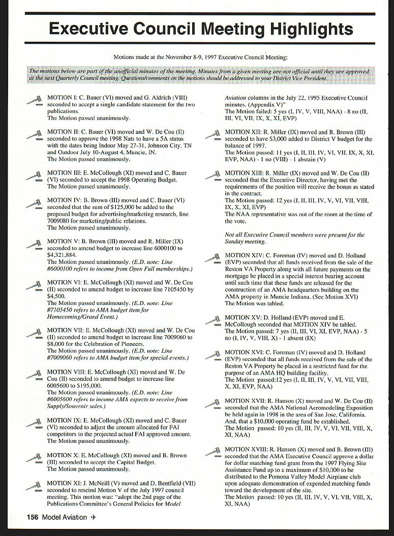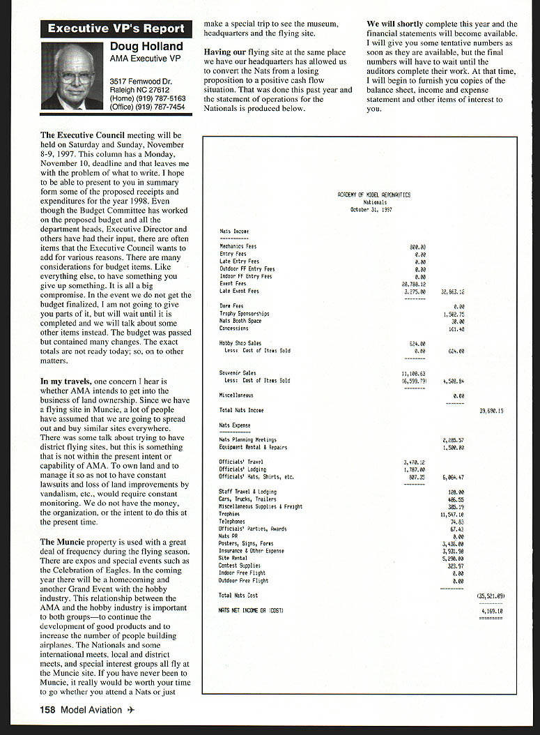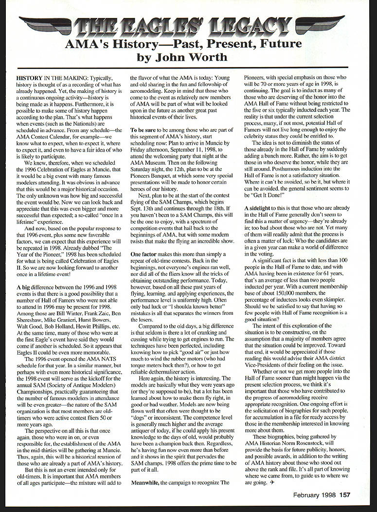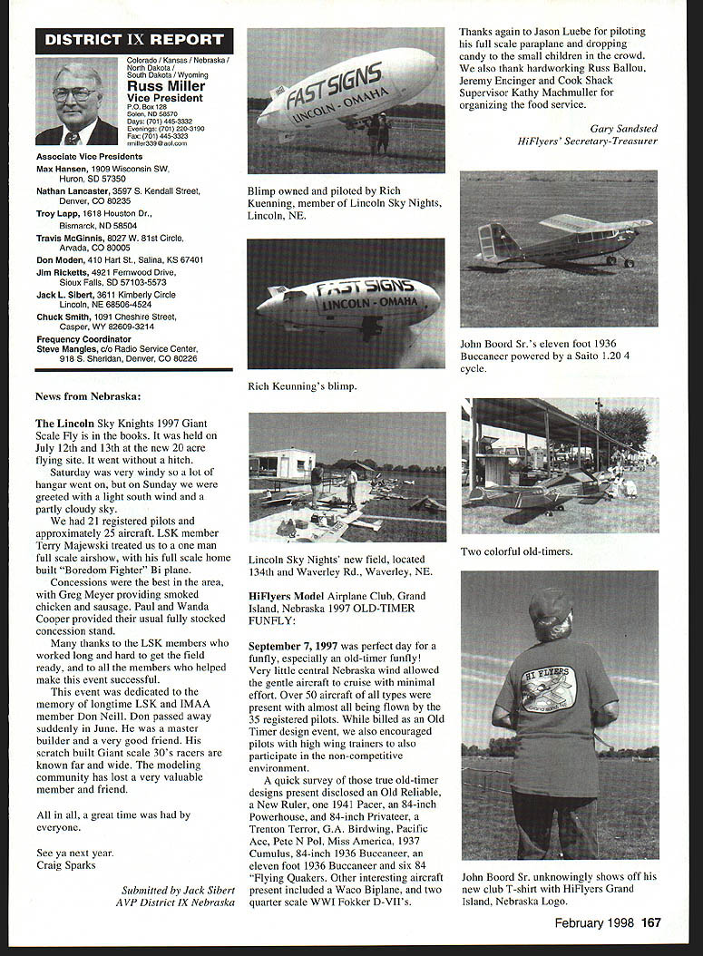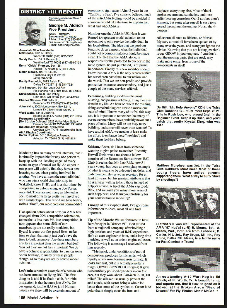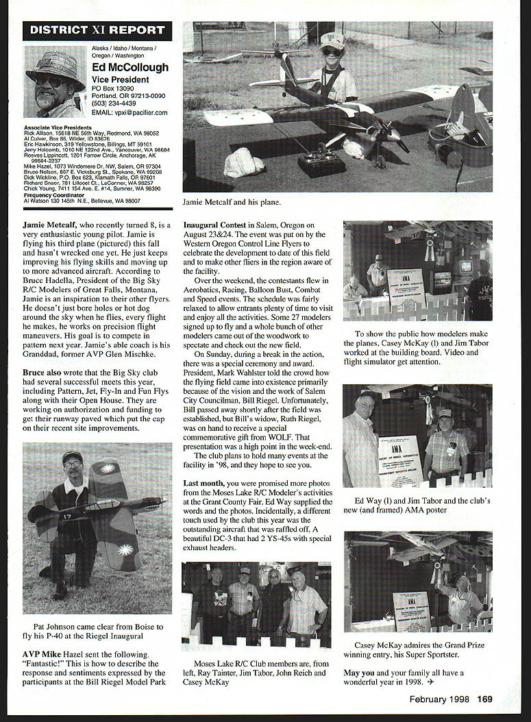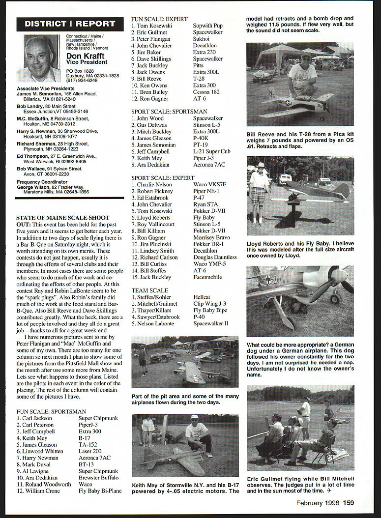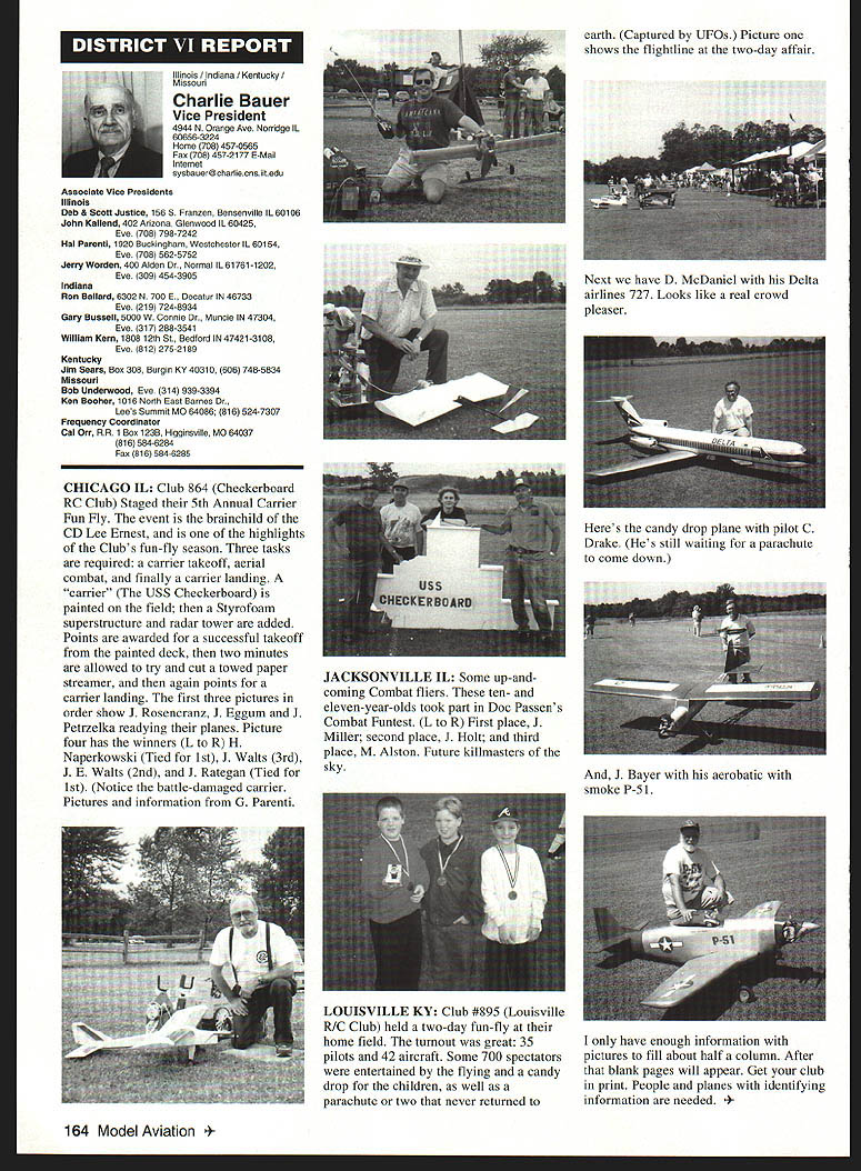 A Academy Model Aeronautics Auo 5151 East Memorial Drive Muncie IN 47302 year Academy awards scholarships deserving high school seniors intend pursue higher education local state colleges universities awards provided budgeted amount general funds monies individual organization donations Basic awards Charles H Grant Scholarships Applicants screened ranked national test scores class ranking school community activities modeling activities other criteria Recipients must AMA members minimum three years prior applying enrolled accredited institution following school year Screening final selections committee Betty Stream Cliff Telford Ed McCollough Russ Miller Charlie Bauer Bob Underwood its recommendations presented AMA Executive Council approval Out 35 applicants five Charles H Grant scholarships totaling $25000 awarded Following brief biographical sketches winner Thomas Akers $6000 winner Thomas graduated Thousand Oaks High School Thousand Oaks California attending Cal Poly State University San Luis Obispo _____planning major aeronautical engineering high school studies included advance placement courses such areas physics economicslAmerican political systems English calculus schedule included program manufacturing technologies Thomas president Science Club Construction Club member International Club Academic Decathlon Team principal first chair French Horn player Conejo Youth Symphony addition high school band played alto sax Jazz Band also sang church choir active member local Boy Scout Explorer Post Thomas got apprenticeship through AMA club member lead opportunity specialize composite structure fabrication full-scale aircraft As result Thomas employed local design fabrication shop tasks included building display models flying prototypes new military commercial aircraft Thomass modeling began age 11 parents bought him Gentle Lady Sailplane taught fly joined Thousand Oaks Soaring Society TOSS constructing model club members used models instruct him flying Gentle Lady completed Thomas began entering local club contests won national local soaring awards ensuing years Recent modeling activities have led him design scratch-built sailplanes including creating molds fuselage cutting foam core wings Thomas said people Southern California find skills level feel comfortable having him build repair airplanes high point 1997 modeling experience accompanying United States F3B team Ankara Turkey serve two ground crew members World Championships Thomas said challenge modeling has helped him allowing relate physics mumbo jumbo real life applications could over again thing would change modeling career would start sooner Tabulated Certified Public Accounting firm Brady Ware Schoenfeld Inc results announced Wednesday November 26 1997 Copies complete tabulation can obtained contacting Mary Lou Vojslavek AMA Headquarters District II Vice President *WesDeCou1517 Joe Beshar875 Ray Juschkus361 Others69 District IV Vice President * Chuck Foreman751 Others12 District VI Vice President * Charlie Bauer1867 Jim Sears1400 Others77 District VIII Vice President Sandy Frank1305 Others85 District X Vice President * Rich Hanson1891 Others122 * incumbent February 1998 153 View HQ See Page 184 Michael Harrison Another $6000 winner Michael graduate Lakeside High School Hot Springs Arkansas pursuing pre dentistiy University Arkansas Michael ranked first graduating class gradepoint average supplemented advanced placement classes biology chemistry calculus-based physics class Beyond classroom Michael found much fill schedule Clubs included Spanish Future Business Leaders Youth Youth Math Beta Club Fellowship Christian Athletes also lettered basketball golf During four years Michael named Outstanding Student club academic activity Senior named National Honor Society Michael Eagle Scout Troop 2 Ounchita Area Council Hot Springs project supervising eight people determining flood level nine campgrounds central Arkansas area Scouts also resulted hours trail clean-up other projects As volunteer St Josephs Regional Health Center Michael worked infonnation desk assisted other ways Michael also earned rank Master Grand Knight being youth leader St Johns Catholic Youth Ministry faith very important said cany everywhere go Michael member Mid-America Hying Club Hot Springs ifi cannot remember time did fly model airplanes sald father started soon could hold transmitter has competitively flying Radio Control Aerobatics about four years first contest Houston TX earmarked discouraging experience However hard work concentration heeding fathers advice resulted trophy spite having compete against adults took much tmphy home contest Houston said Michael leamed does matter something seems begin outcome will whatever want want badly enough read somewhere life 10% what happens 90% react Zawistoski $5000 recipient Carl graduate Edgewood High School Ellettsville Indiana attending Rose Hulman Institute Technology Valedictorian high school graduating class Carl played percussion jazz concert marching bands lead individual awards participation special groups employment local musical functions During sophomore junior senior years lettered soccer involved German Club Academic Super Bowl Soccer Club Throughout Carls high school years independent study research scientific fields led awards USAF US Navy NASA RCA science departments Purdue Evansville Yale 1995 Carl received scholarship attended National Science Foundation Exploration Careers Science Indiana University worked Dr Michael Hosek researching performing experiments etching titanium tips tunneling electron microscope activities awards prompted designing building 34meter wind tunnel used experiments such measuring lift-to-drag ratio changing angle incidence canard wing observing airflow over sailboat mast different vortex generators Carl has working part-time two years High Energy Physics Department Indiana University CERN/ATLAS Particle Detector Project under Drs Harold Ogren David Rust Carls modeling 