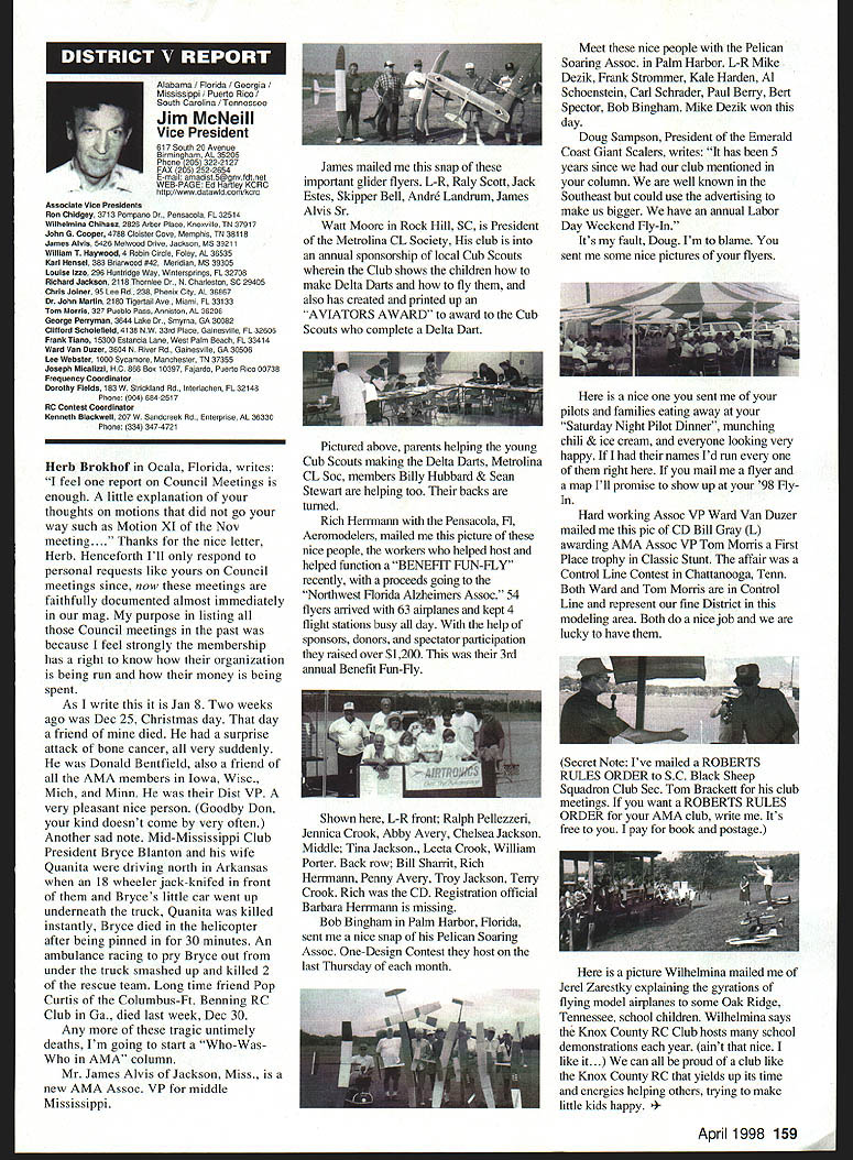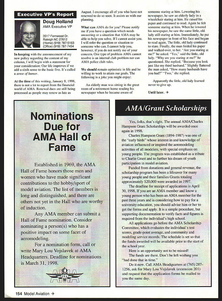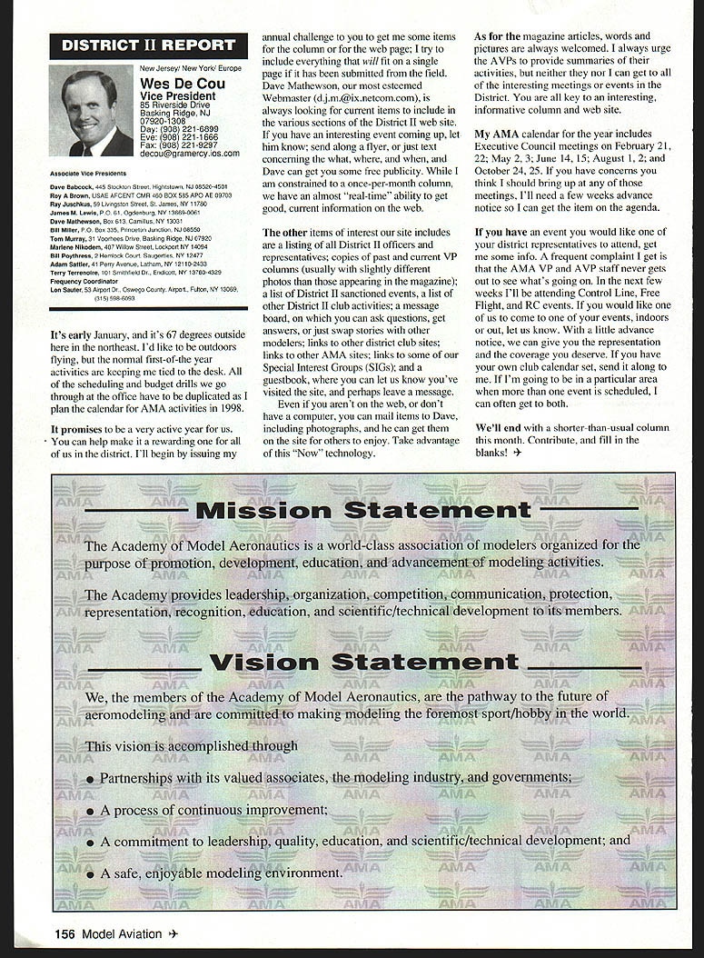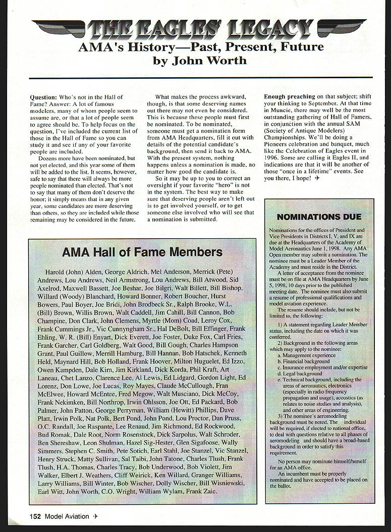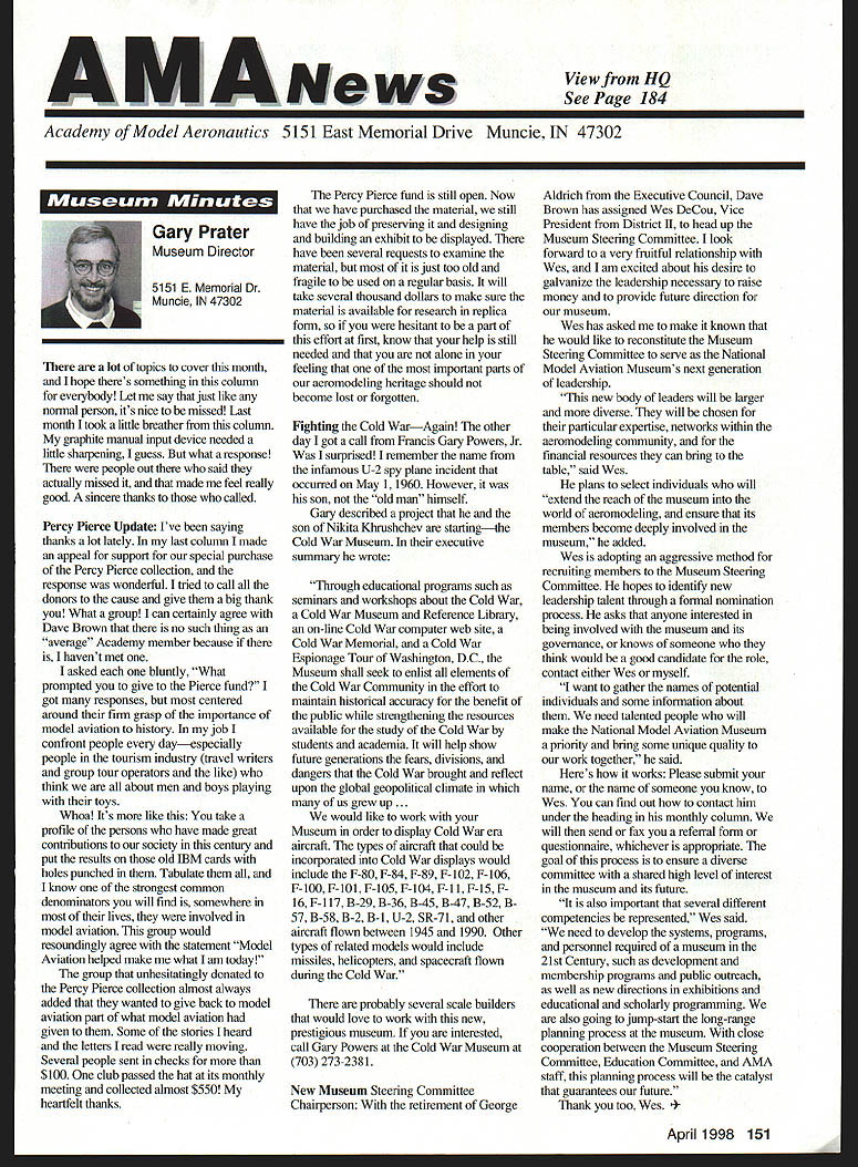 View HQ See Page 184 Academy ModelAeronautics 5151 East Memorial Drive Muncie IN 47302 5jV II Z4 TMii ID t~S Gary Prater Museum Director 5151 E Memorial Dr Muncie IN 47302 lot topics cover month hope theres something column eveiybody Let say just like normal person its nice missed Last month took little breather column graphite manual input device needed little sharpening guess what response people out said actually missed made feel really good sincere thanks called Percy Pierce Update Ive saying thanks lot lately last column made appeal support special purchase Percy Pierce collection response wonderful tried call donors cause give big thank What group can certainly agree Dave Brown no such thing average Academy member because havent met asked bluntly What prompted give Pierce fund got responses centered around firm grasp importance model aviation history job confront people dayespecially people tourism industry travel writers group tour operators like think about men boys playing toys Whoa Its like take profile persons have made great contributions society century put results old IBM cards holes punched Tabulate know strongest common denominators will find somewhere lives involved model aviation group would resoundingly agree statement Model Aviation helped make what am today group unhesitatingly donated Percy Pierce collection almost always added wanted give back model aviation part what model aviation given Some stories heard letters read really moving Several people sent checks $100 club passed hat its monthly meeting colleeted almost $550 heartfelt thanks Percy Pierce fund still open Now have purchased material still have job preserving designing building exhibit displayed have several requests examine material just too old fragile used regular basis will take several thousand dollars make sure material available research replica form hesitant part effort first know help still needed alone feeling important pails aeromodeling heritage should become lost forgotten Fighting Cold WarAgain other day got call Francis Gary Powers Jr surprised remember name infamous U-2 spy plane incident occurred May 1 1960 However son old man himself Gary described project son Nikita Khrushchev starting4he Cold War Museum executive summary wrote Through educational programs such seminars workshops about Cold War Cold War Museum Reference Library on-line Cold War computer web site Cold War Memorial Cold War Espionage Tour Washington DC Museum shall seek enlist elements Cold War Community effort maintain historical accuracy benefit public strengthening resources available study Cold War students academia will help show future generations fears divisions dangers Cold War brought reflect upon global geopolitical climate us grew up . would like work Museum order display Cold War era aircraft types aircraft could incorporated Cold War displays would include F-80 F-84 F-89 F-102 F-106 F-100 F-101 F-lOS F-104 F-l 1 F-iS F 16 F-l 17 B-29 B-36 B-45 B-47 B-52 B57 B-58 B-2 B-l U-2 SR-71 other aircraft flown between 1945 1990 Other types related models would include missiles helicopters spacecraft flown during Cold War probably several scale builders would love work new prestigious museum interested call Gary Powers Cold War Museum 703 273-2381 New Museum Steering Committee Chairperson retirement George Aldrich Executive Council Dave Brown has assigned Wes DeCou Vice President District II head up Museum Steering Committee look forward very fruitful relationship Wes am excited about desire galvanize leadership necessary raise money provide future direction museum Wes has asked make known would like reconstitute Museum Steering Committee serve National Model Aviation Museums next generation leadership new body leaders will larger diverse will chosen particular expertise networks within aeromodeling community financial resources can bring table said Wes plans seleet individuals will extend reach museum world aeromodeling ensure its members become deeply involved museum added Wes adopting aggressive method recruiting members Museum Steering Committee hopes identify new leadership talent through formal nomination process asks anyone interested being involved museum its govemance knows someone think would good candidate role contact either Wes myself want gather names potential individuals some information about need talented people will make National Model Aviation Museum priority bring some unique quality work together said Heres works Please submit name name someone know Wes can find out contact him under heading monthly column will send fax referral form questionnaire whichever appropriate goal process ensure diverse committee shared high level interest museum its future also important several different competencies represented Wes said need develop systems programs personnel required museum 21st Century such development membership programs public outreach well new directions exhibitions educational scholarly programming also going jump-start long-range planning process museum close cooperation between Museum Steering Committee Education Committee AMA staff planning process will catalyst guarantees future Thank too Wes l 1998 151 EWI W AMAs HistoryPast Present Future John Worth Question Whos Hall Fame Answer lot famous modelers people seem assume lot people seem agree should help focus question Ive included current list Hall Fame can study see favorite people included Dozens have nominated yet elected year some will added list seems however safe say will always people nominated elected Thats say dont deserve honor simply means given year some candidates deserving others included remaining may considered future What makes process awkward though some deserving names out may considered because people must first nominated nominated someone must get nomination form AMA Headquarters fill out details potential candidates background send back AMA present system nothing happens unless nomination made no matter good candidate S