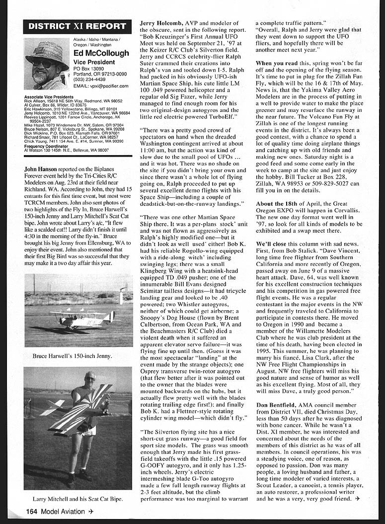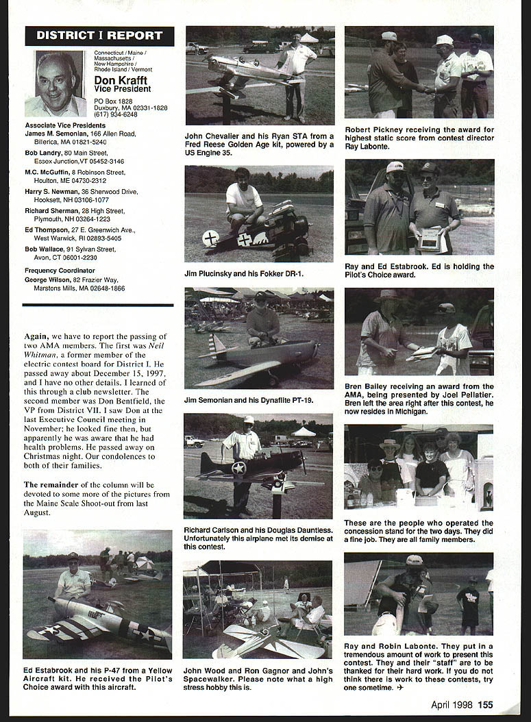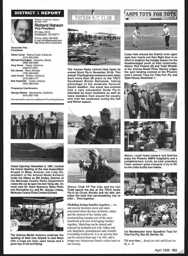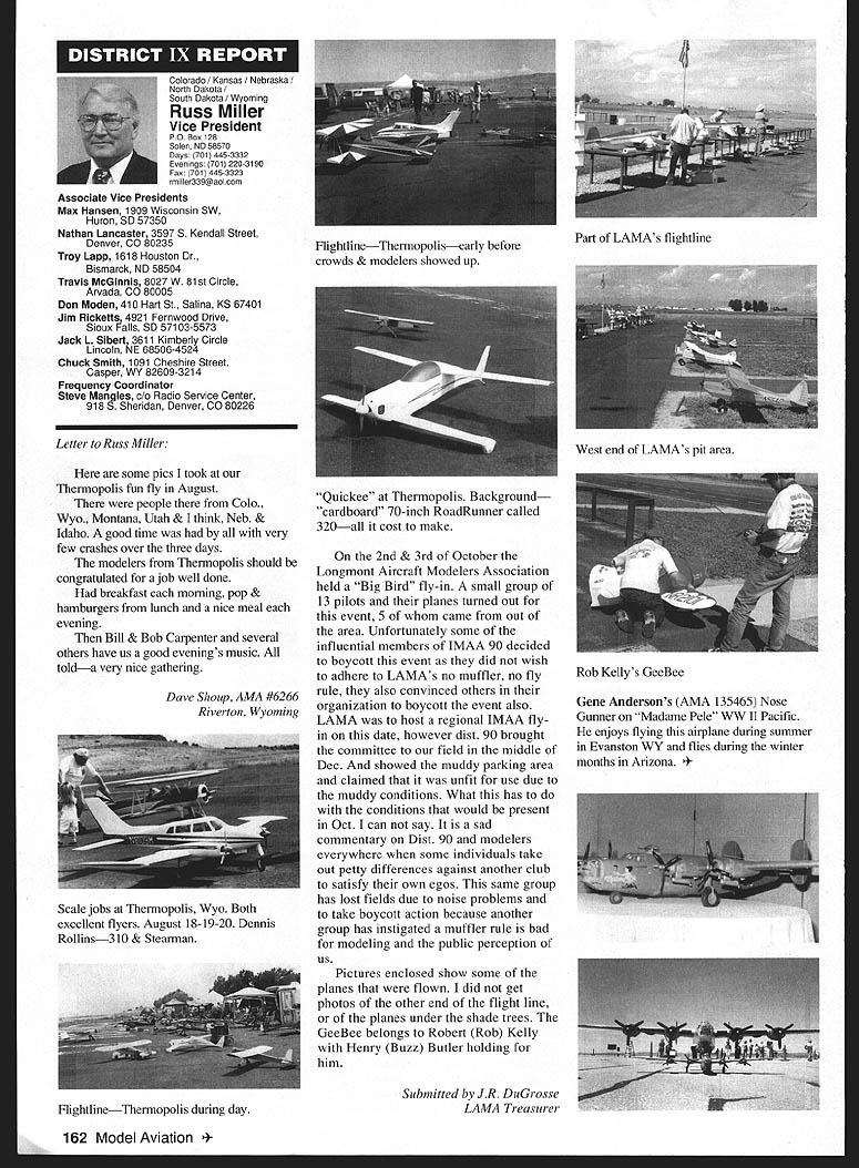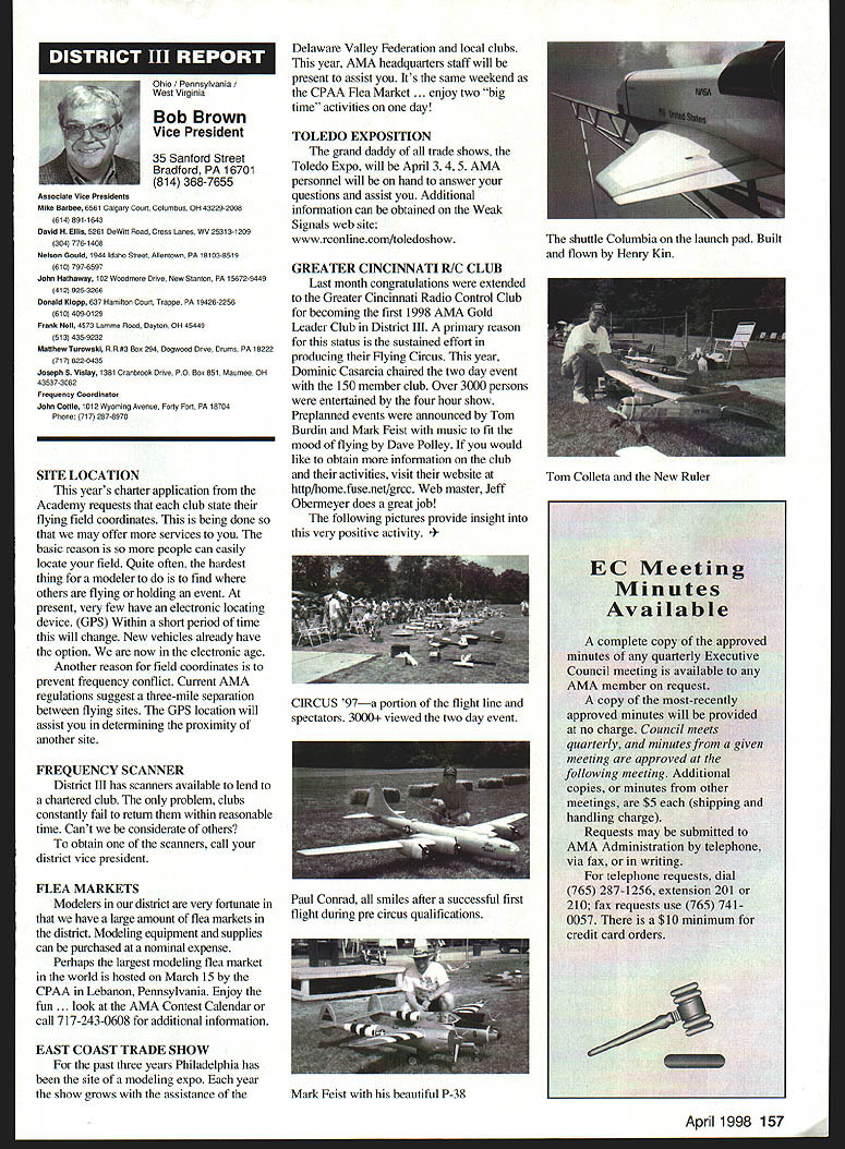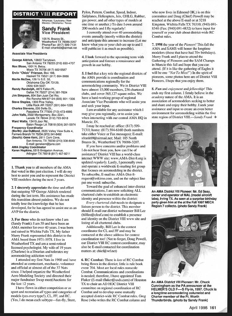 View HQ See Page 184 Academy ModelAeronautics 5151 East Memorial Drive Muncie IN 47302 5jV II Z4 TMii ID t~S Gary Prater Museum Director 5151 E Memorial Dr Muncie IN 47302 lot topics cover month hope theres something column eveiybody Let say just like normal person its nice missed Last month took little breather column graphite manual input device needed little sharpening guess what response people out said actually missed made feel really good sincere thanks called Percy Pierce Update Ive saying thanks lot lately last column made appeal support special purchase Percy Pierce collection response wonderful tried call donors cause give big thank What group can certainly agree Dave Brown no such thing average Academy member because havent met asked bluntly What prompted give Pierce fund got responses centered around firm grasp importance model aviation history job confront people dayespecially people tourism industry travel writers group tour operators like think about men boys playing toys Whoa Its like take profile persons have made great contributions society century put results old IBM cards holes punched Tabulate know strongest common denominators will find somewhere lives involved model aviation group would resoundingly agree statement Model Aviation helped make what am today group unhesitatingly donated Percy Pierce collection almost always added wanted give back model aviation part what model aviation given Some stories heard letters read really moving Several people sent checks $100 club passed hat its monthly meeting colleeted almost $550 heartfelt thanks Percy Pierce fund still open Now have purchased material still have job preserving designing building exhibit displayed have several requests examine material just too old fragile used regular basis will take several thousand dollars make sure material available research replica form hesitant part effort first know help still needed alone feeling important pails aeromodeling heritage should become lost forgotten Fighting Cold WarAgain other day got call Francis Gary Powers Jr surprised remember name infamous U-2 spy plane incident occurred May 1 1960 However son old man himself Gary described project son Nikita Khrushchev starting4he Cold War Museum executive summary wrote Through educational programs such seminars workshops about Cold War Cold War Museum Reference Library on-line Cold War computer web site Cold War Memorial Cold War Espionage Tour Washington DC Museum shall seek enlist elements Cold War Community effort maintain historical accuracy benefit public strengthening resources available study Cold War students academia will help show future generations fears divisions dangers Cold War brought reflect upon global geopolitical climate us grew up . would like work Museum order display Cold War era aircraft types aircraft could incorporated Cold War displays would include F-80 F-84 F-89 F-102 F-106 F-100 F-101 F-lOS F-104 F-l 1 F-iS F 16 F-l 17 B-29 B-36 B-45 B-47 B-52 B57 B-58 B-2 B-l U-2 SR-71 other aircraft flown between 1945 1990 Other types related models would include missiles helicopters spacecraft flown during Cold War probably several scale builders would love work new prestigious museum interested call Gary Powers Cold War Museum 703 273-2381 New Museum Steering Committee Chairperson retirement George Aldrich Executive Council Dave Brown has assigned Wes DeCou Vice President District II head up Museum Steering Committee look forward very fruitful relationship Wes am excited about desire galvanize leadership necessary raise money provide future direction museum Wes has asked make known would like reconstitute Museum Steering Committee serve National Model Aviation Museums next generation leadership new body leaders will larger diverse will chosen particular expertise networks within aeromodeling community financial resources can bring table said Wes plans seleet individuals will extend reach museum world aeromodeling ensure its members become deeply involved museum added Wes adopting aggressive method recruiting members Museum Steering Committee hopes identify new leadership talent through formal nomination process asks anyone interested being involved museum its govemance knows someone think would good candidate role contact either Wes myself want gather names potential individuals some information about need talented people will make National Model Aviation Museum priority bring some unique quality work together said Heres works Please submit name name someone know Wes can find out contact him under heading monthly column will send fax referral form questionnaire whichever appropriate goal process ensure diverse committee shared high level interest museum its future also important several different competencies represented Wes said need develop systems programs personnel required museum 21st Century such development membership programs public outreach well new directions exhibitions educational scholarly programming also going jump-start long-range planning process museum close cooperation between Museum Steering Committee Education Committee AMA staff planning process will catalyst guarantees future Thank too Wes l 1998 151 EWI W AMAs HistoryPast Present Future John Worth Question Whos Hall Fame Answer lot famous modelers people seem assume lot people seem agree should help focus question Ive included current list Hall Fame can study see favorite people included Dozens have nominated yet elected year some will added list seems however safe say will always people nominated elected Thats say dont deserve honor simply means given year some candidates deserving others included remaining may considered future What makes process awkward though some deserving names out may considered because people must first nominated nominated someone must get nomination form AMA Headquarters fill out details potential candidates background send back AMA present system nothing happens unless nomination made no matter good candidate S