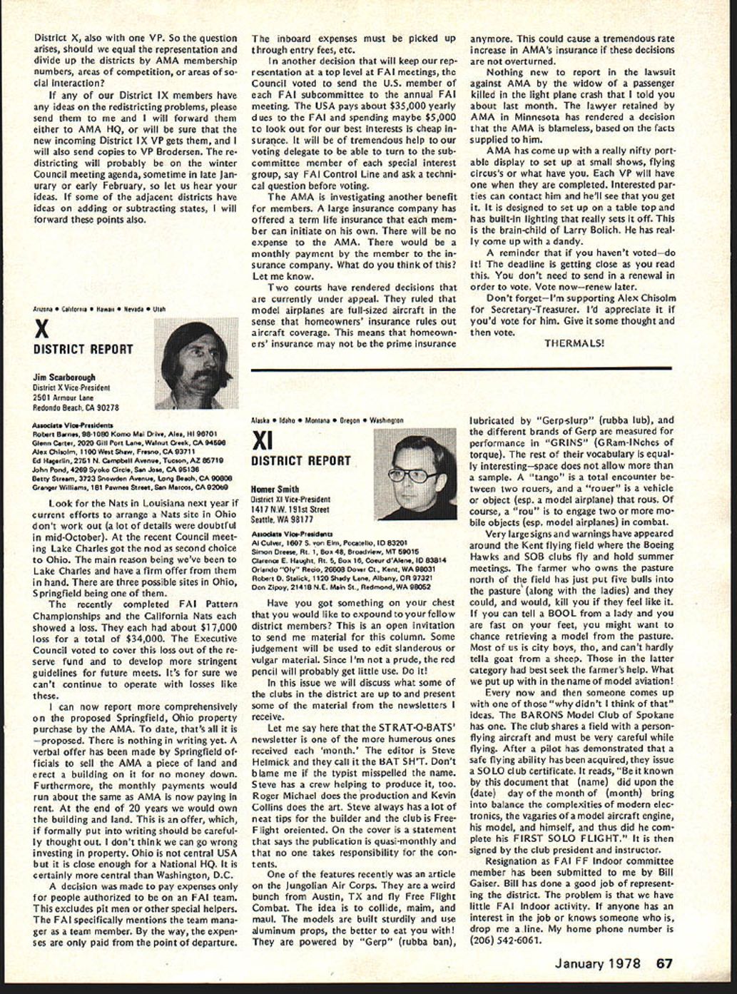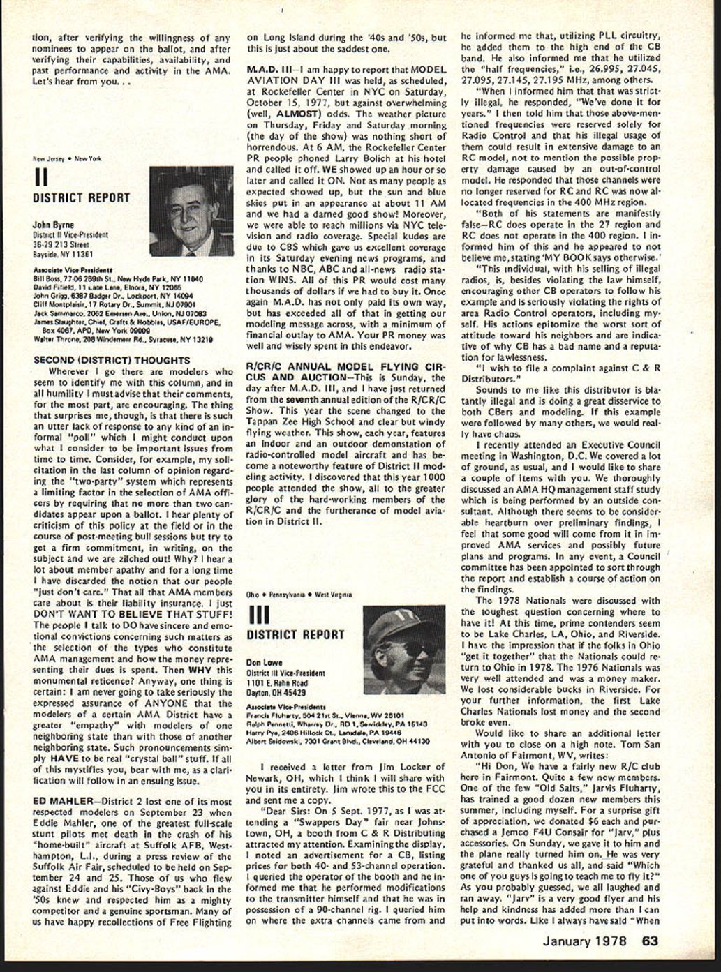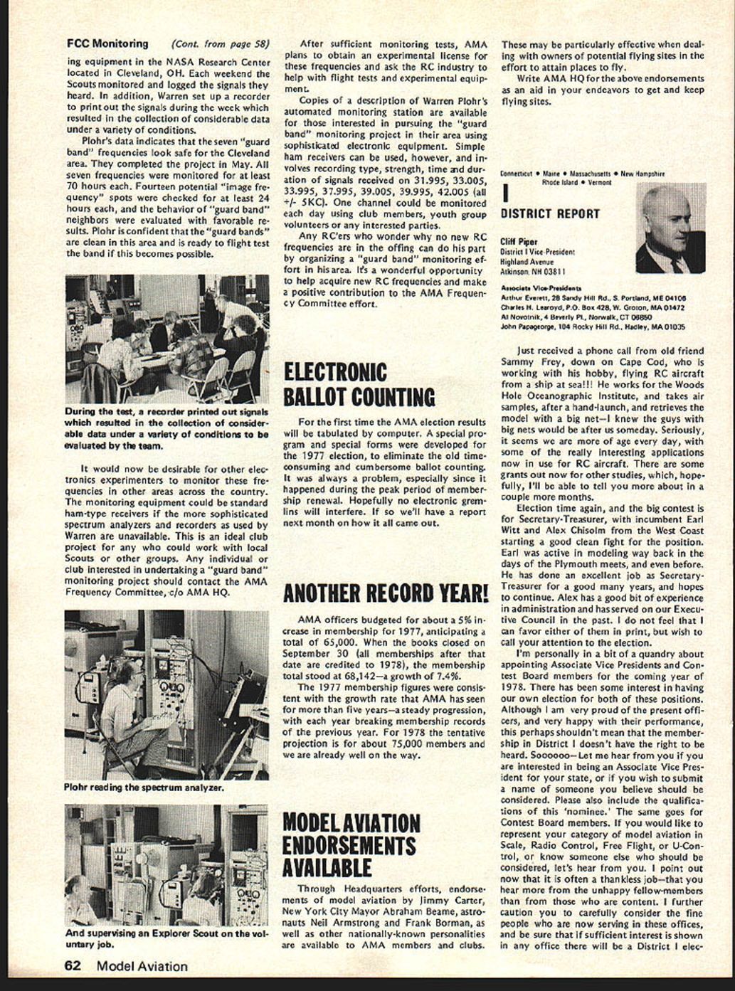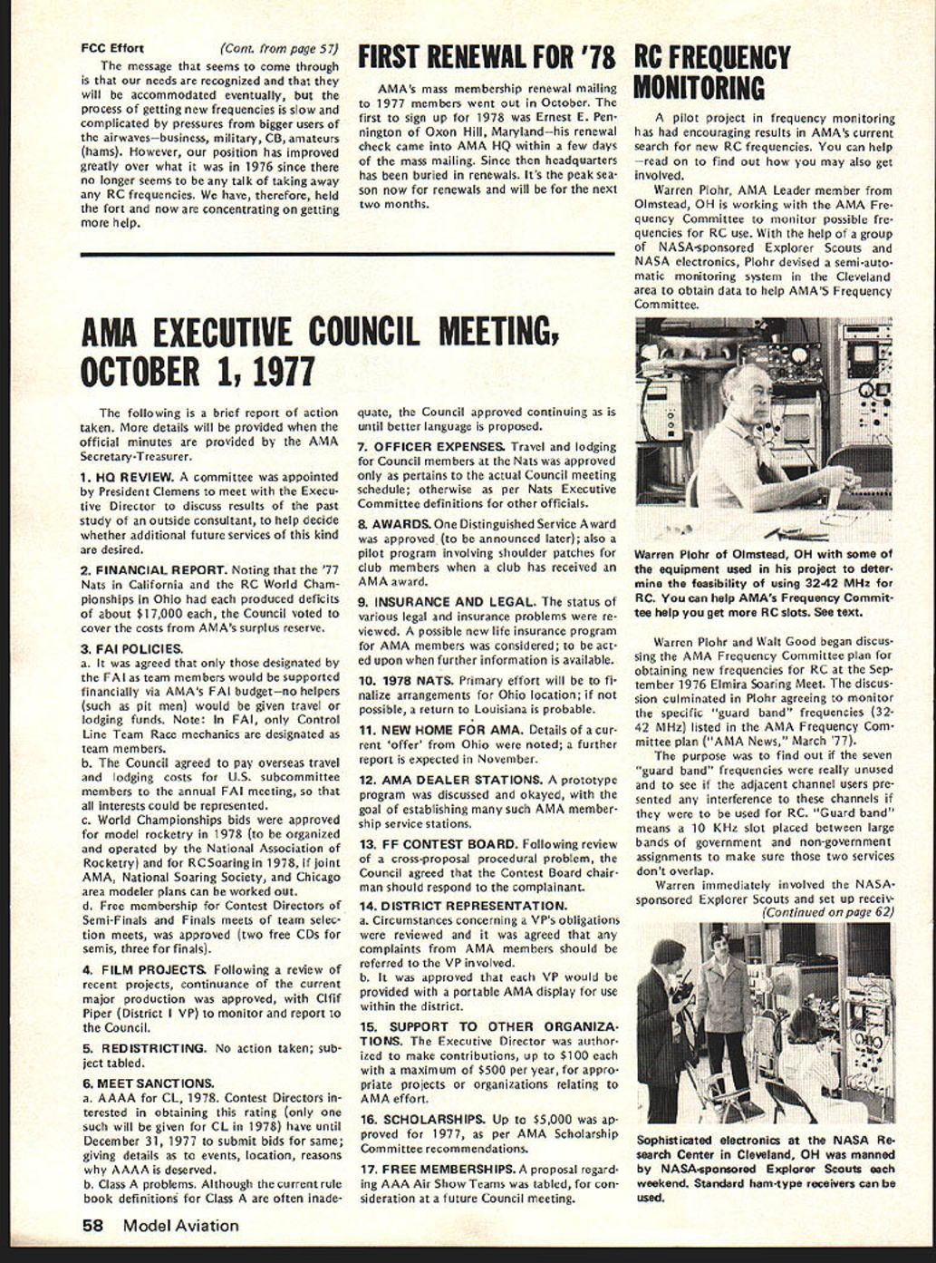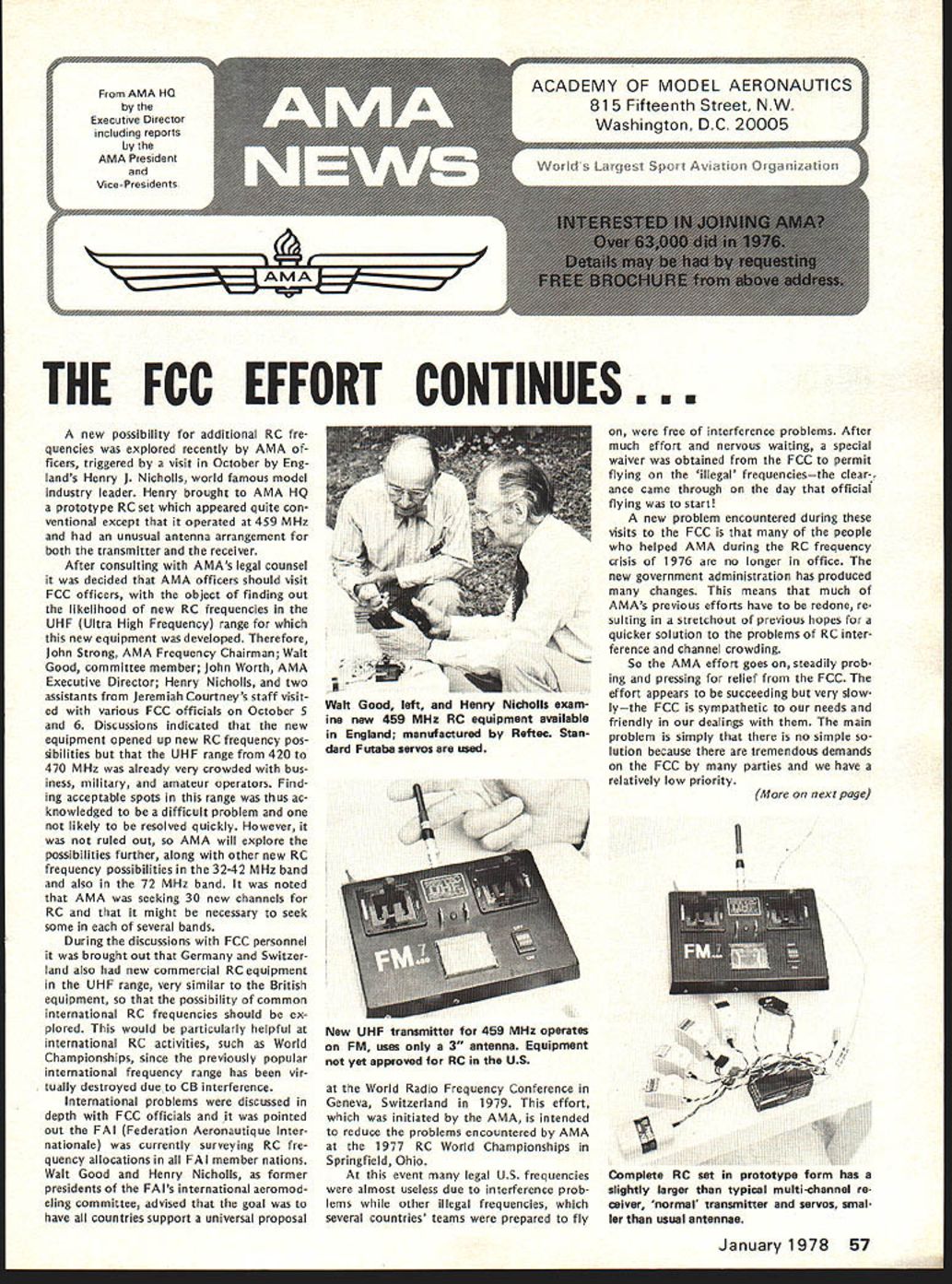 A new possibility additional RC fre quencies explored recently AMA ficers triggered visit October Eng lands Henry j Nicholls world famous model industry leader Henry brought AMA HQ prototype RC set appeared quite con ventional except operated 459 MHz unusual antenna arrangement both transmitter receiver After consulting AMAs legal counsel decided AMA officers should visit FCC officers object finding out likelihood new RC frequencies UHF Ultra High Frequency range new equipment developed Therefore John Strong AMA Frequency Chairman Walt Good committee member John Worth AMA Executive Director Henry Nicholls two assistants Jeremiah Courtneys staff visit ed various FCC officials October 5 6 Discussions indicated new equipment opened up new RC frequency pos sibilities UHF range 420 470 MHz already very crowded bus iness military amateur operators Find ing acceptable spots range thus ac knowledged difficult problem likely resolved quickly However ruled out AMA will explore possibilities further along other new RC frequency possibilities 32-42 MHz band also 72 MHz band noted AMA seeking 30 new channels RC might necessary seek some several bands During discussions FCC personnel brought out Germany Switzer land also new commercial RC equipment UHF range very similar British equipment possibility common international RC frequencies should ex plored would particularly helpful international RC activities such World Championships since previously popular international frequency range has vir tually destroyed due CB interference International problems discussed depth FCC officials pointed out FAI Federation Aeronautique Inter nationale currently surveying RC fre quency allocations FAI member nations Walt Good Henry Nicholls former presidents FAIs international aeromod eling committee advised goal have countries support universal proposal World Radio Frequency Conference Geneva Switzerland 1979 effort initiated AMA intended reduce problems encountered AMA 1977 RC World Championships Springfield Ohio event legal US frequencies almost useless due interference prob lems other illegal frequencies several countries teams prepared fly free interference problems After much effort nervous waiting special waiver obtained FCC permit flying illegal frequenciesthe clear- ance came through day official flying start new problem encountered during visits FCC people helped AMA during RC frequency crisis 1976 no longer office new government administration has produced changes means much AMAs previous efforts have redone re sulting stretchout previous hopes quicker solution problems RC inter ference channel crowding So AMA effort goes steadily prob ing pressing relief FCC effort appears succeeding very slow lythe FCC sympathetic needs friendly dealings main problem simply no simple lution because tremendous demands FCC parties have relatively low priority next page B Complete RC set prototype form has slightly larger typical multi-channel re ceiver normal transmitter servos smal ler usual antennae January1978 57 AMA HO Executive Director including reports AMA President Vice-Presidents L ACADEMY OF MODEL AERONAUTICS 81 5 Fifteenth Street NW Washington DC 20005 THE FCC EFFORT CONTINUES. Walt Good left Henry Nicholls exam ine new 459 MHz RC equipment available England manufactured Reftec Stan dard Futabe servos used New UHF transmitter 459 MHz operates FM uses 3 antenna Equipment yet approved RC US FCC EffortCont page 57 message seems come through needs recognized will accommodated eventually process getting new frequencies slow complicated pressures bigger users airwavesbusiness military CB amateurs hams However position has improved greatly over what 1976 since no longer seems talk taking away RC frequencies have therefore held fort now concentrating getting help FIRST RENEWAL FOR 18 RC FREQUENCY MONITORING AMAs mass membership renewal mailing 1977 members went out October first sign up 1978 Ernest E Pen nington Oxon Hill Marylandhis renewal check came AMA HQ within few days mass mailing Since headquarters has buried renewals Its peak sea son now renewals will next two months pilot project frequency monitoring has encouraging results AMAs current search new RC frequencies can help read find out may also get involved Warren Plohr AMA Leader member Olmstead OH working AMA Fre quency Committee monitor possible fre quencies RC use help group NASA-sponsored Explorer Scouts NASA electronics Plohr devised semi-auto matic monitoring system Cleveland area obtain data help AMAS Frequency Committee AMA EXECUTIVE COUNCIL MEETING OCTOBER 1 1911 following br ef report act taken details will provided official minutes provided AMA Secretary-Treasurer 1 HQ REVIEW committee appointed President Clemens meet Execu tive Director discuss results past study outside consultant help decide whether additional future services kind desired 2 FINANCIAL REPORT Noting 77 Nats California RC World Cham pionships Ohio produced deficits about $1 7000 Council voted cover costs AMAs surplus reserve 3 FAI POLICIES a It agreed designated FAI team members would supported financially via AMAs FAI budgetno helpers such pit men would given travel lodging funds Note FAI Control Line Team Race mechanics designated team members b The Council agreed pay overseas travel lodging costs US subcommittee members annual FAI meeting interests could represented c World Championships bids approved model rocketry 1978 organized operated National Association Rocketry RCSoaringin 1978 joint AMA National Soaring Society Chicago area modeler plans can worked out d Free membership Contest Directors Semi-Finals Finals meets team selec tion meets approved two free CDs semis three finals 4 FILM PROJECTS Following review recent projects continuance current major production approved Cifif Piper District VP monitor report Council 5 REDISTRICTING No action taken sub ject tabled 6 MEET SANCTIONS a AAAA CL 1978 Contest Directors terested obtaining rating such will given CL 1978 have until De