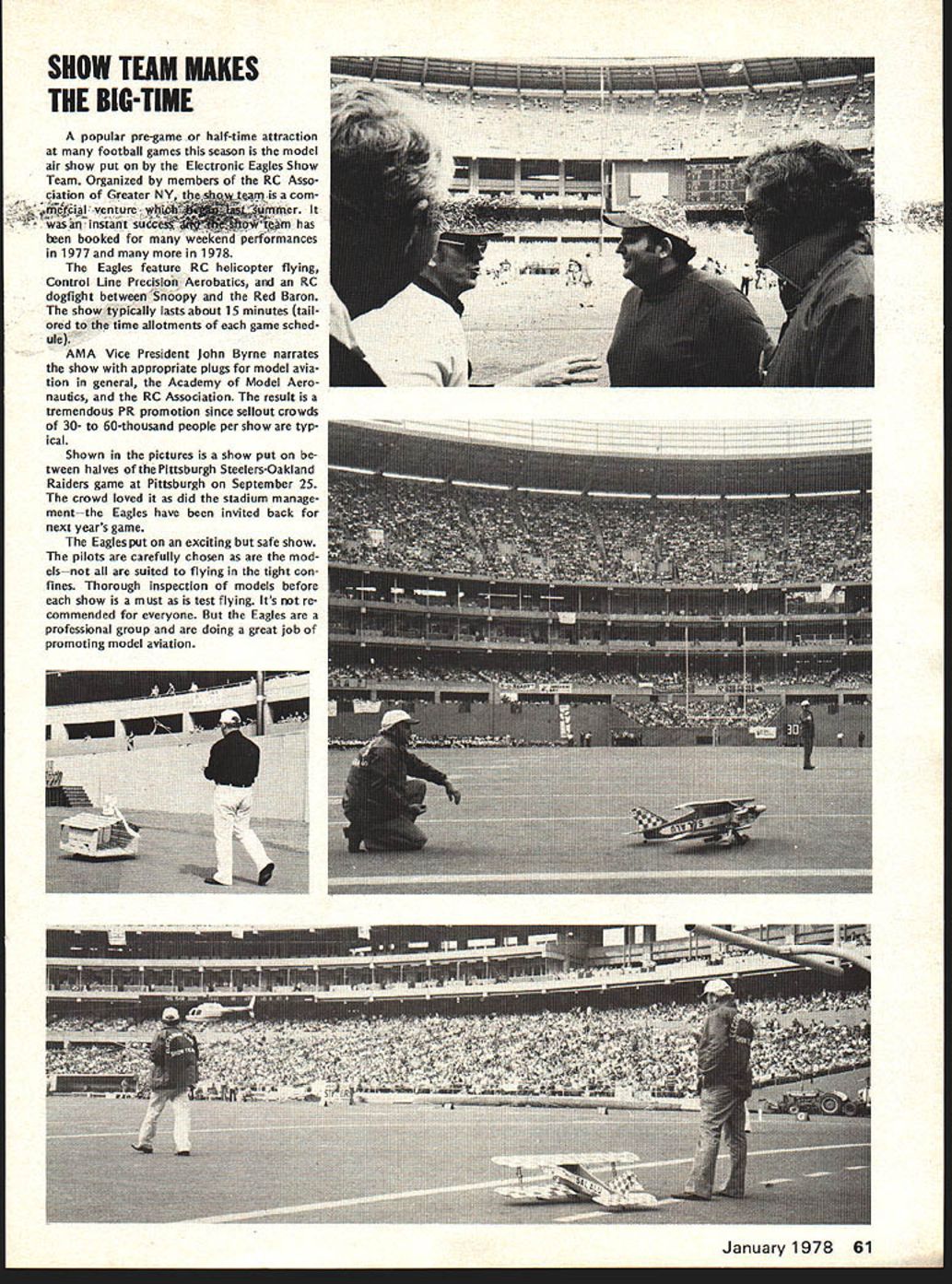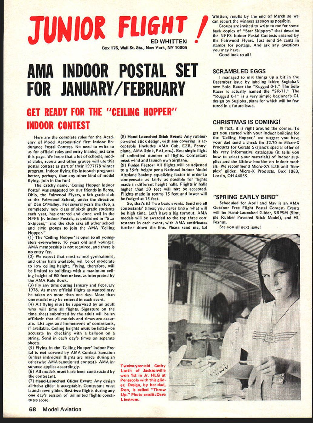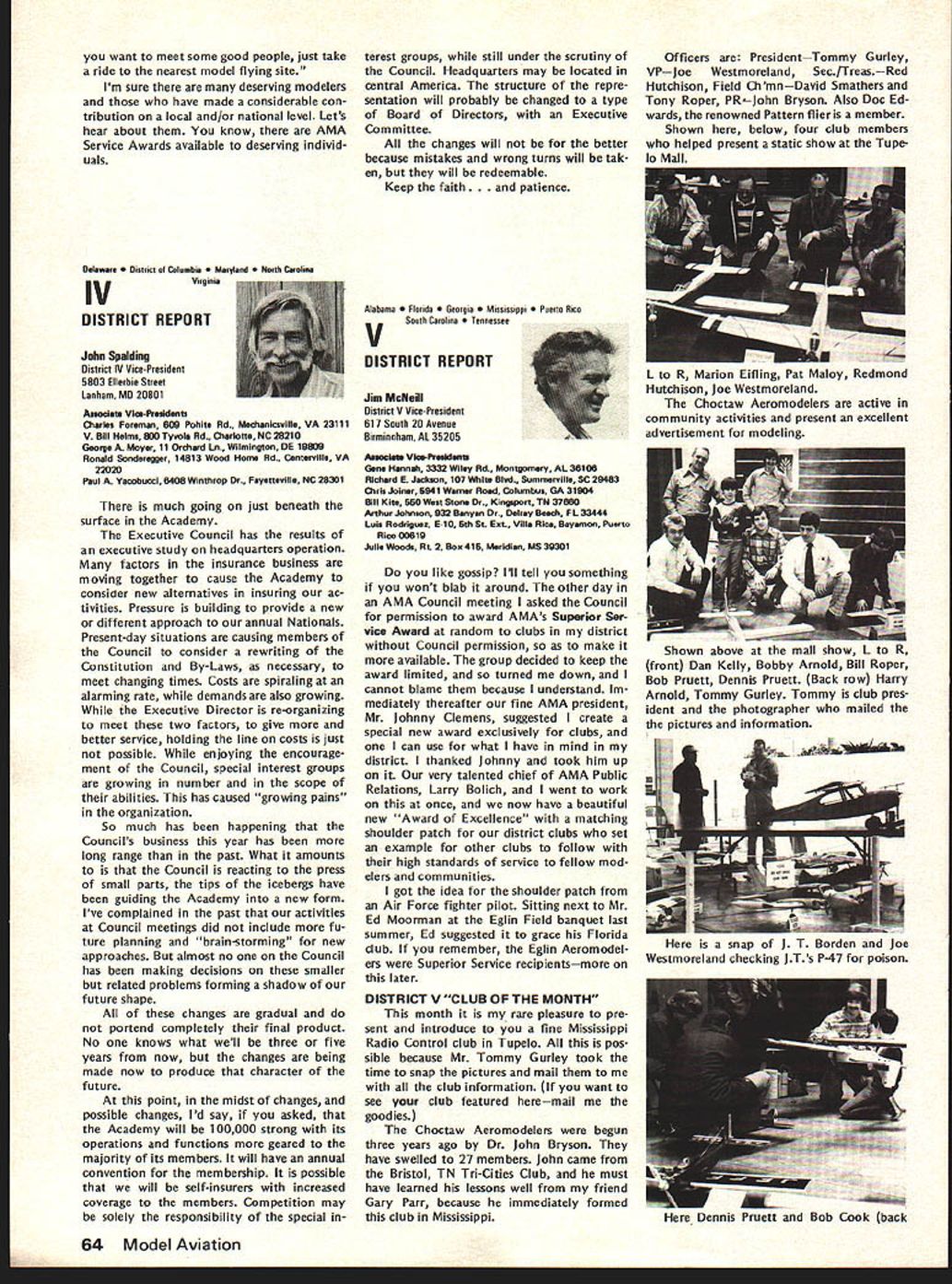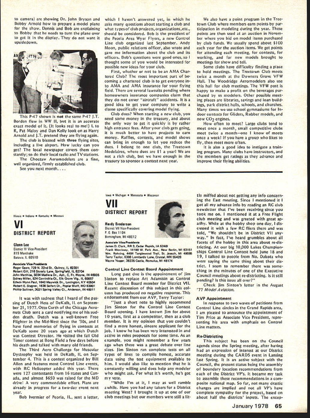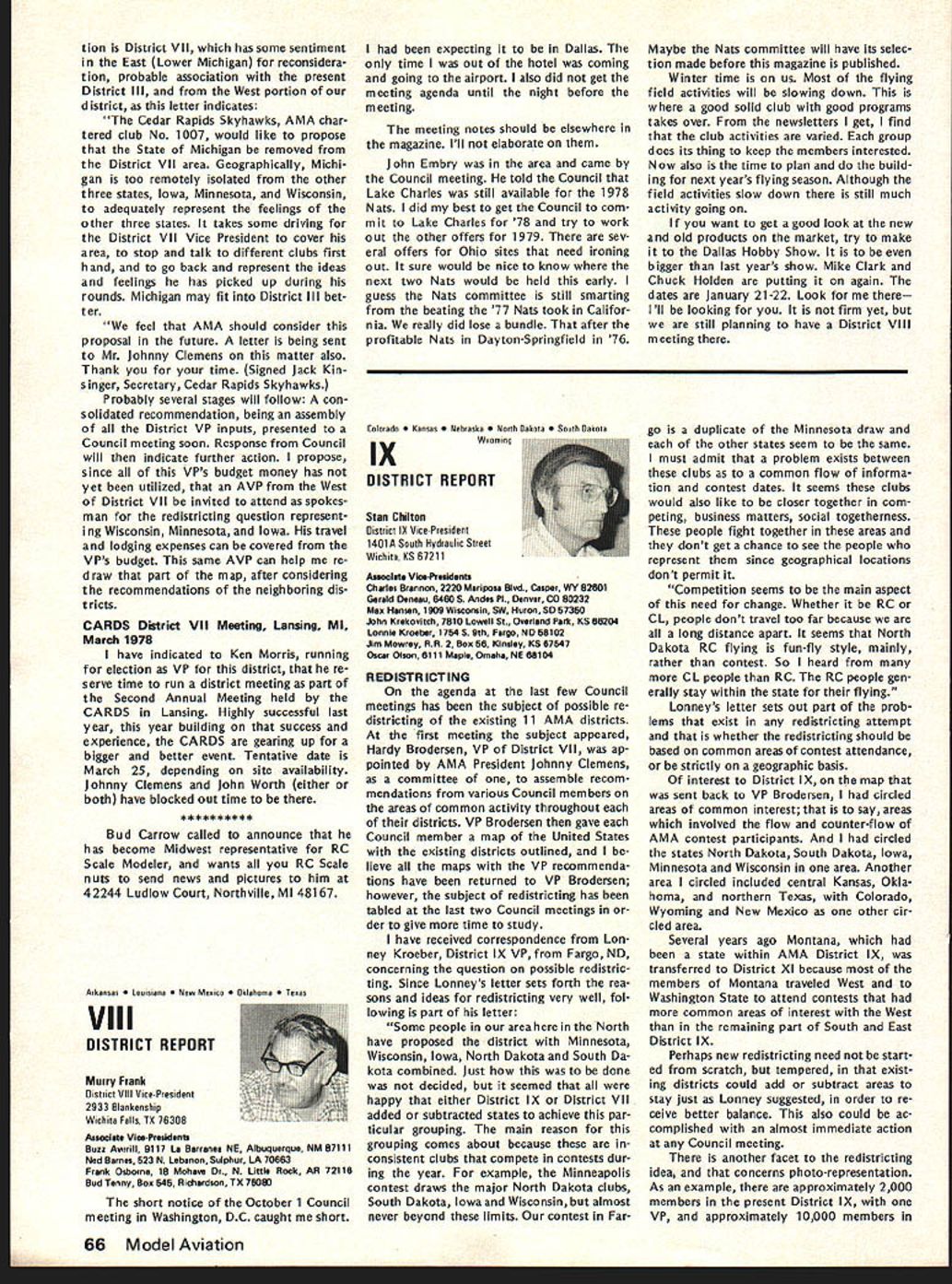A new possibility additional RC fre quencies explored recently AMA ficers triggered visit October Eng lands Henry j Nicholls world famous model industry leader Henry brought AMA HQ prototype RC set appeared quite con ventional except operated 459 MHz unusual antenna arrangement both transmitter receiver After consulting AMAs legal counsel decided AMA officers should visit FCC officers object finding out likelihood new RC frequencies UHF Ultra High Frequency range new equipment developed Therefore John Strong AMA Frequency Chairman Walt Good committee member John Worth AMA Executive Director Henry Nicholls two assistants Jeremiah Courtneys staff visit ed various FCC officials October 5 6 Discussions indicated new equipment opened up new RC frequency pos sibilities UHF range 420 470 MHz already very crowded bus iness military amateur operators Find ing acceptable spots range thus ac knowledged difficult problem likely resolved quickly However ruled out AMA will explore possibilities further along other new RC frequency possibilities 32-42 MHz band also 72 MHz band noted AMA seeking 30 new channels RC might necessary seek some several bands During discussions FCC personnel brought out Germany Switzer land also new commercial RC equipment UHF range very similar British equipment possibility common international RC frequencies should ex plored would particularly helpful international RC activities such World Championships since previously popular international frequency range has vir tually destroyed due CB interference International problems discussed depth FCC officials pointed out FAI Federation Aeronautique Inter nationale currently surveying RC fre quency allocations FAI member nations Walt Good Henry Nicholls former presidents FAIs international aeromod eling committee advised goal have countries support universal proposal World Radio Frequency Conference Geneva Switzerland 1979 effort initiated AMA intended reduce problems encountered AMA 1977 RC World Championships Springfield Ohio event legal US frequencies almost useless due interference prob lems other illegal frequencies several countries teams prepared fly free interference problems After much effort nervous waiting special waiver obtained FCC permit flying illegal frequenciesthe clear- ance came through day official flying start new problem encountered during visits FCC people helped AMA during RC frequency crisis 1976 no longer office new government administration has produced changes means much AMAs previous efforts have redone re sulting stretchout previous hopes quicker solution problems RC inter ference channel crowding So AMA effort goes steadily prob ing pressing relief FCC effort appears succeeding very slow lythe FCC sympathetic needs friendly dealings main problem simply no simple lution because tremendous demands FCC parties have relatively low priority next page B Complete RC set prototype form has slightly larger typical multi-channel re ceiver normal transmitter servos smal ler usual antennae January1978 57 AMA HO Executive Director including reports AMA President Vice-Presidents L ACADEMY OF MODEL AERONAUTICS 81 5 Fifteenth Street NW Washington DC 20005 THE FCC EFFORT CONTINUES. Walt Good left Henry Nicholls exam ine new 459 MHz RC equipment available England manufactured Reftec Stan dard Futabe servos used New UHF transmitter 459 MHz operates FM uses 3 antenna Equipment yet approved RC US FCC EffortCont page 57 message seems come through needs recognized will accommodated eventually process getting new frequencies slow complicated pressures bigger users airwavesbusiness military CB amateurs hams However position has improved greatly over what 1976 since no longer seems talk taking away RC frequencies have therefore held fort now concentrating getting help FIRST RENEWAL FOR 18 RC FREQUENCY MONITORING AMAs mass membership renewal mailing 1977 members went out October first sign up 1978 Ernest E Pen nington Oxon Hill Marylandhis renewal check came AMA HQ within few days mass mailing Since headquarters has buried renewals Its peak sea son now renewals will next two months pilot project frequency monitoring has encouraging results AMAs current search new RC frequencies can help read find out may also get involved Warren Plohr AMA Leader member Olmstead OH working AMA Fre quency Committee monitor possible fre quencies RC use help group NASA-sponsored Explorer Scouts NASA electronics Plohr devised semi-auto matic monitoring system Cleveland area obtain data help AMAS Frequency Committee AMA EXECUTIVE COUNCIL MEETING OCTOBER 1 1911 following br ef report act taken details will provided official minutes provided AMA Secretary-Treasurer 1 HQ REVIEW committee appointed President Clemens meet Execu tive Director discuss results past study outside consultant help decide whether additional future services kind desired 2 FINANCIAL REPORT Noting 77 Nats California RC World Cham pionships Ohio produced deficits about $1 7000 Council voted cover costs AMAs surplus reserve 3 FAI POLICIES a It agreed designated FAI team members would supported financially via AMAs FAI budgetno helpers such pit men would given travel lodging funds Note FAI Control Line Team Race mechanics designated team members b The Council agreed pay overseas travel lodging costs US subcommittee members annual FAI meeting interests could represented c World Championships bids approved model rocketry 1978 organized operated National Association Rocketry RCSoaringin 1978 joint AMA National Soaring Society Chicago area modeler plans can worked out d Free membership Contest Directors Semi-Finals Finals meets team selec tion meets approved two free CDs semis three finals 4 FILM PROJECTS Following review recent projects continuance current major production approved Cifif Piper District VP monitor report Council 5 REDISTRICTING No action taken sub ject tabled 6 MEET SANCTIONS a AAAA CL 1978 Contest Directors terested obtaining rating such will given CL 1978 have until De