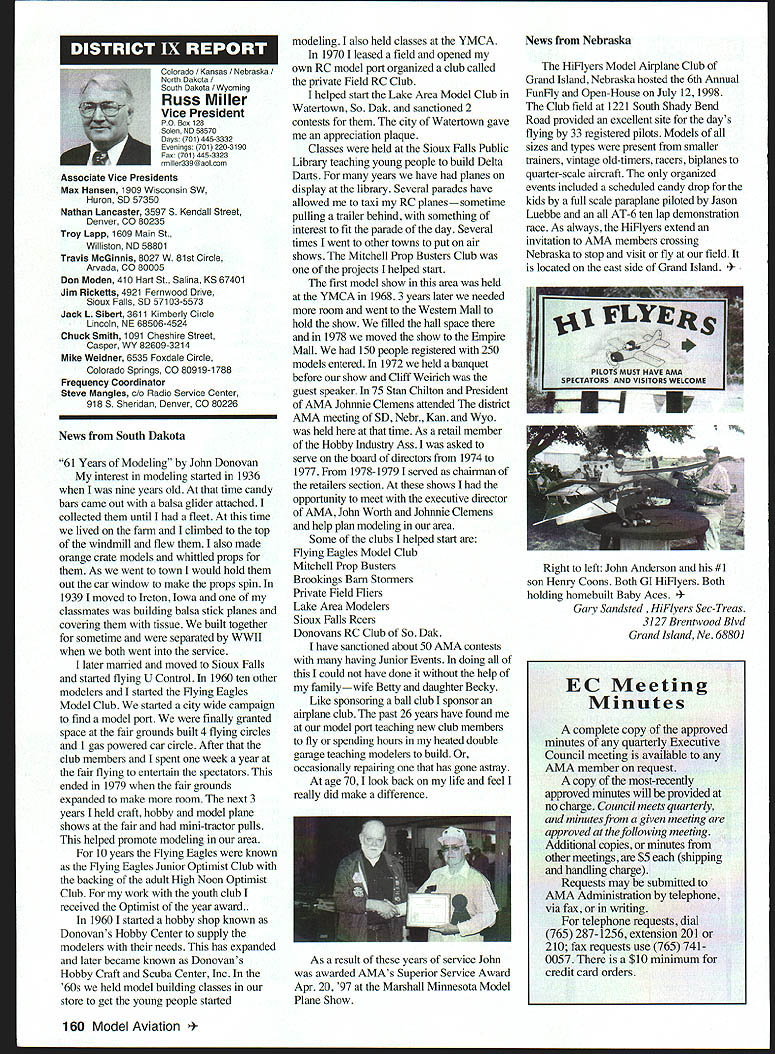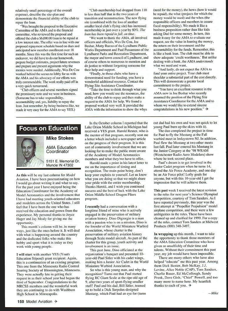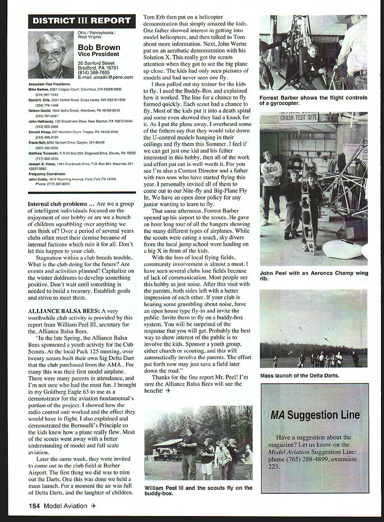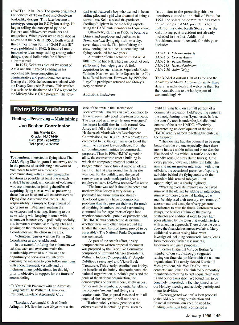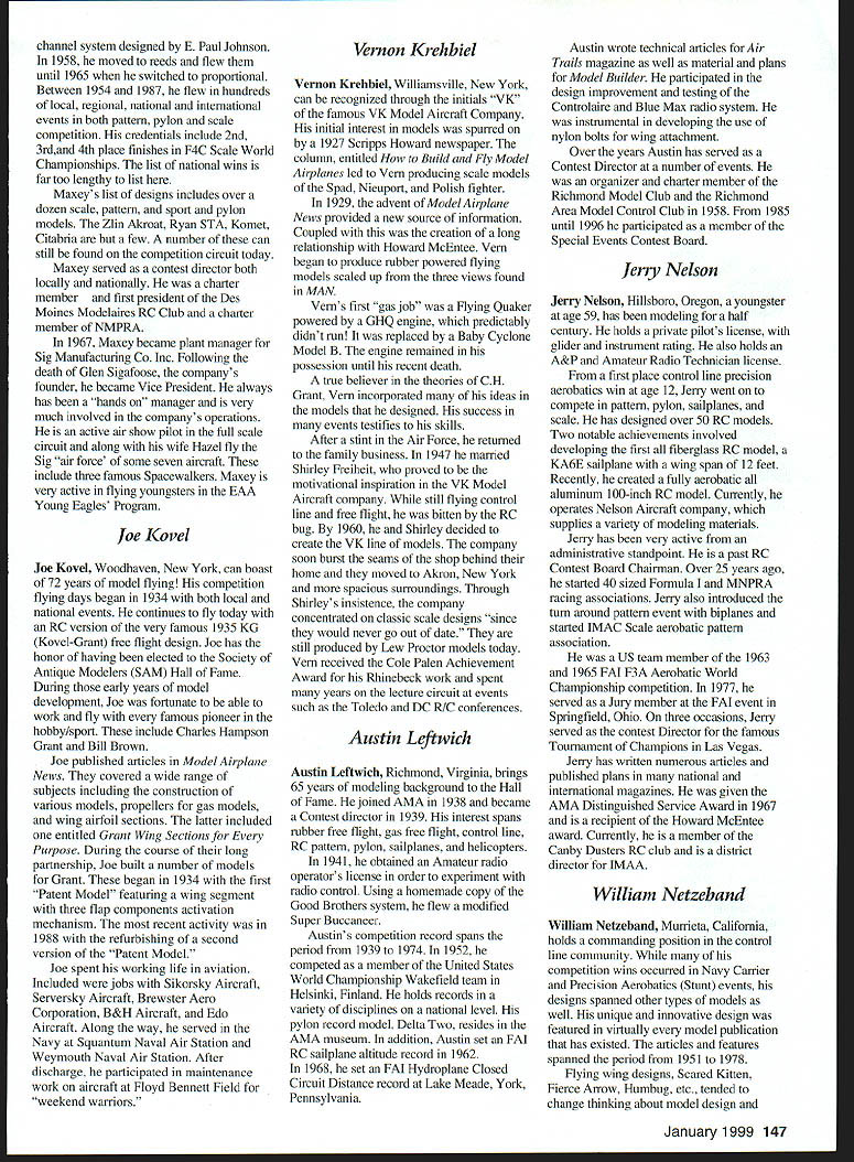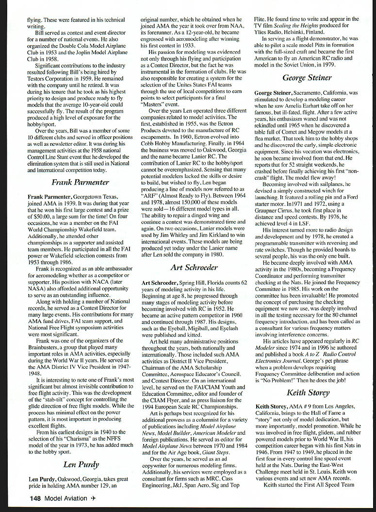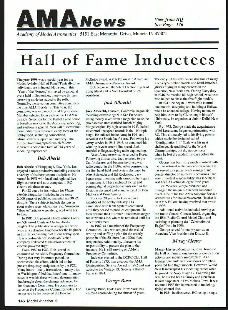 ws View HQ See Page 176 Hall Fame Inductees year 1998 special year Model Aviation Hall Fame Typically five individuals inducted However Year Pioneer climaxed special event held September thirteen deserving modelers added rolls Normally selection committee consists nine AMA Presidents year committee expanded adding Leader Member selected 11 AMA districts Selection Hall Fame honor based service Academy modeling aviation general will discover individuals represent facet hobby/sport including competition administrative support industry thirteen brief biographies follow represent combined total 974 years modeling experience Bob Aberle Bob Aberle Hauppauge New York has enjoyed productive modeling career variety hobby/sport disciplines started 1951 local regional free flight contests now competes RC electric old timer events 28 years has written Flying Models Magazine Included some 2000 pages published material 30 RC designs subjects include designs sport scale racers old-timers etc Numerous articles also graced byline 1985 Bob penned book named Clean QuietA Guide Electric Model Flights publication recognized world wide definitive handbook beginner fast expanding part hobby/sport co-founder Modelair-Tech company dedicated advancement electric powered flight 1980 1983 Bob served chairman AMA Frequency Committee During very important period spearheaded effort led present frequency assignments FCC hoursmany frustrationsmany trips Washington filled time frame cases sheer will determination brought about changes advanced Frequency Committee continues serve Frequency Committee today service has received Howard McEntee award AMA Fellowship Award AMA Distinguished Service Award Bob organized Silent Electric Flyers Long Island Vice President R/C Squadron Jack Albrecht Jack Albrecht Fairfield California began modeling career age 9 San Francisco Using money saved magazine route purchased unassembled Bunch Mighty Midget engine high school 1943 set control line speed records 100-mph range enlisted Army 1944 served South Pacific area Following Army service 1944-1946 continued winning says control line speed Jack attended college studying radio engineering As Army reservist served Korea Following service Jack returned California area became involved radio control 1950s After constructing first hand-held reed system designed Alex Schneider Ed Rockwood Jack began experimenting various other types equipment included up coming digital proportional units such Digicom designed manufactured Don Mathes Doug Spreng over 20 years Jack served member hobby industry association Kraft Systems continued until ceased produce equipment became Customer Relations Manager Airtronics Inc remained until recent retirement 1982 member Frequency Committee Jack assigned task writing staffing plan orderly phase-in 50 aircraft 30 surface frequencies Additionally became responsibility present plan industry still serving AMAs Frequency Committee Jack elected DCRC Club Hall Fame 1975 awarded AMA Distinguished Service Award 1992 added Vintage RC Societys Hall Fame 1994 George Buso George Buso Hyde Park New York has enjoyed aeromodeling almost 65 years early 1930s saw construction Korda type rubber models hand-launched gliders flying contests Syracuse New York area During Navy duty 1946 married high school sweetheart helped chase free flight models 1947 began work control line models designing building Hellcat attended college Having no help him learn fly CL taught himself Ultimately organized club Delhi New York 1952 George made acquaintance Ed Lorenz began experimenting RC ultimately led flying patteru model designed called Configuration III Scale next challenge qualified World Championships did compete lost model five days before event George has very much involved international scale competition scene has served ajudge team manager contest director numerous occasions very important responsibility serving AIVIA s FAI voting delegate 6 years 25 years George produced managed unique Rhinebeck Jamboree event two AMA Superior Service Awards achievement also AMA Fellow having received award 1996 Additional activities included serving Radio Control Contest Board organizing IBM Radio Control Model Club assisting planning Celebration Eagles held 1996 George served years Associate Vice President District II Maxey Hester Maxey Hester Montezuma Iowa brings Hall Fame long history competition activity industry involvement As teenager built flew scores rubberpowered free flight models However World War II interrupted modeling career joined Navy age 17 Following war started both family business finish carpenter Des Moines Iowa until 1953 returned modeling flying control line 1954 discovered RC using single 146 Model Aviation emy Model Aeronautics 5151 East Memorial Drive Muncie IN 47302 channel system designed E Paul Johnson 1958 moved reeds flew until 1965 switched proportional Between 1954 1987 flew hundreds local regional national international events both pattern pylon scale competition credentials include 2nd 3rdand 4th place finishes F4C Scale World Championships list national wins far too lengthy list Maxeys list designs includes over dozen scale pattern sport pylon models Zlin Akroat Ryan STA Komet Citabria few number can still found competition circuit today Maxey served contest director both locally nationally charter member first president Des Moines Modelaires RC Club charter member NMPRA 1967 Maxey became plant manager Sig Manufacturing Co Inc Following death Glen Sigafoose companys founder became Vice President always has hands manager very much involved companys operations active air show pilot full scale circuit along wife Hazel fly Sig air force some seven aircraft include three famous Spacewalkers Maxey very active flying youngsters EAA Young Eagles Program Joe Kovel Joe Kovel Woodhaven New York can boast 72 years model flying competition flying days began 1934 both local national events continues fly today RC version very famous 1935 K
