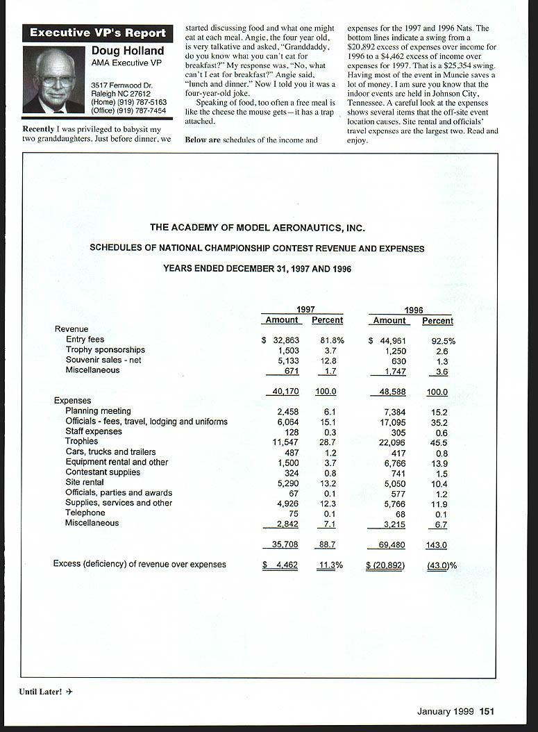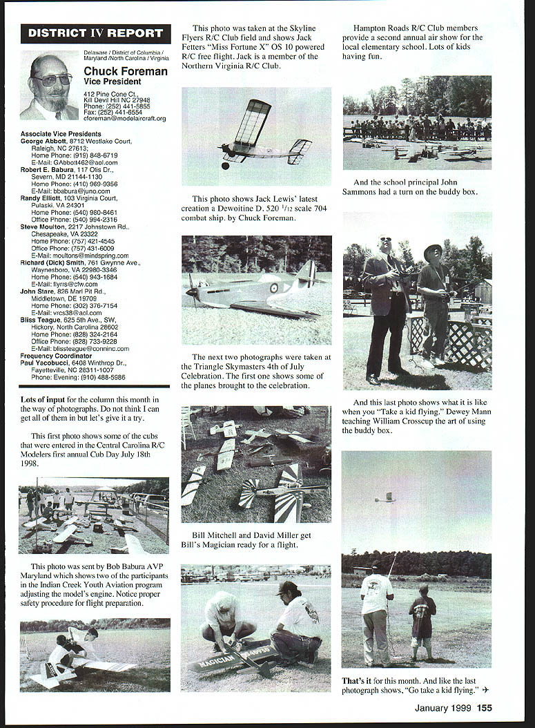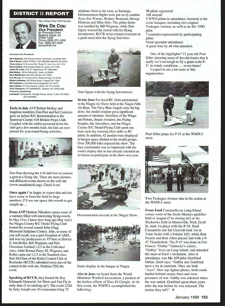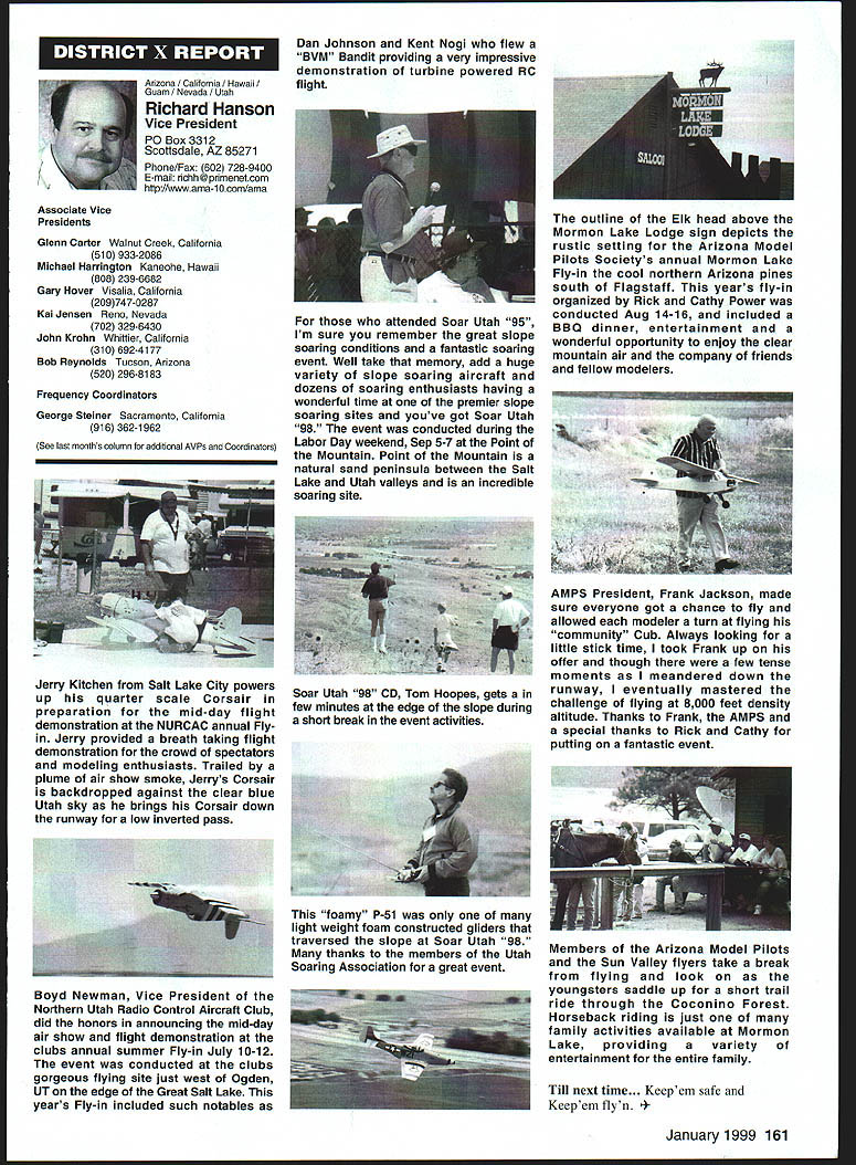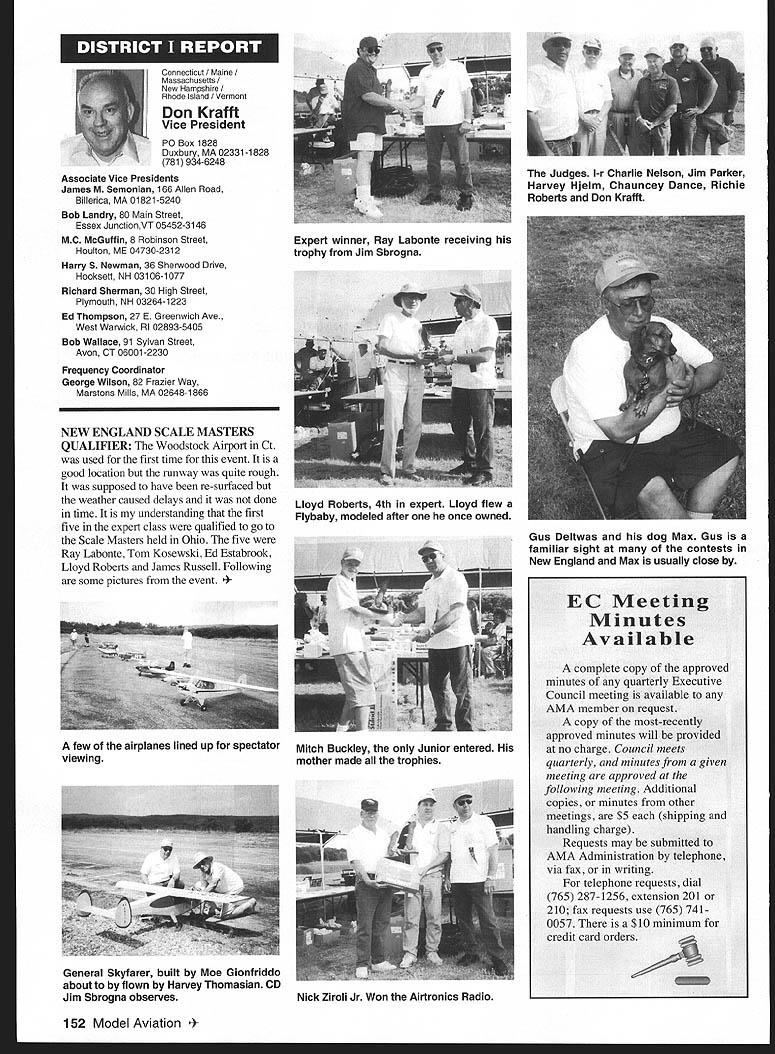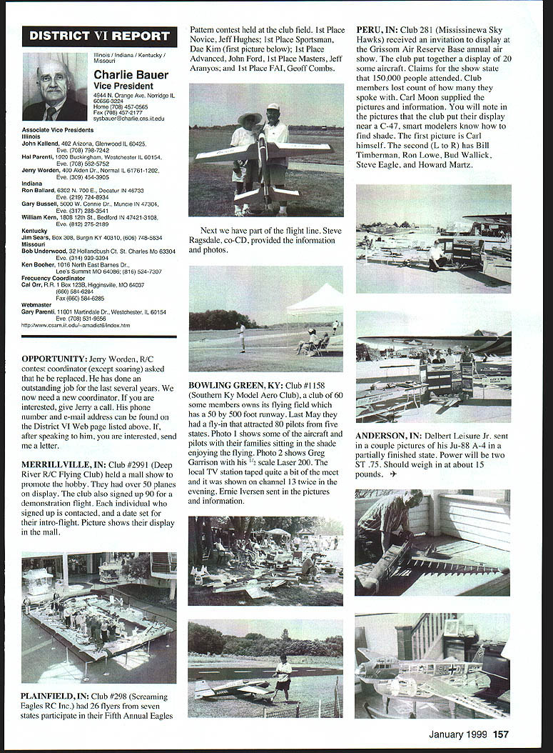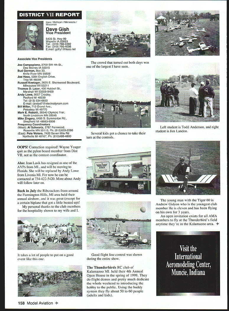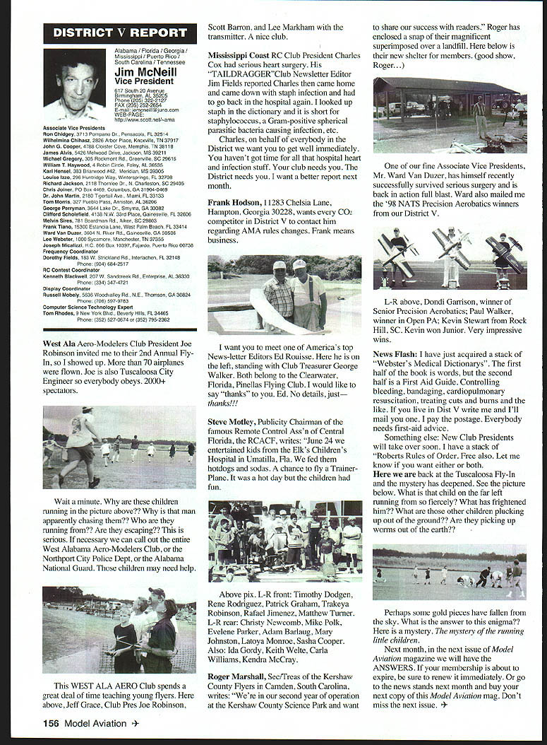 ws View HQ See Page 176 Hall Fame Inductees year 1998 special year Model Aviation Hall Fame Typically five individuals inducted However Year Pioneer climaxed special event held September thirteen deserving modelers added rolls Normally selection committee consists nine AMA Presidents year committee expanded adding Leader Member selected 11 AMA districts Selection Hall Fame honor based service Academy modeling aviation general will discover individuals represent facet hobby/sport including competition administrative support industry thirteen brief biographies follow represent combined total 974 years modeling experience Bob Aberle Bob Aberle Hauppauge New York has enjoyed productive modeling career variety hobby/sport disciplines started 1951 local regional free flight contests now competes RC electric old timer events 28 years has written Flying Models Magazine Included some 2000 pages published material 30 RC designs subjects include designs sport scale racers old-timers etc Numerous articles also graced byline 1985 Bob penned book named Clean QuietA Guide Electric Model Flights publication recognized world wide definitive handbook beginner fast expanding part hobby/sport co-founder Modelair-Tech company dedicated advancement electric powered flight 1980 1983 Bob served chairman AMA Frequency Committee During very important period spearheaded effort led present frequency assignments FCC hoursmany frustrationsmany trips Washington filled time frame cases sheer will determination brought about changes advanced Frequency Committee continues serve Frequency Committee today service has received Howard McEntee award AMA Fellowship Award AMA Distinguished Service Award Bob organized Silent Electric Flyers Long Island Vice President R/C Squadron Jack Albrecht Jack Albrecht Fairfield California began modeling career age 9 San Francisco Using money saved magazine route purchased unassembled Bunch Mighty Midget engine high school 1943 set control line speed records 100-mph range enlisted Army 1944 served South Pacific area Following Army service 1944-1946 continued winning says control line speed Jack attended college studying radio engineering As Army reservist served Korea Following service Jack returned California area became involved radio control 1950s After constructing first hand-held reed system designed Alex Schneider Ed Rockwood Jack began experimenting various other types equipment included up coming digital proportional units such Digicom designed manufactured Don Mathes Doug Spreng over 20 years Jack served member hobby industry association Kraft Systems continued until ceased produce equipment became Customer Relations Manager Airtronics Inc remained until recent retirement 1982 member Frequency Committee Jack assigned task writing staffing plan orderly phase-in 50 aircraft 30 surface frequencies Additionally became responsibility present plan industry still serving AMAs Frequency Committee Jack elected DCRC Club Hall Fame 1975 awarded AMA Distinguished Service Award 1992 added Vintage RC Societys Hall Fame 1994 George Buso George Buso Hyde Park New York has enjoyed aeromodeling almost 65 years early 1930s saw construction Korda type rubber models hand-launched gliders flying contests Syracuse New York area During Navy duty 1946 married high school sweetheart helped chase free flight models 1947 began work control line models designing building Hellcat attended college Having no help him learn fly CL taught himself Ultimately organized club Delhi New York 1952 George made acquaintance Ed Lorenz began experimenting RC ultimately led flying patteru model designed called Configuration III Scale next challenge qualified World Championships did compete lost model five days before event George has very much involved international scale competition scene has served ajudge team manager contest director numerous occasions very important responsibility serving AIVIA s FAI voting delegate 6 years 25 years George produced managed unique Rhinebeck Jamboree event two AMA Superior Service Awards achievement also AMA Fellow having received award 1996 Additional activities included serving Radio Control Contest Board organizing IBM Radio Control Model Club assisting planning Celebration Eagles held 1996 George served years Associate Vice President District II Maxey Hester Maxey Hester Montezuma Iowa brings Hall Fame long history competition activity industry involvement As teenager built flew scores rubberpowered free flight models However World War II interrupted modeling career joined Navy age 17 Following war started both family business finish carpenter Des Moines Iowa until 1953 returned modeling flying control line 1954 discovered RC using single 146 Model Aviation emy Model Aeronautics 5151 East Memorial Drive Muncie IN 47302 channel system designed E Paul Johnson 1958 moved reeds flew until 1965 switched proportional Between 1954 1987 flew hundreds local regional national international events both pattern pylon scale competition credentials include 2nd 3rdand 4th place finishes F4C Scale World Championships list national wins far too lengthy list Maxeys list designs includes over dozen scale pattern sport pylon models Zlin Akroat Ryan STA Komet Citabria few number can still found competition circuit today Maxey served contest director both locally nationally charter member first president Des Moines Modelaires RC Club charter member NMPRA 1967 Maxey became plant manager Sig Manufacturing Co Inc Following death Glen Sigafoose companys founder became Vice President always has hands manager very much involved companys operations active air show pilot full scale circuit along wife Hazel fly Sig air force some seven aircraft include three famous Spacewalkers Maxey very active flying youngsters EAA Young Eagles Program Joe Kovel Joe Kovel Woodhaven New York can boast 72 years model flying competition flying days began 1934 both local national events continues fly today RC version very famous 1935 K