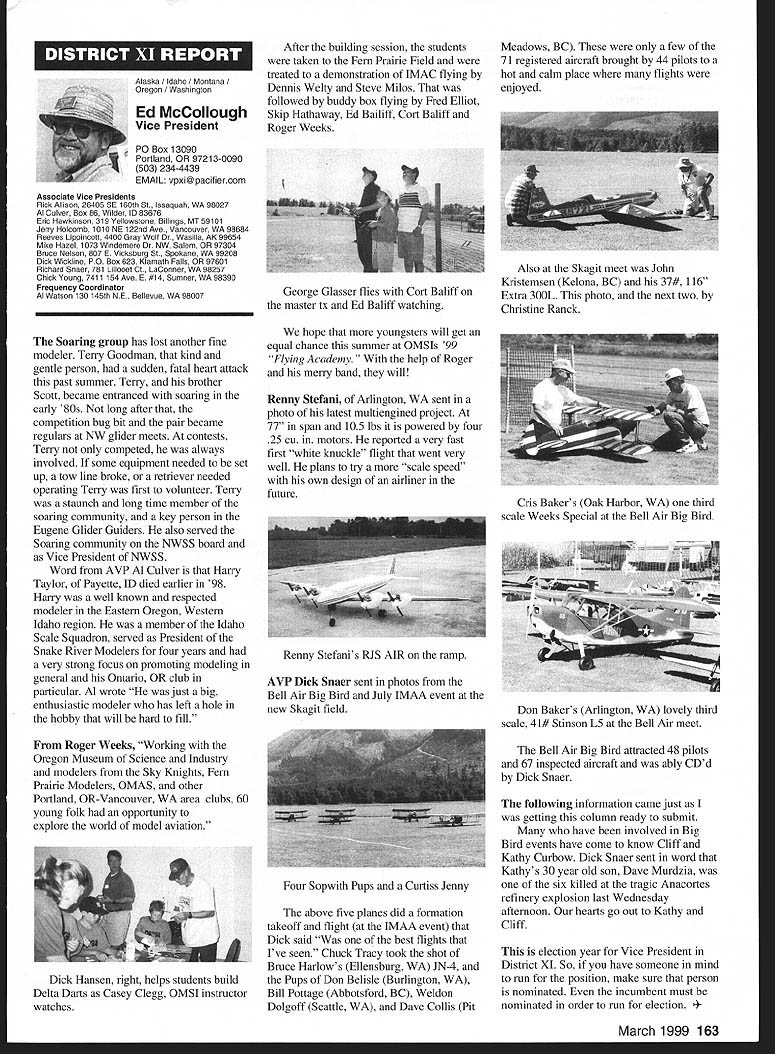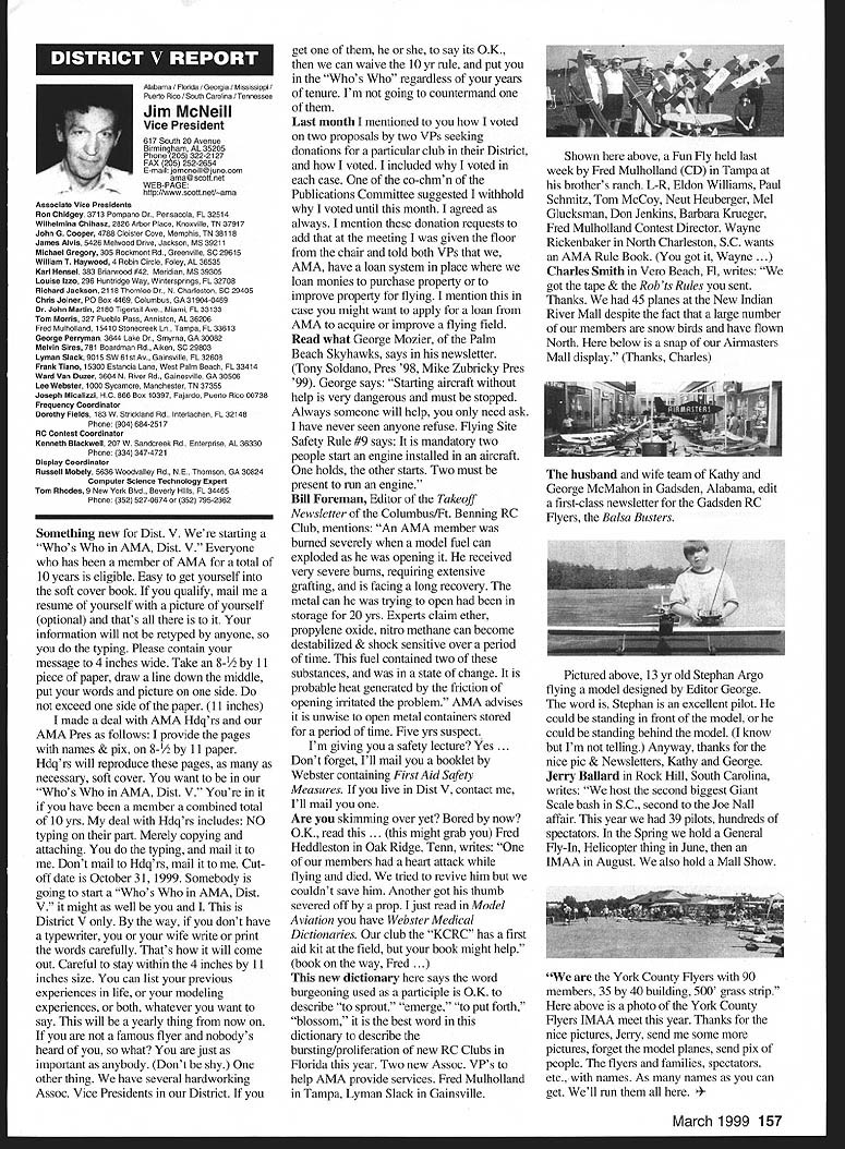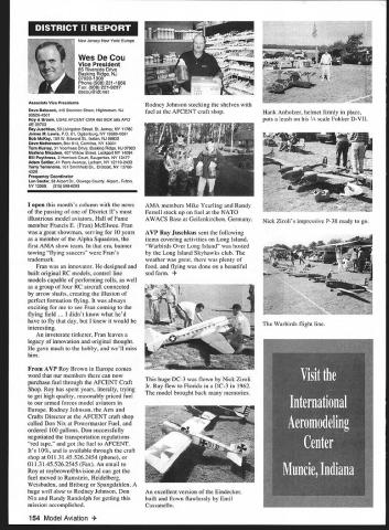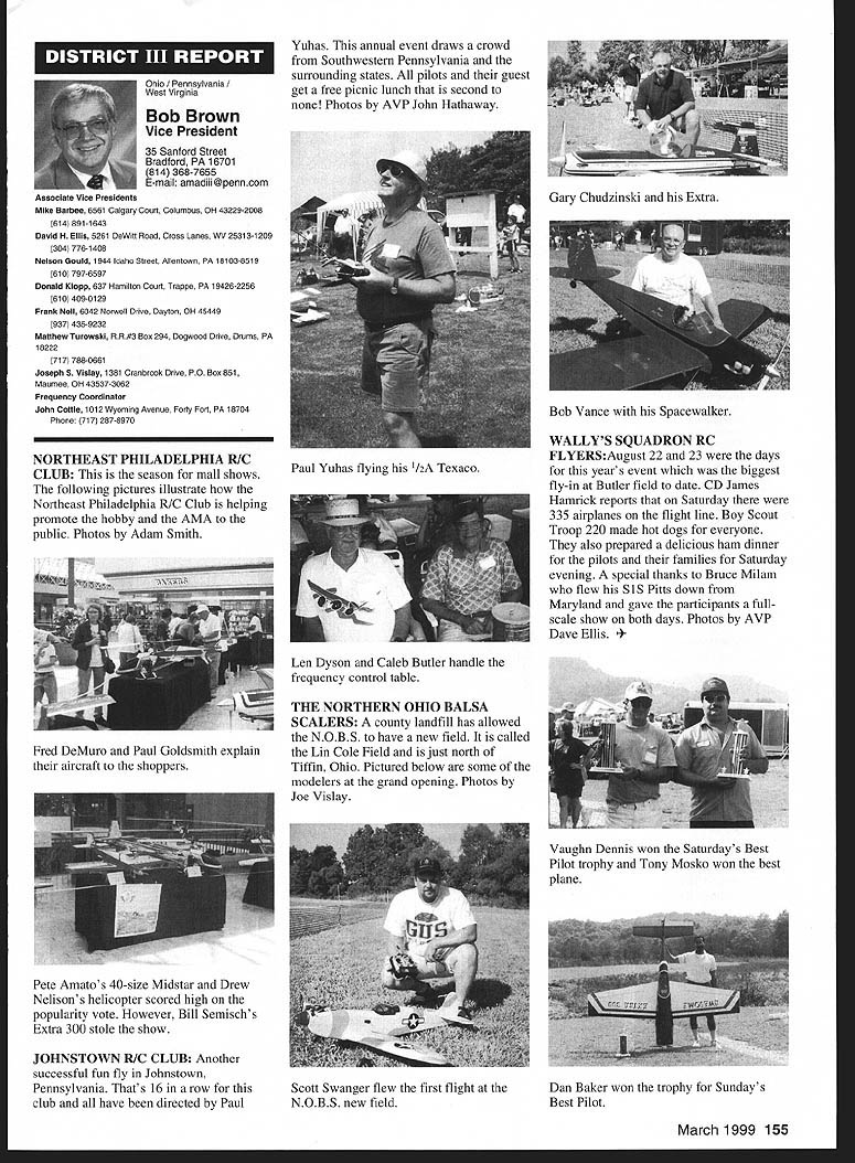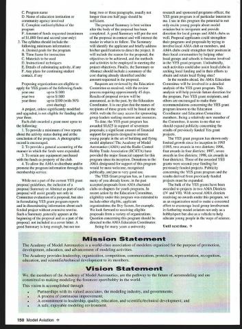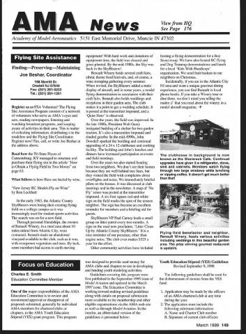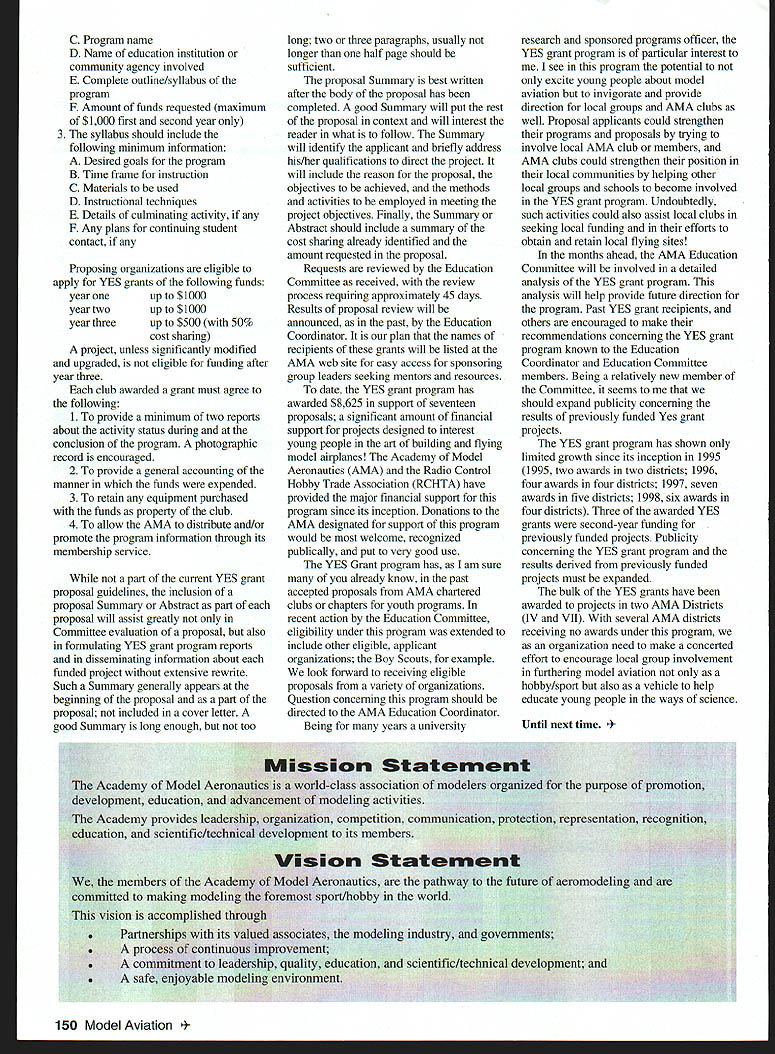 A News Academy Model Aeronautics 5151 East Memorial Drive Muncie IN 47302 View HQ See Page 176 FindingPreservingMaintaining Joe Beshar Coordinator 198 Merritt Dr Oradell NJ 07649 Fax 201 261-0223 Tel 201 261-1281 Register FSA Volunteer Flying Site Assistance Program consists network volunteers serve AMAs eyes ears reading newspapers listening watching broadcast programs keeping aware activities area matter collecting information distributing modelers Flying Site Coordinator Register now Fax call write Joe Beshar address above Read Tri State Flyers Cannonsburg KY managed structure purchase flying site article Obtain Flying Field Two Moves page 63 What follows fliers fueled wine New Jersey RC Models Fly Wine Ron Lockhart early 1983 Atlantic County SkyBlazers losing existing flying field college campus increasingly used student sports activities search new field Through personal friendships owners Renault Winery rural area about 10 miles inland Atlantic City contacted Renault made abandoned vineyard available club such overgrown vegetation trees luck some members access earth moving equipment hard work donations equipment time field cleared grass planted mid-1980s Sky back SkyBlazers Renault Winery holds several craft fairs ethnic theme food festivals course wine stomping gathering summer invited SkyBlazers added static display aircraft some years model flying demonstration association craft fairs Renault also holds weddings receptions garden area club makes point get wedding schedule posted transmitter impound Quiet Hour observed Over years field improved late 1980s President Walt Geary instigated building shelter two garden tractors Its also transmitter impound shaded gazebo mid-1990s John Dowdell sparked building continual upgrading 24 x 12 clubhouse cooking facility building Johns lunches dinners have increased participation events field meetings Over years also started hearing two neighbors dont see homes because well behind tree lines visited field complaints about overflights noise immediately briefed pilots houses discussed club meetings newsletter map No Fly zones posted transmitter impound six-foot square red-and-white sign field marks spot unseen neighbor sign has become excellent reminder members briefing aid guests SkyBlazers VP Paul Camey leads small group litter patrol two months sign road now proclaims Litter Clean Up Atlantic County SkyBlazers nice reminder presence other engine noise club makes $325 year effort Other community activities have included hosting flying demonstration Boy Scout troop have also hosted RC flying Dog Training demonstrations lunch local Kids Handicaps organization send fruit baskets neighbors Christmas Incidentally Atlantic City NJ area want unique gourmet dining experience can find Renault local phone books take Winery tour dine dont mind telling maitre d read about winery model aircraft magazine les E Smith Education Committee Member major responsibilities AMA Education Committee review recommend approval disapproval proposals submitted generally individual AMA members chartered clubs chapters AMA Youth Education Stipend YES grant program program designed provide seed money AMA clubs chapters use developing funding youth modeling activities Guidelines covering program first published September 1995 issue Model Aviation updated March 1997 issue Education Committee working toward making revised guidelines along details proposal submission available membership other eligible organizations via AIvIA web site well through Model Aviation interim abbreviated version guidelines presented below Youth Education Stipend YES Guidelines Revised September 9 1998 following guidelines shall used disbursement monies YES fund I Application may made officers AMA chartered club time during year 2 The application must include following minimum information A Name Charter Club number B Signature current club officers March 1999 149 clubhouse background now known Shamrock Cafe Continual upgrades have given refrigerator stove sink cabinets Members watch flying through two large windows lunching sipping coffee doesnt get much better Flying field benefactor neighbor Renault Winery hosts various activities including weddings beautiful garden area prize winning gourmet restaurant upstairs C Program name D Name education institution community agency involved E Complete outline/syllabus program F Amount funds requested maximum $1000 first second year 3 The syllabus should include following minimum information A Desired goals program B Time frame instruction C Materials used D Instructional techniques E Details culminating activity F Any plans continuing student contact Proposing organizations eligible apply YES grants following funds year oneupto$1000 year twoup $1000 year threeup $500 50% cost sharing project unless significantly modified upgraded eligible funding after year three club awarded grant must agree following 1 provide minimum two reports about activity status during conclusion program photographic record encouraged 2 provide general accounting manner funds expended 3 retain equipment purchased funds property club 4 allow AMA distribute and/or promote program information through its membership service part current YES grant proposal guidelines inclusion proposal Summary Abstract part proposal will assist greatly Committee evaluation proposal also formulating YES grant program reports disseminating information about funded project extensive rewrite Such Summary generally appears beginning proposal part proposal included cover letter good Summary long enough too long two three paragraphs usually longer half page should sufficient proposal Summary best written after body proposal has completed good Summary will put rest proposal context will interest reader what follow Summary will identify applicant briefly address his/her qualifications direct project will include reason proposal objectives achieved methods activities employed meeting project objectives Finally Summ
