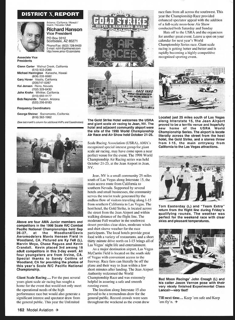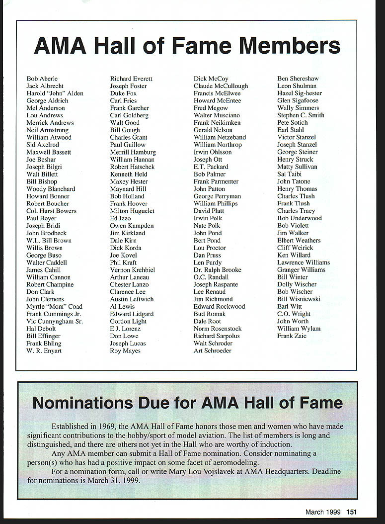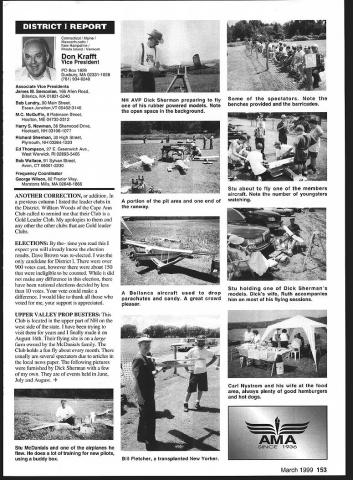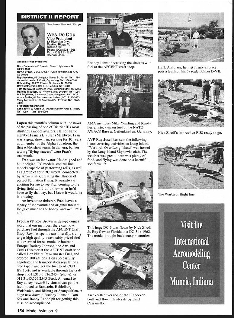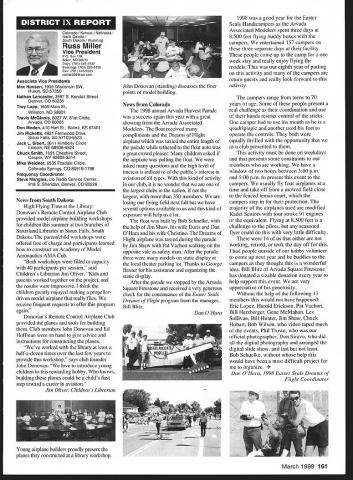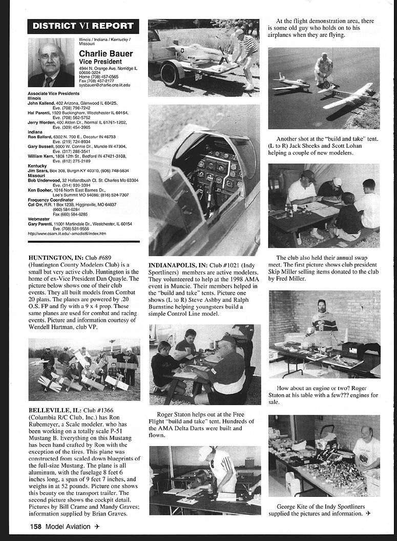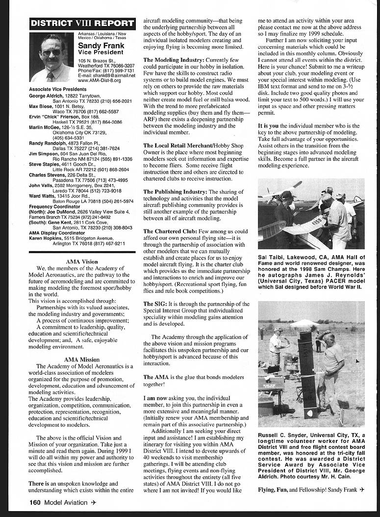 A News Academy Model Aeronautics 5151 East Memorial Drive Muncie IN 47302 View HQ See Page 176 FindingPreservingMaintaining Joe Beshar Coordinator 198 Merritt Dr Oradell NJ 07649 Fax 201 261-0223 Tel 201 261-1281 Register FSA Volunteer Flying Site Assistance Program consists network volunteers serve AMAs eyes ears reading newspapers listening watching broadcast programs keeping aware activities area matter collecting information distributing modelers Flying Site Coordinator Register now Fax call write Joe Beshar address above Read Tri State Flyers Cannonsburg KY managed structure purchase flying site article Obtain Flying Field Two Moves page 63 What follows fliers fueled wine New Jersey RC Models Fly Wine Ron Lockhart early 1983 Atlantic County SkyBlazers losing existing flying field college campus increasingly used student sports activities search new field Through personal friendships owners Renault Winery rural area about 10 miles inland Atlantic City contacted Renault made abandoned vineyard available club such overgrown vegetation trees luck some members access earth moving equipment hard work donations equipment time field cleared grass planted mid-1980s Sky back SkyBlazers Renault Winery holds several craft fairs ethnic theme food festivals course wine stomping gathering summer invited SkyBlazers added static display aircraft some years model flying demonstration association craft fairs Renault also holds weddings receptions garden area club makes point get wedding schedule posted transmitter impound Quiet Hour observed Over years field improved late 1980s President Walt Geary instigated building shelter two garden tractors Its also transmitter impound shaded gazebo mid-1990s John Dowdell sparked building continual upgrading 24 x 12 clubhouse cooking facility building Johns lunches dinners have increased participation events field meetings Over years also started hearing two neighbors dont see homes because well behind tree lines visited field complaints about overflights noise immediately briefed pilots houses discussed club meetings newsletter map No Fly zones posted transmitter impound six-foot square red-and-white sign field marks spot unseen neighbor sign has become excellent reminder members briefing aid guests SkyBlazers VP Paul Camey leads small group litter patrol two months sign road now proclaims Litter Clean Up Atlantic County SkyBlazers nice reminder presence other engine noise club makes $325 year effort Other community activities have included hosting flying demonstration Boy Scout troop have also hosted RC flying Dog Training demonstrations lunch local Kids Handicaps organization send fruit baskets neighbors Christmas Incidentally Atlantic City NJ area want unique gourmet dining experience can find Renault local phone books take Winery tour dine dont mind telling maitre d read about winery model aircraft magazine les E Smith Education Committee Member major responsibilities AMA Education Committee review recommend approval disapproval proposals submitted generally individual AMA members chartered clubs chapters AMA Youth Education Stipend YES grant program program designed provide seed money AMA clubs chapters use developing funding youth modeling activities Guidelines covering program first published September 1995 issue Model Aviation updated March 1997 issue Education Committee working toward making revised guidelines along details proposal submission available membership other eligible organizations via AIvIA web site well through Model Aviation interim abbreviated version guidelines presented below Youth Education Stipend YES Guidelines Revised September 9 1998 following guidelines shall used disbursement monies YES fund I Application may made officers AMA chartered club time during year 2 The application must include following minimum information A Name Charter Club number B Signature current club officers March 1999 149 clubhouse background now known Shamrock Cafe Continual upgrades have given refrigerator stove sink cabinets Members watch flying through two large windows lunching sipping coffee doesnt get much better Flying field benefactor neighbor Renault Winery hosts various activities including weddings beautiful garden area prize winning gourmet restaurant upstairs C Program name D Name education institution community agency involved E Complete outline/syllabus program F Amount funds requested maximum $1000 first second year 3 The syllabus should include following minimum information A Desired goals program B Time frame instruction C Materials used D Instructional techniques E Details culminating activity F Any plans continuing student contact Proposing organizations eligible apply YES grants following funds year oneupto$1000 year twoup $1000 year threeup $500 50% cost sharing project unless significantly modified upgraded eligible funding after year three club awarded grant must agree following 1 provide minimum two reports about activity status during conclusion program photographic record encouraged 2 provide general accounting manner funds expended 3 retain equipment purchased funds property club 4 allow AMA distribute and/or promote program information through its membership service part current YES grant proposal guidelines inclusion proposal Summary Abstract part proposal will assist greatly Committee evaluation proposal also formulating YES grant program reports disseminating information about funded project extensive rewrite Such Summary generally appears beginning proposal part proposal included cover letter good Summary long enough too long two three paragraphs usually longer half page should sufficient proposal Summary best written after body proposal has completed good Summary will put rest proposal context will interest reader what follow Summary will identify applicant briefly address his/her qualifications direct project will include reason proposal objectives achieved methods activities employed meeting project objectives Finally Summ