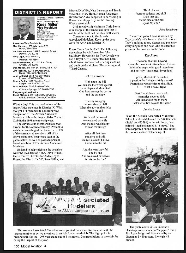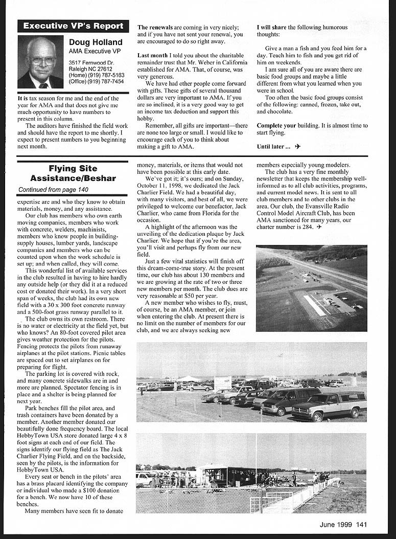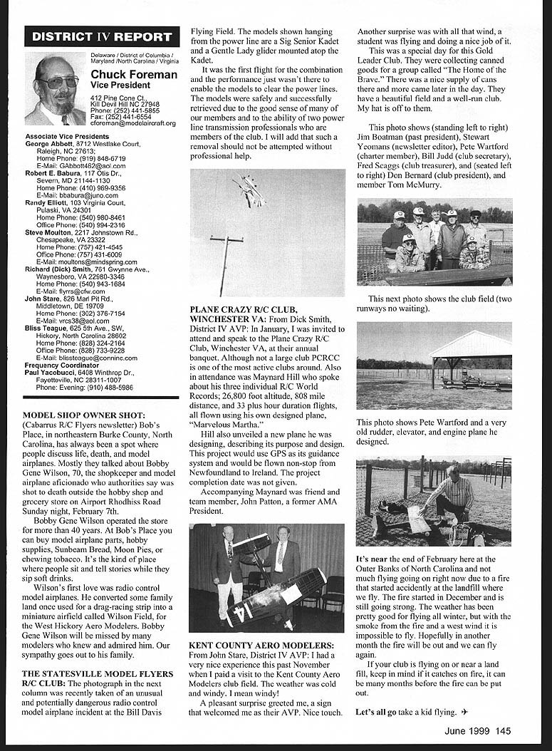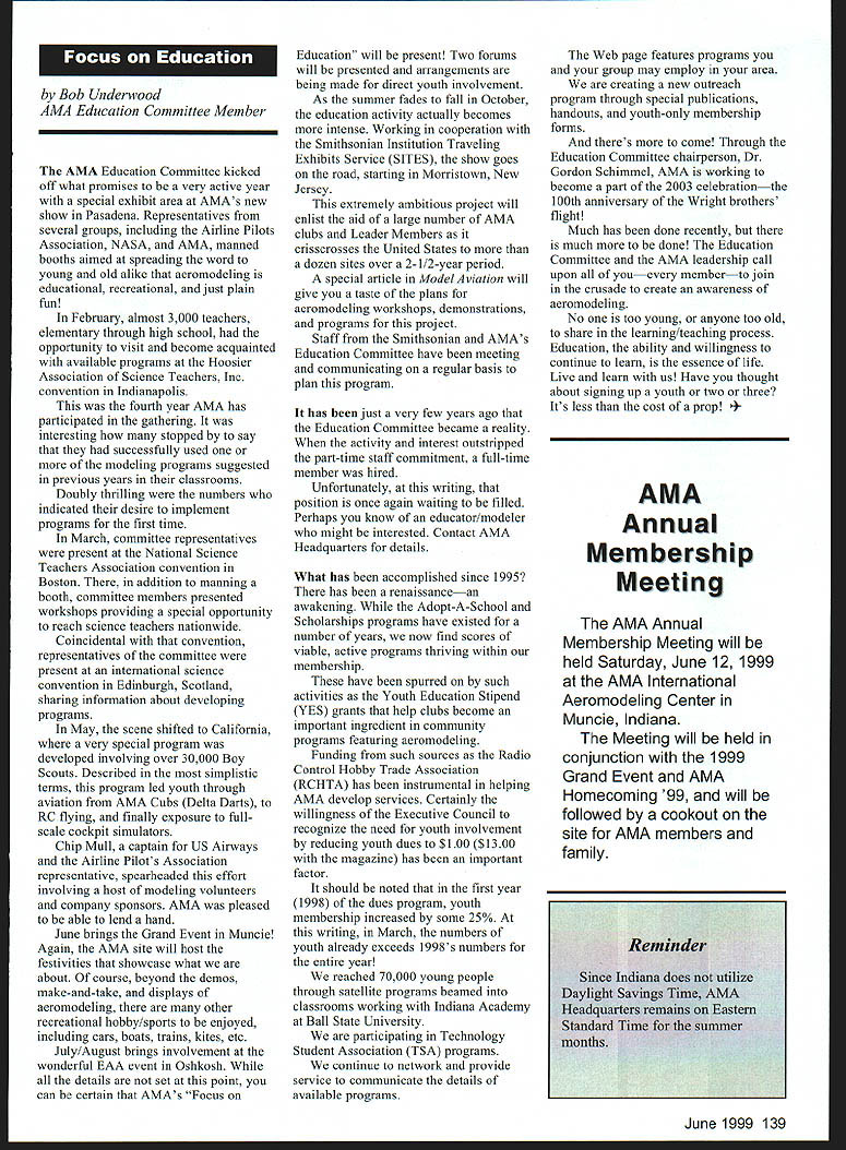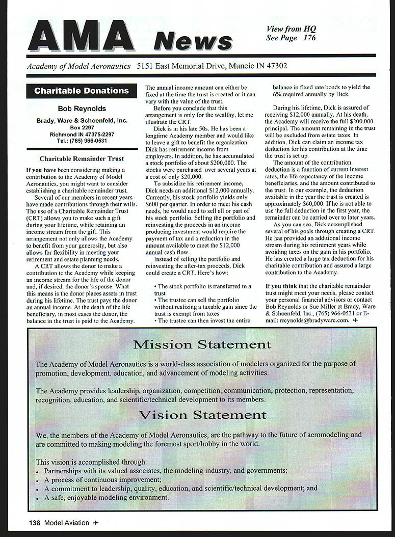 A News View HQ See Page 176 Academy Model Aeronautics 5151 East Memorial Drive Muncie IN 47302 ISls P I 161 LU Bob Reynolds Brady Ware & Schoenfeld Inc Box 2297 Richmond IN 47375-2297 Tel 765 966-0531 Charitable Remainder Trust have considering making contribution Academy Model Aeronautics might want consider establishing charitable remainder trust Several members recent years have made contributions through wills use Charitable Remainder Trust CRT allows make such gift during lifetime retaining income stream gift arrangement allows Academy benefit generosity also allows flexibility meeting retirement estate planning needs CRT allows donor make contribution Academy keeping income stream life donor desired donors spouse What means donor places assets trust during lifetime trust pays donor annual income death life beneficiary cases donor balance trust paid Academy annual income amount can either fixed time trust created can vary value trust Before conclude arrangement wealthy let illustrate CR1 Dick late 50s has longtime Academy member would like leave gift benefit organization Dick has retirement income employers addition has accumulated stock portfolio about $200000 stocks purchased over several years cost $20000 subsidize retirement income Dick needs additional $12000 annually Currently stock portfolio yields $600 per quarter order meet cash needs would need sell part stock portfolio Selling portfolio reinvesting proceeds income producing investment would require payment tax reduction amount available meet $12000 annual cash flow Instead selling portfolio reinvesting after-tax proceeds Dick could create CRT Heres balance fixed rate bonds yield 6% required annually Dick During lifetime Dick assured receiving $12000 annually death Academy will receive full $200000 principal amount remaining trust will excluded estate taxes addition Dick can claim income tax deduction contribution time trust set up amount contribution deduction function current interest rates life expectancy income beneficiaries amount contributed trust example deduction available year trust created approximately $60000 able use full deduction first year remainder can carried over later years As can see Dick accomplished several goals through creating CRT has provided additional income stream during retirement years avoiding taxes gain portfolio has created large tax deduction charitable contribution assured large contribution Academy stock portfolio transferred a If think charitable remainder trust trust might meet needs please contact trustee can sell portfolio your personal financial advisors contact realizing taxable gain since Bob Reynolds Sue Miller Brady Ware trust exempt taxes & Schoenfeld Inc 765 966-0531 FThe trustee can invest entire mail rreynolds@bradywarecom * 138 Model Aviation 4 I4 IkE] U e II U1 Turn Bob Underwood AMA Education Committee Member AMA Education Committee kicked off what promises very active year special exhibit area AMAs new show Pasadena Representatives several groups including Airline Pilots Association NASA AMA manned booths aimed spreading word young old alike aeromodeling educational recreational just plain fun Fehruary almost 3000 teachers elementary through high school opportunity visit become acquainted available programs Hoosier Association Science Teachers Inc convention Indianapolis fourth year AMA has participated gathering interesting stopped say successfully used modeling programs suggested previous years classrooms Doubly thrilling numbers indicated desire implement programs first time March committee representatives present National Science Teachers Association convention Boston addition manning booth committee members presented workshops providing special opportunity reach science teachers nationwide Coincidental convention representatives committee present international science convention Edinburgh Scotland sharing information about developing programs May scene shifted California very special program developed involving over 30000 Boy Scouts Described simplistic terms program led youth through aviation AMA Cubs Delta Darts RC flying finally exposure fullscale cockpit simulators Chip Mull captain US Airways Airline Pilots Association representative spearheaded effort involving host modeling volunteers company sponsors AMA pleased able lend hand June brings Grand Event Muncie Again AMA site will host festivities showcase what about course beyond demos make-and-take displays aeromodeling other recreational hobby/sports enjoyed including cars boats trains kites etc July/August brings involvement wonderful EAA event Oshkosh details set point can certain AMAs Focus Education will present Two forums will presented arrangements being made direct youth involvement As summer fades fall October education activity actually becomes intense Working cooperation Smithsonian Institution Traveling Exhibits Service SITES show goes road starting Morristown New Jersey extremely ambitious project will enlist aid large number AMA clubs Leader Members crisscrosses United States dozen sites over 2-1/2-year period special article Model Aviation will give taste plans aeromodeling workshops demonstrations programs project Staff Smithsonian AMAs Education Committee have meeting communicating regular basis plan program has just very few years ago Education Committee became reality activity interest outstripped part-time staff commitment full-time member hired Unfortunately writing position once again waiting filled Perhaps know educator/modeler might interested Contact AMA Headquarters details What has accomplished since 1995 has renaissancean awakening Adopt-A-School Scholarships programs have existed number years now find scores viable active programs thriving within membership have spurred such activities Youth Education Stipend YES grants help clubs become important ingredient community programs featuring aeromodeling Funding such sources Radio Control Hobby Trade Association RCHTA has instrumental 