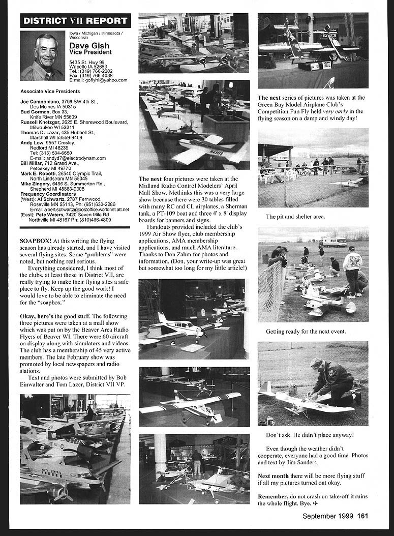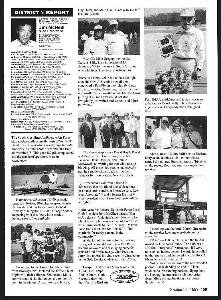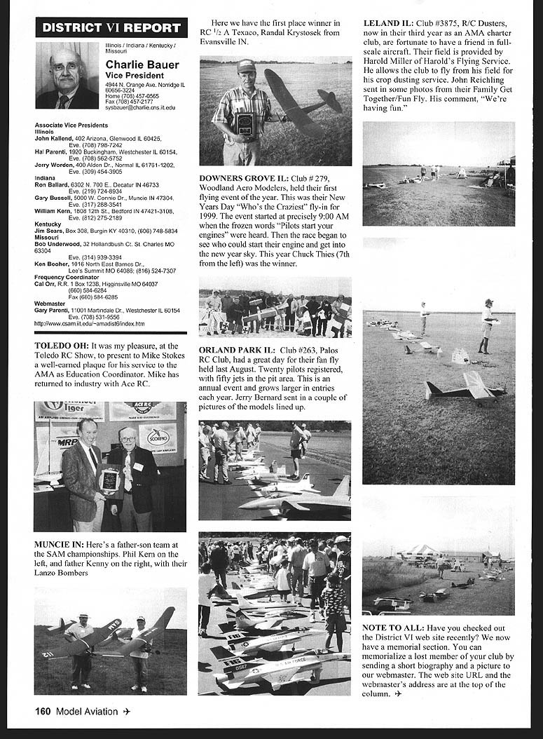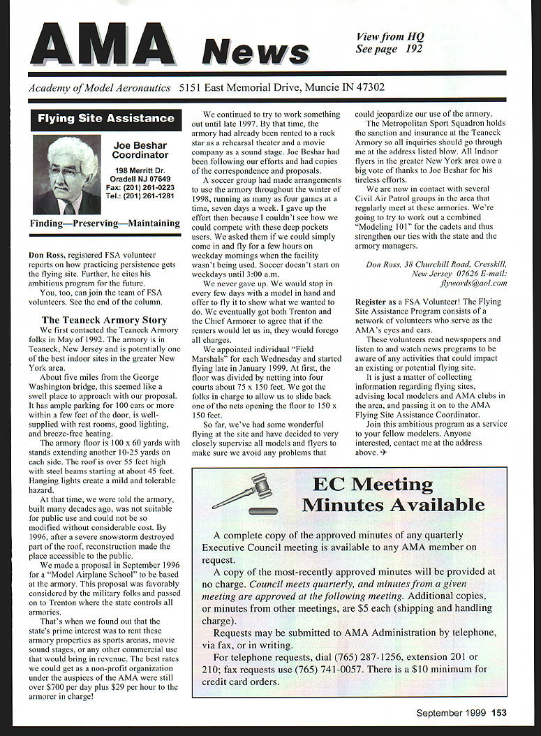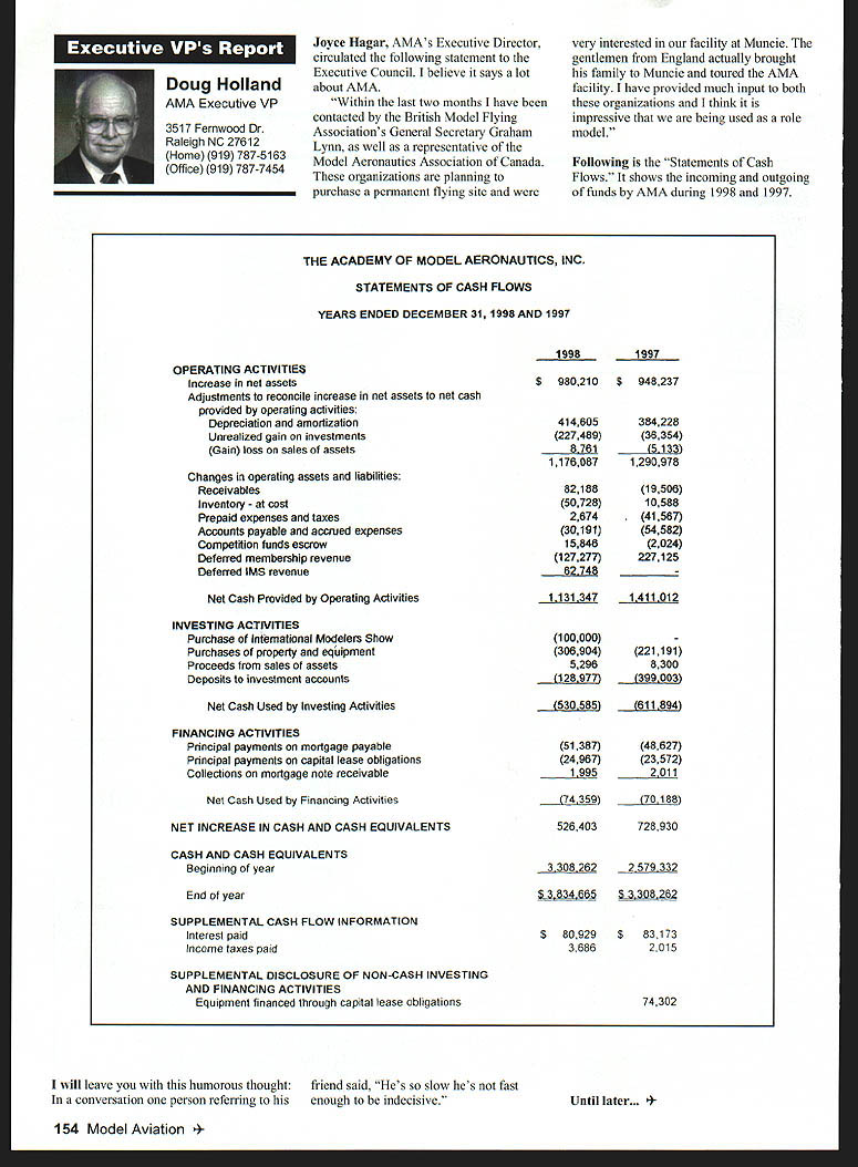 Mews View HQ Seepage 192 Academy Model Aeronautics 5151 East Memorial Drive Muncie IN 47302 E11 it1 miem Joe Beshar Coordinator 198 Merritt Dr Oradell NJ 07649 Fax 201 261-0223 Tel 201 261-1281 FindingPreservingMaintaining Don Ross registered FSA volunteer reports practicing persistence gets flying site Further cites ambitious program future too can join team FSA volunteers See end column Teaneck Armory Story first contacted Teaneck Armory folks May 1992 armory Teaneck New Jersey potentially best indoor sites greater New York area About five miles George Washington bridge seemed like swell place approach proposal has ample parking 100 cars within few feet door wellsupplied rest rooms good lighting breeze-free heating armory floor 100 x 60 yards stands extending another 10-25 yards side roof over 55 feet high steel beams starting about 45 feet Hanging lights create mild tolerable hazard time told armory built decades ago suitable public use could modified considerable cost 1996 after severe snowstorm destroyed part roof reconstruction made place accessible public made proposal September 1996 Model Airplane School based armory proposal favorably considered military folks passed Trenton state controls armories Thats found out states prime interest rent armory properties sports arenas movie sound stages other commercial use would bring revenue best rates could get non-profit organization under auspices AMA still over $700 per day plus $29 per hour armorer charge continued try work something could jeopardize use armory out until late 1997 time opolitan Sport Squadron holds armory already rented rockthe sanction insurance Teaneck star rehearsal theater movieArmory inquiries should go through company sound stage Joe Beshar hadme address listed blow Indoor following efforts copiesflyers greater New York area owe correspondence proposalsbig vote thanks Joe Beshar soccer group made arrangementstireless efforts use armory throughout winter contact several 1998 running four games aCivil Air Patrol groups area time seven days week gave up theregularly meet armories effort because couldnt see wegoing try work out combined could compete deep pocketsModeling 101 cadets thus users asked could simplystrengthen ties state come fly few hours onarmory managers weekday mornings facility wasnt being used Soccer doesnt start Ross 38 Churchill Road Cresskill weekdays until 300 am ew Jersey 07626 E-mail never gave up would stop lywords@aolcom few days model hand offer fly show what wanted toRegister FSA Volunteer Flying eventually got both Trenton andSite Assistance Program consists Chief Armorer agree thenetwork volunteers serve renters would let us would foregoAMAs eyes ears charges nteers read newspapers appointed individual Fieldlisten watch news programs Marshals Wednesday startedaware activities could impact flying late January 1999 first thean existing potential flying site floor divided netting four matter collecting courts about 75 x 150 feet got theinformation regarding flying sites folks charge allow us slide backadvising local modelers AMA clubs nets opening floor 150 xthe area passing AMA 150 feetFlying Site Assistance Coordinator So far weve some wonderful ambitious program service flying site have decided veryto fellow modelers Anyone closely supervise models flyers tointerested contact address make sure avoid problems thatabove ember 1999 153 EC Meeting Minutes Available complete copy approved minutes quarterly Executive Council meeting available AMA member request copy most-recently approved minutes will provided no charge Council meets quarterly minutes given meeting approved following meeting Additional copies minutes other meetings $5 shipping handling charge Requests may submitted AMA Administration telephone via fax writing telephone requests dial 765 287-1256 extension 201 210 fax requests use 765 741-0057 $10 minimum credit card orders -9t 4O4IiITT~A ejgU Doug Holland AMA Executive VP 3517 Fernwood Dr Raleigh NC 27612 Home 919 787-5163 Office 919 787-7454 Joyce Hagar AMAs Executive Director circulated following statement Executive Council believe says lot about AMA Within last two months have contacted British Model Flying Associations General Secretary Graham Lynn well representative Model Aeronautics Association Canada organizations planning purchase permanent flying site very interested facility Muncie gentlemen England actually brought family Muncie toured AMA facility have provided much input both organizations think impressive being used role model Following Statements Cash Flows shows incoming outgoing funds AMA during 1998 1997 THE ACADEMY OF MODEL AERONAUTICS INC STATEMENTS OF CASH FLOWS YEARS ENDED DECEMBER 31 1998 AND 1997 OPERATING ACTIVITIES Increase net assets Adjustments reconcile increase net assets net cash provided operating activities Depreciation amortization Unrealized gain investments Gain loss sales assets Changes operating assets liabilities Receivables Inventory cost Prepaid expenses taxes Accounts payable accrued expenses Competition funds escrow Deferred membership revenue Deferred IMS revenue Net Cash Provided Operating Activities INVESTING ACTIVITIES Purchase Infemational Modelers Show Purchases property equipment Proceeds sales assets Deposits investment accounts___________ Net Cash Used Investing Activities__________ FINANCING ACTIVITIES Principal payments mortgage payable Principal payments capital lease obligations Collections mortgage note receivable Net Cash Used Financing Activities NET INCREASE IN CASH AND CASH EQUIVALENTS 1998 $ 980210 414605 227489 1176087 82188 50728 2674 30191 15848 127277 jit7 100000 306904 5296 128977 530585 51387 24967 ilZ49 526403 CASH AND CASH EQUIVALENTS Beginning year End year SUPPLEMENTAL CASH FLOW INFORMATION Interest paid Income taxes paid SUPPLEMENTAL DISCLOSURE OF NON-CASH INVESTING AND FINANCING ACTIVITIES Equipment financed through capital lease obligations $ 80929 3686 33082622 579332 $83173 2015 74302 will leave humo