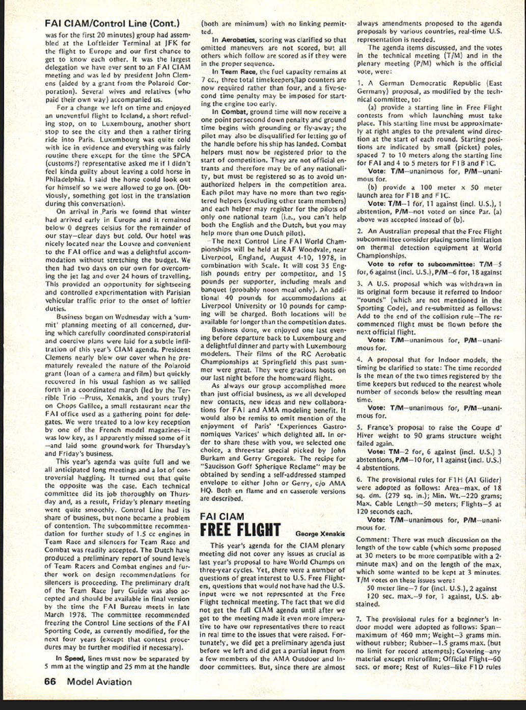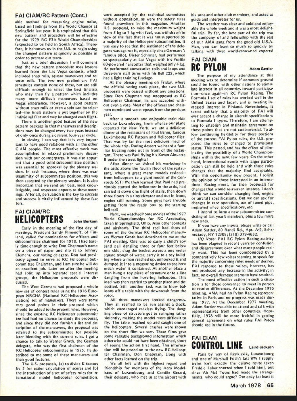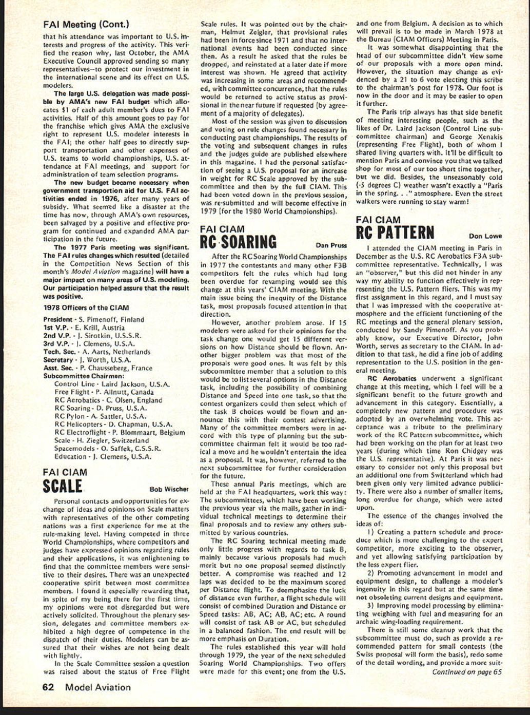 From AMA HQ Executive Director including reports AMA President Vice-Presidents L GENERAL largest gathering history featured annual Federation Aeronautique Interna tionale FAI meeting Paris December 1 2 58 representatives 29 countries present technical plenary meet ings Committee International Aero Modeling ClAM worked harmoniously dispose 37-page agenda record time Very little controversy prevailed despite some significant new developments several areas Practically proposals USA either adopted tabled future conside ration meetings major achievement ap proval new FAI Sporting Code 19791983 provision flexible section accommodate certain types changes annual basis general items affecting model specifications aircraft size engines equipment etc frozen during four-year rule book period items world championships procedure such RC maneuvers number flights engine noise measurement etc will subject change accordance lessons problems world championships other major contest experience new arrangement expected good compromise between unlimited nual FAI changes past years until 70s unreasonable excessive freezing rules changes recent years Expected approved printing mid-year 1979 Sporting Code will available via Na tional Aero Clubs AMA USAI end 1978 USA delegation largest ever ten official positions group went meeting six elected representatives several members subcommittees proxies same After meeting another 18 HATS PROBABLE FOR LAKE CHARLES final decision will made Jan uary 28 meeting AMAs Executive Council preliminary indications favor return Lake Charles Louisiana next Na tional Model Airplane Championships development proceeds likely dates will July 30August 6 recent evaluation AMA officers Lake Charles vs other possibilities factors favor Louisiana site terms availability size accommodations keeping activity same airfield Lake Charles clearly ahead Especially area Free Flighta perennial Nats prob lem due space requirementsLake Charles currently available acceptable site Two other locations intensively stud ied Ohio several sites explored New Jersey Lakehurst area got major consideration possibilities se vere Free Flight problem Lakehurst newly discovered potential FF site deter mined too small unable accom modate large numbers cars people Ohio previously used 76 Nats Spring field airport expected have major re pairs done main runway 78 like wise previous Indoor site due re pair work would preclude its availability other reasonsincluding key problems accommodations Ohio New Jersey sites dropped 1978 consideration Ohio situation may favorable 79 will watched closely during 78 possibility meantime tome other strong points favor Lake Charles 1 Freedom AMA would have maximum leeway use airfield facilities 2 Hours Available Flying possible dawn dusk noise complaint problems restrictions due conflict other users property 3 Accommodations Camping field 74 75 will probably pos sible again Also low cost air-conditioned dormitories expected available again 4 Size much larger usual Nats Free Flight area except Riverside Califor nia 77 An RC area able accommodate flight circles necessary Comment 1975 Nats Lake Charles happy event participants indicated nearest Nats old terms fun atmosphere broke financially contrast defi cit involving thousands dollars last Nats Lake Charles relatively cen tral details final decision will reported next issue publication elected position added Dan Pruss re gained former officership Chairman RC Soaring Committee Thus USA group ended up seven out 17 elected positions FAIs ClAM Committee International Aero Modeling complete 1978 lineup FAI positions listed end report Paris meetings began under cloud due late delivery agenda normally mailed countries October compilation proposals received FAI during months previous pro posals sent FAI mid-Septem ber year official agenda did ar rive USA until day before Thanks giving just before US representatives depart Europe Some delegates other countries didnt get agenda until got Paris Under situation almost no time circulation agenda information key individuals groups around coun try get inputs guidance US voting meetings Fortunately however AMA got unofficial copy several days fore official arrived Paris Copies pertinent parts immediately made AMA rushed various spe cial interest groups followed up phone calls members groups help guide US delegation frantic people went overseas useful formation gathered manner Paris meetings could have challenged countries chosen legal right since obligated accept decisions produced result inadequte advance information However no challenge dele gates worked together minimum contro versy As result lot business accom plished less time usual first time years AMA individual representation attendance interests required eight specialists Laird JacksonControl Line George XenakisFree Flight Bob WischerScale Don LoweRC Aerobatics Dan PrussRC Soaring Adam SattlerRC Pylon John BurkamRC Heli copters Jerry GregorekSpacemodels Two others also participated AMA Pres ident Johnny Clemens attended US voting delegate 3rd Vice-President ClAM Chairman Information Education Subcommittee AMA Execu tive Director John Worth attended ClAM Secretary Reports US participants cluded issue has acknowledged March 1978 61 ACADEMY OF MODEL AERONAUTICS 1 815 Fifteenth Street NW Washington DC 20005 Worlds Largest Sport Aviation Organization 1971 ANNUAL FAI MEETING FAI Meeting Cant attendance important US hi terests progress activity veri fied reason last October AMA Executive Council approved sending representativesto protect investment international scene its effect US modelers large US delegation made possi ble AMAs new FAI budget allo cates $1 adult members dues FAI activities Half amount goes pay franchise gives AMA exclusive right represent US modeler interests FAI other half goes directly sup port transportation other expenses US teams world championships US tendance FAI meetings support administration team selection programs new budg