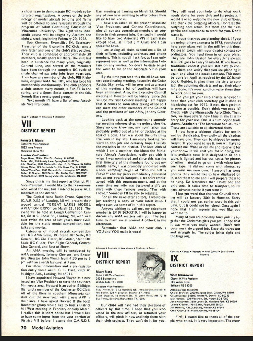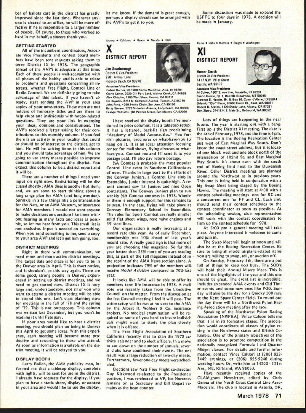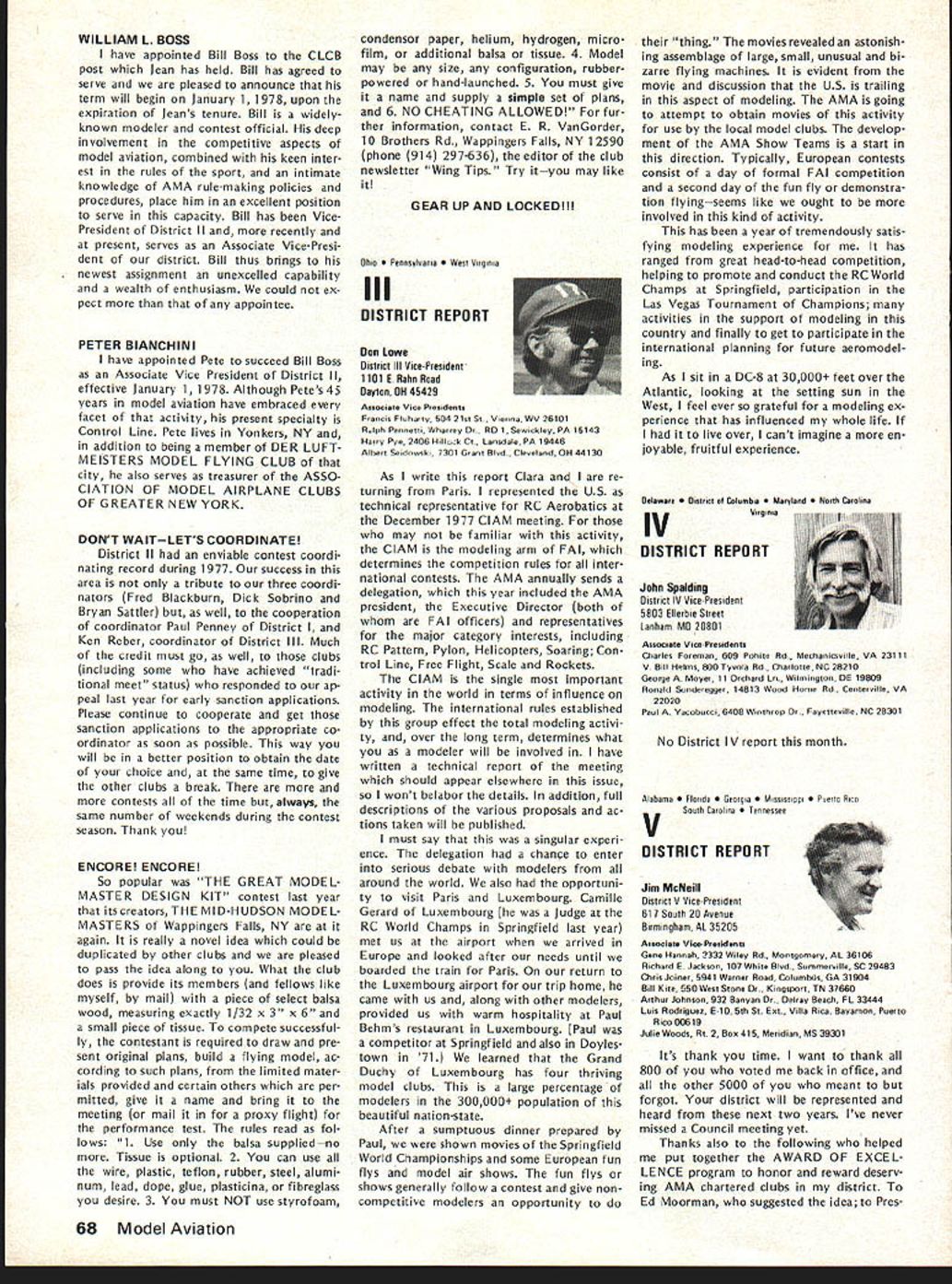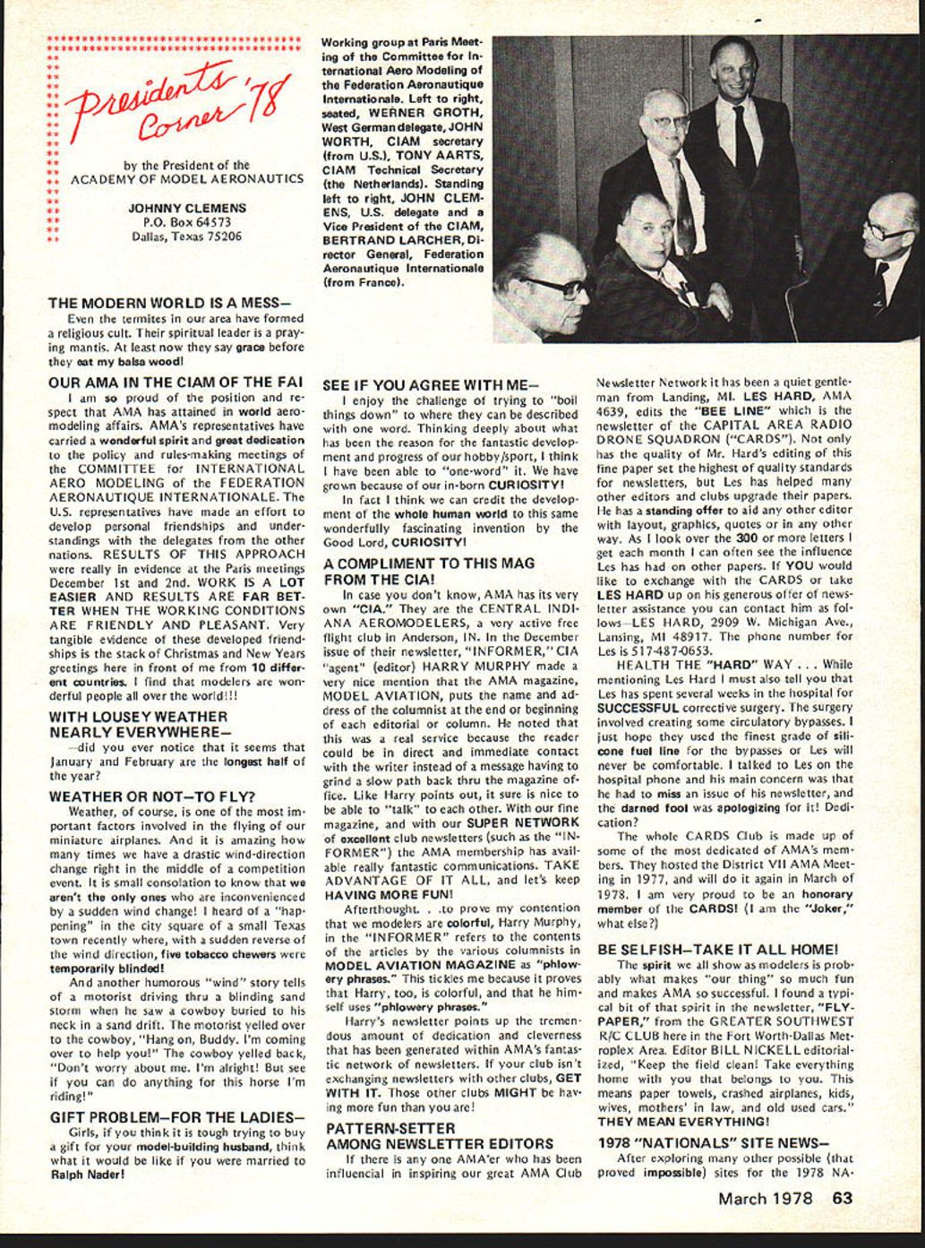 From AMA HQ Executive Director including reports AMA President Vice-Presidents L GENERAL largest gathering history featured annual Federation Aeronautique Interna tionale FAI meeting Paris December 1 2 58 representatives 29 countries present technical plenary meet ings Committee International Aero Modeling ClAM worked harmoniously dispose 37-page agenda record time Very little controversy prevailed despite some significant new developments several areas Practically proposals USA either adopted tabled future conside ration meetings major achievement ap proval new FAI Sporting Code 19791983 provision flexible section accommodate certain types changes annual basis general items affecting model specifications aircraft size engines equipment etc frozen during four-year rule book period items world championships procedure such RC maneuvers number flights engine noise measurement etc will subject change accordance lessons problems world championships other major contest experience new arrangement expected good compromise between unlimited nual FAI changes past years until 70s unreasonable excessive freezing rules changes recent years Expected approved printing mid-year 1979 Sporting Code will available via Na tional Aero Clubs AMA USAI end 1978 USA delegation largest ever ten official positions group went meeting six elected representatives several members subcommittees proxies same After meeting another 18 HATS PROBABLE FOR LAKE CHARLES final decision will made Jan uary 28 meeting AMAs Executive Council preliminary indications favor return Lake Charles Louisiana next Na tional Model Airplane Championships development proceeds likely dates will July 30August 6 recent evaluation AMA officers Lake Charles vs other possibilities factors favor Louisiana site terms availability size accommodations keeping activity same airfield Lake Charles clearly ahead Especially area Free Flighta perennial Nats prob lem due space requirementsLake Charles currently available acceptable site Two other locations intensively stud ied Ohio several sites explored New Jersey Lakehurst area got major consideration possibilities se vere Free Flight problem Lakehurst newly discovered potential FF site deter mined too small unable accom modate large numbers cars people Ohio previously used 76 Nats Spring field airport expected have major re pairs done main runway 78 like wise previous Indoor site due re pair work would preclude its availability other reasonsincluding key problems accommodations Ohio New Jersey sites dropped 1978 consideration Ohio situation may favorable 79 will watched closely during 78 possibility meantime tome other strong points favor Lake Charles 1 Freedom AMA would have maximum leeway use airfield facilities 2 Hours Available Flying possible dawn dusk noise complaint problems restrictions due conflict other users property 3 Accommodations Camping field 74 75 will probably pos sible again Also low cost air-conditioned dormitories expected available again 4 Size much larger usual Nats Free Flight area except Riverside Califor nia 77 An RC area able accommodate flight circles necessary Comment 1975 Nats Lake Charles happy event participants indicated nearest Nats old terms fun atmosphere broke financially contrast defi cit involving thousands dollars last Nats Lake Charles relatively cen tral details final decision will reported next issue publication elected position added Dan Pruss re gained former officership Chairman RC Soaring Committee Thus USA group ended up seven out 17 elected positions FAIs ClAM Committee International Aero Modeling complete 1978 lineup FAI positions listed end report Paris meetings began under cloud due late delivery agenda normally mailed countries October compilation proposals received FAI during months previous pro posals sent FAI mid-Septem ber year official agenda did ar rive USA until day before Thanks giving just before US representatives depart Europe Some delegates other countries didnt get agenda until got Paris Under situation almost no time circulation agenda information key individuals groups around coun try get inputs guidance US voting meetings Fortunately however AMA got unofficial copy several days fore official arrived Paris Copies pertinent parts immediately made AMA rushed various spe cial interest groups followed up phone calls members groups help guide US delegation frantic people went overseas useful formation gathered manner Paris meetings could have challenged countries chosen legal right since obligated accept decisions produced result inadequte advance information However no challenge dele gates worked together minimum contro versy As result lot business accom plished less time usual first time years AMA individual representation attendance interests required eight specialists Laird JacksonControl Line George XenakisFree Flight Bob WischerScale Don LoweRC Aerobatics Dan PrussRC Soaring Adam SattlerRC Pylon John BurkamRC Heli copters Jerry GregorekSpacemodels Two others also participated AMA Pres ident Johnny Clemens attended US voting delegate 3rd Vice-President ClAM Chairman Information Education Subcommittee AMA Execu tive Director John Worth attended ClAM Secretary Reports US participants cluded issue has acknowledged March 1978 61 ACADEMY OF MODEL AERONAUTICS 1 815 Fifteenth Street NW Washington DC 20005 Worlds Largest Sport Aviation Organization 1971 ANNUAL FAI MEETING FAI Meeting Cant attendance important US hi terests progress activity veri fied reason last October AMA Executive Council approved sending representativesto protect investment international scene its effect US modelers large US delegation made possi ble AMAs new FAI budget allo cates $1 adult members dues FAI activities Half amount goes pay franchise gives AMA exclusive right represent US modeler interests FAI other half goes directly sup port transportation other expenses US teams world championships US tendance FAI meetings support administration team selection programs new budg