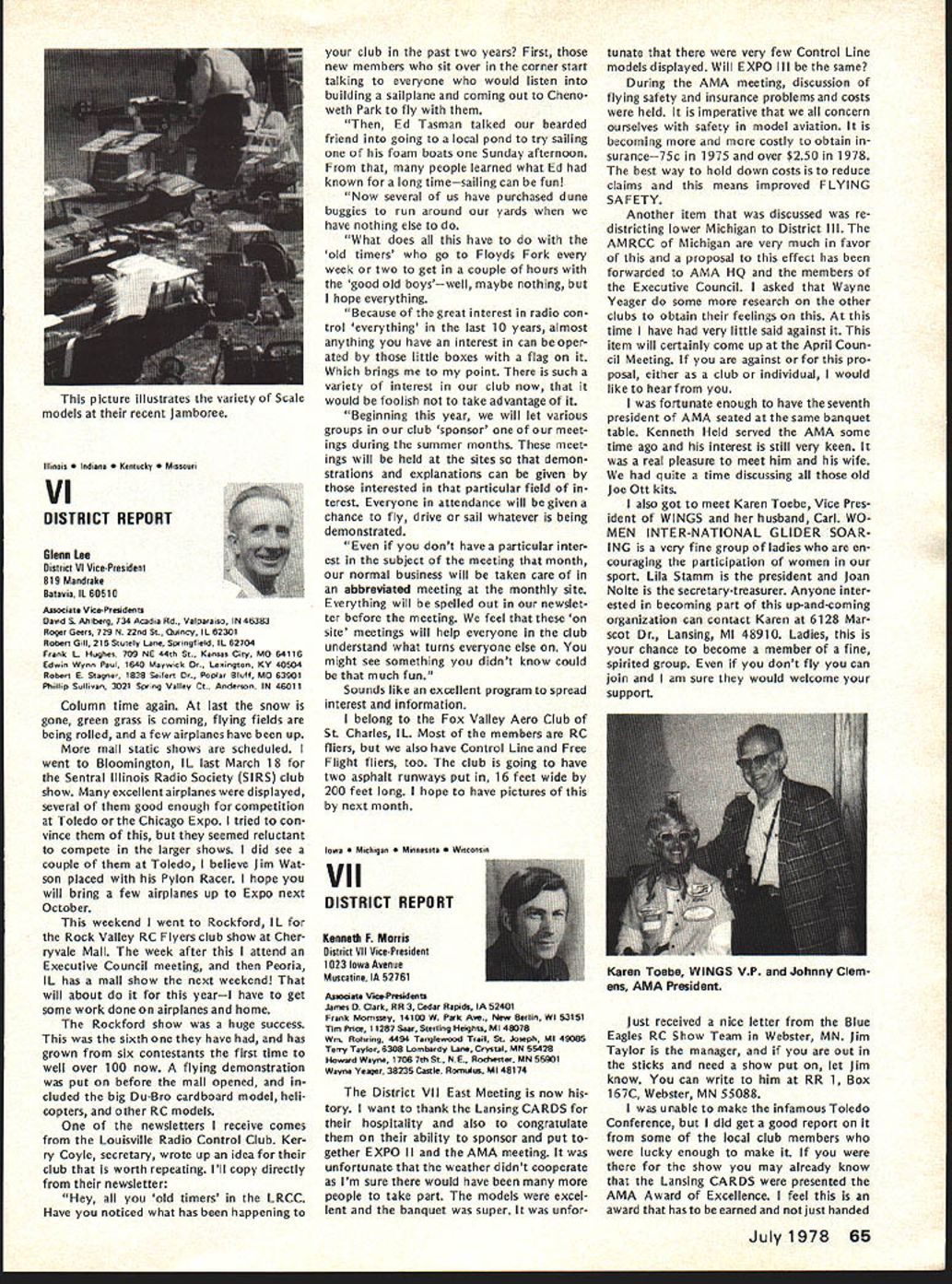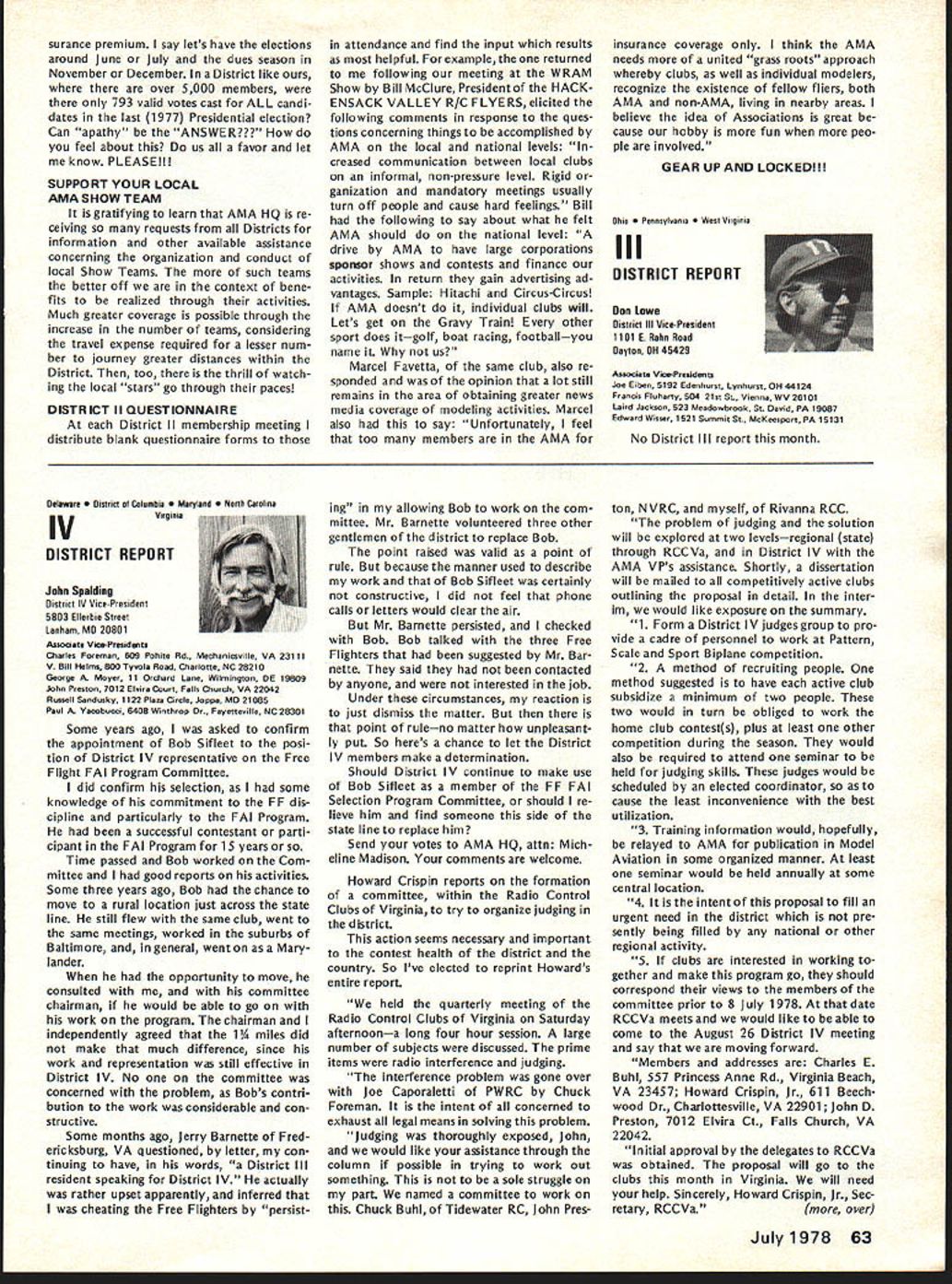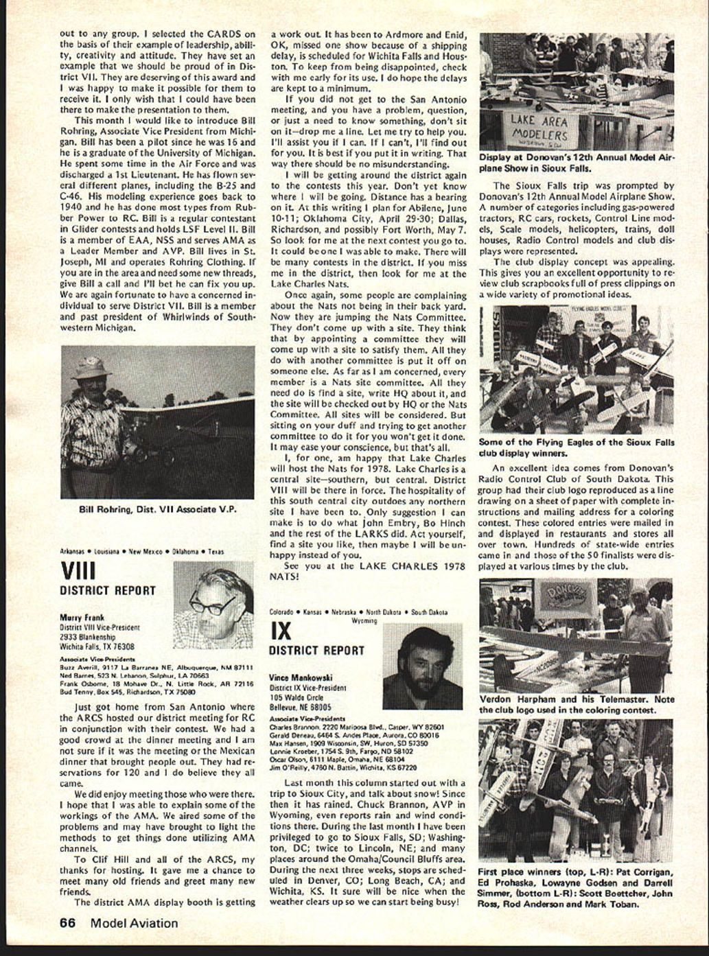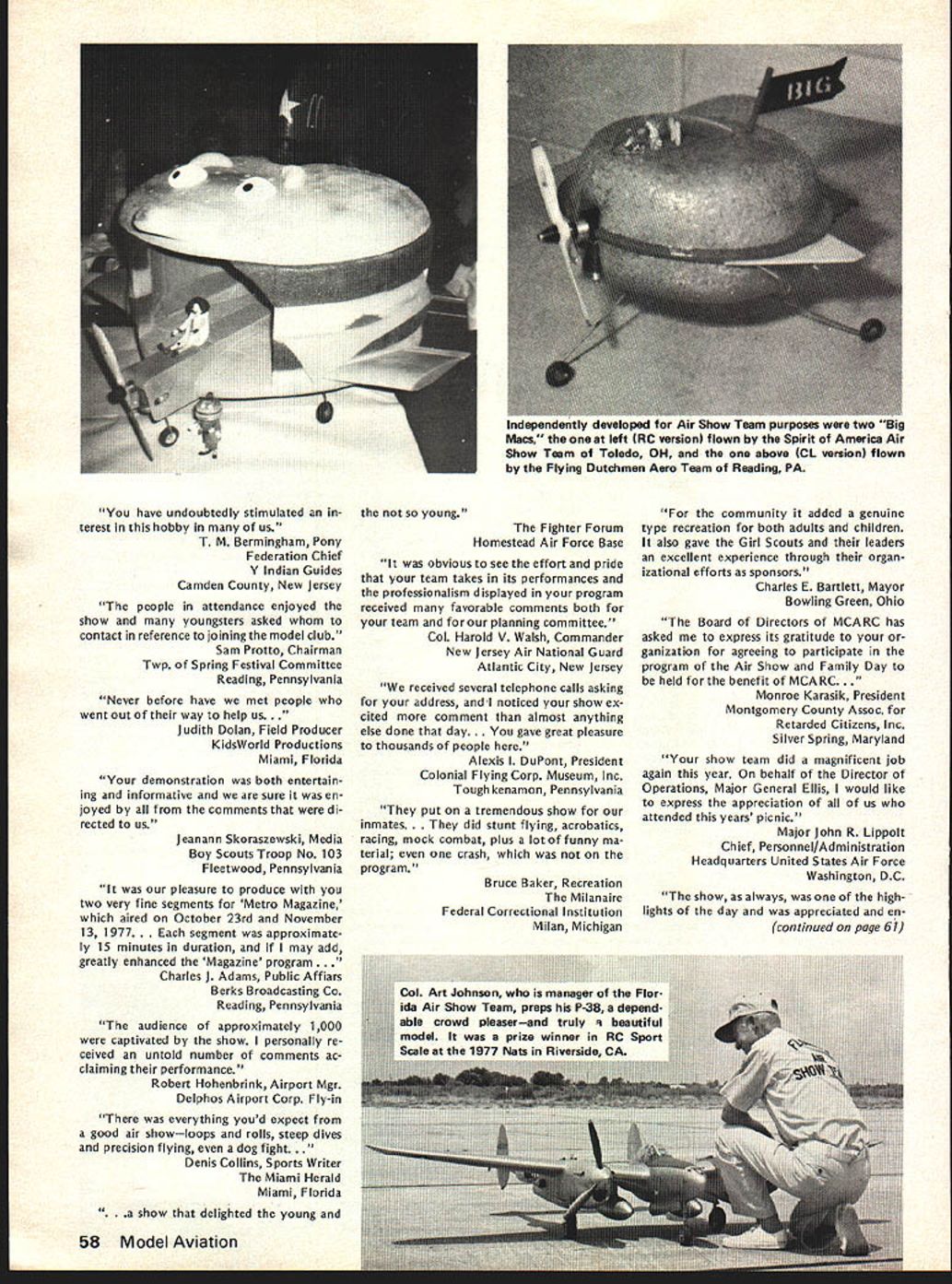 AIR SHOW TEAM STATUS REPORT Now barely year old AMA Air Show Team program boasts total 20 teams coming 1978 flying season 20 teams represent some 205 AMA members nine districts 13 states 12 active teams 1977 responsible promoting model aviation general public across country presenting over 232 performances before thousands pleased spectators sides educational informative flying dem onstrations original routines created volving highly skilled well-choreographed aerial ground acts elaborate sound costuming cases Besides hours practice build ing some Show Teams constantly working new ideas different types aircraft new acts entertain audiences sure mental telepathy two Show Teams have come up flying Big Macthe first designed Kelly Eberle Flying Dutchmen Aero Team Control Line International Toy Show Philadelphia last September second designed built Bob Roach Spirit America Air Show Team Radio Control 24th Annual Toledo Exposition Building flying beginnings Air Show Teams interest spacious new shopping malls now welcome team static displays teams averaged two five sta tic shows month thus giving good exposure creating interest aeromodeling during long non-flying winter During static display STARS Air Show Team North Star Mall San Antonio Texas random samplings interviews indicated over 25000 people visited various dis plays merchants mall indicated sharp rise modeling-related sales di rect result show Thats least ASTs effortsamong other rewards requests air shows mayor Lytle Texas Chamber Commerce representative Castroville Texas RC Club representative Tampico Mexico hobby shop owner Austin Texas representative Piper Aircrafts Agricul tural Division Its plain see interest model aviation Texas growing Air Show Teams help generous industry sponsors hold full pro grammed flying shows demonstrations mod el building classes lectures static shows interviews television radio model aeronautics promoted general newspapers cover ing events detail type equipment used kinds equipment needed build models future picture 50 show teams across country promoting model aviation new concept Academy has al ready received over 70 requests become AMA/H IA Air Show Teams Although qualifi cation requires great deal skill profession alism promotional ability hopes high ASTs will quadruple number per formance 78 Meanwhile following merely sam pling type response show teams have received date aeromodelers program helps publi cize hobby has brought great recrea tional enjoyment young old alike source great optimism view quickening pace American life esentative Gus Yatron Pennsylvania Congressional Record Model aviation much ticipated have provided us group men can work closely com ing events John Parker Chapter President American Business Clubs Reading Pennsylvania can assured future new members hobby will come out ranks because show J Davis President Reading Jaycees Inc Reading Pennsylvania next page Crowds what AMA Air Show Team Program aboutgives general public chance witness first-hand excitement chal lenge air-modeling mixture specialty aircraft such flying doghouse flying lawnmower flying flag plus scale conventional models makes well-rounded shows Picture exhibition put Florida Air Show Team AMA HQ Executive Director including reports AMA President end Vice-Presidents L ACADEMY OF MODEL AERONAUTICS Fifteenth Street NW Washington DC 20005 have undoubtedly stimulated terest hobby us T M Bermingham Pony Federation Chief Y Indian Guides Camden County New Jersey people attendance enjoyed show youngsters asked contact reference joining model club Sam Protto Chairman Twp Spring Festival Committee Reading Pennsylvania Never before have met people went out way help us Judith Dolan Field Producer KidsWorld Productions Miami Florida demonstration both entertain ing informative sure en joyed comments di rected us Jeanann Skoraszewski Media Boy Scouts Troop No 103 Fleetwood Pennsylvania pleasure produce two very fine segments Metro Magazine aired October 23rd November 13 1977 - segment approximate ly 15 minutes duration may add greatly enhanced Magazine program Charles J Adams Public Affiars Berks Broadcasting Co Reading Pennsylvania audience approximately 1000 captivated show personally re ceived untold number comments ac claiming performance Robert Hohenbrink Airport Mgr Delphos Airport Corp Fly-in everything youd expect good air showloops rolls steep dives precision flying dogfight. Denis Collins Sports Writer Miami Herald Miami Florida show delighted young young Fighter Forum Homestead Air Force Base obvious see effort pride team takes its performances professionalism displayed program received favorable comments both team planning committee CoL Harold V Walsh Commander New Jersey Air National Guard Atlantic City New Jersey received several telephone calls asking address noticed show ex cited comment almost anything else done day . gave great pleasure thousands people Alexis DuPont President Colonial Flying Corp Museum Inc Tough kenamon Pennsylvania put tremendous show inmates stunt flying acrobatics racing mock combat plus lot funny ma terial crash program Bruce Baker Recreation Milanaire Federal Correctional Institution Milan Michigan community added genuine type recreation both adults children also gave Girl Scouts leaders excellent experience through organ izational efforts sponsors Charles E Bartlett Mayor Bowling Green Ohio Board Directors MCARC has asked express its gratitude ganization agreeing participate program Air Show Family Day held benefit MCARC Monroe Karasik President Montgomery County Assoc Retarded Citizens Inc Silver Spring Maryland show team did magnificent job again year behalf Director Operations Major General Ellis would like express appreciation of us attended years picnic Major John R Lippolt Chief Personnel/Administration Headquarters United States Air Force Washington DC show always high- lights day appreciated encontinued page 61 Independently developed Tor Team purposes two Macs left RC version