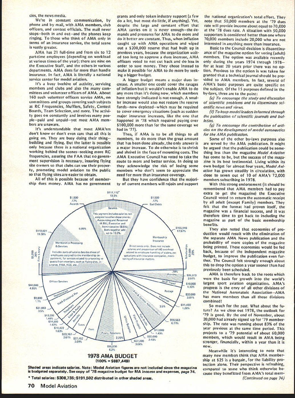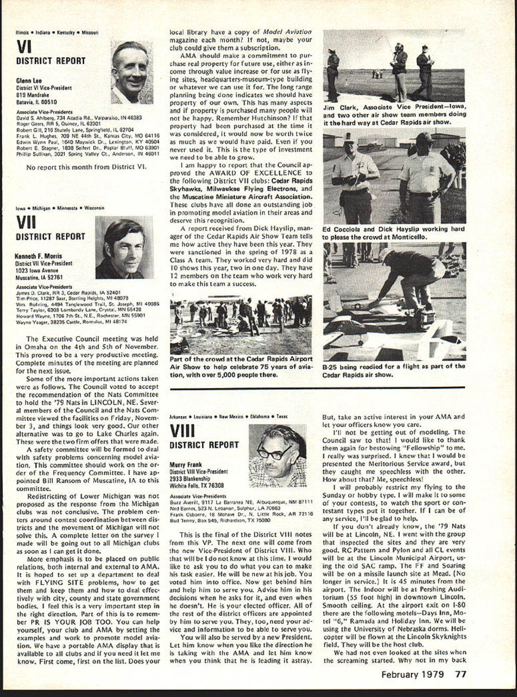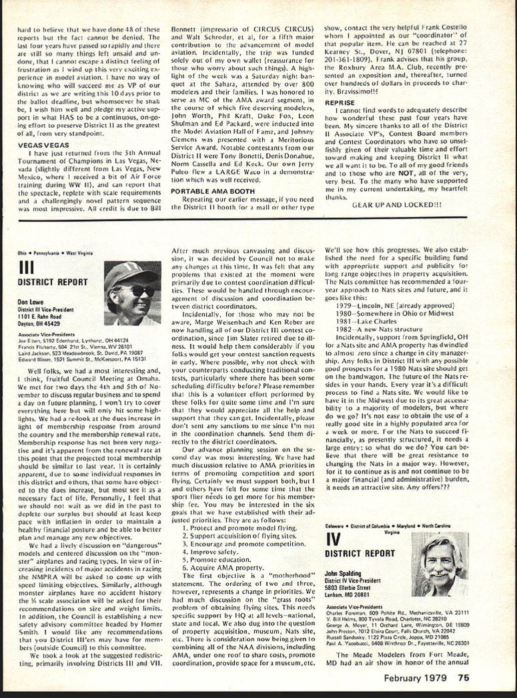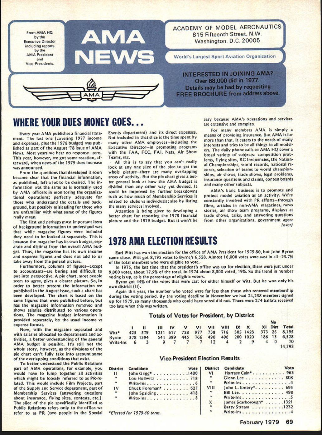 From AMA HO Executive Director including reports AMA President Vice-Presidents year AMA publishes financial state ment last covering 1977 income expenses plus 1978 budget pub lished part August 78 issue AMA News Most years hear no responsezero year however got some reaction af terward news 1979 dues increase announced questions developed soon became clear financial information published left lot desired formation same normally used AMA officers monitoring organiza tional operations perfectly adequate understand details back ground possibly misleading unfamiliar what some figures really mean first perhaps important item background information understand magazine figures included need looked separately because magazine has its own budget sep arate distinct overall AMA bud get Thus magazine has its own income expense figures does add take away general picture F urthermore columns figuresexcept accountantsare boring difficult put perspective pie chart people seem agree gives clearer picture So order better present information published August issue such chart has developed chart based same figures published before has magazine information removed shows salaries distributed various opera tions magazine budget information provided separately usual income vs expense format Now magazine separated salaries allocated departments ac tivities better understanding general AMA budget possible Its still whole story however divisions pie chart cant fully take account some overlapping conditions exist better understand Public Relations part AMA operations example would have lump together activities might loosely referred PR-re lated would include Film Projects part Supply Service department part Membership Services answering questions about insurance flying sites contests etc slice pie specifically identified Public Relations refers office refer PR two people Special Events department its direct expenses included slice time spent other AMA employeesincluding Executive Directorin promoting programs FAA FCC FAI Nats Air Show Teams etc say cant really look slice pice get whole picturethere overlapping areas activity pie chart gives bet ter general look AMA budget divided other way yet devised could improved further breakdowns such much Membership Services related clubs vs individuals also listing services involved Attention being given developing better chart reporting 1978 financial picture 1979 budget wont easy because AMAs operations services extensive complex members AMA simply means providing insurance AMA far caters needs interests tries things model ers daily phone calls AMA HQ cover broad variety subjects competition prob lems flying sites RC frequencies Nation al Championships world records national re cords selection teams world champion ships air shows trade shows legal problems insurance questions claims contest boards other subjects AMAs basic business promote protect model aviation activity constantly involved PR effortsthrough films articles non-AMA magazines news stories air show team programs displays trade shows talks answering questions other organizations government agen over 1918 AMA ELECTION RESULTS Earl Witt has won election office AMA President 1979-80 John Byrne came close Witt got 8195 votes Byrnes 6528 Almost 16000 votes cast all257% total members eligible vote 1976 last time presidents office up election just under 9000 votes about 175% total 1974 about 8000 voted 19% So trend number voting up percentage eligible voters Byrne got 44% votes cast either himself Witt won own district II Again year number voted far less renewed membership during voting period voting deadline November 24258 members signed up 1979 thousands could have voted did 274 ballots received too late written Totals Votes President District III Witt*425579 Byrne3781594 Write-Ins63 III IV 1251617 541399 97 V VI 758977 445766 77 VIIVIIIIXX 7387183051428 4904962001020 12429 No XIOut 37326 18613 40 Total 8195 6528 70 14793 Vice-President Election Results District II IV CandidateVote John Grigg*1400 Lou Hollwitz718 Write-Ins6 Chuck Foreman*627 JohnSpalding418 Write-Ins8 *EIe cted 1979-80 term District VI VIII x Candidate Horrace Cain* Glenn Lee Write-Ins John L Embry* Bill Lee Write-Ins James Scarborough* Betty Stream Write-Ins Vote - - 808 4 695 498 5 1321 1232 4 February 1979 69 ACADEMY OF MODEL 81 5 Fifteenth Street NW AERONAUTICS] Washington DC 20005 WHERE YOUR DUES MONEY GOES. des news media constant communication phone mail AMA members club officers contest officials mail never stopsboth outand phones keep ringing think AMA terms insurance service total scene vastly greater AMA has 21 full-time six 12 part-time employees depending workload various times year nine Executive Staff others various departments AMA does far handle insurance fact AMA literally national service center model aviation Its busy beehive activity servicing members clubs also com mittees volunteer officers AMA About 160 such volunteer officers service AMA committees groups covering such subjects RC Frequencies Mufflers Safety Contest Boards Team Selection activi ty goes constantly involves peo plepaid unpaidyet AMA mem bers unaware Its understandable AMAers dont know dont care going busy doing thing building flying latter possible because national organization working behind scenesseeking RC frequencies assuring FAA no govern ment supervision necessary insuring flying site owners clubs can use proper ty promoting model aviation public flying sites easier obtain possible because member ship dues money AMA has no government $1500 17% Awards grants token industry support few lot little anything Yet despite large constant effort AMA carries never enoughthe de mands pressures AMA better constant Thus inflation caught up AMA operations wiped out $200000 reserve built up previous years because organization Wait ed too long approve dues increase AMA officers voted cut back less order save money chose instead make possible AMA seek ing bigger budget b