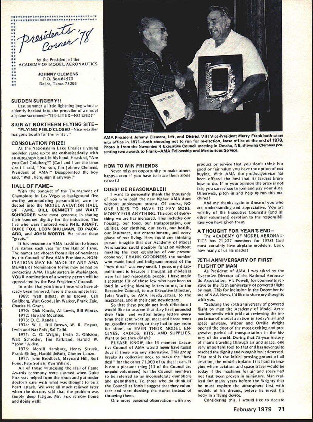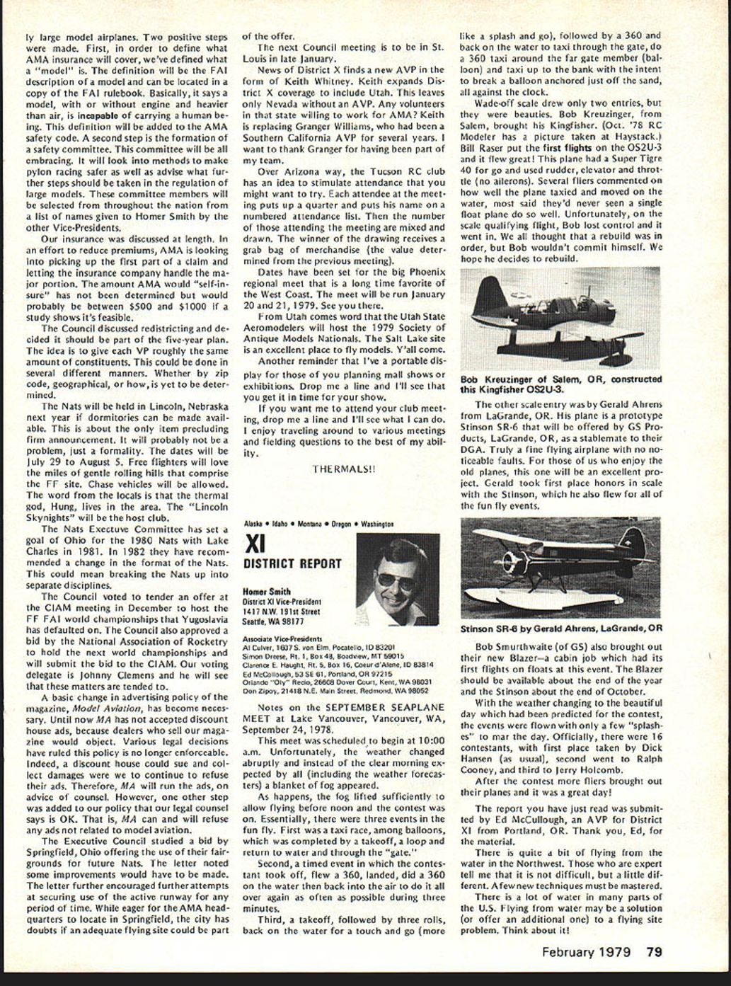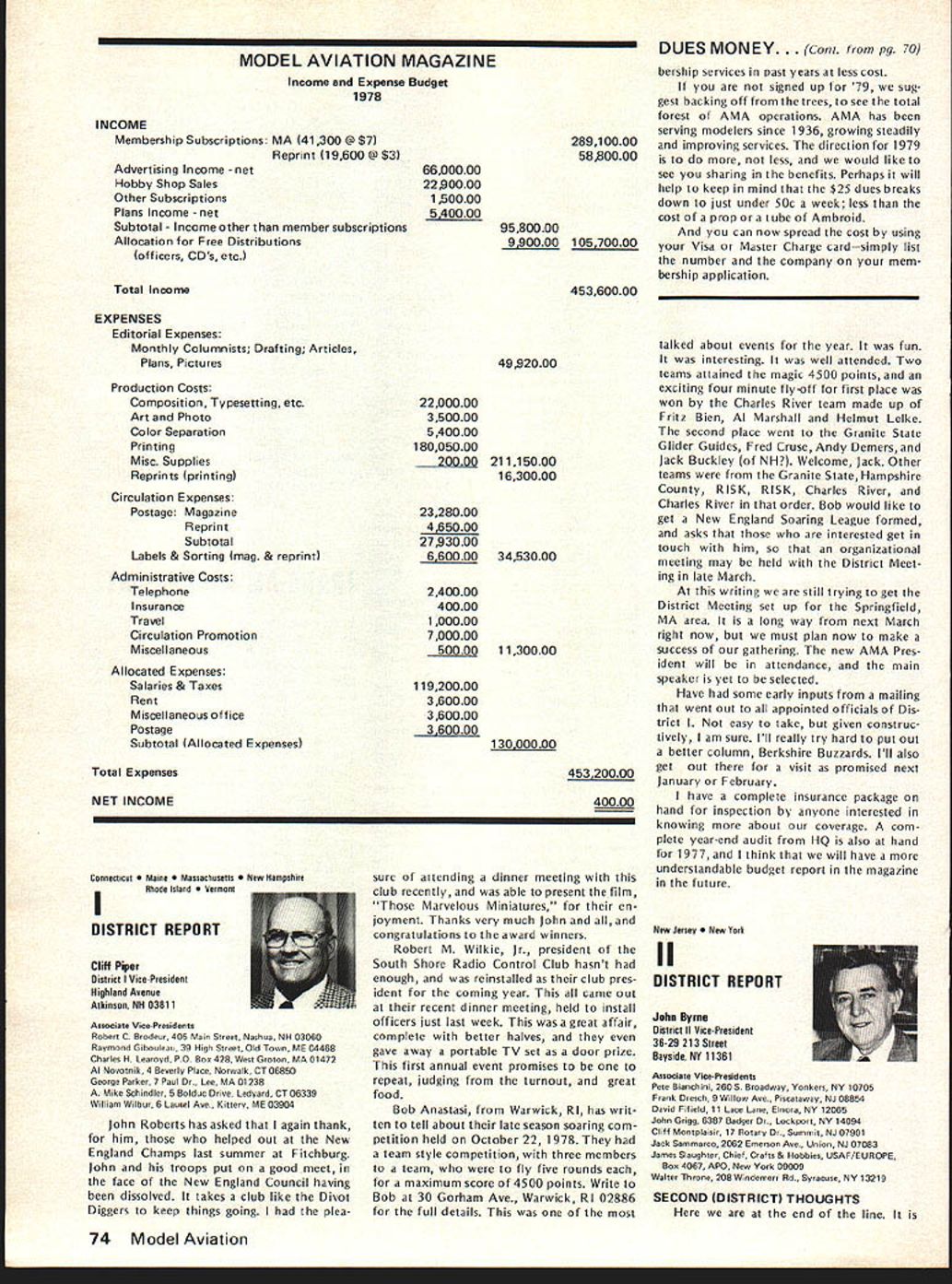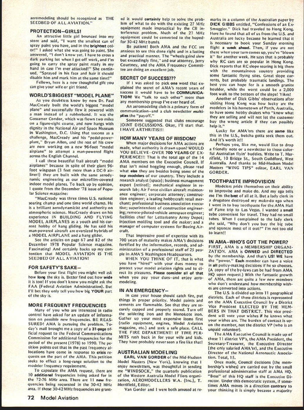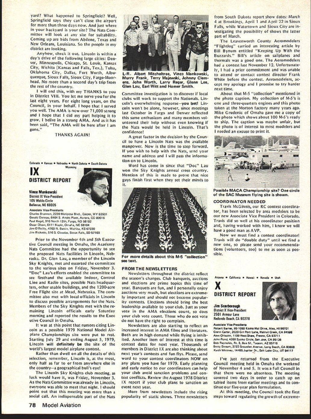 From AMA HO Executive Director including reports AMA President Vice-Presidents year AMA publishes financial state ment last covering 1977 income expenses plus 1978 budget pub lished part August 78 issue AMA News Most years hear no responsezero year however got some reaction af terward news 1979 dues increase announced questions developed soon became clear financial information published left lot desired formation same normally used AMA officers monitoring organiza tional operations perfectly adequate understand details back ground possibly misleading unfamiliar what some figures really mean first perhaps important item background information understand magazine figures included need looked separately because magazine has its own budget sep arate distinct overall AMA bud get Thus magazine has its own income expense figures does add take away general picture F urthermore columns figuresexcept accountantsare boring difficult put perspective pie chart people seem agree gives clearer picture So order better present information published August issue such chart has developed chart based same figures published before has magazine information removed shows salaries distributed various opera tions magazine budget information provided separately usual income vs expense format Now magazine separated salaries allocated departments ac tivities better understanding general AMA budget possible Its still whole story however divisions pie chart cant fully take account some overlapping conditions exist better understand Public Relations part AMA operations example would have lump together activities might loosely referred PR-re lated would include Film Projects part Supply Service department part Membership Services answering questions about insurance flying sites contests etc slice pie specifically identified Public Relations refers office refer PR two people Special Events department its direct expenses included slice time spent other AMA employeesincluding Executive Directorin promoting programs FAA FCC FAI Nats Air Show Teams etc say cant really look slice pice get whole picturethere overlapping areas activity pie chart gives bet ter general look AMA budget divided other way yet devised could improved further breakdowns such much Membership Services related clubs vs individuals also listing services involved Attention being given developing better chart reporting 1978 financial picture 1979 budget wont easy because AMAs operations services extensive complex members AMA simply means providing insurance AMA far caters needs interests tries things model ers daily phone calls AMA HQ cover broad variety subjects competition prob lems flying sites RC frequencies Nation al Championships world records national re cords selection teams world champion ships air shows trade shows legal problems insurance questions claims contest boards other subjects AMAs basic business promote protect model aviation activity constantly involved PR effortsthrough films articles non-AMA magazines news stories air show team programs displays trade shows talks answering questions other organizations government agen over 1918 AMA ELECTION RESULTS Earl Witt has won election office AMA President 1979-80 John Byrne came close Witt got 8195 votes Byrnes 6528 Almost 16000 votes cast all257% total members eligible vote 1976 last time presidents office up election just under 9000 votes about 175% total 1974 about 8000 voted 19% So trend number voting up percentage eligible voters Byrne got 44% votes cast either himself Witt won own district II Again year number voted far less renewed membership during voting period voting deadline November 24258 members signed up 1979 thousands could have voted did 274 ballots received too late written Totals Votes President District III Witt*425579 Byrne3781594 Write-Ins63 III IV 1251617 541399 97 V VI 758977 445766 77 VIIVIIIIXX 7387183051428 4904962001020 12429 No XIOut 37326 18613 40 Total 8195 6528 70 14793 Vice-President Election Results District II IV CandidateVote John Grigg*1400 Lou Hollwitz718 Write-Ins6 Chuck Foreman*627 JohnSpalding418 Write-Ins8 *EIe cted 1979-80 term District VI VIII x Candidate Horrace Cain* Glenn Lee Write-Ins John L Embry* Bill Lee Write-Ins James Scarborough* Betty Stream Write-Ins Vote - - 808 4 695 498 5 1321 1232 4 February 1979 69 ACADEMY OF MODEL 81 5 Fifteenth Street NW AERONAUTICS] Washington DC 20005 WHERE YOUR DUES MONEY GOES. des news media constant communication phone mail AMA members club officers contest officials mail never stopsboth outand phones keep ringing think AMA terms insurance service total scene vastly greater AMA has 21 full-time six 12 part-time employees depending workload various times year nine Executive Staff others various departments AMA does far handle insurance fact AMA literally national service center model aviation Its busy beehive activity servicing members clubs also com mittees volunteer officers AMA About 160 such volunteer officers service AMA committees groups covering such subjects RC Frequencies Mufflers Safety Contest Boards Team Selection activi ty goes constantly involves peo plepaid unpaidyet AMA mem bers unaware Its understandable AMAers dont know dont care going busy doing thing building flying latter possible because national organization working behind scenesseeking RC frequencies assuring FAA no govern ment supervision necessary insuring flying site owners clubs can use proper ty promoting model aviation public flying sites easier obtain possible because member ship dues money AMA has no government $1500 17% Awards grants token industry support few lot little anything Yet despite large constant effort AMA carries never enoughthe de mands pressures AMA better constant Thus inflation caught up AMA operations wiped out $200000 reserve built up previous years because organization Wait ed too long approve dues increase AMA officers voted cut back less order save money chose instead make possible AMA seek ing bigger budget b