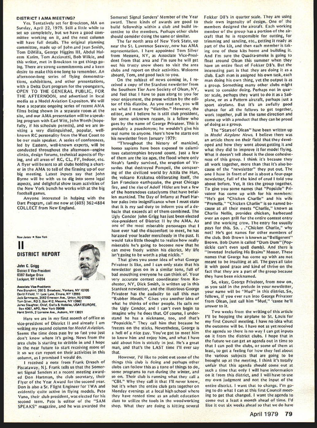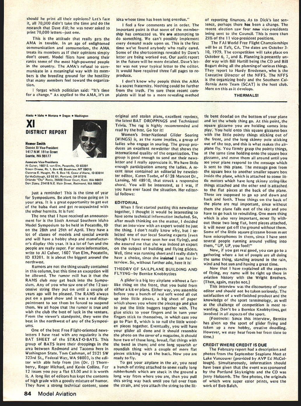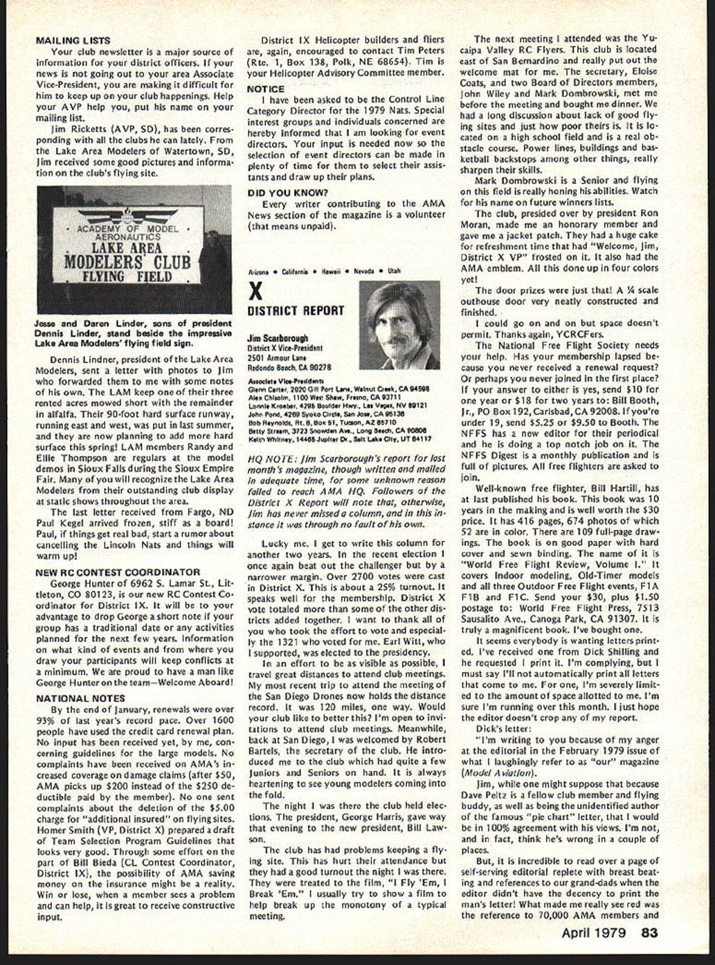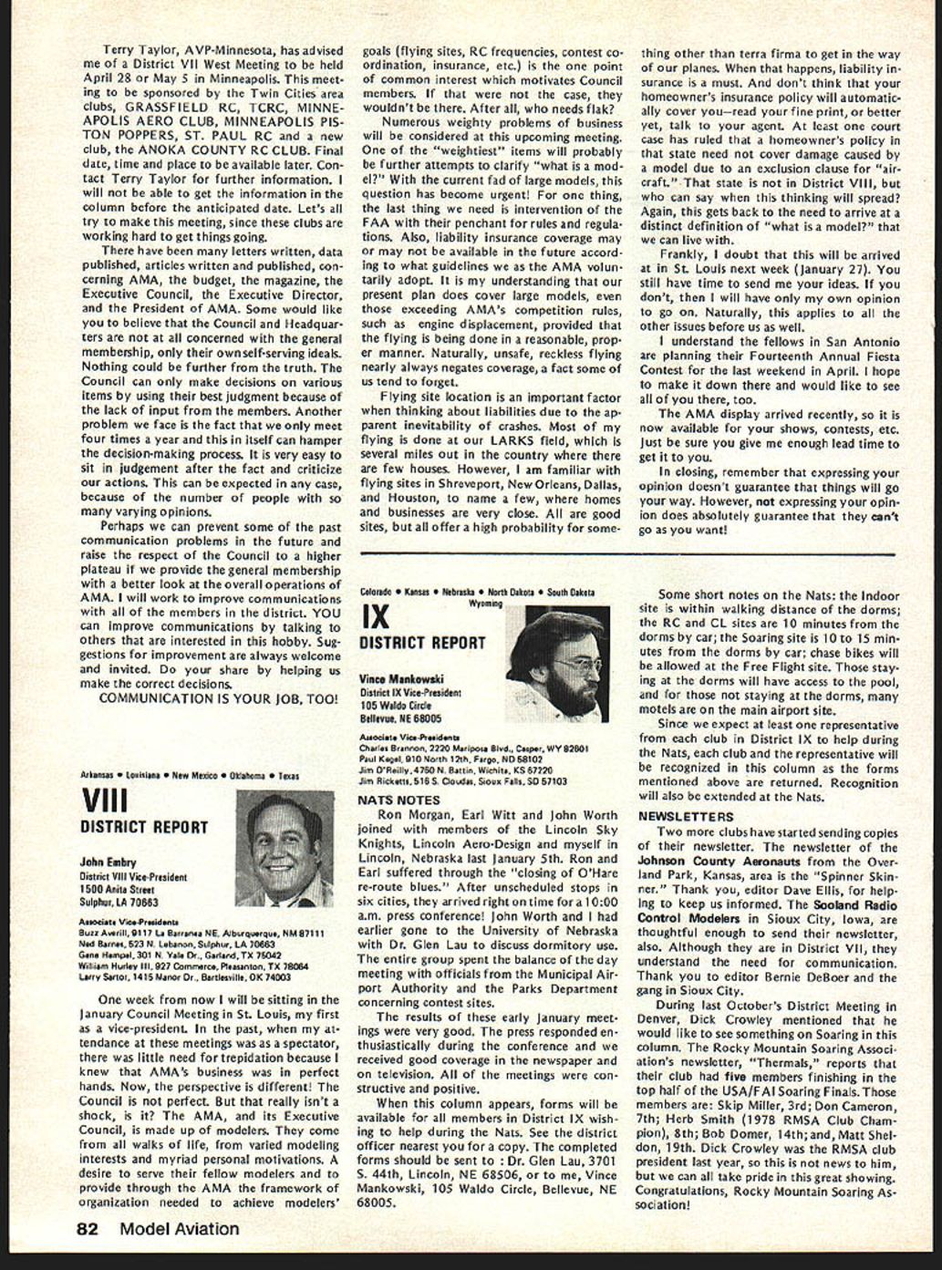 The Model Aviation Hail Fame ini tiated 1969 under joint sponsorship Washington State Air National Guard Academy Model Aeronautics joint venture produced nine awards through 1971 AMA took over sole responsibility program 1972 Since time former AMA presidents current pres ident have served Hall Fame Selec tion Committee Wait Goodhimself Hail Famerserving chairman Objectives recognize individuals have contributed modeling some way out past well currently deserving candidates Thus Hall Fame considers candidates ages periods aspects activity past AMA presidents uniquely qualified ful fill objectives since themselves aeromodeling pioneers present-day leaders Most AMA presidents could qualify Hall Fame Five have honored no past president may vote himself group consider nomina tions other sources current Com mittee also known Council Past Presidents includes following current members dates AMA presidency Ir win G Ohlsson 1943-46 C 0 Wright 194849 Kenneth G Held 1950-51 Frank B Bushey 1952 Keith H Storey 1953-56 Claude McCullough 1957 Dr Walter Good 1958-60 Peter J Sotich 1961-62 John Worth 1963 Maynard L Hill 1964 Howard E Johnson 1965-66 Clifford G Weirick 1967-68 John E Patton 1969-70 John E Clemens 1971-78 19 nominations 1978 Hall Fame selection committee nar rowed down five per normal bal loting procedures Descriptions winners follow Anyone would like submit nomination 1979 should request appli cation AMA HQ submit same before March 31 1979 DUKE FOX 59 founder Fox Manufactur ing Co well-known modelers through out world engines RC CL FF model airplanes pioneer de velopment fuel components model engines having pioneered use nitro methane 1947 special technique ac complish metal bypass port 1949 soft aluminum head gaskets 1950the first pro duction carburetor metered fuel flow 1962 well unique throttle controls other engine innovations commonly used today 35 stunt engine probably has used competition models other over 16000 recorded contest vic toriesl World National Champions have used engine Over years need arose Duke designed developed manufactured other engines RC CL FF configurations Dukes modeling career began 1936 Since founding Fox Manufacturing Company 1950 own competitive participation has waned interest modelers model aviation general keen ever National Contest competitors grateful Duke unselfish donation parts expertise events al ways evidence has also generous providing prizes AMA sanctioned events levelsMore next page Hall Fame Award recipient Duke Fox nrnudlv dianlav hi nveted award AMA HQ Executive Director including reports AMA President Vice-Presidents Worlds Largest Sport Aviation Organization HALL OF FAME AWARDS Las Vegas tle scene Phil Kratt above right receives Hall ot Fame Award Walt Schroder himself Hall Famer Right photo AMA Executive Director John Worth presents Awardto Ed Packard Dukes eye always ways improve performance model airplanes cate gories PHIL KRAFT age 53 among best known figures sport model aviation due participation design ing manufacture radio control equip ment major wins national world contest events designing well-known model aircraft top full-scale aerobatic aircraft boyhood Phil Krafts hobby building flying model aircraft Most modelers dream controlling creations remotely Phil no exception efforts very short time resulted establishment Kraft Systems Inc largest manufacturers radio control equipment world Starting parttime hobby/sideline garage 1962 Kraft Systems grew until now full-time manufacturing complex three buildings de voted almost exclusively design production radio control products hob sport industrial use building lucrative business Phil absent competition scene top winner 1967 RC World Championships took second 1969 World Championships third 1971 National Champion twice also RC Pylon Racing champ Some well-known designs Hi Fli Up-Start Bar-Eli Stagger-Bi Quick-Fli Super-Eli Dragon-Eli Go-Go Eli Ugly Stick Phil has also authored articles several model publications such Model Airplane News Radio Control Models England American Aircraft Modeler THE HALL OF FAME ROSTER 1977 john Brodbeck Maynard Hill Bert Pond Pete Sotich Ken Willard 1976 Merrill Hamburg Henry Struck Erank Ehling Harold deBolt Chester Lanzo 1975 Irwin G Ohis son C 0 Wright Walt Schroder Jim Kirk land Harold W John Alden 1974 W L Bill Brown W R Enyart Irwin Nat Polk Sal Taibi 1973 0 C Randall 1972 Howard McEntee 1970 Dick Korda Al Lewis Bill Winter 1969 Walt Billert Willis Brown Carl Goldberg Walt GoodJim Walker Erank Zaic Charles Grant JOHN WORTH 55 Executive Director Academy Model Aeronautics since 1964 trees forest ef forts often overlooked very people benefit Over past 15 years has made contributions day have helped model aviation Academy Model Aeronautics grow relatively unknown small group people very little national recognition major sport/hobby John member Executive Com mittee Board Directors Na tional Aeronautic Association vicechairman National Sport Aviation Council model aviation chairman Aero Club Washington currently trus tee National Association Rocketry also secretary ClAM aeromodel ing arm Federation Aeronautique Internationale Before becoming Executive Di rector John president AMA 1963 RC Contest Board Chairman 1962 Free Flight Contest Board con test director since 1948 Worth also RC pioneer partner Ed Lorenz others firm Control Research late 40s through mid-50s forerunner Ace R/C Company today authored series articles Model Airplane News Gal loping Ghost RC control system pro duced hundreds kits building RC trans mitters receivers escapements member original AMA-FCC Committee obtained first group RC Citizens Band frequencies model de signs have appeared old Air Trails mag azine several yearbooks Frank Zaic Continued page 77 74 Model Aviation Former AMA President Johnny Clemens above left presergs prestigious award AMA Executive Director John Worth Las Vegas photo right Leon Shulman receives award form er Secretary-Treasurer AMA Earl Witt right now President