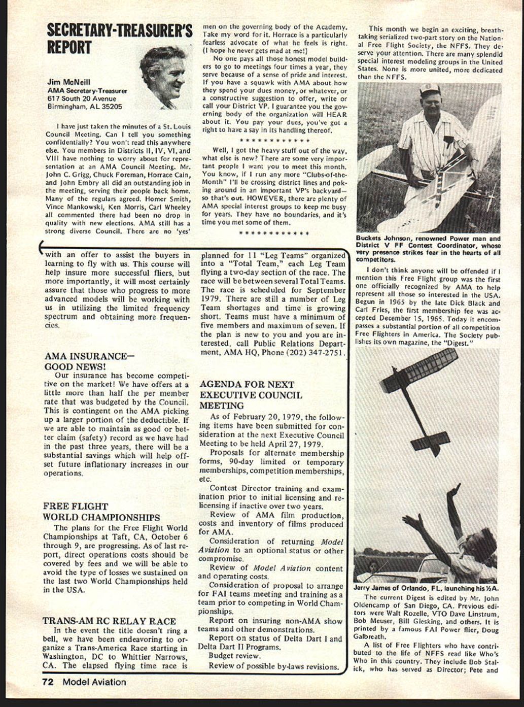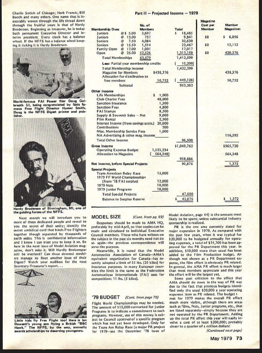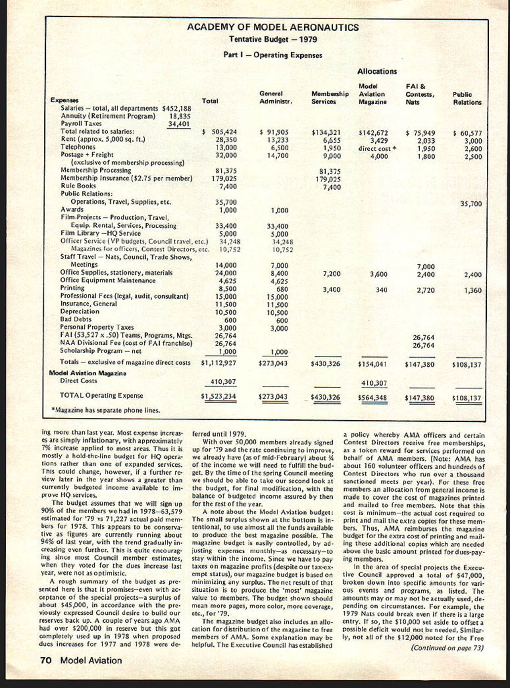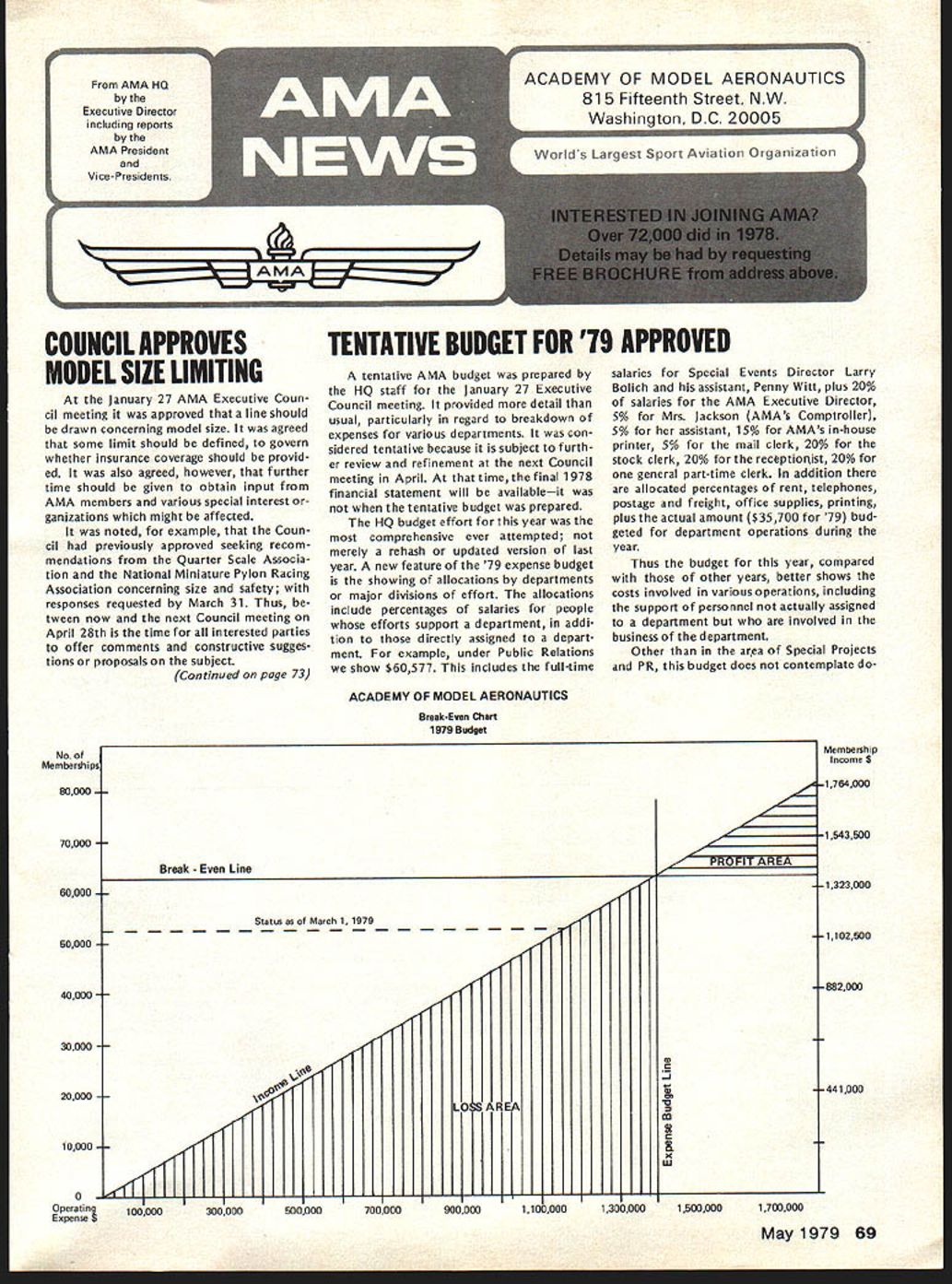At January 27 AMA Executive Coun cii meeting approved line should drawn concerning model size agreed some limit should defined govern whether insurance coverage should provid ed also agreed however further time should given obtain input AMA members various special interest ganizations might affected noted example Coun cil previously approved seeking recom mendations Quarter Scale Associa tion National Miniature Pylon Racing Association concerning size safety responses requested March 31 Thus tween now next Council meeting April 28th time interested parties offer comments constructive sugges tions proposals subject Continued page 73 tentative AMA budget prepared HQ staff January 27 Executive Council meeting provided detail usual particularly regard breakdown expenses various departments con sidered tentative because subject furth er review refinement next Council meeting April time final 1978 financial statement will availableit tentative budget prepared HQ budget effort year comprehensive ever attempted merely rehash updated version last year new feature 79 expense budget showing allocations departments major divisions effort allocations include percentages salaries people efforts support department addi tion directly assigned depart ment example under Public Relations show $60577 includes full-time ries Special Events Director Larry Bolich assistant Penny Witt plus 20% salaries AMA Executive Director 5% Mrs Jackson AMAs Comptroller 5% assistant 15% AMAs in-house printer 5% mail clerk 20% stock clerk 20% receptionist 20% general part-time clerk addition allocated percentages rent telephones postage freight office supplies printing plus actual amount $35700 79 bud geted department operations during year Thus budget year compared other years better shows costs involved various operations including support personnel actually assigned department involved business department Other area Special Projects PR budget does contemplate doACADEMY OF MODEL AERONAUTICS Break-Even aian 1979 Budget No Membership 80000 70000 60000 Break Line 50000 0 30000 20000 100000 Expense100000 300000 Membership Income $ 1764000 1543500 1323000 1102500 -882000 -441000 -J 91 x uJ 15000001700000 May1979 69 AMA HQ Executive Director including reports AMA President Vice-Presidents ACADEMY OF MODEL AERONAUTICS 81 5 Fifteenth Street NW Washington DC 20005 COUNCIL APPROVES TENTATIVE BUDGET FOR 79 APPROVED MODEL SIZE UMITING Status asof March 11979 cP~ 50000070000090000011000001300000 ACADEMY OF MODEL AERONAUTICS Tentative Budget Part ating Expenses Allocations $452188 18835 34401 Expenses Salaries l departments Annuity Retirement Program Payroll Taxes Total related salaries$ Rent approx 5000 sq ft Telephones Postage ght exclusive membership processing Membership Processing Membership Insurance $275 per member Rule Books Public Relations Operations Travel Supplies etc Awards FlImProjects uction Travel Equip Rental Services Processing Film Library HQ Service Officer Service VP budgets Council travel etc Magazines officers Contest Directors etc Staff Travel Council Trade Shows Meetings Office Supplies stationery materials Office Equipment Maintenance Printing Professional Fees legal audit consultant Insurance General Depreciation Bad Debts Personal Property Taxes FAI 53527 x 50 Teams Programs Mtgs NAA Divisional Fee cost FAI franchise Scholarship Program Totals usive magazine direct costs Model Aviation Magazine Direct Costs Model GeneralMembershipAviation AdministrServicesMagazine Total 505424 28350 13000 32000 $ 91905 13233 6500 14700 81375 179025 7400 35700 1 000 33400 5000 34248 10752 14000 24000 4625 8500 15000 11500 10500 600 3000 26764 26764 1000 $1112927 410307 $134321 6655 1950 9000 81375 179025 7400 $1 42672 3429 direct cost * 4000 FAI & Contests Nats $ 75949 2033 1950 1800 1 000 33400 5000 34248 10752 7000 8400 4625 680 15000 11500 10500 600 3000 1000 $273043 7200 3400 3600 340 7000 2400 2720 26764 26764 $430326$154041$147380 ______________410307 TOTAL Operating Expense *Magazine has separate phone lines $1523234$273043$430326$564348$147380$108137 ing last year Most expense increas es simply inflationary approximately 7% increase applied areas Thus mostly hold-the-line budget HQ opera tions rather expanded services could change however further re view later year shows greater currently budgeted income available im prove HQ services budget assumes will sign up 90% members 197863579 estimated 79 vs 71227 actual paid mem bers 1978 appears conserva tive figures currently running about 94% last year trend gradually creasing further quite encourag ing since Council member estimates voted dues increase last year optimistic rough summary budget pre sented promiseseven ac ceptance special projectsa surplus about $45000 accordance pre viously expressed Council desire build reserves back up couple years ago AMA over $200000 reserve got completely used up 1978 proposed dues increases 1977 1978 de ferred until 1979 over 50000 members already signed up 79 rate continuing improve already have mid-February about 3/4 income will need fulfill bud get time spring Council meeting should able take second look budget final modification balance budgeted income assured rest year note about Model Aviation budget small surplus shown bottom tentional use almost funds available produce best magazine possible magazine budget easily controlled ad justing expenses monthlyas necessaryto stay within income Since have pay taxes magazine profits despite tax-ex empt status magazine budget based minimizing surplus net result situation produce magazine value members budget shown should mean pages color coverage etc 79 magazine budget also includes allo cation distribution magazine free members AMA Some explanation may helpful Executive Council has established policy whereby AMA officers certain Contest Directors receive free memberships token reward services performed behalf AMA members Note AMA has about 160 volunteer officers hundreds Contest Directors