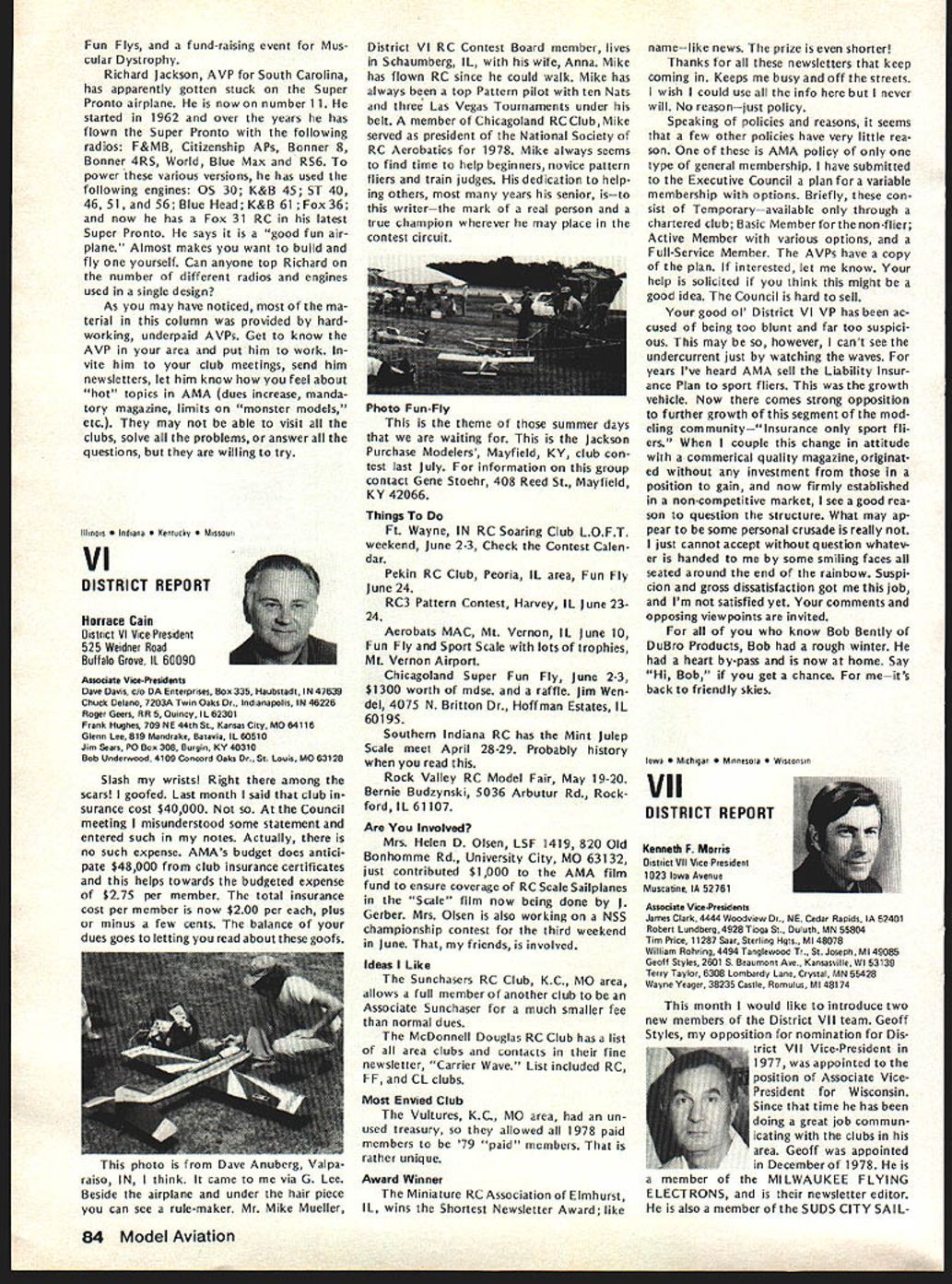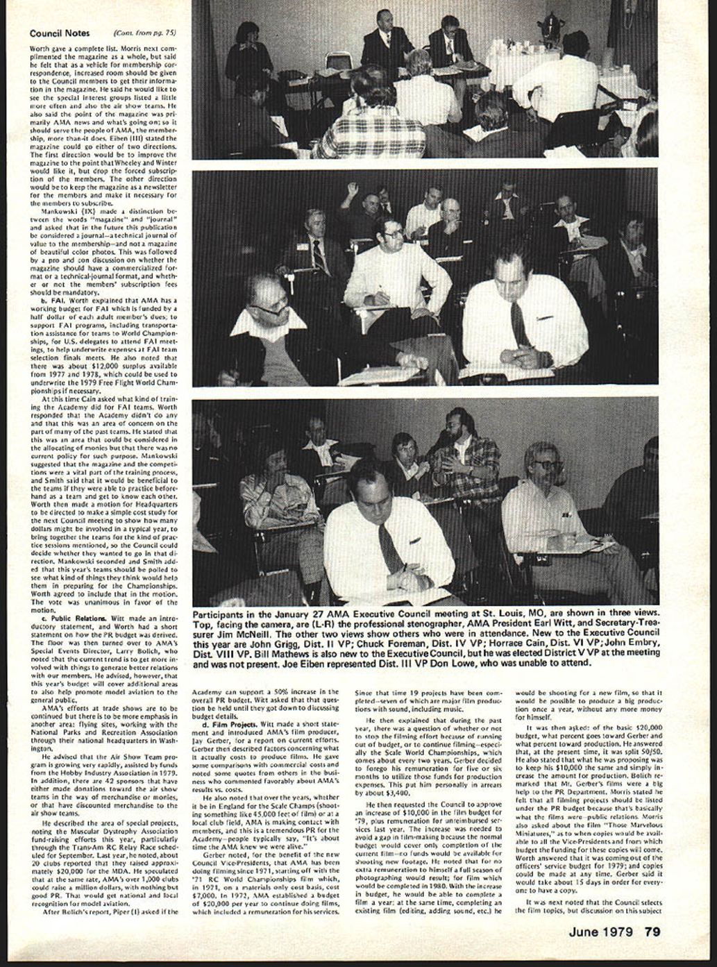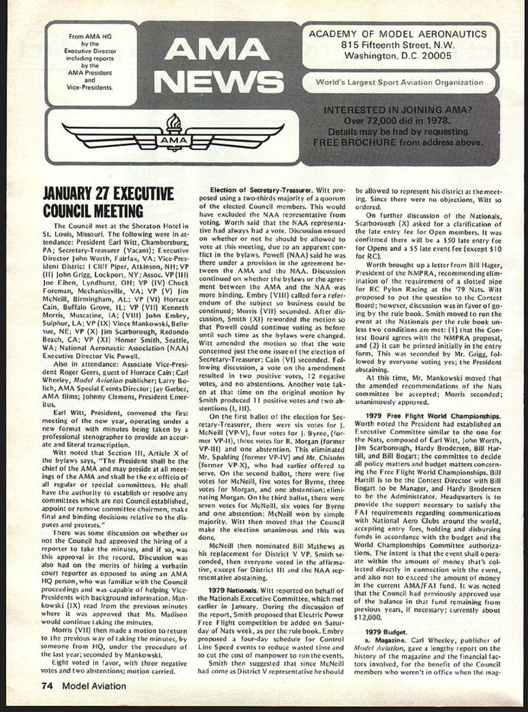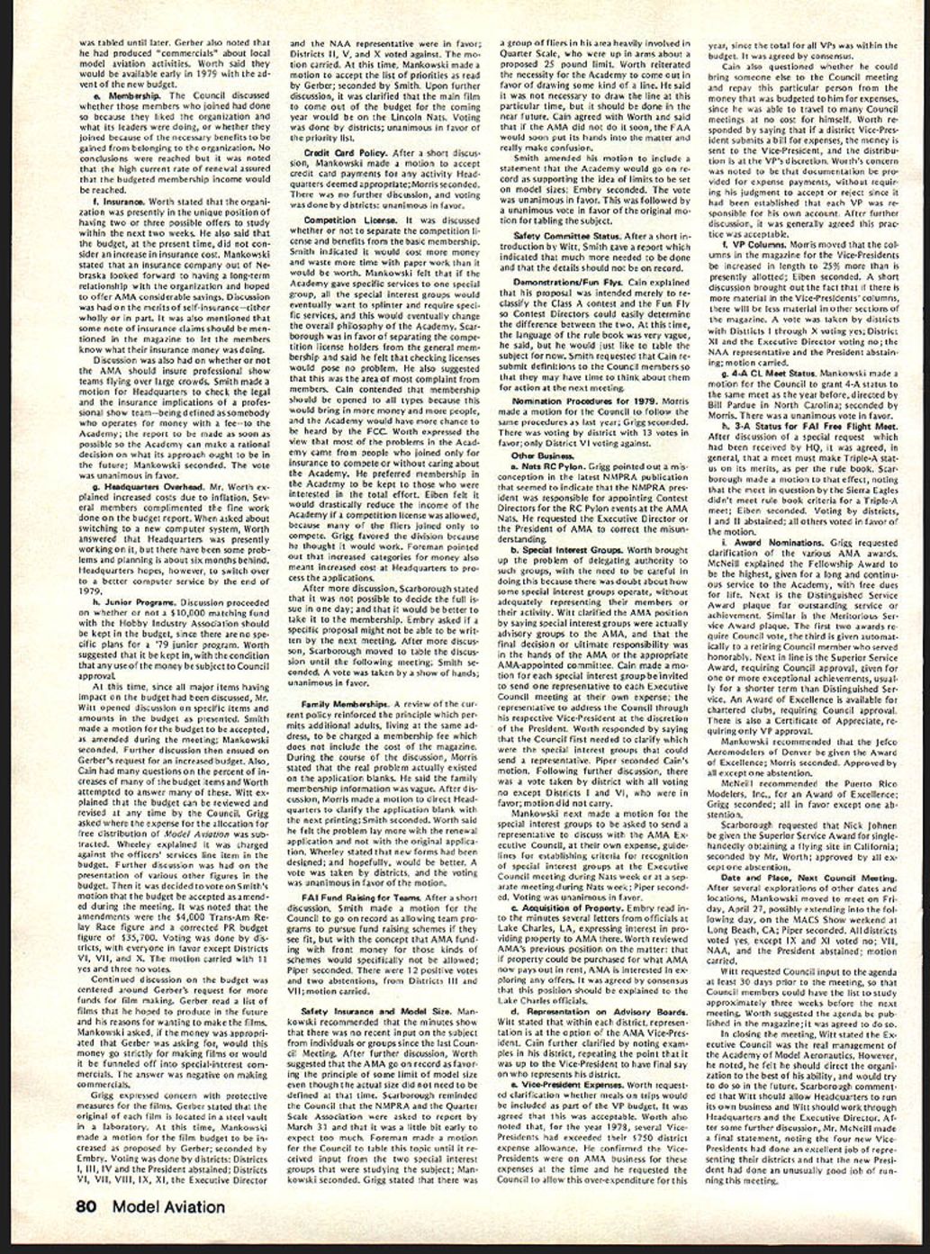 L JANUARY 21 EXECUTIVE COUNCIL MEETING Council met Sheraton Hotel St Louis Missouri following tendance President Earl Witt Chambersburg PA Secretary-Treasurer Vacant Executive Director John Worth Fairfax VA Vice-Pres ident District Cliff Piper Atkinson NH VP II John Grigg Lockport NYAssoc VPIll Joe Eiben Lyndhurst OH VP IV Chuck Foreman Mechanicsville VA VP V Jim McNeill Birmingham AL VP VI Horrace Cain Buffalo Grove IL VP VII Kenneth Morris Muscatine IA VIII John Embry Sulphur LA VP IX Vince Mankowski Belle vue NE VP X Jim Scarborough Redondo Beach CA VP XI Homer Smith Seattle WA National Aeronautic Association NAA Executive Director Vic Powell Also attendance Associate Vice-Presi dent Roger Geers guest Horrace Cain Carl Wheeley Model Aviation publisher Larry Bo lich AMA Special Events Director Jay Gerber AMA films Johnny Clemens President Emer itus Earl Witt President convened first meeting new year operating under new format minutes being taken professional stenographer provide accur ate literal transcription Witt noted Section III Article X bylaws says President shall chief AMA may preside meet ings AMA shall ex officio regular special committees shall have authority establish resolve committees Council established appoint remove committee chairmen make final binding decisions relative dis putes protests some discussion whether Council approved hiring reporter take minutes approval record Discussion also merits hiring verbatin court reporter opposed using AMA HQ person familiar Council proceedings capable helping VicePresidents background information Man kowskj IX read previous minutes approved Ms Madison would continue taking minutes Morris VII made motion return previous way taking minutes someone HQ under procedure last year seconded Man kowskj Eight voted favor three negative votes two abstentions motion carried Election Secretary-Treasurer Witt pro posed using two-thirds majority quorum elected Council members would have excluded NAA representative voting Worth said NAA representa tive always vote Discussion ensued whether should allowed vote meeting due apparent con flict bylaws Powell NAA said under provision agreement tween AMA NAA Discussion continued whether bylaws agree ment between AMA NAA binding Embry VIII called fora refer endum subject business could continued Morris VII seconded After dis cussion Smith XI reworded motion Powell could continue voting before until such time bylaws changed Witt amended motion vote concerned just issue election Secretary-Treasurer Cain VI seconded Fol lowing discussion vote amendment resulted two positive votes 12 negative votes no abstentions Another vote tak en time original motion Smith produced 11 positive votes two ab stentions Ill first ballot election Sec retary-Treasurer six votes J McNeill VP-V four votes J Byrne mer VP-Il three votes R Morgan former VP-Ill abstention eliminated Mr Spalding former VP-IV Mr Chisoim former VP-X earlier offered serve second ballot five votes McNeill five votes Byrne three votes Morgan abstention elimi nating Morgan third ballot seven votes McNeill six votes Byrne abstention McNeill won simple majority Witt moved Council make election unanimous done McNeill nominated Bill Mathews replacement District V VP Smith se conded everyone voted affirma tive except District Ill NAA rep resentative abstaining 1979 Nationals Witt reported behalf Nationals Executive Committee met earlier January During discussion report Smith proposed Electric Power Free Flight competition added Satur day Nats week per rule book Embry proposed four-day schedule Control Line Speed events reduce wasted time cut cost manpower run events Smith suggested since McNeill come District V representative should allowed represent district meet ing Since no objections Witt ordered further discussion Nationals Scarborough X asked clarification late entry fee Open members confirmed will $50 late entry fee Opens $5 late event fee except $10 RC Worth brought up letter Bill Hager President NMPRA recommending elim ination requirement slotted pipe RC Pylon Racing 79 Nats Witt proposed put question Contest Board however discussion favor go ing rule book Smith moved run event Nationals per rule book un less two conditions met 1 Con test Board agrees NMPRA proposal 2 can printed initially entry form seconded Mr Grigg fol lowed everyone voting yes President abstaining time Mr Mankowski moved amended recommendations Nats committee accepted Morris seconded unanimously approved 1979 Free Flight World Championships Worth noted President established Executive Committee similar the Nats composed Earl Witt John Worth Jim Scarborough Hardy Brodersen Bill Har till Bill Bogart committee decide policy matters budget matters concern ing Free Flight World Championships Bill Hartill Contest Director Bill Bogart Manager Hardy Brodersen Administrator Headquarters provide support necessary satisfy FA requirements regarding communications National Aero Clubs around world accepting entry fees holding disbursing funds accordance budget World Championships Committee authoriza tions intent event shall operaate within amount money thats col lected directly connection event also exceed amount money current AMA/FAI fund noted Council previously approved use balance fund remaining previous years necessary currently about $12000 1979 Budget Magazine Carl Wheeley publisher Model Aviation gave lengthy report history magazine financial fac tors involved benefit Council members werent office mag 74 Model Aviatjon AMA HO Executive Director including reports AMA President Vice-Presidents L azine began noted 1979 budget contemplates 54797 members receiving magazine based upon conservative estimate will 90% total members compared last year Actually pointed out recent renewal rate formation indicated currently 94%so income figures budget extremely conservative budget Wheeley advised envisions further improvement magazineboth number pages increased use color increase advertising However c