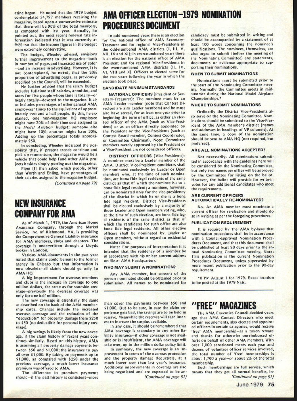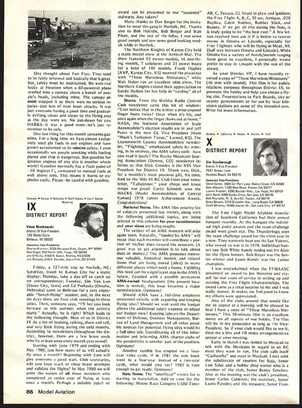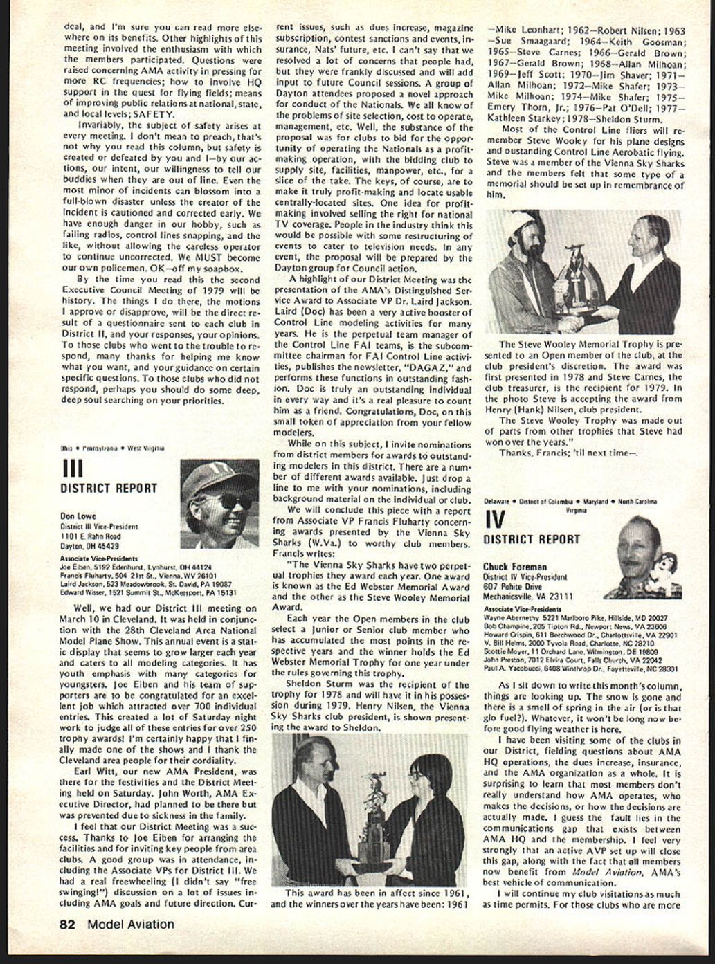 L JANUARY 21 EXECUTIVE COUNCIL MEETING Council met Sheraton Hotel St Louis Missouri following tendance President Earl Witt Chambersburg PA Secretary-Treasurer Vacant Executive Director John Worth Fairfax VA Vice-Pres ident District Cliff Piper Atkinson NH VP II John Grigg Lockport NYAssoc VPIll Joe Eiben Lyndhurst OH VP IV Chuck Foreman Mechanicsville VA VP V Jim McNeill Birmingham AL VP VI Horrace Cain Buffalo Grove IL VP VII Kenneth Morris Muscatine IA VIII John Embry Sulphur LA VP IX Vince Mankowski Belle vue NE VP X Jim Scarborough Redondo Beach CA VP XI Homer Smith Seattle WA National Aeronautic Association NAA Executive Director Vic Powell Also attendance Associate Vice-Presi dent Roger Geers guest Horrace Cain Carl Wheeley Model Aviation publisher Larry Bo lich AMA Special Events Director Jay Gerber AMA films Johnny Clemens President Emer itus Earl Witt President convened first meeting new year operating under new format minutes being taken professional stenographer provide accur ate literal transcription Witt noted Section III Article X bylaws says President shall chief AMA may preside meet ings AMA shall ex officio regular special committees shall have authority establish resolve committees Council established appoint remove committee chairmen make final binding decisions relative dis putes protests some discussion whether Council approved hiring reporter take minutes approval record Discussion also merits hiring verbatin court reporter opposed using AMA HQ person familiar Council proceedings capable helping VicePresidents background information Man kowskj IX read previous minutes approved Ms Madison would continue taking minutes Morris VII made motion return previous way taking minutes someone HQ under procedure last year seconded Man kowskj Eight voted favor three negative votes two abstentions motion carried Election Secretary-Treasurer Witt pro posed using two-thirds majority quorum elected Council members would have excluded NAA representative voting Worth said NAA representa tive always vote Discussion ensued whether should allowed vote meeting due apparent con flict bylaws Powell NAA said under provision agreement tween AMA NAA Discussion continued whether bylaws agree ment between AMA NAA binding Embry VIII called fora refer endum subject business could continued Morris VII seconded After dis cussion Smith XI reworded motion Powell could continue voting before until such time bylaws changed Witt amended motion vote concerned just issue election Secretary-Treasurer Cain VI seconded Fol lowing discussion vote amendment resulted two positive votes 12 negative votes no abstentions Another vote tak en time original motion Smith produced 11 positive votes two ab stentions Ill first ballot election Sec retary-Treasurer six votes J McNeill VP-V four votes J Byrne mer VP-Il three votes R Morgan former VP-Ill abstention eliminated Mr Spalding former VP-IV Mr Chisoim former VP-X earlier offered serve second ballot five votes McNeill five votes Byrne three votes Morgan abstention elimi nating Morgan third ballot seven votes McNeill six votes Byrne abstention McNeill won simple majority Witt moved Council make election unanimous done McNeill nominated Bill Mathews replacement District V VP Smith se conded everyone voted affirma tive except District Ill NAA rep resentative abstaining 1979 Nationals Witt reported behalf Nationals Executive Committee met earlier January During discussion report Smith proposed Electric Power Free Flight competition added Satur day Nats week per rule book Embry proposed four-day schedule Control Line Speed events reduce wasted time cut cost manpower run events Smith suggested since McNeill come District V representative should allowed represent district meet ing Since no objections Witt ordered further discussion Nationals Scarborough X asked clarification late entry fee Open members confirmed will $50 late entry fee Opens $5 late event fee except $10 RC Worth brought up letter Bill Hager President NMPRA recommending elim ination requirement slotted pipe RC Pylon Racing 79 Nats Witt proposed put question Contest Board however discussion favor go ing rule book Smith moved run event Nationals per rule book un less two conditions met 1 Con test Board agrees NMPRA proposal 2 can printed initially entry form seconded Mr Grigg fol lowed everyone voting yes President abstaining time Mr Mankowski moved amended recommendations Nats committee accepted Morris seconded unanimously approved 1979 Free Flight World Championships Worth noted President established Executive Committee similar the Nats composed Earl Witt John Worth Jim Scarborough Hardy Brodersen Bill Har till Bill Bogart committee decide policy matters budget matters concern ing Free Flight World Championships Bill Hartill Contest Director Bill Bogart Manager Hardy Brodersen Administrator Headquarters provide support necessary satisfy FA requirements regarding communications National Aero Clubs around world accepting entry fees holding disbursing funds accordance budget World Championships Committee authoriza tions intent event shall operaate within amount money thats col lected directly connection event also exceed amount money current AMA/FAI fund noted Council previously approved use balance fund remaining previous years necessary currently about $12000 1979 Budget Magazine Carl Wheeley publisher Model Aviation gave lengthy report history magazine financial fac tors involved benefit Council members werent office mag 74 Model Aviatjon AMA HO Executive Director including reports AMA President Vice-Presidents L azine began noted 1979 budget contemplates 54797 members receiving magazine based upon conservative estimate will 90% total members compared last year Actually pointed out recent renewal rate formation indicated currently 94%so income figures budget extremely conservative budget Wheeley advised envisions further improvement magazineboth number pages increased use color increase advertising However c