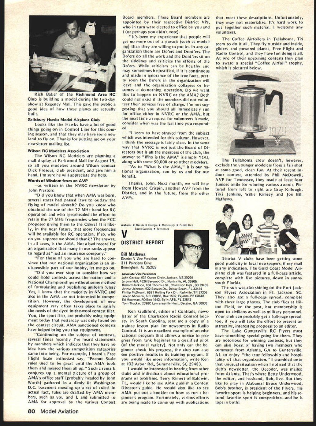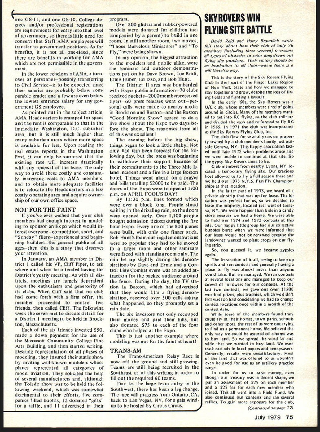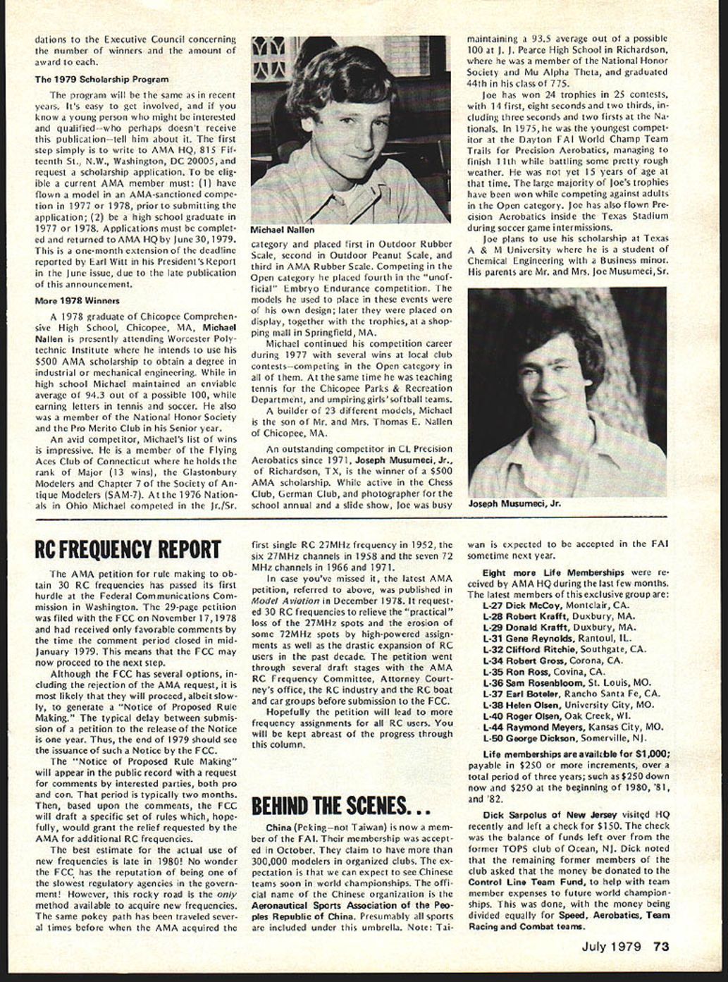 L proud parents Mr Mrs E Donald AMA SCHOLARSHIP WINNERSBrown first time history AMAs Scholarship Program girl has won top scholarship award proving ERA principles alive well among Schol arship Committee members Susan Weisenbach won 1970 recipient top award Winner $1000 scholarship 1978 Linda Brown Stone Mountain GA Lindas long list high school honors communi ty activities maintaining 389 grade average out possible 40 enough convince AMA Scholarship Committee accomplishments worthy receiving top award impres sive career model construction compe tition cinched decision Since 1970 AMA Scholarship Awards have made varying amounts appli cants doubly distinguished high grades school active careers modeling competition Also stressed community activities public service interests desirable candidates take part variety modeling school community activities well being academically exceptional Linda certain ly fulfills standards student Clarkston High School Clarkston GA graduated 1977 Linda maintained straight As Junior Senior years honor roll 8th grade through 12th mem ber National Honor Society Na tional BETA Club last three years Clark ston maintaining high grade average participated concert band march ing band symphonic band musical orchestra jazz band pep band woodwind ensemble Linda didnt tell us what instrument play also worked school newspaper editor reporter Senior year walls Lindas home must liberal ly covered awardsCertificate Excellence General Science 8th grade Certificate Excellence Algebra 9th grade Certificate Excellence English 10th grade Certificate Excellence Al gebra 1111th grade Certificate Honor Newspaper Staff Certificate Honor Na tional Honor Society Certificate Scholar ship English Certificate Scholarship Trigonometry Certificate Scholarship Accounting Medal Excellence Physics 12 grade also participated placed several school local science math fairs during school career has also active Girl Scouts Explorers Club church Somehow Linda found time build 23 model airplanes compete contests participated King Orange Interna tionals 1974 through 1978 placing 4th Payload 1976 3rd Cargo 1977 2nd Cargo Mulvihill Rubber 4th AA Gas 5th Payload 1978 1978 Na tionals Lake Charles placed 1st P-30 unofficial event 3rd Mulvihill Rubber Easy B 4th Pennyplane Indoor Peanut Scale 5th A-i Towline 8th 1AA Gas Linda entered DeKaib Community College Clarkston GA September 1977 has continued high scholastic achieve ments working 20 hours week help finance education Since DeKaib two-year college Linda will using scholarship continue studies Business Administration Georgia State University Atlanta malor Accounting Lindas initiator AMA Scholarship Pro gram Matty Sullivan Pylon Brand Pro ducts made substantial contribution purpose years ago Executive Council AMA policy-making body followed suit authorized appor tionment dues solicitations addi tional contributions fund program continuing basis Since start tile pro gram AMA has awarded total $22250 $2000 1970 same 71 no award 72 $3000 73 $4000 74 $3250 75 $1000 76 $4500 77$2000 78 number amount scholarships varies annually according number applications applicants qualifications amount money available scholarship fund Applications considered evaluated AMA Scholarship Com mittee composed following Bob Stalick Albany OR Chairman Cliff Telford Bethes da MD Bob Underwood St Louis MO John Worth Fairfax VA committee following its rating study makes recommen 72 Model Aviation Prom AMA HO Executive Director including reports AMA President Vice-Presidents r dations Executive Council concerning number winners amount award 1979 Scholarship Program prograni will same recent years Its easy get involved know young person might interested qualified--who perhaps doesnt receive publicationtell him about first step simply write AMA HQ 815 Fif teenth Sr NW Washington DC 20005 request scholarship application elig ible current AMA member must 1 have flown model AMA-sanctioned compe tion 1977 1978 prior submitting application 2 high school graduate 1977 1978 Applications must complet ed returned AMA HQ June30 1979 one-month extension deadline reported Earl Witt Presidents Report June issue due late publication announcement 1978 Winners 1978 graduate Chicopee Comprehen sive High School Chicopec MA Michael Nallen presently attending Worcester Poly technic Institute intends use $500 AMA scholarship obtain degree industrial mechanical engineering high school Michael maintained enviable average 943 out possible 100 earning letters tennis soccer also member National Honor Society Pro Merito Club Senior year An avid competitor Michaels list wins impressive member Flying Aces Club Connecticut holds rank Major 13 wins Glastonbury Modelers Chapter 7 Society An tique Modelers SAM-7 1976 Nation als Ohio Michael competed r/Sr category placed first Outdoor Rubber Scale second Outdoor Peanut Scale third AMA Rubber Scale Competing Open category placed fourth unof ficial Embryo Endurance competition models used place events own design later placed display together trophies shop ping mall Springfield MA Michael continued competition career during 1977 several wins local club contestscompeting Open category same time teaching tennis Chicopee Parks & Recreation Department umpiring girls softball teams builder 23 different models Michael son Mr Mrs Thomas E Nallen Chicopee MA An outstanding competitor CL Precision Aerobatics since 1971 Joseph Musumeci Jr Richardson TX winner $500 AMA scholarship active Chess Club German Club photographer school annual slide show joe busy maintaining 935 average out possible 100 J J Pearce High School Richardson member National Honor Society Mu Alpha Theta graduated 44th class 775 Joe has won 24 trophies 25 contests 14 first eight seconds two thirds cluding three seconds two firsts Na tionals 1975 youngest compet itor Dayton FAI World Champ Team Trails Precision Aerobatics managing finish 11th battling some pretty rough weather yet 15 years age time large majority Jo
