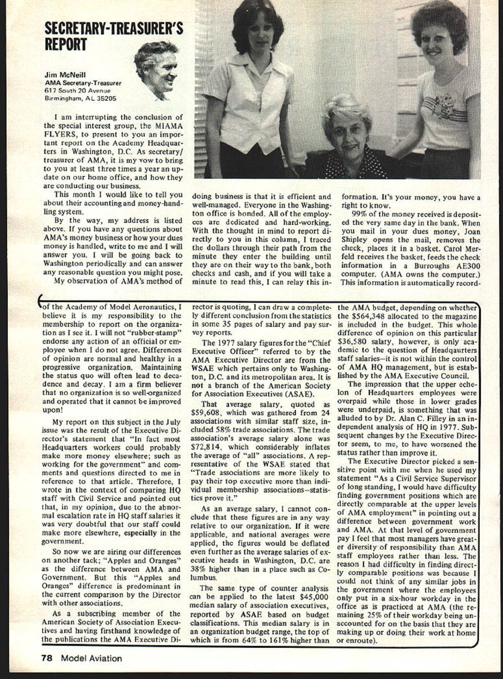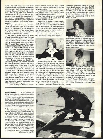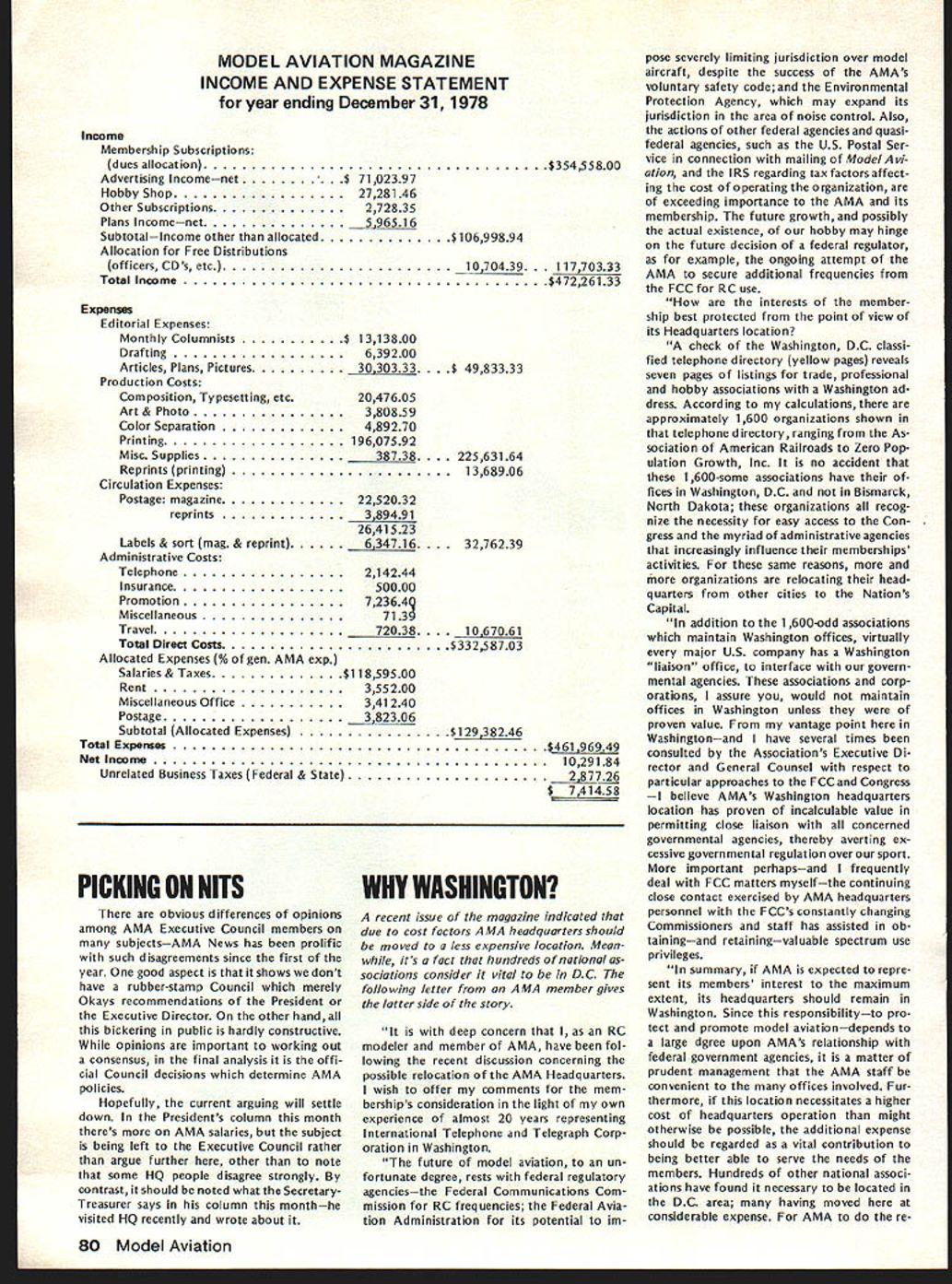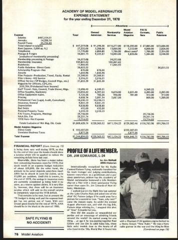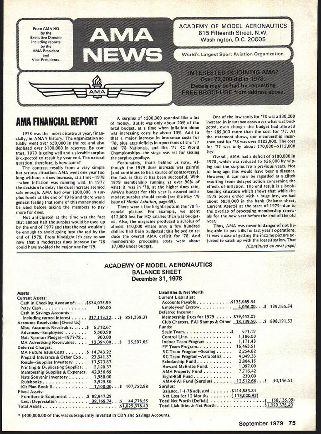 L r L AMA FINANCIAL REPORT 1978 disastrous year finan cially AMAs history organization ac tually went over $50000 red also depleted over $100000 reserves con trast 1979 going well sizeable surplus expected result year end natural question therefore come contrast results very simple serious situation AMA went year too long dues increase time1978 inflation running wild 1977 decision delay dues increase seemed safe enough AMA over $200000 sur plus funds end 1976 general feeling some money should used before asking members pay dues anticipated time fact almost half surplus would used up end 1977 rest wouldnt enough avoid going red end 1978 hindsight its easy see now moderates dues increase 78 could have avoided major 79 surplus $200000 sounded like lot money about 20% total budget time inflation alone increasing costs about 10% Add major increase insurance costs 78 plus large deficits operations 77 78 Nationals 77 RC World Championshipsthe stage set kissing surplus goodbye Fortunately thats behind us now Al though 1979 dues increase painful continues source controversy fact has successful 1979 membership running over 90% what 78 higher dues rate AMAs budget year assured modest surplus should result see May 79 issue Model v/at/on page 69 few bright spots 78 fi nancial picture example spent $12000 less HQ salaries budget ed Also magazine produced surplus almost $10000 few hundred dollars budgeted helped re duce overall AMA deficit 78 membership processing costs about $7000 under budget low spots 78 wasa $30000 increase insurance costs over what bud geted though budget allowed $85000 cost 77 As statement shows membership insur ance cost 78 over $185000 cost 77 about $70000$115000 less Overall AMA deficit $180000 1978 reduced $56000 wip ing out surplus previous years long ago would have disaster However can now regarded glitch resulting delayed action concerning effects inflation end result book keeping situation shows 1978 books ended huge loss about $850000 bank balance sheet Current Assets start 1979due overlap processing membership renew als new year before end old year Thus AMA never danger ing able pay bills last years operations case getting income picture ad justed catch up loss situation Con fin ued next page ACADEMY OF MODEL AERONAUTICS BALANCE SHEET December 31 1978 Assets Current Assets Cash Checking Accounts* 407599 Petty Cash15000 Cash Savings Accounts including earned interest unts Receivable Owed Us Misc Accounts Receivable AdvancesEmployees Nats Sponsor Pledgesi 977-78 MA Advertising Receivables __________ Deferred Charges MA Future Issue Costs $ Prepaid Insurance & Other Exp ResaleSupplies Inventory ting & Duplicating Supplies Membership Supplies & Expenses Nats Souvenir Inventory Rulebooks Kit Plan Book II Fixed Assets Furniture & Equipment Less Depreciation Total Assets iZ.ii332 $ 85133931 $ 671267 550098 90000 1239400 322 2334137 1757387 21 2037 4295665 1 98000 392950 2550765 10775298 - 94729 374$442Th55 $1 029 37849 Liabilities & Net Worth Current Liabilities Accounts Payable$1 3506954 Employees Escrow400. Deferred Income Membership Dues 197987945203 Club Charters FAI Stamps & Other j7%50 Funds Scale Team$ Control Line Indoor Team Program FF Team Program RC Team ProgramSoaring RC Team ProgramAerobatics olarship Fund Howard McEntee Fund AMA Property Fund Eight-Ball Fund AMA-FAI Fund Surplus_________ Surplus Balance 1 -1-78 adjusted Net Loss 12 Months Total Net Worth Deficit Total Liabilities & Net Worth 67119 118600 117143 1646351 225482 404933 280415 109700 771642 23000 1251266 $ 13916554 - $ 89819153 5015651 - $11488584 [v32][b-1-10-1-10]]$ 5813509 [v32][b-1-10-1-10]]$1 02937849 * $40000000 subsequently invested CDs Savings Accounts September 1979 75 AMA HO Executive Director including reports AMA President Vice-Presidents ACADEMY OF MODEL AERONAUTICS 81 5 Fifteenth Street NW Washington DC 20005 ACADEMY OF MODEL AERONAUTICS EXPENSE STATEMENT year ending December 31 1978 Expense Salaries$40715451 Annuity1433014 Payroll Taxesj3 Totai related salaries Rent approx 5000 sq ft Telephones Postage & Freight exclusive membership processing Membership processing & Postage Membership Insurance Rulebooks Public RelationsDirect Costs Scholarship ProgramNet Awards Film ProjectsProduction Travel Eq uip Rental Film LibraryHQ Service Officer Service VP Budget Council Mtgs etc Magazine Officers CDs etc $1070439 deducted Income Staff TravelNats Council Trade Shows Mtgs Office Supplies Stationery Office Equipment maint Printing Professional Fees Legal Audit Consultant Insurance General Depreciation Bad Debts Personal Property Taxes FAI Teams Programs Meetings NAA Div Fee 1978 NatsNet Expense Totals Exclusive MA Mag Dir Costs Model Aviation Magazine Direct Costs Unrelated Business Taxes Total Expense Total $ 44721908 2733206 1177080 3408173 5455368 18584162 1190593 2665555 87000 164596 2339991 231651 3185539 1249843 2205442 312526 666834 1053013 994119 962880 43200 231919 2973800 2933174 Model GeneralMembershipAviation AdministrServicesMagazine $ 9159808 328806 588480 922367 $11627700 1366600 176600 1690300 $11859500 355200 direct costs* 382306 FAI & Contests Nats $ 6708300 400000 176600 158400 5455368 18584162 1190593 Public Relations $5366600 282600 235400 254800 2665555 87000 164596 2339991 231651 3185539 624921 839702 78226 200134 1053013 994119 962880 43200 231919 661600 93800 266700 624922 263140220500 7810031200 80000 $100942974 $22036352 $41113423 $1 2938246 $ 33258703 287726 $134489403 $22036352 $41113423 $33258703 $46484675 2973800 2933174 $15678298 220500 31200 120000 $9176655 $15678298 $9176655 FINANCIAL REPORT Cont pg 75 being done very well during 1979 end year books should show surplus will applied reduce remaining deficit last year Meanwhile has major reduc tion concerning insurance costs 1979 could result expense budget reduction about $50000 other hand amount saved depends upon much AMA has absorb costs claims up $1000 per accident Until known end 1979 savings insurance costs