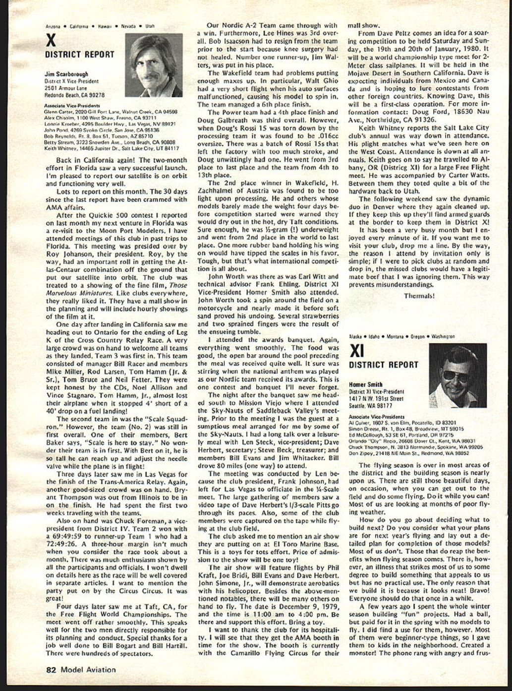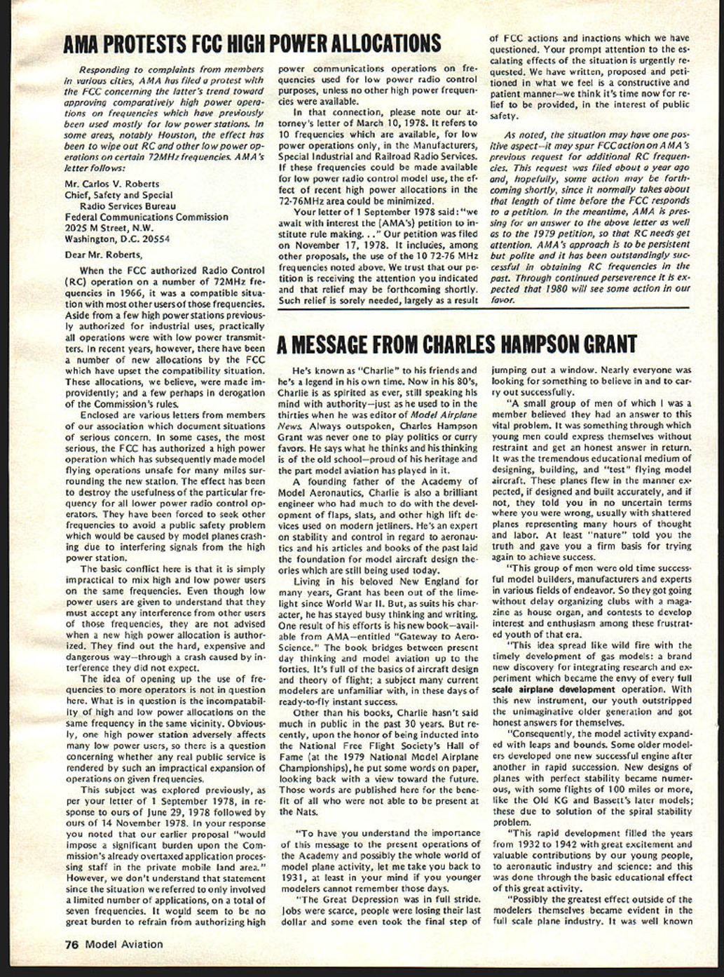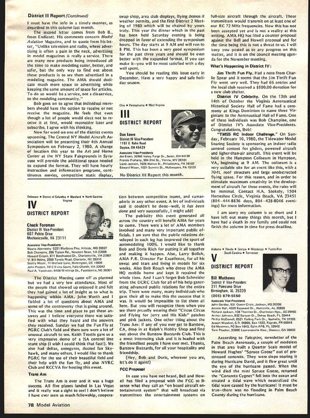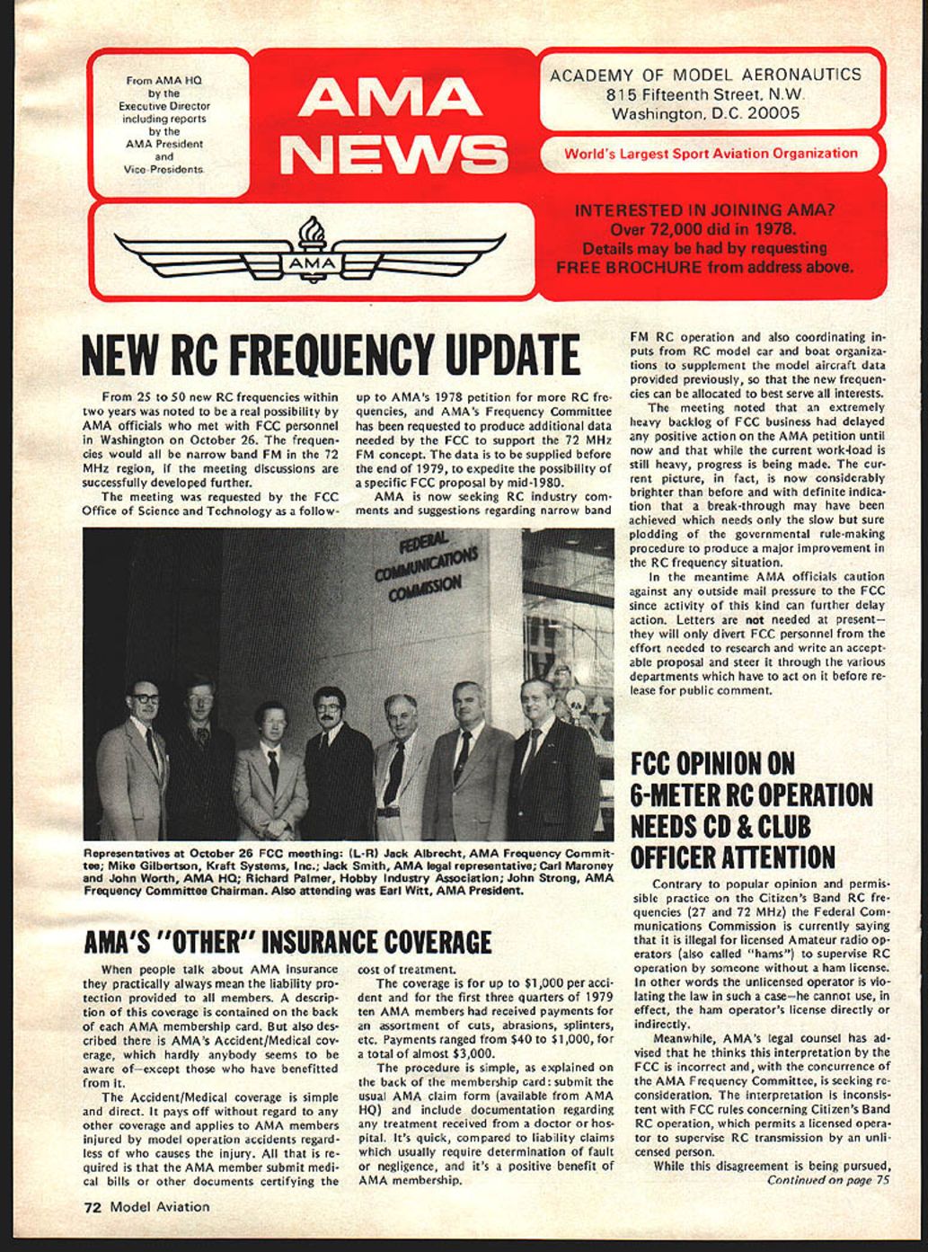 From 25 50 new RC frequencies within two years noted real possibility AMA officials met FCC personnel Washington October 26 frequen cies would narrow band FM 72 MHz region meeting discussions successfully developed further meeting requested FCC Office Science Technology followup AMAs 1978 petition RC fre quencies AMAs Frequency Committee has requested produce additional data needed FCC support 72 MHz FM concept data supplied before end 1979 expedite possibility specific FCC proposal mid-1980 AMA now seeking RC industry com ments suggestions regarding narrow band AMAS OTHER INSURANCE COVERAGE people talk about AMA insurance practically always mean liability pro tection provided members descrip tion coverage contained back AMA membership card also des cribed AMAs Accident/Medical cov erage hardly anybody seems aware ofexcept have benefitted Accident/Medical coverage simple direct pays off regard other coverage applies AMA members injured model operation accidents regard less causes injury re quired AMA member submit medi cal bills other documents certifying cost treatment coverage up $1000 per acci dent first three quarters 1979 ten AMA members received payments assortment cuts abrasions splinters etc Payments ranged $40 $1000 total almost $3000 procedure simple explained back membership card submit usual AMA claim form available AMA HQ include documentation regarding treatment received doctor hos pital Its quick compared liability claims usually require determination fault negligence its positive benefit AMA membership FM RC operation also coordinating puts RC model car boat organiza tions supplement model aircraft data provided previously new frequen cies can allocated best serve interests meeting noted extremely heavy backlog FCC business delayed positive action AMA petition until now current work-load still heavy progress being made cur rent picture fact now considerably brighter before definite indica tion break-through may have achieved needs slow sure plodding governmental rule-making procedure produce major improvement RC frequency situation meantime AMA officials caution against outside mail pressure FCC since activity kind can further delay action Letters needed present will divert FCC personnel effort needed research write accept able proposal steer through various departments have act before re lease public comment FCC OPINION ON 6-METER RC OPERATION NEEDS CD & CLUB OFFICER ATTENTION Contrary popular opinion permis sible practice Citizens Band RC fre quencies 27 72 MHz Federal Com munications Commission currently saying illegal licensed Amateur radio op erators also called hams supervise RC operation someone ham license other words unlicensed operator vio lating law such casehe cannot use effect ham operators license directly indirectly Meanwhile AMAs legal counsel has ad vised thinks interpretation FCC incorrect concurrence AMA Frequency Committee seeking re consideration interpretation inconsis tent FCC rules concerning Citizens Band RC operation permits licensed opera tor supervise RC transmission unli censed person disagreement being pursued Continued page 75 72 Model Aviation AMA HO Executive Director including reports AMA President Vice-Presidents L r ACADEMY OF MODEL AERONAUTICS 815 Fifteenth Street NW Washington DC 20005 NEW RC FREQUENCY UPDATE Representatives October 26 FCC meething L-R Jack Albrecht AMA Frequency Commit tee Mike Gilbe-tson Kraft Systems Inc Jack Smith AMA legal representative Carl Maroney John Worth AMA Ha Richard Palmer Hobby Industry Association John Strong AMA Frequency Committee Chairman Also attending Earl Witt AMA President Presidents OUTLK Earl F Witt 26 Warwick Drive Chambersburg PA 17201 MORE RC FREQUENCY PROGRESS have arranged meeting between AMA Frequency Committee AMA Legal Representative Representatives RC Industry FCC 26th October will report pro gress next months column SPECIAL INTEREST GROUPS As might recall during campaign President 1978 said would aim toward supporting working special interest groups within AMAusing profes sional sources input toward goals AMA August Executive Council Meeting actions taken realize effort AMA Executive Council has authority accept organization advisory capacity has no basis verifying whether group truly representative AMA special interest members nine special terest groups represented Council Meeting art open discussion held Council Members agreed recognized group should have some form organized communication such newsletter due vast difference group organization finance no other means credibility could estab lished problem will agenda again future Council Meetings stands now groups will judged case-by-case basis special terest group seeking recognition must present credentials Council FLYING SITES Did know no less five Federal agencies position offer areas flying sites Na tional Committee Urban Recreation has written seven agencies making spe cific suggestions agency could make proposals encourage rec reational opportunities infor mation some suggestions follows Department Housing Urban Development HUD expand FHAs Property Release Option Pro gram could maximize opportun ities free low cost transfer local governments repossessed properties development recreation Department Health Edu cation Welfare HEW implement 78 Community Schools Act pro vide new recreation opportunities through joint use schools communi ty centers private facilities Environmental Protection Agency EPA give technical assistance state local agency grant recipi ents ways incorporate supple mental park recreation uses within projects Department Defense DOD determine land other Federal land could used management lands must handled General Services Adminis tration GSA ask guidelines sistance providing recreation facilities existing new Federal properties well assisting local governments land banking surplus properties National Committee formed 78 composed mayors county rep resentatives leaders urban social equity recreational environmen