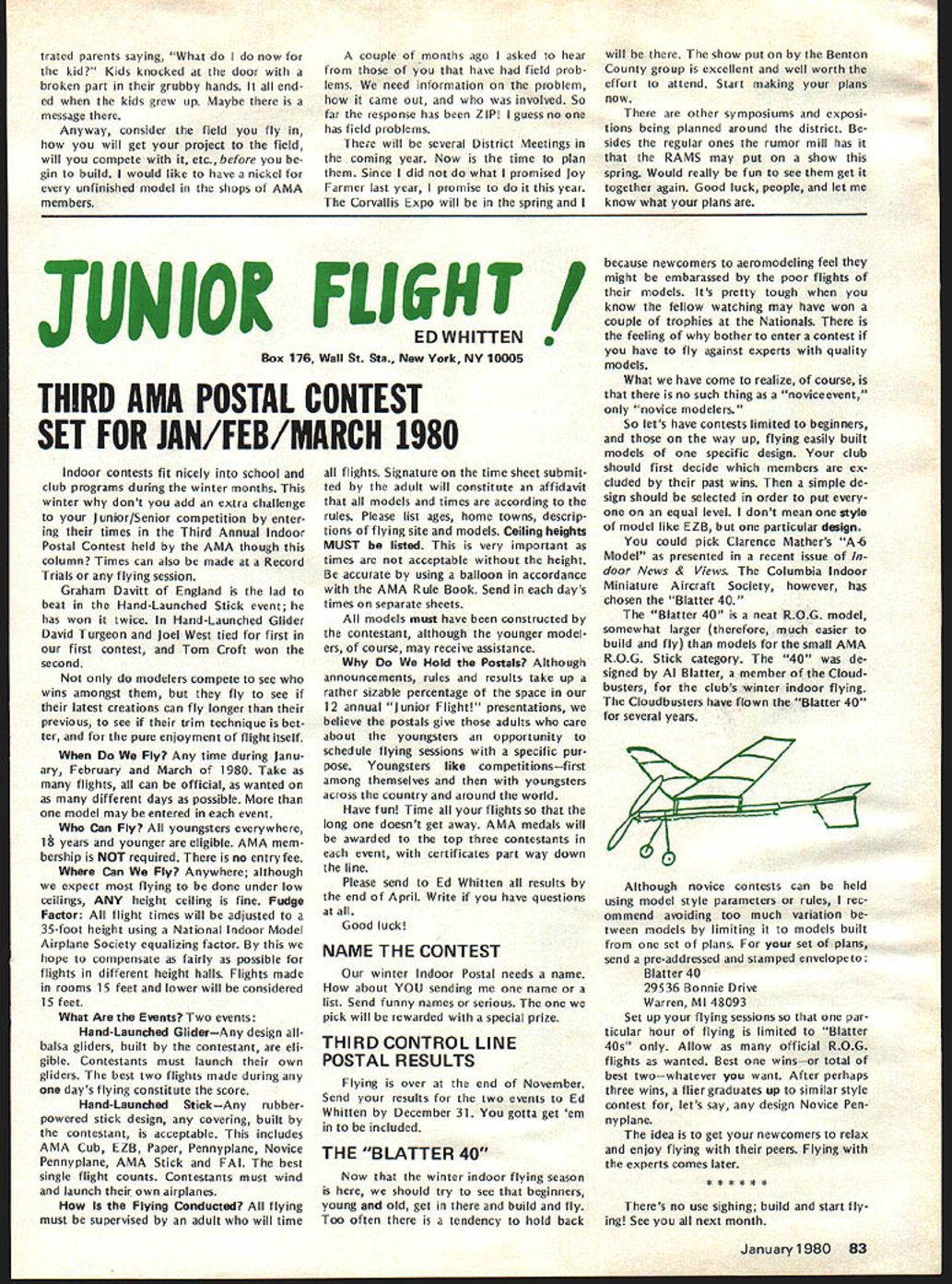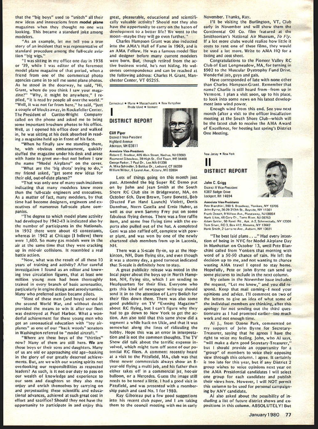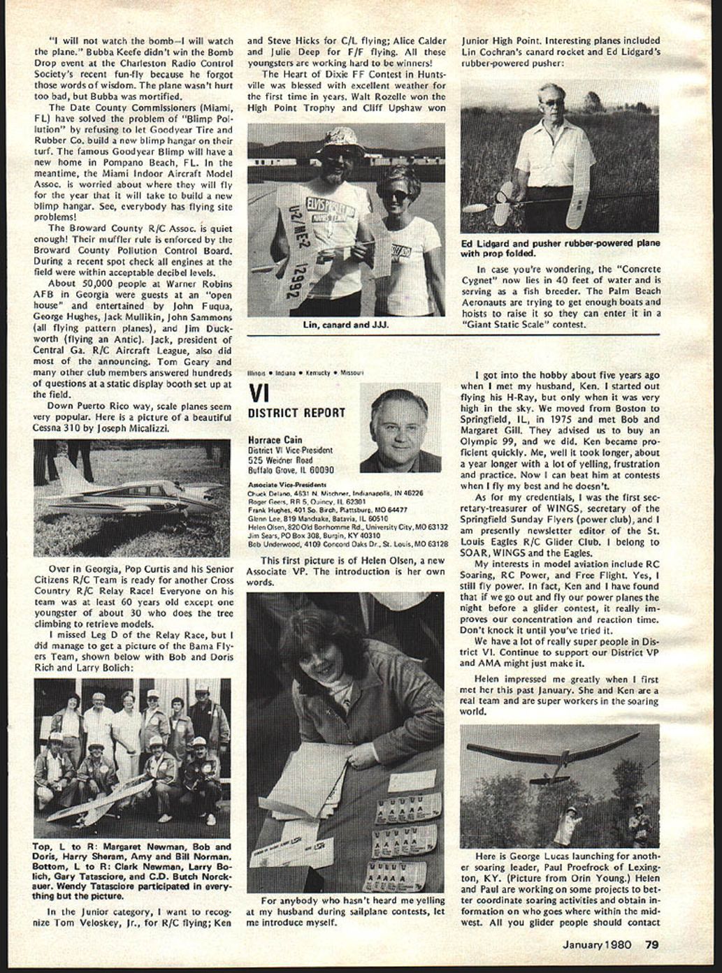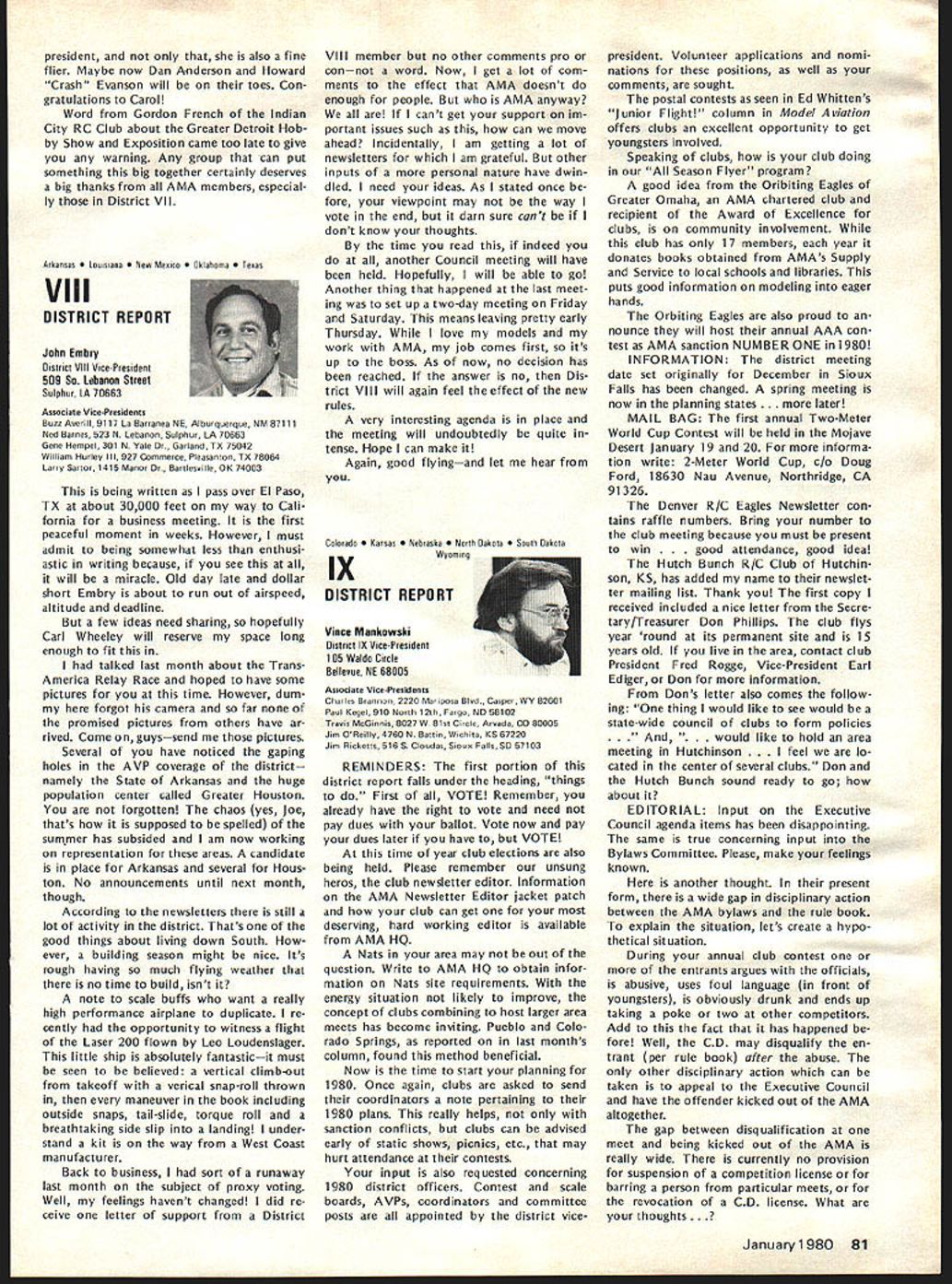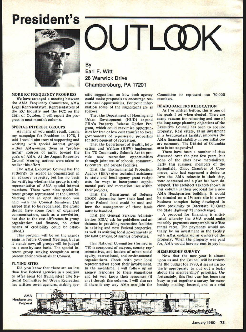 From 25 50 new RC frequencies within two years noted real possibility AMA officials met FCC personnel Washington October 26 frequen cies would narrow band FM 72 MHz region meeting discussions successfully developed further meeting requested FCC Office Science Technology followup AMAs 1978 petition RC fre quencies AMAs Frequency Committee has requested produce additional data needed FCC support 72 MHz FM concept data supplied before end 1979 expedite possibility specific FCC proposal mid-1980 AMA now seeking RC industry com ments suggestions regarding narrow band AMAS OTHER INSURANCE COVERAGE people talk about AMA insurance practically always mean liability pro tection provided members descrip tion coverage contained back AMA membership card also des cribed AMAs Accident/Medical cov erage hardly anybody seems aware ofexcept have benefitted Accident/Medical coverage simple direct pays off regard other coverage applies AMA members injured model operation accidents regard less causes injury re quired AMA member submit medi cal bills other documents certifying cost treatment coverage up $1000 per acci dent first three quarters 1979 ten AMA members received payments assortment cuts abrasions splinters etc Payments ranged $40 $1000 total almost $3000 procedure simple explained back membership card submit usual AMA claim form available AMA HQ include documentation regarding treatment received doctor hos pital Its quick compared liability claims usually require determination fault negligence its positive benefit AMA membership FM RC operation also coordinating puts RC model car boat organiza tions supplement model aircraft data provided previously new frequen cies can allocated best serve interests meeting noted extremely heavy backlog FCC business delayed positive action AMA petition until now current work-load still heavy progress being made cur rent picture fact now considerably brighter before definite indica tion break-through may have achieved needs slow sure plodding governmental rule-making procedure produce major improvement RC frequency situation meantime AMA officials caution against outside mail pressure FCC since activity kind can further delay action Letters needed present will divert FCC personnel effort needed research write accept able proposal steer through various departments have act before re lease public comment FCC OPINION ON 6-METER RC OPERATION NEEDS CD & CLUB OFFICER ATTENTION Contrary popular opinion permis sible practice Citizens Band RC fre quencies 27 72 MHz Federal Com munications Commission currently saying illegal licensed Amateur radio op erators also called hams supervise RC operation someone ham license other words unlicensed operator vio lating law such casehe cannot use effect ham operators license directly indirectly Meanwhile AMAs legal counsel has ad vised thinks interpretation FCC incorrect concurrence AMA Frequency Committee seeking re consideration interpretation inconsis tent FCC rules concerning Citizens Band RC operation permits licensed opera tor supervise RC transmission unli censed person disagreement being pursued Continued page 75 72 Model Aviation AMA HO Executive Director including reports AMA President Vice-Presidents L r ACADEMY OF MODEL AERONAUTICS 815 Fifteenth Street NW Washington DC 20005 NEW RC FREQUENCY UPDATE Representatives October 26 FCC meething L-R Jack Albrecht AMA Frequency Commit tee Mike Gilbe-tson Kraft Systems Inc Jack Smith AMA legal representative Carl Maroney John Worth AMA Ha Richard Palmer Hobby Industry Association John Strong AMA Frequency Committee Chairman Also attending Earl Witt AMA President Presidents OUTLK Earl F Witt 26 Warwick Drive Chambersburg PA 17201 MORE RC FREQUENCY PROGRESS have arranged meeting between AMA Frequency Committee AMA Legal Representative Representatives RC Industry FCC 26th October will report pro gress next months column SPECIAL INTEREST GROUPS As might recall during campaign President 1978 said would aim toward supporting working special interest groups within AMAusing profes sional sources input toward goals AMA August Executive Council Meeting actions taken realize effort AMA Executive Council has authority accept organization advisory capacity has no basis verifying whether group truly representative AMA special interest members nine special terest groups represented Council Meeting art open discussion held Council Members agreed recognized group should have some form organized communication such newsletter due vast difference group organization finance no other means credibility could estab lished problem will agenda again future Council Meetings stands now groups will judged case-by-case basis special terest group seeking recognition must present credentials Council FLYING SITES Did know no less five Federal agencies position offer areas flying sites Na tional Committee Urban Recreation has written seven agencies making spe cific suggestions agency could make proposals encourage rec reational opportunities infor mation some suggestions follows Department Housing Urban Development HUD expand FHAs Property Release Option Pro gram could maximize opportun ities free low cost transfer local governments repossessed properties development recreation Department Health Edu cation Welfare HEW implement 78 Community Schools Act pro vide new recreation opportunities through joint use schools communi ty centers private facilities Environmental Protection Agency EPA give technical assistance state local agency grant recipi ents ways incorporate supple mental park recreation uses within projects Department Defense DOD determine land other Federal land could used management lands must handled General Services Adminis tration GSA ask guidelines sistance providing recreation facilities existing new Federal properties well assisting local governments land banking surplus properties National Committee formed 78 composed mayors county rep resentatives leaders urban social equity recreational environmen