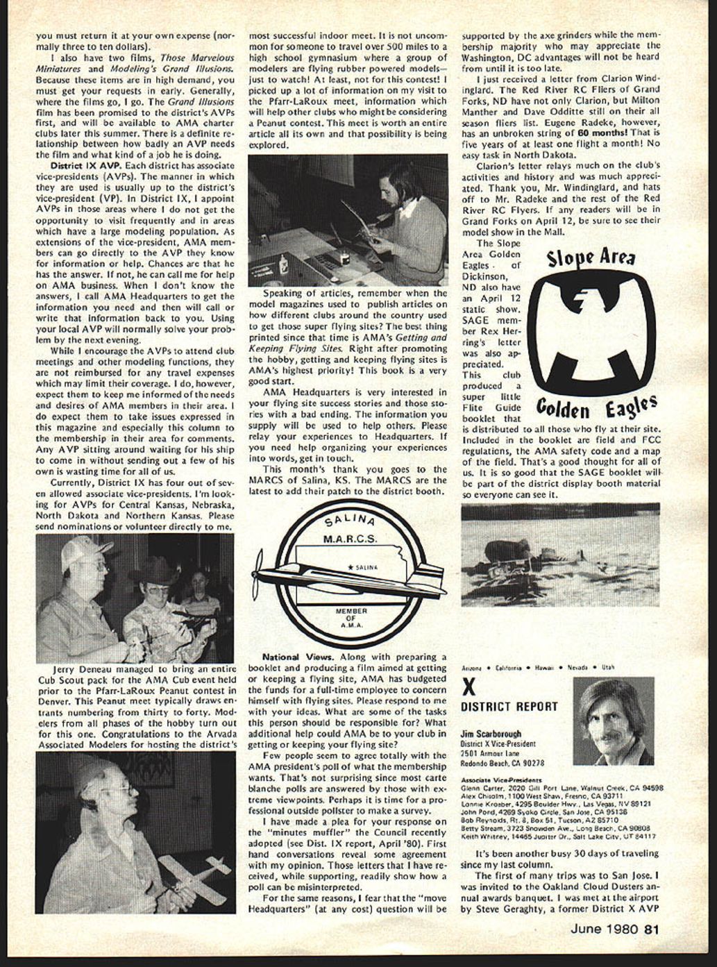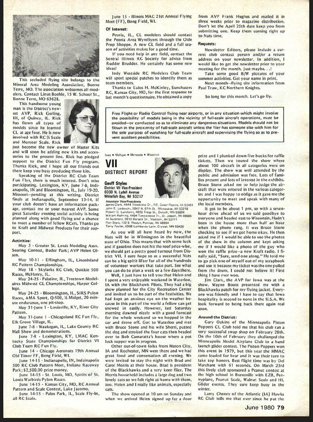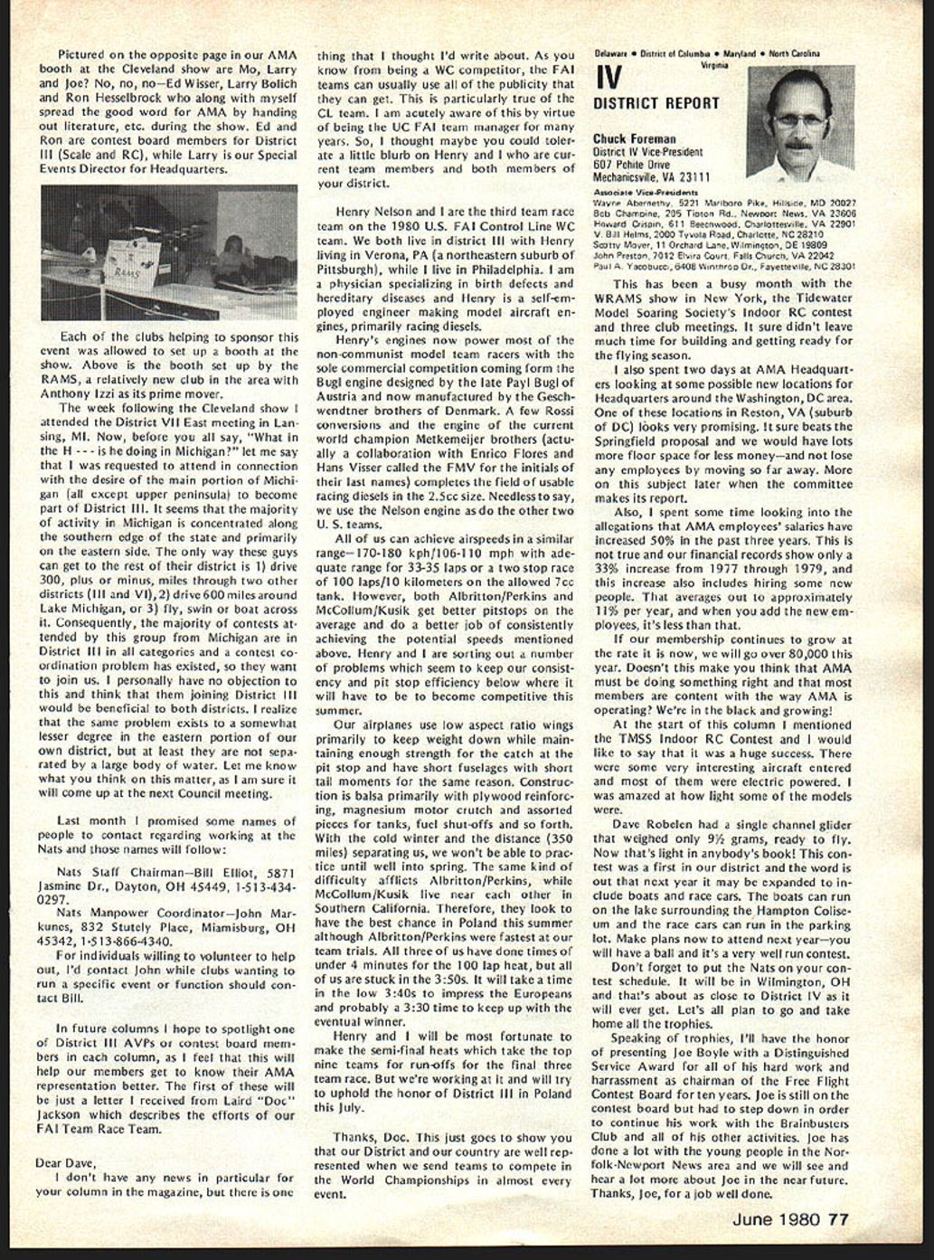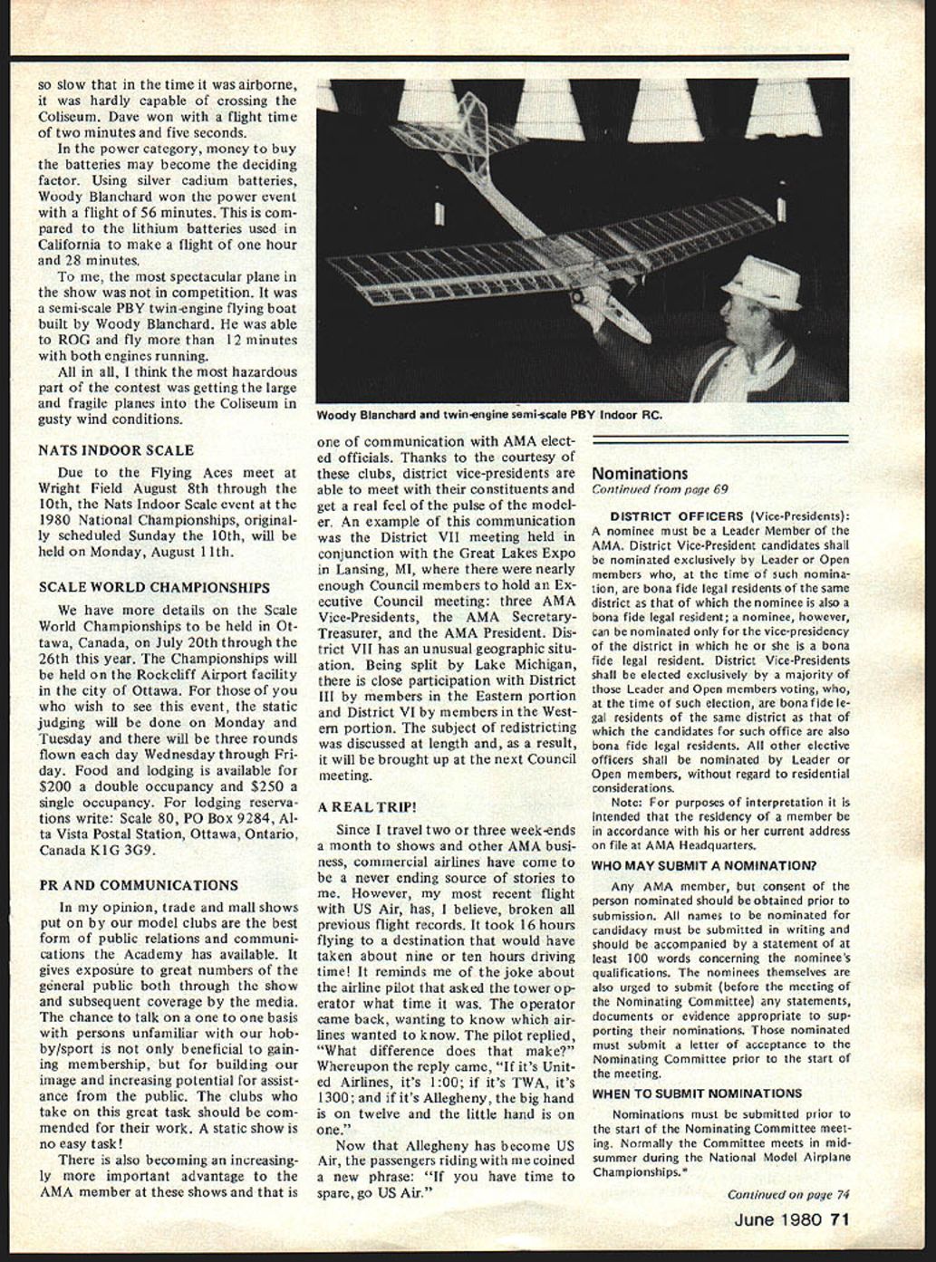CO Wright OOSat 84 AMAs sixth President born 1895 passed away February Topeka KS lived years pursued extremely busy life education field AMAers know him best ardent Free Flight competitor National Cham pionships name winners lists through years particularly SOs early 60s As AMA President helped guide ganization through growing pains immedi ately following World War lihis term 1948 through 1949 During time U S Navy began hosting AMA Na tional Championships program lasted 25 years 1948 through 1972 first two Nats under program held Olathe KS earlier Nats held Wichita 1946 C 0 executive secretary Kansas State Teachers Association 1941 1965 joined association associate secretary 1935 During World War served two years army two years Royal Air Force France motorcycle transport master sergeant wars end few soldiers awarded years scholarship college work abroad attended Queens University Belfast Ireland returned attend University Missotri graduating bachelor arts masters degrees Wright served reporter Mexico Mo Ledger Columbia MO Tribune 13 years teacher later prin cipal Atchison High School executive secretary KSTA also editor Kansas Teacher maga zine 24 years twice president Educational Press Association America co-author high school sociology textbook wrote two-volume book History Kansas Education twice elected president National Association Secretaries State Teachers Associations Wright served White House Con ference Education 1945 1955 White House Conference Children Youth 1940 1950 model airplane activities won state national awards included working boys interested model avia tion Honors bestowed him work N education included National Education Association Founders Commemorative Award foresight interest confidence Kan sas youth made honorary fellow Academy Model Aeronautics 1959 elected Academys Hall Fame 1976 1978 National Free Flight Soci ety elected him its Hall Fame Ill health recent years kept C 0 model fields loved kept up AMA activities through Council Past Presidents mostly involved helping others get recognized AMAs Hall Fame Hes gone model scene now memory will linger through others inspired competed him So long C 0 yours perpetual thermal *0 0 Sa Free F lighters term Out Sight meaning gone forgotten AMA Officer Election 1980 Nomination Procedures Document even-numbered years elec tion national office AMA President regional Vice-Presidents evennumbered AMA districts II IV VI VIII X odd-numbered years election national office AMA SecretaryTreasurer regional Vice-Presidents odd-numbered AMA districts III V VII IX XI Officers elected serve two years following year election took place CANDIDATE MINIMUM STANDARDS NATIONAL OFFICERS President Sec retary-Treasurer nominee must AMA Leader Member note Contest Di rectors also Leader Members must also have served least year prior beginning term office either elec ted officer AMA such Vice-Presi dent officer directly appointed President Vice-Presidents such Contest Board member Contest Coordinator Committee Chairman Note Committee members merely approved President Vice-President considered officers Continued page 71 June 1980 69 AMA HO Executive Director including reports AMA President Vice-Presidents An eminent figure educational field man talentsindeed man seasonsCO Wright widely beloved knew him year brought car full young chaps Natsthey came known COs boys competed won challenging events ranging FF scale FF power helicopters PAA Cargo wise mild gentleman top picture reveals talked shop us Nats hot summers day came down roughed competitor below boys fond ly remember great man profound loss Presidents OUTLQDK Earl F Witt 26 Warwick Drive Chambersburg PA 17201 As first March have able devote time being AMA PresidentI have retired As know elected officers AMA paid officers must work have some source income sustain fulfilling obligations office result officers usually have two jobs survival dictates paying job receives primary atten tion Now being retired job AMA President will receive primary attention have secondary job will take back seat model aviation day retired offered two jobs accepted adaptable irregular schedule As part-time flight instructor Chambersburg Aviation full scale student pilots scheduled hours have free AMA re sponsibilities Its probably few times history full scale fly ing has work its schedule around model flying past year Ive received letters members deserved response because time limita tions job have unable make Although after month re tirement am still finding isnt enough time day honest hope will able better job President responding rep resenting memberships needs ANOTHER RETIREE As trying catch up backlog club newsletters read Feedback newsletter Hous ton RC Club John Kiker has re tired NASA unfamiliar Johns achievements responsible development prototype RC model used design ing Enterprise Space Shuttle efforts advancement aviation received Special Presidential Com mendation owe much John pres tige advancement has lent model aviation through efforts know speak us wishing him happy flying retirement PAST AMA PRESIDENT SERIOUSLY ILL Kenneth Held seventh President Academy Model Aeronautics seriously ill hospital Ann Arbor MI members 1950 51 Ken vital link growth organi zation Ken reinstituted cooperative ties model industry put Academy stronger financial basis through budgeting other financial policies old-timers would like write him St Joseph Mercy Hos pital Ann Arbor MI 48103 INDOOR RC relatively new phase hobby/sport reinforcing model builders reputation ingenuity latest meet type held Hampton Coliseum Hampton VA two categories glider power excluding internal combus tion engines Most contestants entered both categories cases merely adapting electric power unit glider airplane components pow er event majority models en tered using very light mylar film coating used Gossa mer Condor English Channel flights Typical gliders although light extremely large compared door models used conventional ra dio equipment An examp