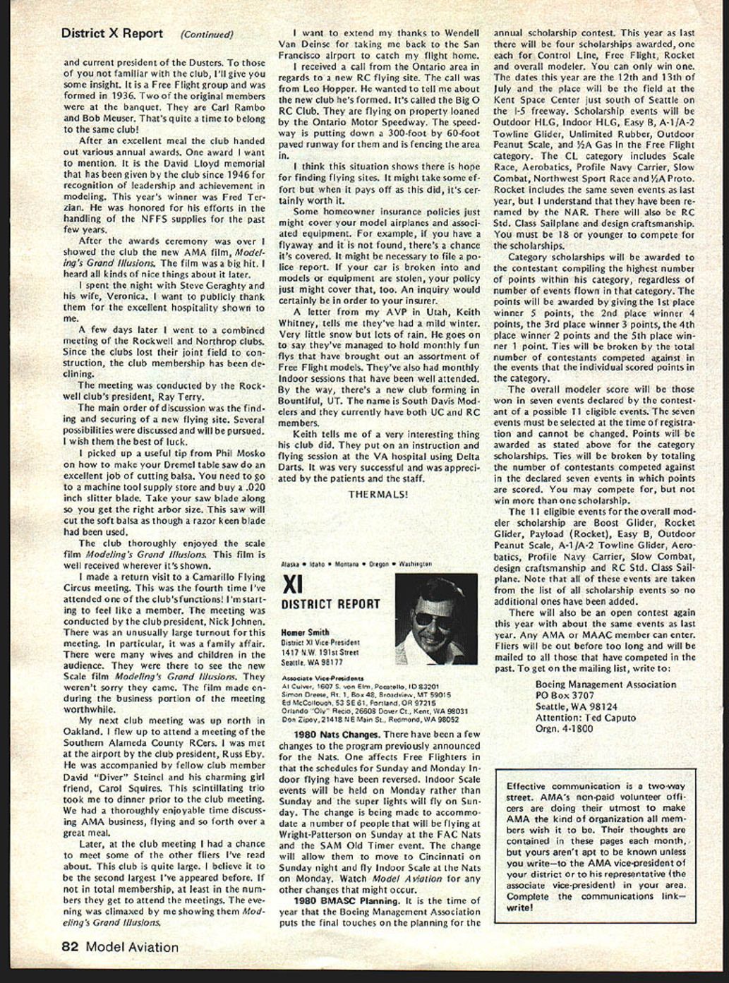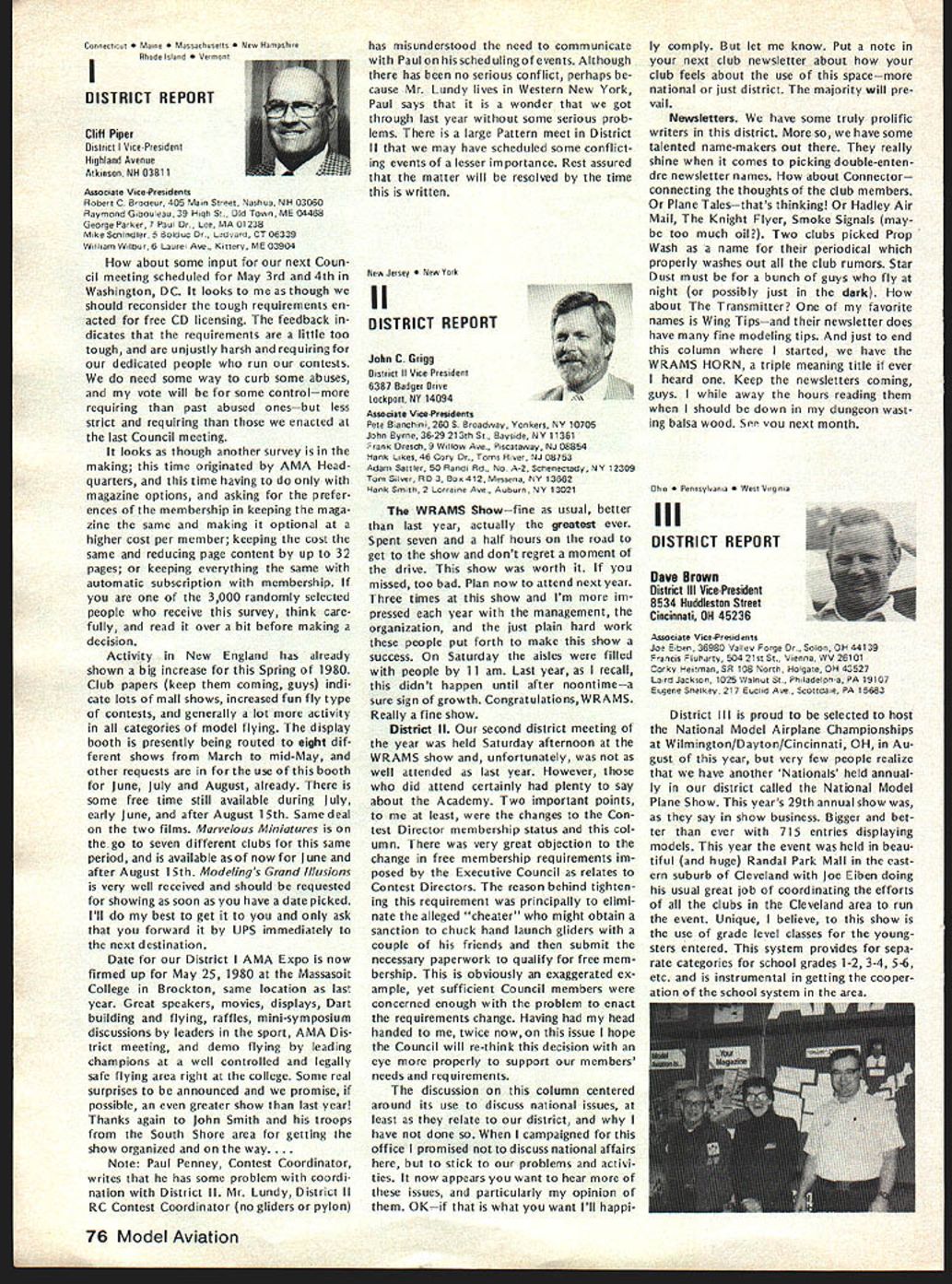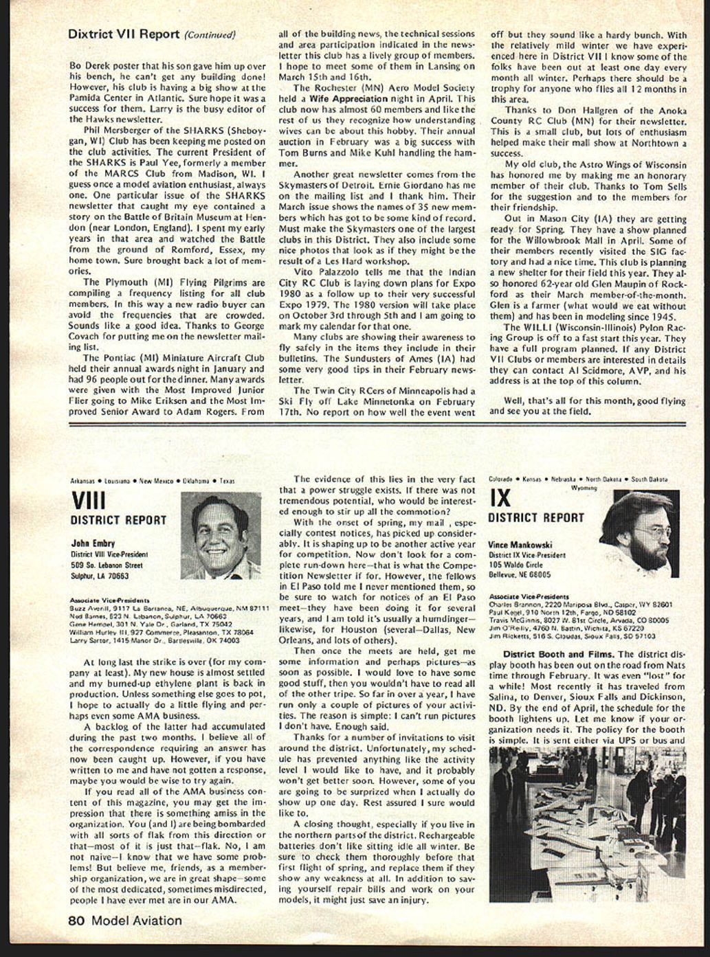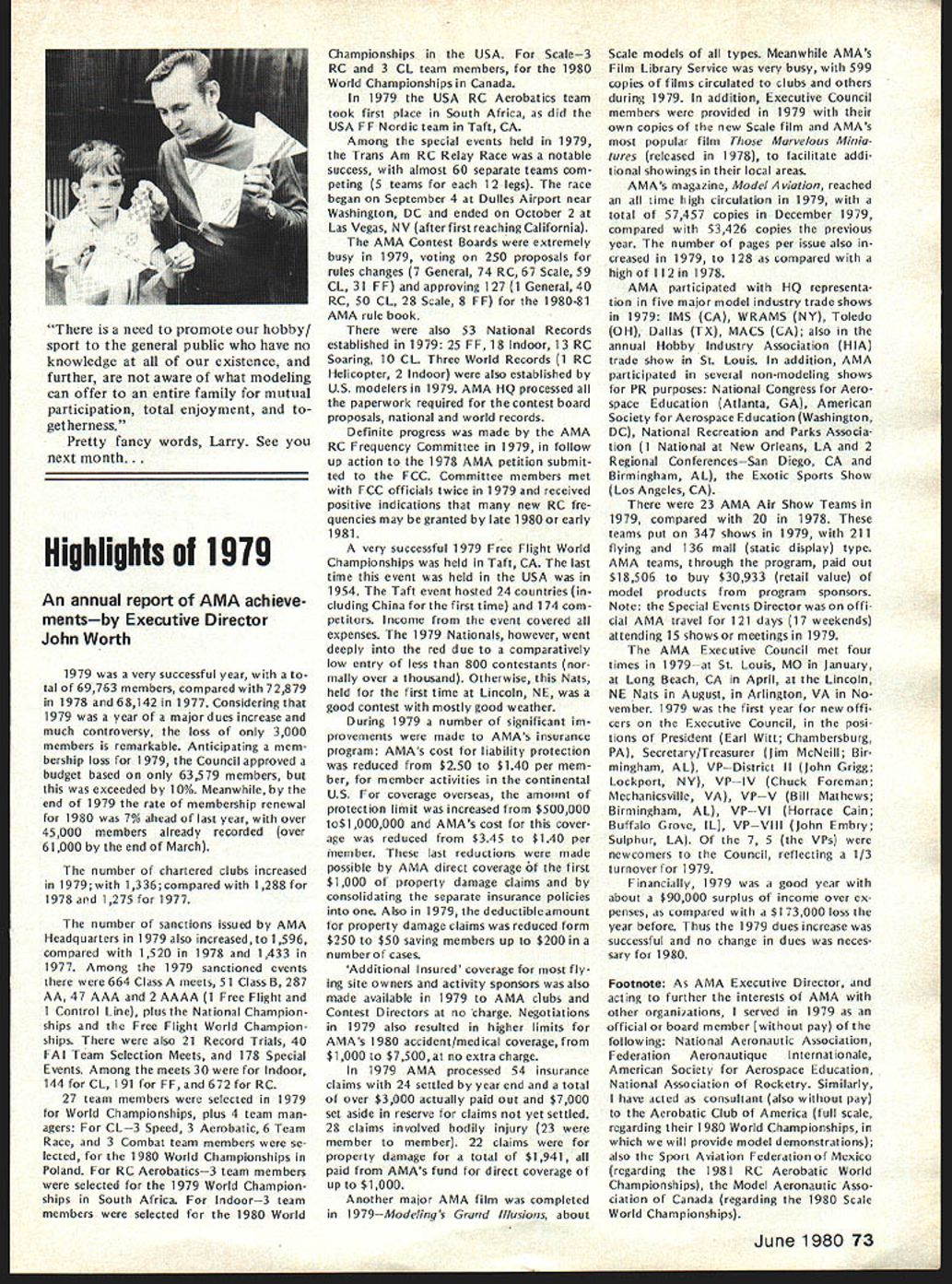CO Wright OOSat 84 AMAs sixth President born 1895 passed away February Topeka KS lived years pursued extremely busy life education field AMAers know him best ardent Free Flight competitor National Cham pionships name winners lists through years particularly SOs early 60s As AMA President helped guide ganization through growing pains immedi ately following World War lihis term 1948 through 1949 During time U S Navy began hosting AMA Na tional Championships program lasted 25 years 1948 through 1972 first two Nats under program held Olathe KS earlier Nats held Wichita 1946 C 0 executive secretary Kansas State Teachers Association 1941 1965 joined association associate secretary 1935 During World War served two years army two years Royal Air Force France motorcycle transport master sergeant wars end few soldiers awarded years scholarship college work abroad attended Queens University Belfast Ireland returned attend University Missotri graduating bachelor arts masters degrees Wright served reporter Mexico Mo Ledger Columbia MO Tribune 13 years teacher later prin cipal Atchison High School executive secretary KSTA also editor Kansas Teacher maga zine 24 years twice president Educational Press Association America co-author high school sociology textbook wrote two-volume book History Kansas Education twice elected president National Association Secretaries State Teachers Associations Wright served White House Con ference Education 1945 1955 White House Conference Children Youth 1940 1950 model airplane activities won state national awards included working boys interested model avia tion Honors bestowed him work N education included National Education Association Founders Commemorative Award foresight interest confidence Kan sas youth made honorary fellow Academy Model Aeronautics 1959 elected Academys Hall Fame 1976 1978 National Free Flight Soci ety elected him its Hall Fame Ill health recent years kept C 0 model fields loved kept up AMA activities through Council Past Presidents mostly involved helping others get recognized AMAs Hall Fame Hes gone model scene now memory will linger through others inspired competed him So long C 0 yours perpetual thermal *0 0 Sa Free F lighters term Out Sight meaning gone forgotten AMA Officer Election 1980 Nomination Procedures Document even-numbered years elec tion national office AMA President regional Vice-Presidents evennumbered AMA districts II IV VI VIII X odd-numbered years election national office AMA SecretaryTreasurer regional Vice-Presidents odd-numbered AMA districts III V VII IX XI Officers elected serve two years following year election took place CANDIDATE MINIMUM STANDARDS NATIONAL OFFICERS President Sec retary-Treasurer nominee must AMA Leader Member note Contest Di rectors also Leader Members must also have served least year prior beginning term office either elec ted officer AMA such Vice-Presi dent officer directly appointed President Vice-Presidents such Contest Board member Contest Coordinator Committee Chairman Note Committee members merely approved President Vice-President considered officers Continued page 71 June 1980 69 AMA HO Executive Director including reports AMA President Vice-Presidents An eminent figure educational field man talentsindeed man seasonsCO Wright widely beloved knew him year brought car full young chaps Natsthey came known COs boys competed won challenging events ranging FF scale FF power helicopters PAA Cargo wise mild gentleman top picture reveals talked shop us Nats hot summers day came down roughed competitor below boys fond ly remember great man profound loss Presidents OUTLQDK Earl F Witt 26 Warwick Drive Chambersburg PA 17201 As first March have able devote time being AMA PresidentI have retired As know elected officers AMA paid officers must work have some source income sustain fulfilling obligations office result officers usually have two jobs survival dictates paying job receives primary atten tion Now being retired job AMA President will receive primary attention have secondary job will take back seat model aviation day retired offered two jobs accepted adaptable irregular schedule As part-time flight instructor Chambersburg Aviation full scale student pilots scheduled hours have free AMA re sponsibilities Its probably few times history full scale fly ing has work its schedule around model flying past year Ive received letters members deserved response because time limita tions job have unable make Although after month re tirement am still finding isnt enough time day honest hope will able better job President responding rep resenting memberships needs ANOTHER RETIREE As trying catch up backlog club newsletters read Feedback newsletter Hous ton RC Club John Kiker has re tired NASA unfamiliar Johns achievements responsible development prototype RC model used design ing Enterprise Space Shuttle efforts advancement aviation received Special Presidential Com mendation owe much John pres tige advancement has lent model aviation through efforts know speak us wishing him happy flying retirement PAST AMA PRESIDENT SERIOUSLY ILL Kenneth Held seventh President Academy Model Aeronautics seriously ill hospital Ann Arbor MI members 1950 51 Ken vital link growth organi zation Ken reinstituted cooperative ties model industry put Academy stronger financial basis through budgeting other financial policies old-timers would like write him St Joseph Mercy Hos pital Ann Arbor MI 48103 INDOOR RC relatively new phase hobby/sport reinforcing model builders reputation ingenuity latest meet type held Hampton Coliseum Hampton VA two categories glider power excluding internal combus tion engines Most contestants entered both categories cases merely adapting electric power unit glider airplane components pow er event majority models en tered using very light mylar film coating used Gossa mer Condor English Channel flights Typical gliders although light extremely large compared door models used conventional ra dio equipment An examp