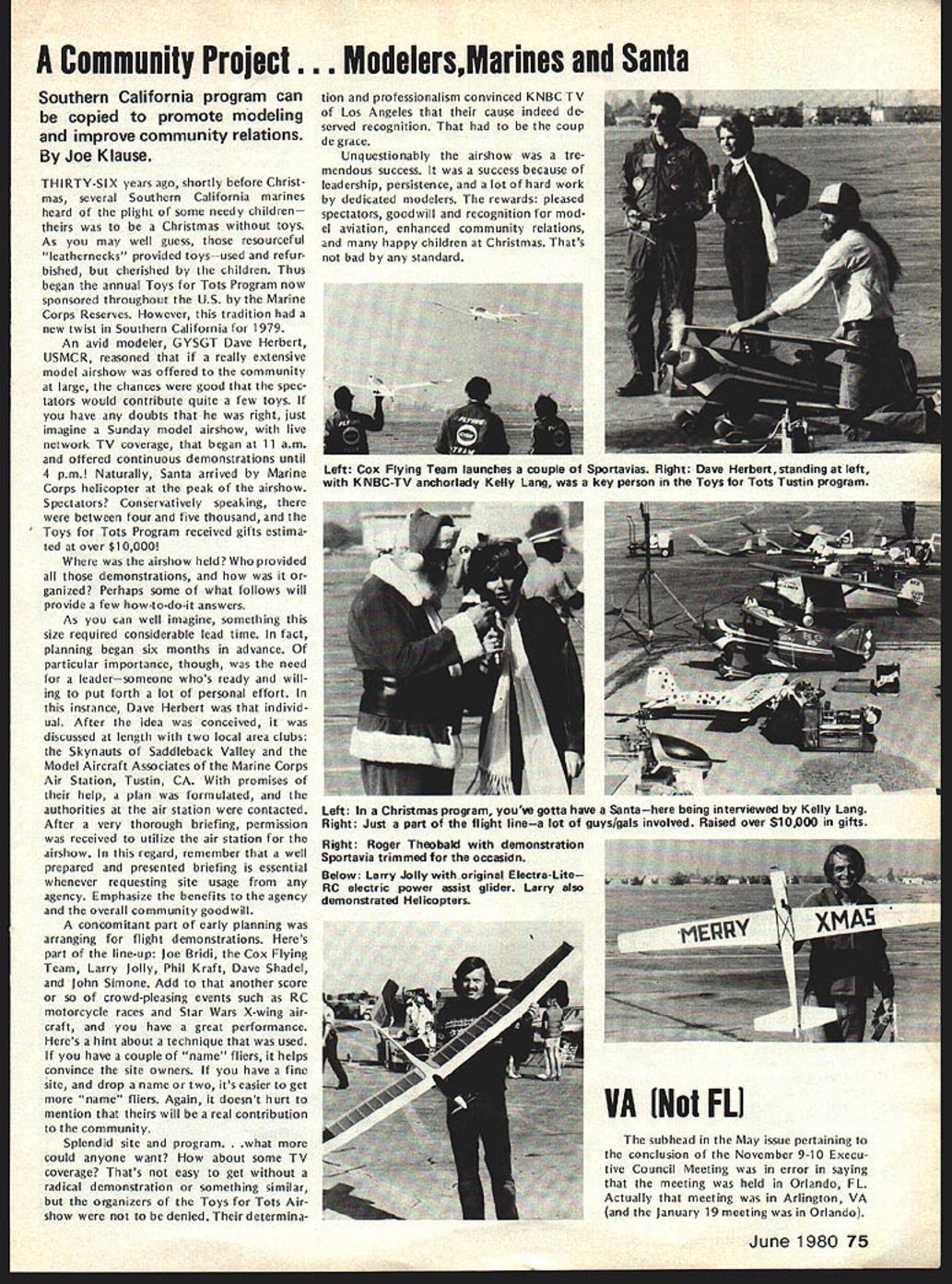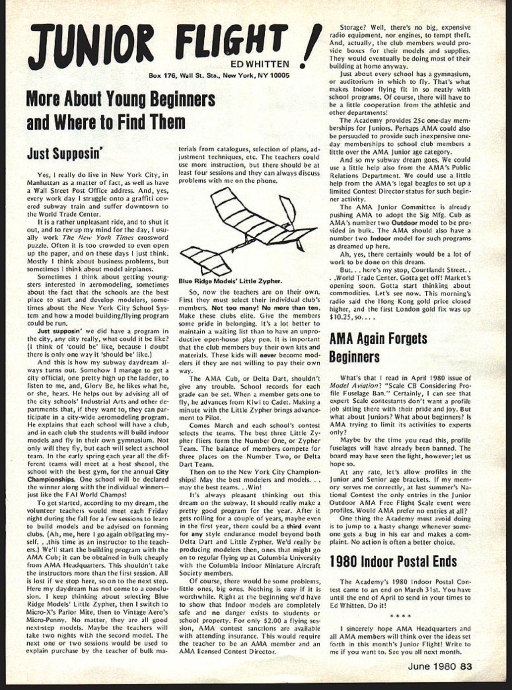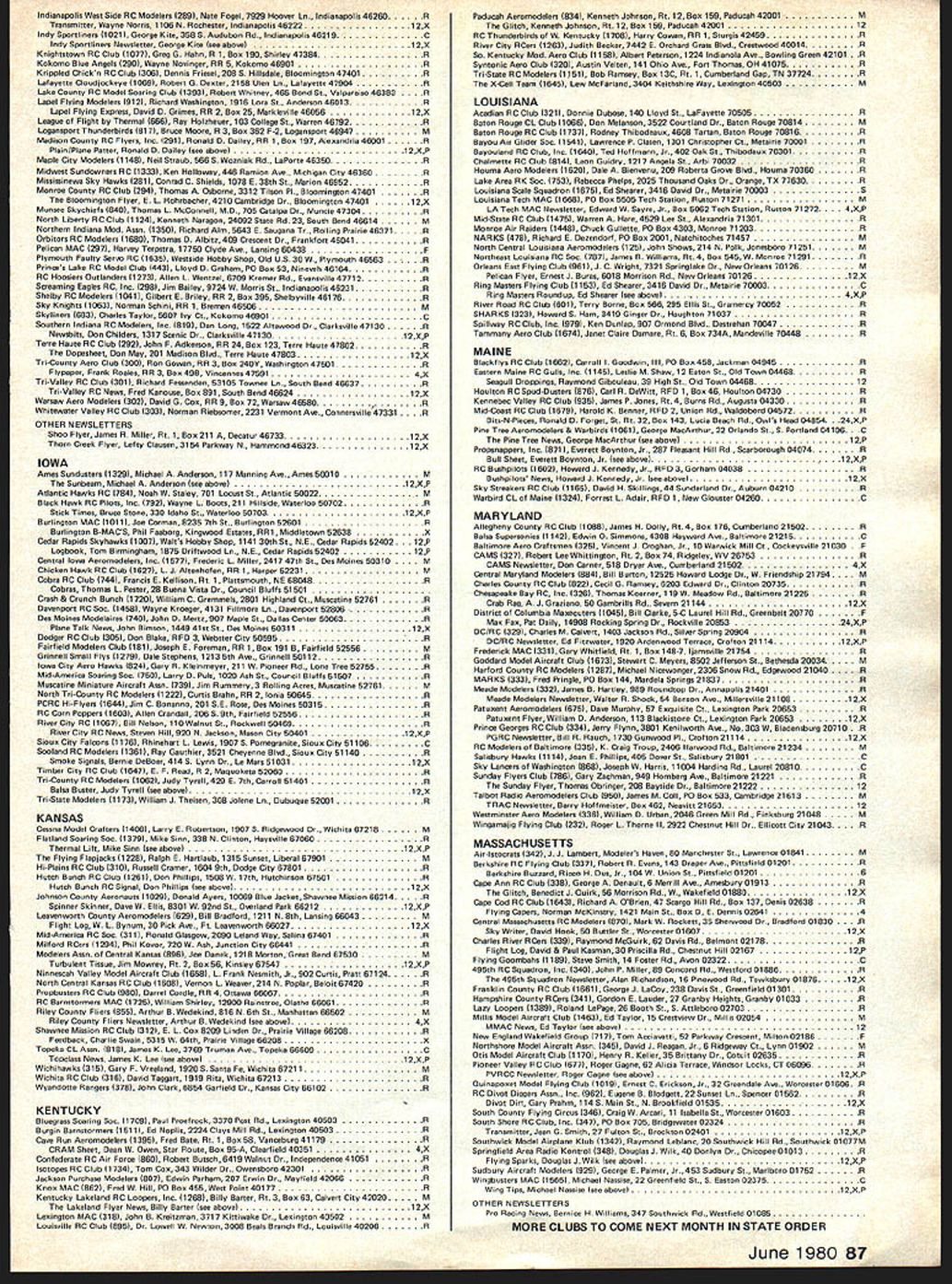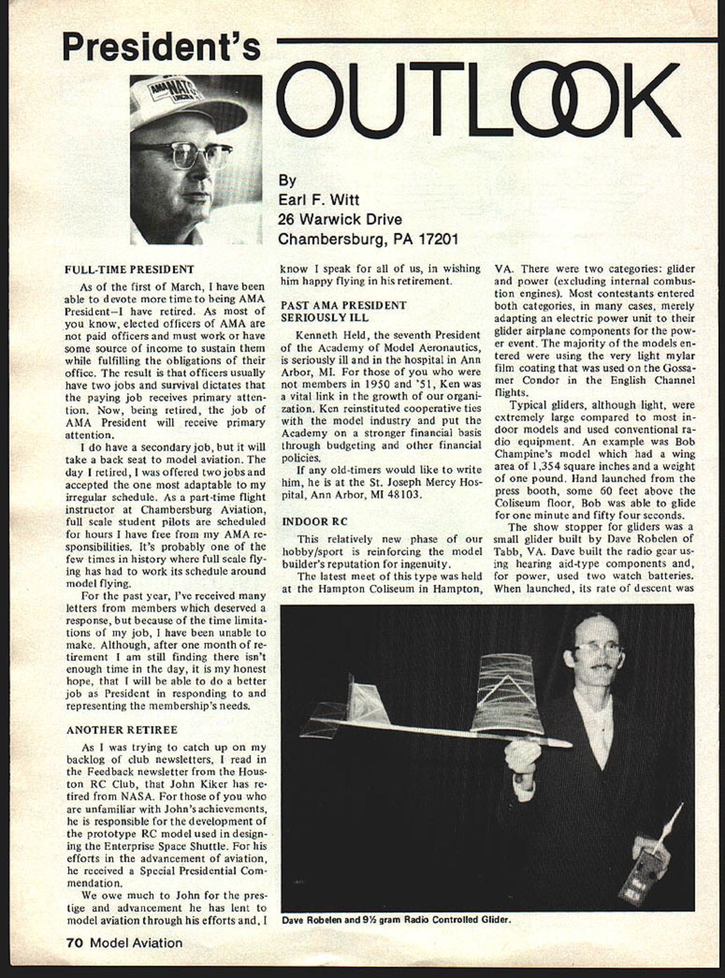 CO Wright OOSat 84 AMAs sixth President born 1895 passed away February Topeka KS lived years pursued extremely busy life education field AMAers know him best ardent Free Flight competitor National Cham pionships name winners lists through years particularly SOs early 60s As AMA President helped guide ganization through growing pains immedi ately following World War lihis term 1948 through 1949 During time U S Navy began hosting AMA Na tional Championships program lasted 25 years 1948 through 1972 first two Nats under program held Olathe KS earlier Nats held Wichita 1946 C 0 executive secretary Kansas State Teachers Association 1941 1965 joined association associate secretary 1935 During World War served two years army two years Royal Air Force France motorcycle transport master sergeant wars end few soldiers awarded years scholarship college work abroad attended Queens University Belfast Ireland returned attend University Missotri graduating bachelor arts masters degrees Wright served reporter Mexico Mo Ledger Columbia MO Tribune 13 years teacher later prin cipal Atchison High School executive secretary KSTA also editor Kansas Teacher maga zine 24 years twice president Educational Press Association America co-author high school sociology textbook wrote two-volume book History Kansas Education twice elected president National Association Secretaries State Teachers Associations Wright served White House Con ference Education 1945 1955 White House Conference Children Youth 1940 1950 model airplane activities won state national awards included working boys interested model avia tion Honors bestowed him work N education included National Education Association Founders Commemorative Award foresight interest confidence Kan sas youth made honorary fellow Academy Model Aeronautics 1959 elected Academys Hall Fame 1976 1978 National Free Flight Soci ety elected him its Hall Fame Ill health recent years kept C 0 model fields loved kept up AMA activities through Council Past Presidents mostly involved helping others get recognized AMAs Hall Fame Hes gone model scene now memory will linger through others inspired competed him So long C 0 yours perpetual thermal *0 0 Sa Free F lighters term Out Sight meaning gone forgotten AMA Officer Election 1980 Nomination Procedures Document even-numbered years elec tion national office AMA President regional Vice-Presidents evennumbered AMA districts II IV VI VIII X odd-numbered years election national office AMA SecretaryTreasurer regional Vice-Presidents odd-numbered AMA districts III V VII IX XI Officers elected serve two years following year election took place CANDIDATE MINIMUM STANDARDS NATIONAL OFFICERS President Sec retary-Treasurer nominee must AMA Leader Member note Contest Di rectors also Leader Members must also have served least year prior beginning term office either elec ted officer AMA such Vice-Presi dent officer directly appointed President Vice-Presidents such Contest Board member Contest Coordinator Committee Chairman Note Committee members merely approved President Vice-President considered officers Continued page 71 June 1980 69 AMA HO Executive Director including reports AMA President Vice-Presidents An eminent figure educational field man talentsindeed man seasonsCO Wright widely beloved knew him year brought car full young chaps Natsthey came known COs boys competed won challenging events ranging FF scale FF power helicopters PAA Cargo wise mild gentleman top picture reveals talked shop us Nats hot summers day came down roughed competitor below boys fond ly remember great man profound loss Presidents OUTLQDK Earl F Witt 26 Warwick Drive Chambersburg PA 17201 As first March have able devote time being AMA PresidentI have retired As know elected officers AMA paid officers must work have some source income sustain fulfilling obligations office result officers usually have two jobs survival dictates paying job receives primary atten tion Now being retired job AMA President will receive primary attention have secondary job will take back seat model aviation day retired offered two jobs accepted adaptable irregular schedule As part-time flight instructor Chambersburg Aviation full scale student pilots scheduled hours have free AMA re sponsibilities Its probably few times history full scale fly ing has work its schedule around model flying past year Ive received letters members deserved response because time limita tions job have unable make Although after month re tirement am still finding isnt enough time day honest hope will able better job President responding rep resenting memberships needs ANOTHER RETIREE As trying catch up backlog club newsletters read Feedback newsletter Hous ton RC Club John Kiker has re tired NASA unfamiliar Johns achievements responsible development prototype RC model used design ing Enterprise Space Shuttle efforts advancement aviation received Special Presidential Com mendation owe much John pres tige advancement has lent model aviation through efforts know speak us wishing him happy flying retirement PAST AMA PRESIDENT SERIOUSLY ILL Kenneth Held seventh President Academy Model Aeronautics seriously ill hospital Ann Arbor MI members 1950 51 Ken vital link growth organi zation Ken reinstituted cooperative ties model industry put Academy stronger financial basis through budgeting other financial policies old-timers would like write him St Joseph Mercy Hos pital Ann Arbor MI 48103 INDOOR RC relatively new phase hobby/sport reinforcing model builders reputation ingenuity latest meet type held Hampton Coliseum Hampton VA two categories glider power excluding internal combus tion engines Most contestants entered both categories cases merely adapting electric power unit glider airplane components pow er event majority models en tered using very light mylar film coating used Gossa mer Condor English Channel flights Typical gliders although light extremely large compared door models used conventional ra dio equipment An examp