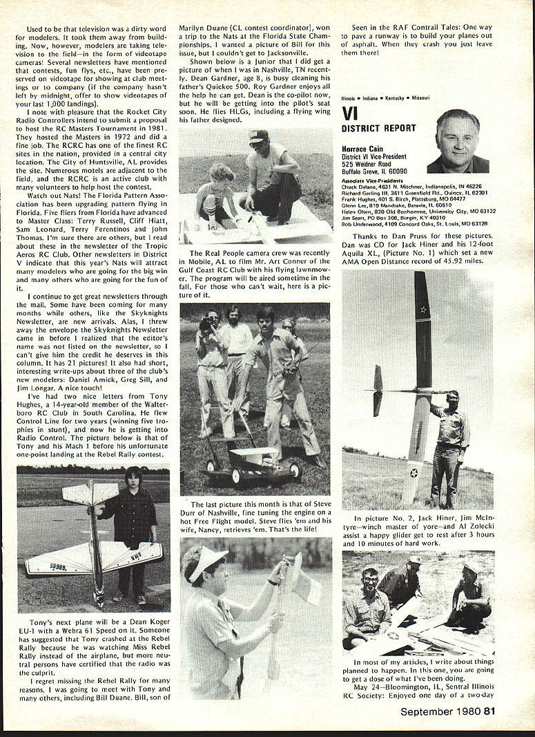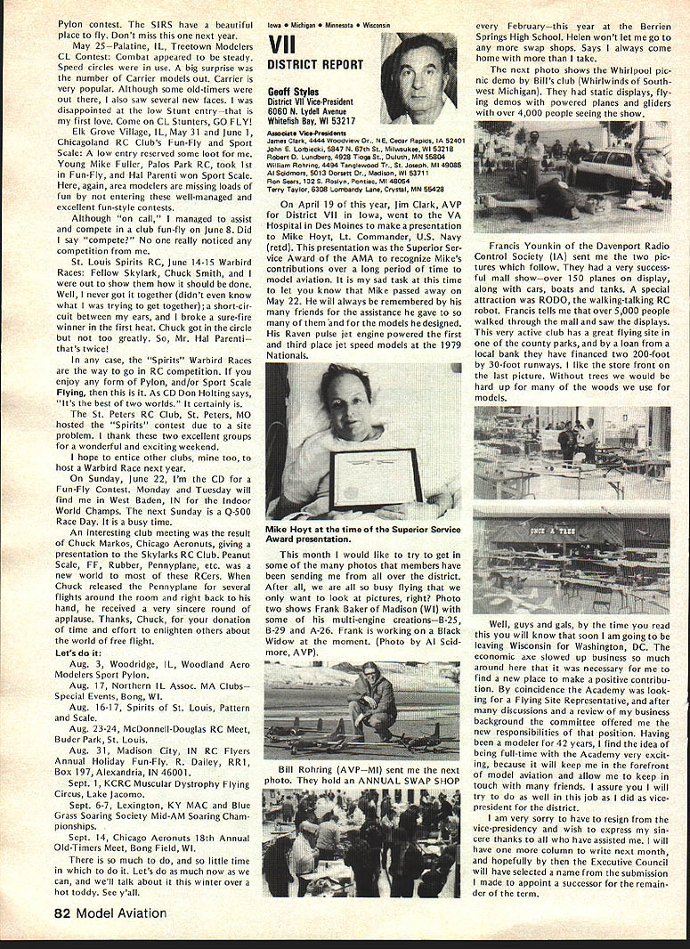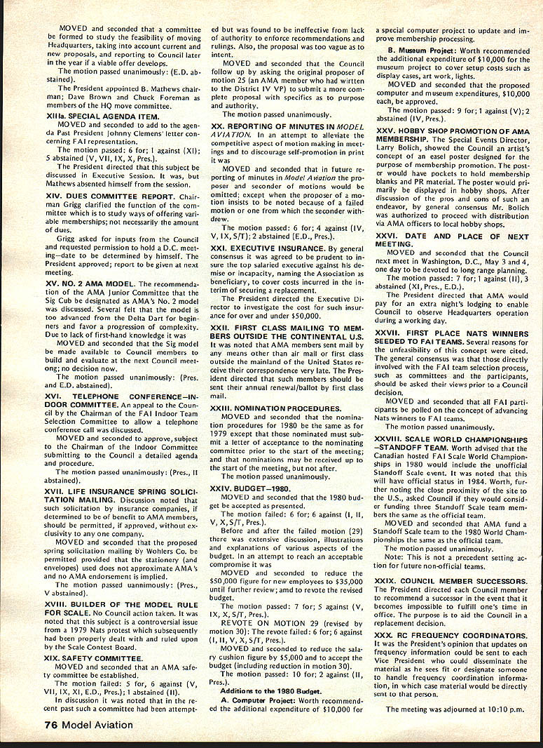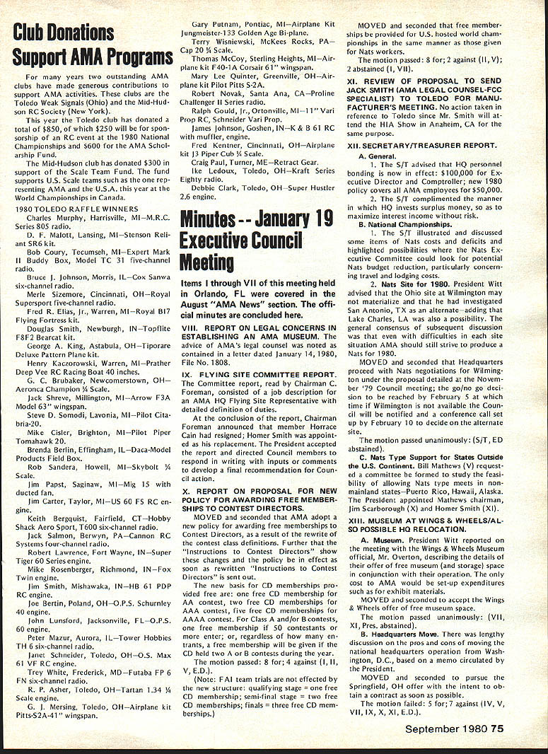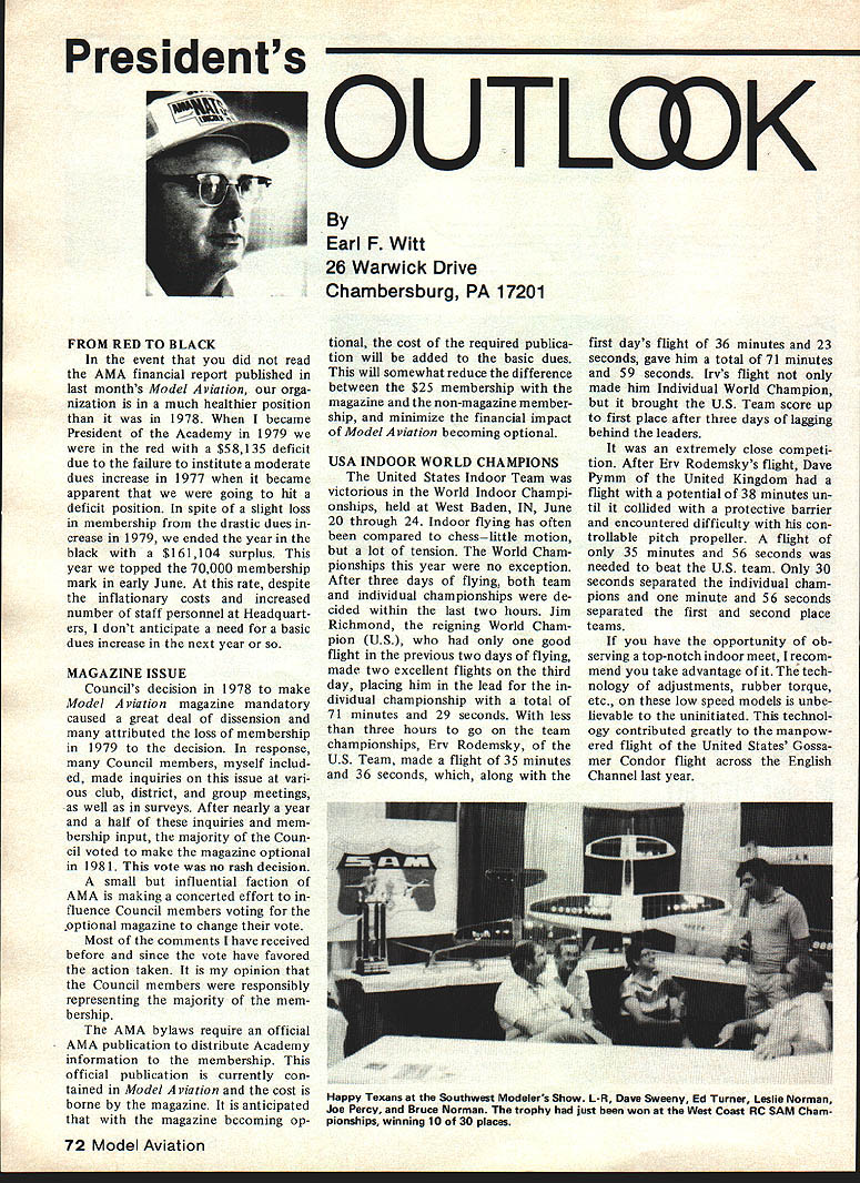 r AMA HQ Executive Director including reports AMA President Vice-Presidents L L Homeowners Coverage Model Aircraft article originally appeared October 1979 issue reprinted now benefit may have missed first time around Ever since courts Pennsylvania up held ruling excludes model aircraft coverage homeowners insurance policy has confusion over whether AMAs liability protection primary sec ondary subject described Model viation magazine March 79 issue page 73 also RC Modeler magazine August 79 issue page 60 Regardless AMAs coverage applies other coverage doesnt So surest protec tion AMA member covered automatically However should rash claims against AMAs coverage its reasonable expect AMAs cost go up ultimate effect amount AMA dues Obviously therefore desirable re verse situation because Penn sylvania ruling model aircraft treated same full-scale people-carrying aircraft likely happen because pow insurance companies have alerted idea model aircraft accidents can ex pensive though rare like ly go back previous situation models regarded toys unlikely cause problems So though Pennsylvania decision commonly regarded ridiculous chances overturning slim thing legal fight reversal courts would expensive idea holding down costs compromised theres another approach successfully applied already has restored model aircraft coverage some homeowners policies no extra cost idea has advised Alex Chisolm AMA member also independent insurance agent Alex AMA District X Vice-President few years ago long-time leader model activities Fresno area California provides insurance protection number West Coast model firms insur ance companies provided AMAs basic mem bership coverage awhile during mid-70s Thus Alex knows business sugges tion no mere pipe dream What has done endorsement added homeowner policies says aircraft exclusion clause does apply model boats model airplanes Such re quest coming independent insurance agent has some weight Alex has gotten ac ceptance number modeling clients several different companies can can others Its worth try goal starting movement get insurance com panies accept models what Alexs own words subject concerning case homeowners insurer denied claim court backed up claiming RC model airplane just much aircraft passengercarrying 747 might have made both insurer court look absolutely ridicu lous its fact life insurer can find loophole big claim would pretty stupid go ahead pay About 15 years ago could see possi bility type thing happening forms coverage specifically de signed aircraft airports allied activ ity written aircraft insurers insurers write homeowners policies Homeowners policies include liability surance kinds hobbies sports cluding golf hunting fishing baseball whatever first introduced about 1954 same aircraft exclusion used still use today Since have discovered RC insurance companies havent discovered us feel have legitimate need theyll remove aircraft ex clusion fly model airplanes Back 1964 Harold Cox AMA member claims manager leading insurance company worked out clarification intent aircraft exclusion al lows insurance company insure liability model airplanes Since time have insured several model airplane enthusiasts primary lia bility attaching endorsement homeowners policy business liability policy did submit wording company have always accepted made clarification part policy have never yet submitted endorse ment turned down knowl edgeable underwriter understood agreed fol lowing wording applies modify aircraft exclusion follows aircraft exclusion relating watercraft aircraft does ap ply model boats model airplanes hobby variety September 198071 Lots ot action tfle busy AMA ooorn auring Soutnwi Modelers onow iw waL Headquarters staff member Carl Maroney foreground assisted local AMA volun teers Velma Teubner Helen Randolph Presidents OUTLc3DK Earl F Witt 26 Warwick Drive Chambersburg PA 17201 FROM RED TO BLACK event did read AMA financial report published last months Model Aviation orga nization much healthier position 1978 became President Academy 1979 red $58135 deficit due failure institute moderate dues increase 1977 became apparent going hit deficit position spite slight loss membership drastic dues crease 1979 ended year black $161104 surplus year topped 70000 membership mark early June rate despite inflationary costs increased number staff personnel Headquart ers dont anticipate need basic dues increase next year MAGAZINE ISSUE Councils decision 1978 make Model viation magazine mandatory caused great deal dissension attributed loss membership 1979 decision response Council members myself includ ed made inquiries issue vari ous club district group meetings -as well surveys After nearly year half inquiries mem bership input majority Coun cil voted make magazine optional 1981 vote no rash decision small influential faction AMA making concerted effort fluence Council members voting pptional magazine change vote Most comments have received before since vote have favored action taken opinion Council members responsibly representing majority mem bership AMA bylaws require official AMA publication distribute Academy information membership official publication currently con tained Model Aviation cost borne magazine anticipated magazine becoming op tional cost required publica tion will added basic dues will somewhat reduce difference between $25 membership magazine non-magazine member ship minimize financial impact Model viation becoming optional USA INDOOR WORLD CHAMPIONS United States Indoor Team victorious World Indoor Champi onships held West Baden IN June 20 through 24 Indoor flying has often compared chesslittle motion lot tension World Cham pionships year no exception After three days flying both team individual championships de cided within last two hours Jim Richmond reigning World Cham pion US good flight previous two days flying made two excellent flights third day placing him lead dividual championship total 71 minutes 29 seconds less three hours go team ch
