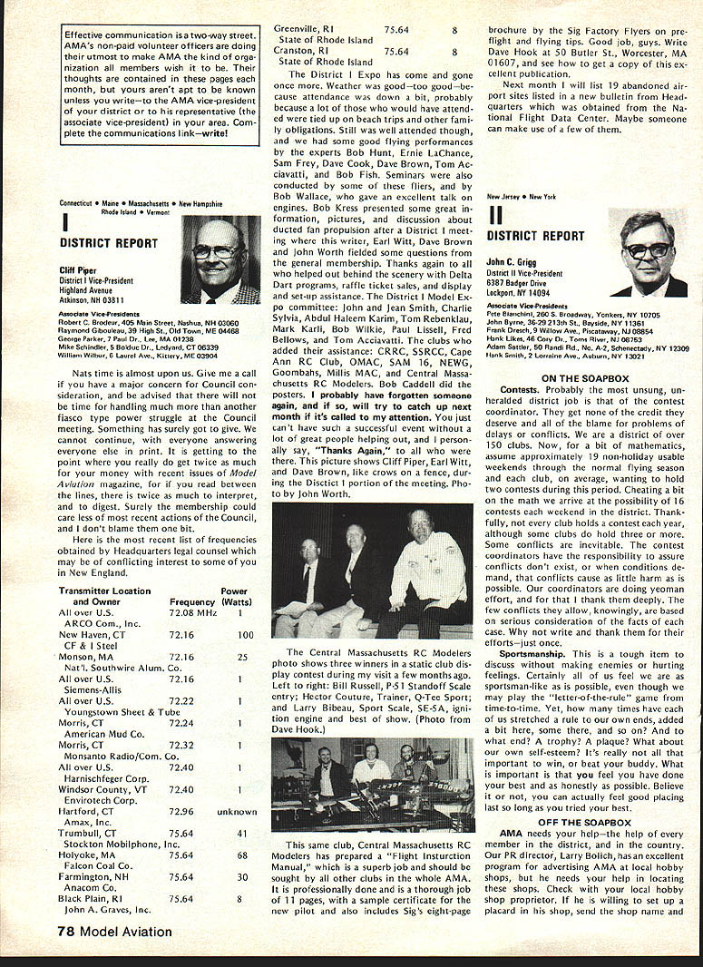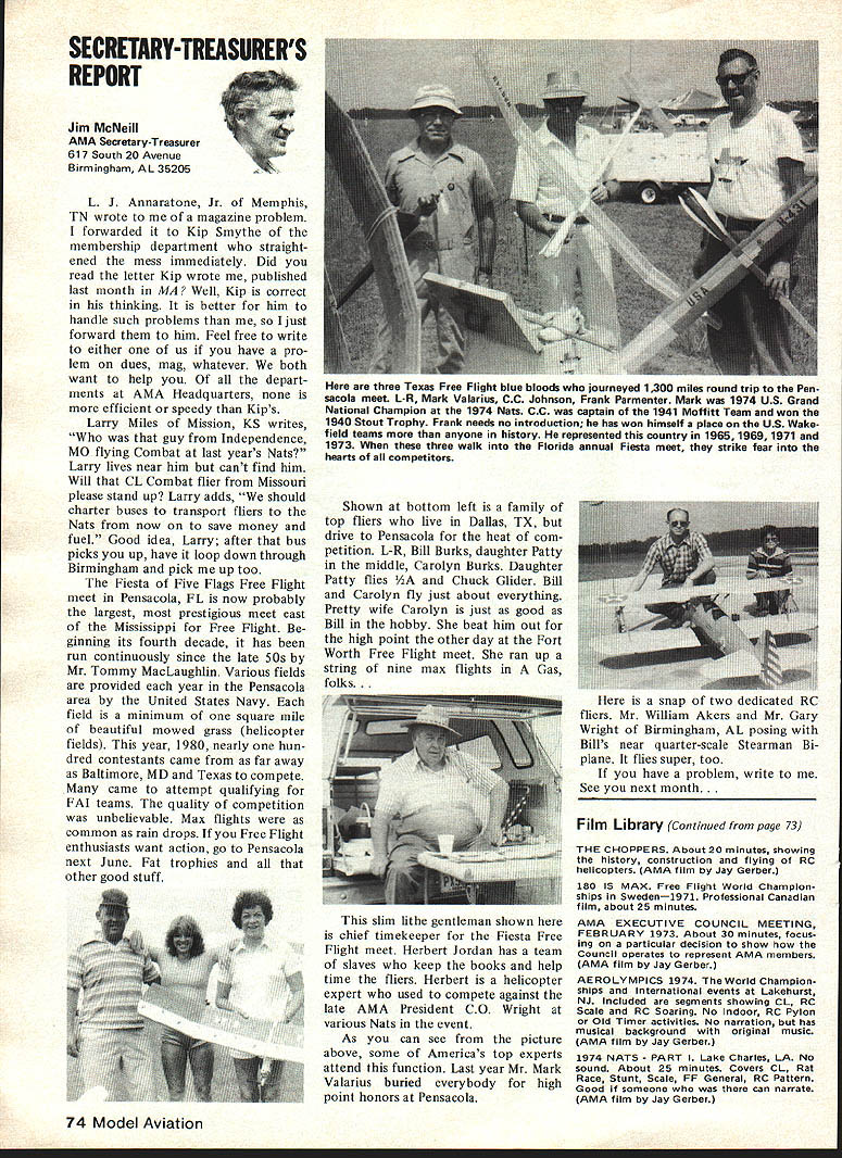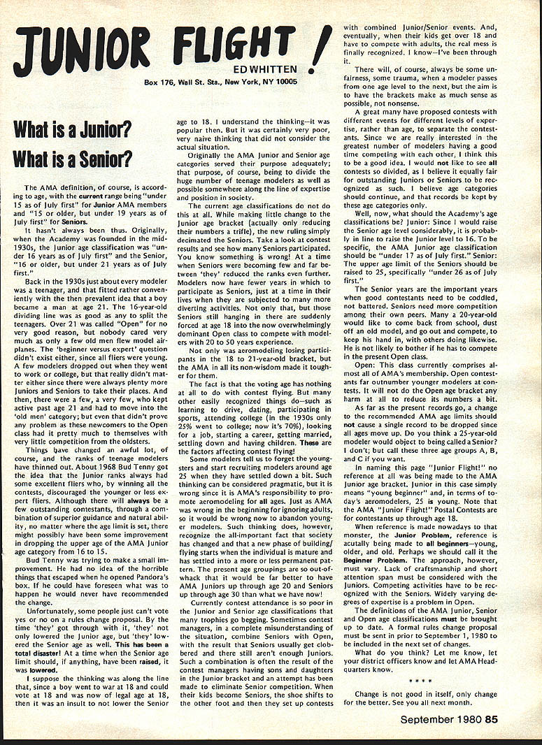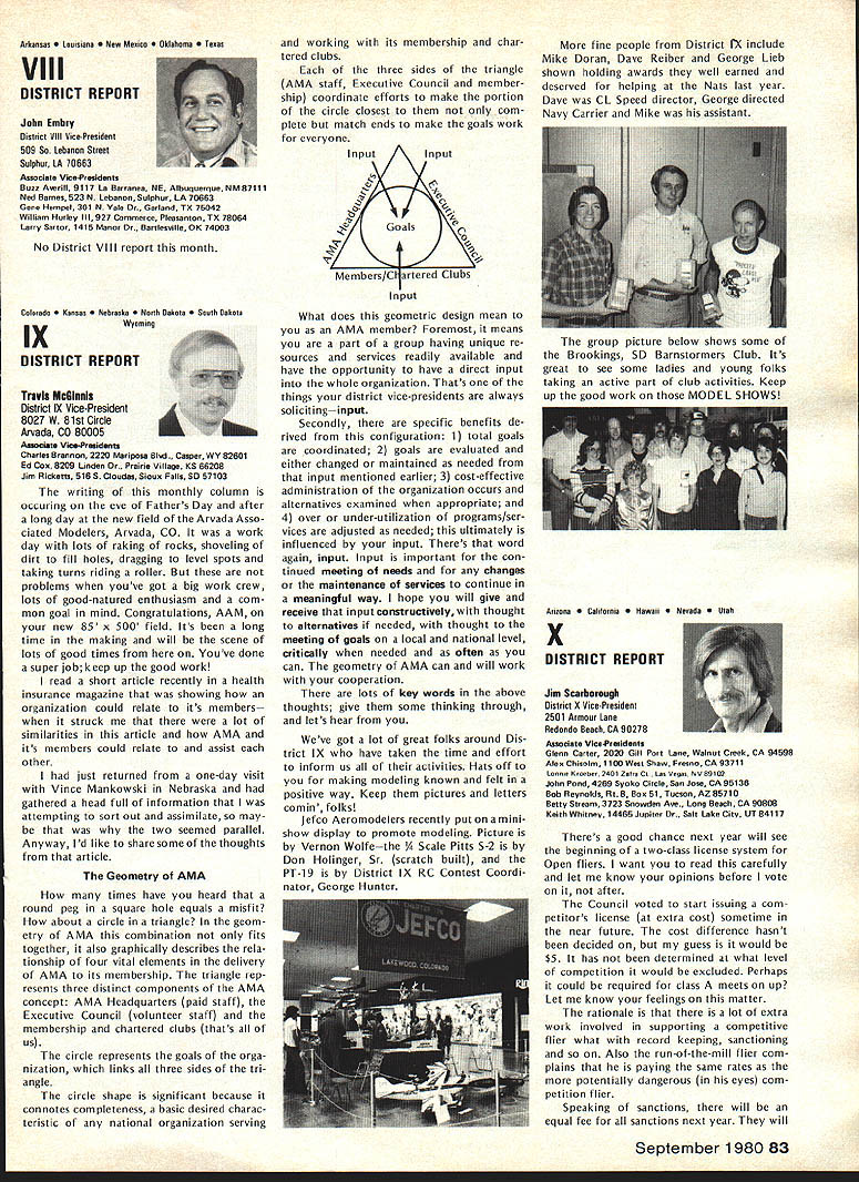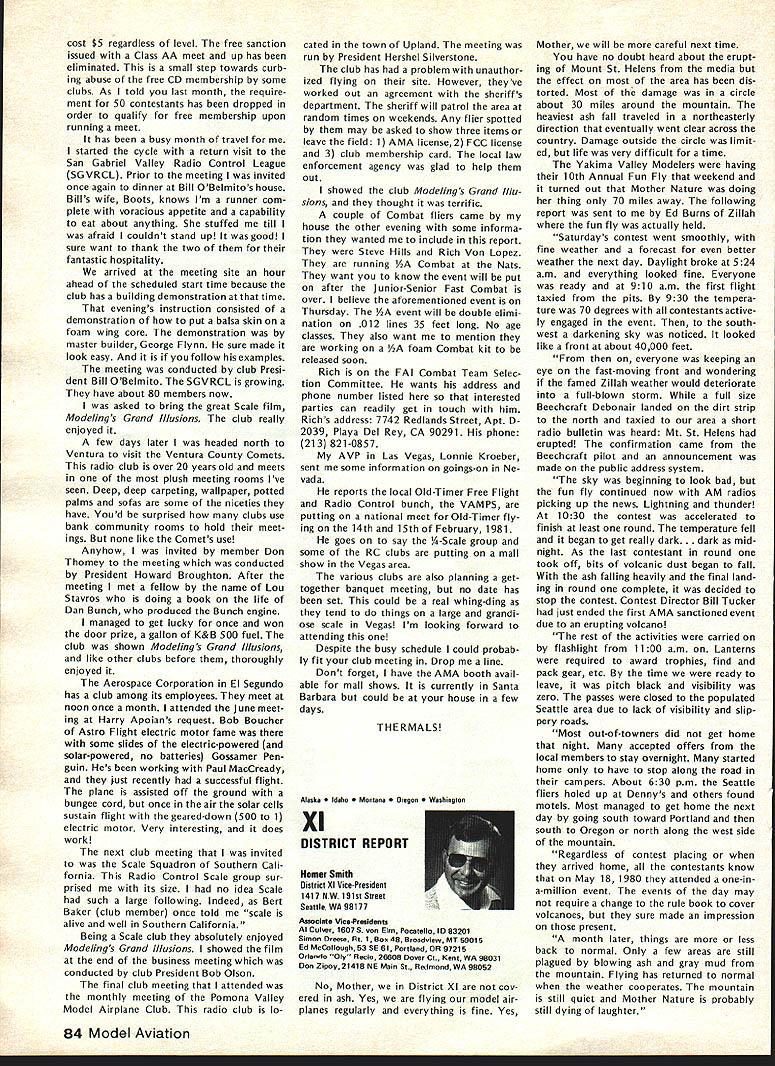 r AMA HQ Executive Director including reports AMA President Vice-Presidents L L Homeowners Coverage Model Aircraft article originally appeared October 1979 issue reprinted now benefit may have missed first time around Ever since courts Pennsylvania up held ruling excludes model aircraft coverage homeowners insurance policy has confusion over whether AMAs liability protection primary sec ondary subject described Model viation magazine March 79 issue page 73 also RC Modeler magazine August 79 issue page 60 Regardless AMAs coverage applies other coverage doesnt So surest protec tion AMA member covered automatically However should rash claims against AMAs coverage its reasonable expect AMAs cost go up ultimate effect amount AMA dues Obviously therefore desirable re verse situation because Penn sylvania ruling model aircraft treated same full-scale people-carrying aircraft likely happen because pow insurance companies have alerted idea model aircraft accidents can ex pensive though rare like ly go back previous situation models regarded toys unlikely cause problems So though Pennsylvania decision commonly regarded ridiculous chances overturning slim thing legal fight reversal courts would expensive idea holding down costs compromised theres another approach successfully applied already has restored model aircraft coverage some homeowners policies no extra cost idea has advised Alex Chisolm AMA member also independent insurance agent Alex AMA District X Vice-President few years ago long-time leader model activities Fresno area California provides insurance protection number West Coast model firms insur ance companies provided AMAs basic mem bership coverage awhile during mid-70s Thus Alex knows business sugges tion no mere pipe dream What has done endorsement added homeowner policies says aircraft exclusion clause does apply model boats model airplanes Such re quest coming independent insurance agent has some weight Alex has gotten ac ceptance number modeling clients several different companies can can others Its worth try goal starting movement get insurance com panies accept models what Alexs own words subject concerning case homeowners insurer denied claim court backed up claiming RC model airplane just much aircraft passengercarrying 747 might have made both insurer court look absolutely ridicu lous its fact life insurer can find loophole big claim would pretty stupid go ahead pay About 15 years ago could see possi bility type thing happening forms coverage specifically de signed aircraft airports allied activ ity written aircraft insurers insurers write homeowners policies Homeowners policies include liability surance kinds hobbies sports cluding golf hunting fishing baseball whatever first introduced about 1954 same aircraft exclusion used still use today Since have discovered RC insurance companies havent discovered us feel have legitimate need theyll remove aircraft ex clusion fly model airplanes Back 1964 Harold Cox AMA member claims manager leading insurance company worked out clarification intent aircraft exclusion al lows insurance company insure liability model airplanes Since time have insured several model airplane enthusiasts primary lia bility attaching endorsement homeowners policy business liability policy did submit wording company have always accepted made clarification part policy have never yet submitted endorse ment turned down knowl edgeable underwriter understood agreed fol lowing wording applies modify aircraft exclusion follows aircraft exclusion relating watercraft aircraft does ap ply model boats model airplanes hobby variety September 198071 Lots ot action tfle busy AMA ooorn auring Soutnwi Modelers onow iw waL Headquarters staff member Carl Maroney foreground assisted local AMA volun teers Velma Teubner Helen Randolph Presidents OUTLc3DK Earl F Witt 26 Warwick Drive Chambersburg PA 17201 FROM RED TO BLACK event did read AMA financial report published last months Model Aviation orga nization much healthier position 1978 became President Academy 1979 red $58135 deficit due failure institute moderate dues increase 1977 became apparent going hit deficit position spite slight loss membership drastic dues crease 1979 ended year black $161104 surplus year topped 70000 membership mark early June rate despite inflationary costs increased number staff personnel Headquart ers dont anticipate need basic dues increase next year MAGAZINE ISSUE Councils decision 1978 make Model viation magazine mandatory caused great deal dissension attributed loss membership 1979 decision response Council members myself includ ed made inquiries issue vari ous club district group meetings -as well surveys After nearly year half inquiries mem bership input majority Coun cil voted make magazine optional 1981 vote no rash decision small influential faction AMA making concerted effort fluence Council members voting pptional magazine change vote Most comments have received before since vote have favored action taken opinion Council members responsibly representing majority mem bership AMA bylaws require official AMA publication distribute Academy information membership official publication currently con tained Model Aviation cost borne magazine anticipated magazine becoming op tional cost required publica tion will added basic dues will somewhat reduce difference between $25 membership magazine non-magazine member ship minimize financial impact Model viation becoming optional USA INDOOR WORLD CHAMPIONS United States Indoor Team victorious World Indoor Champi onships held West Baden IN June 20 through 24 Indoor flying has often compared chesslittle motion lot tension World Cham pionships year no exception After three days flying both team individual championships de cided within last two hours Jim Richmond reigning World Cham pion US good flight previous two days flying made two excellent flights third day placing him lead dividual championship total 71 minutes 29 seconds less three hours go team ch